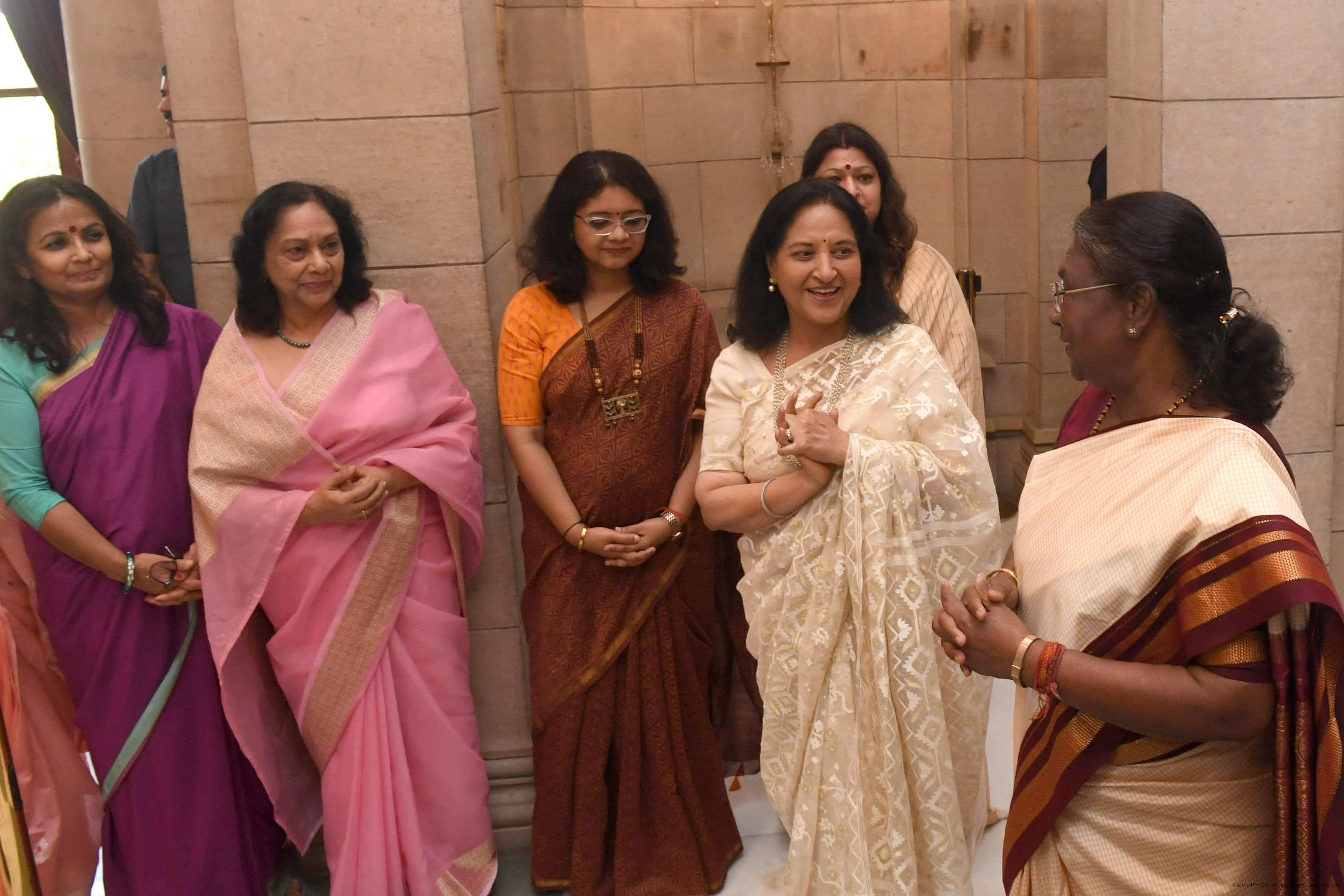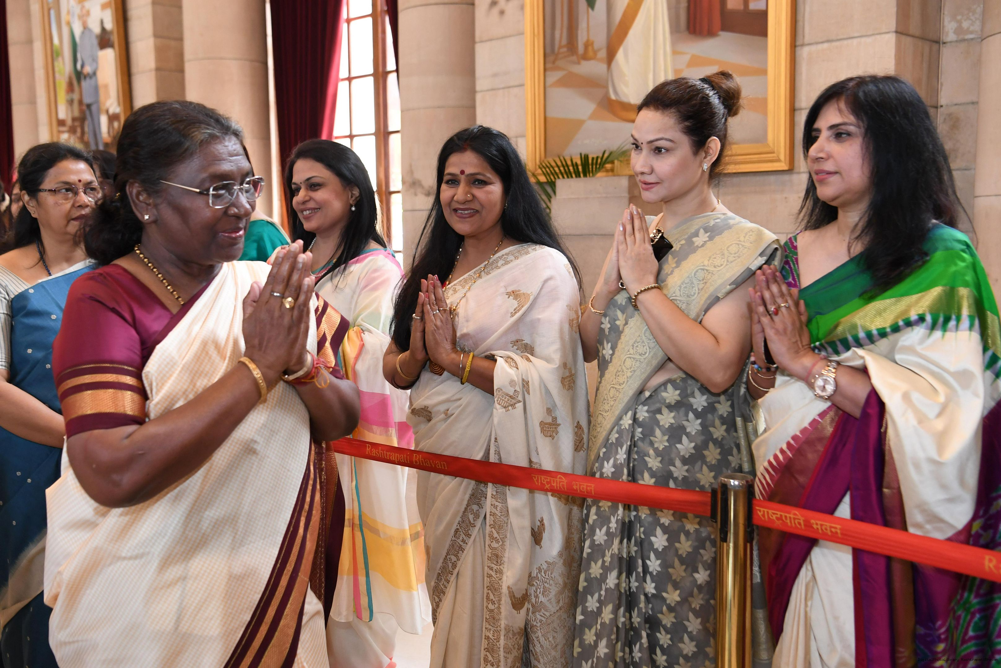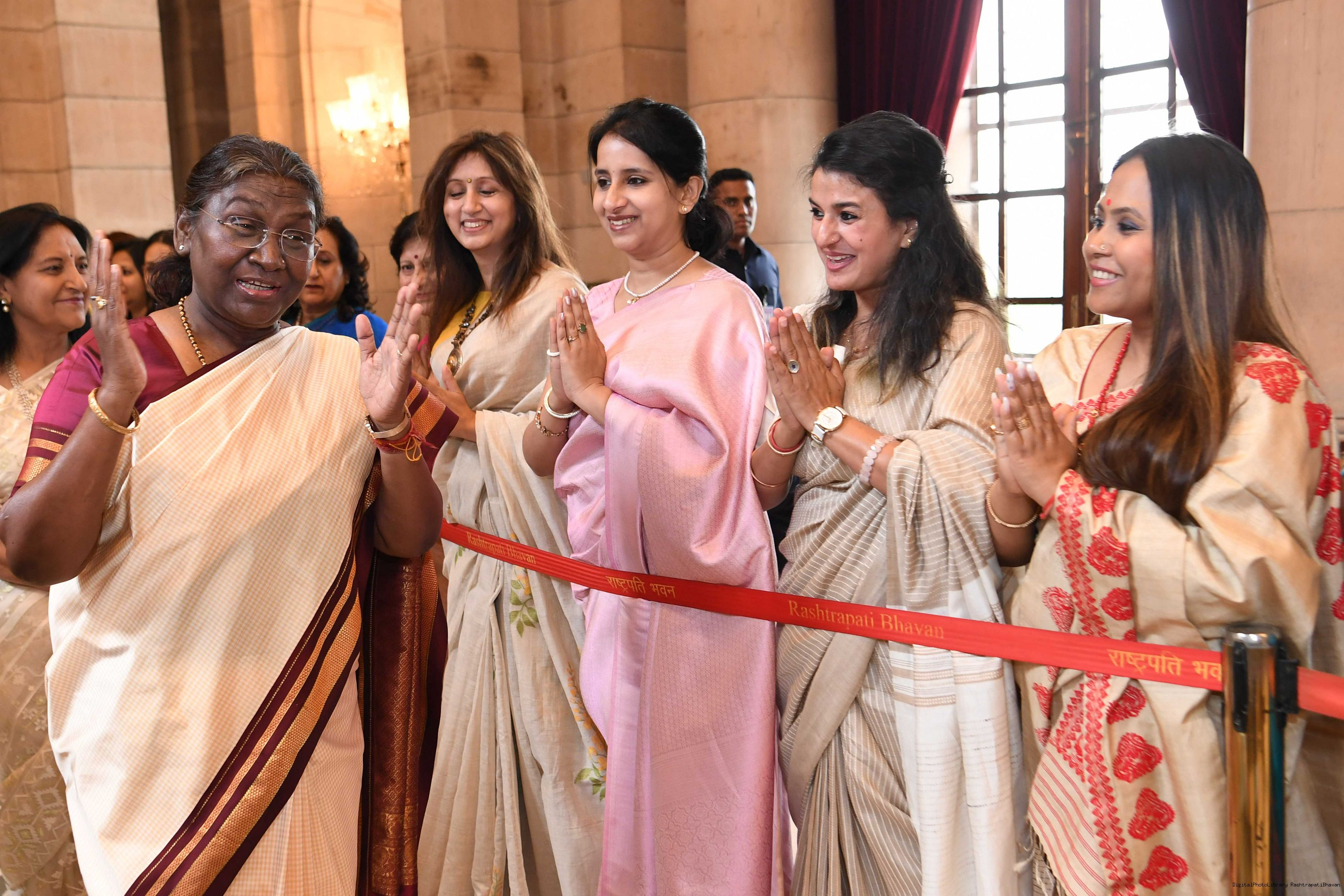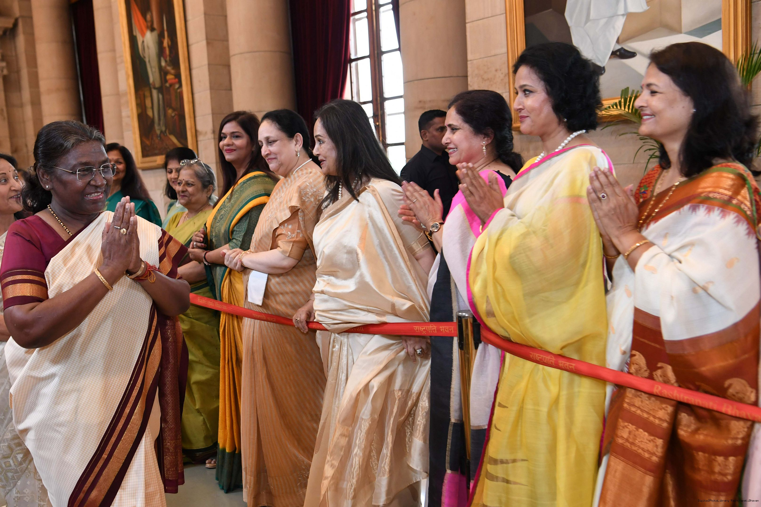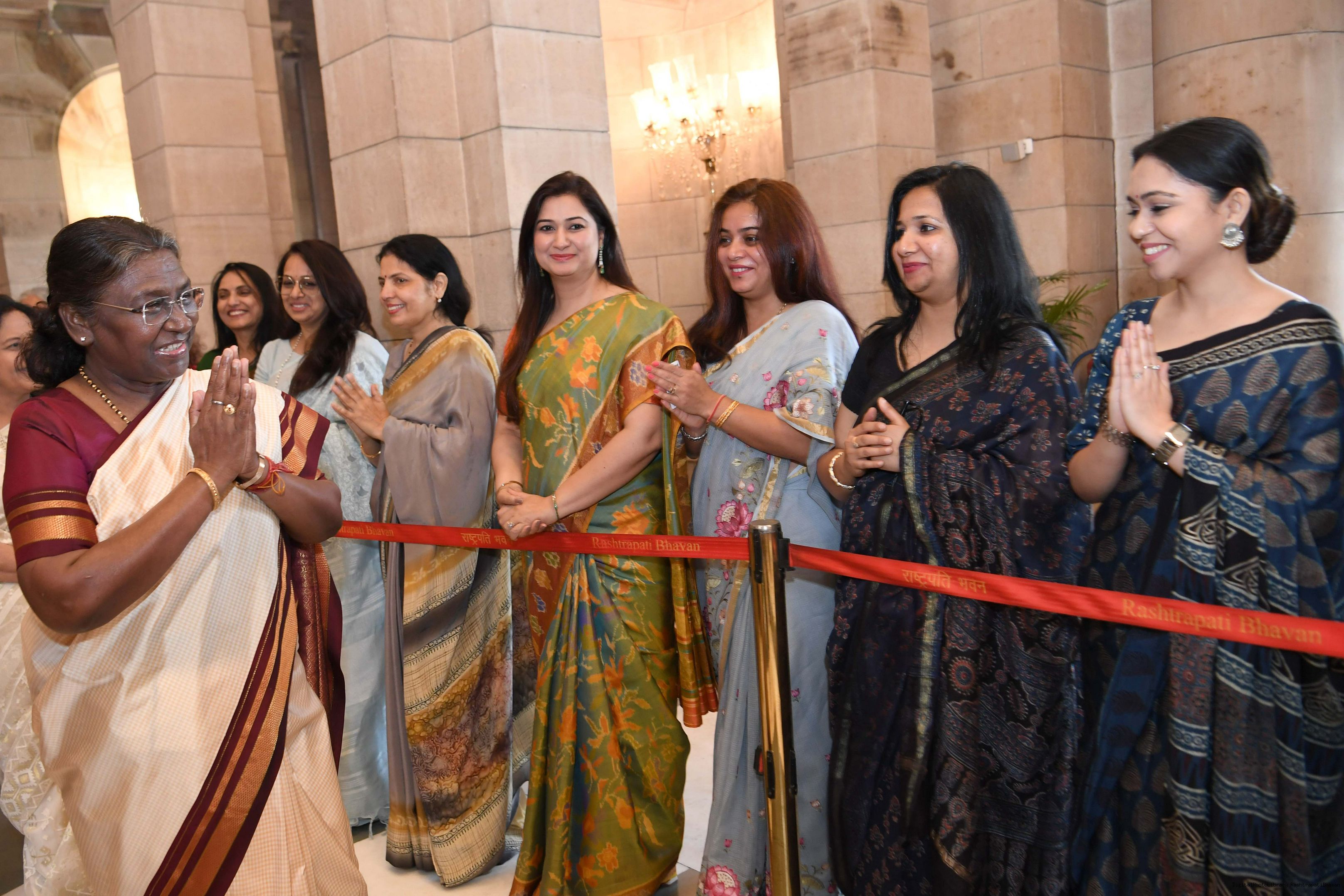 | Caption: | The President of India Smt. Droupadi Murmu posing a Group Photo and Meeting with the members of IPS officer's Wives Welfare Association (IPSWWA) at Rashtrapati Bhawan on April 03, 2024. |
