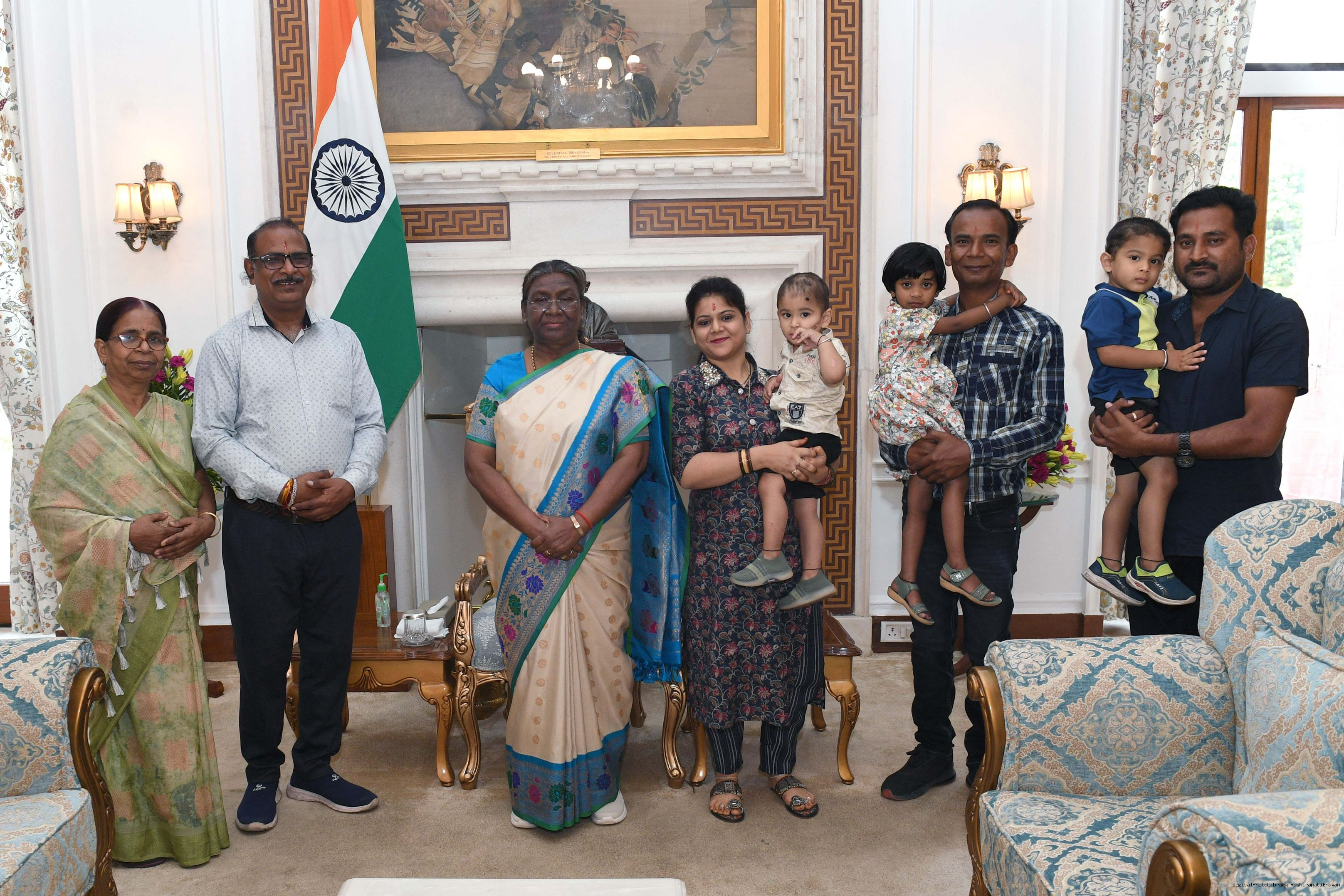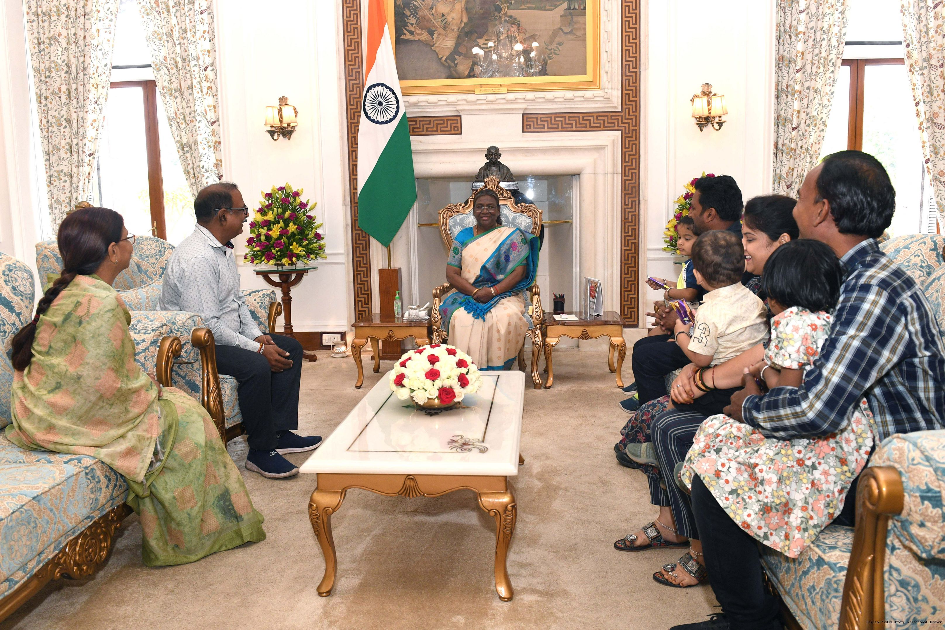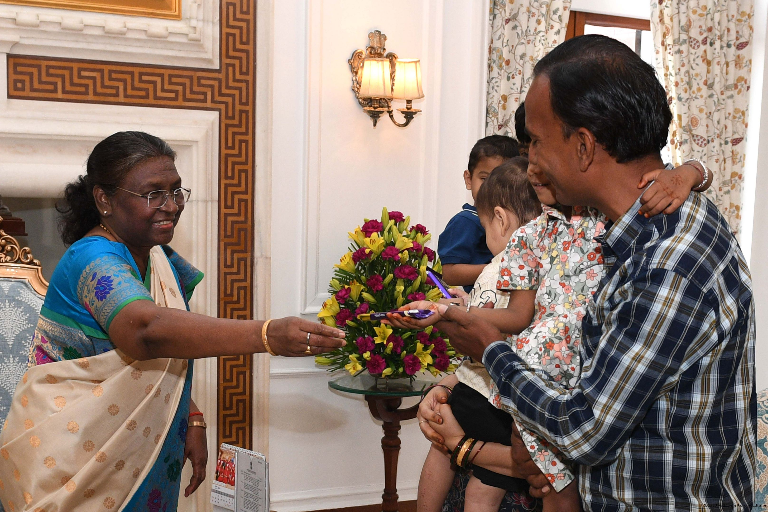 | Caption: | Shri Kishan Kumar Swami from Rairangpur along with others meeting with the President of India Smt. Droupadi Murmu at Rashtrapati Bhawan on April 12, 2024. |