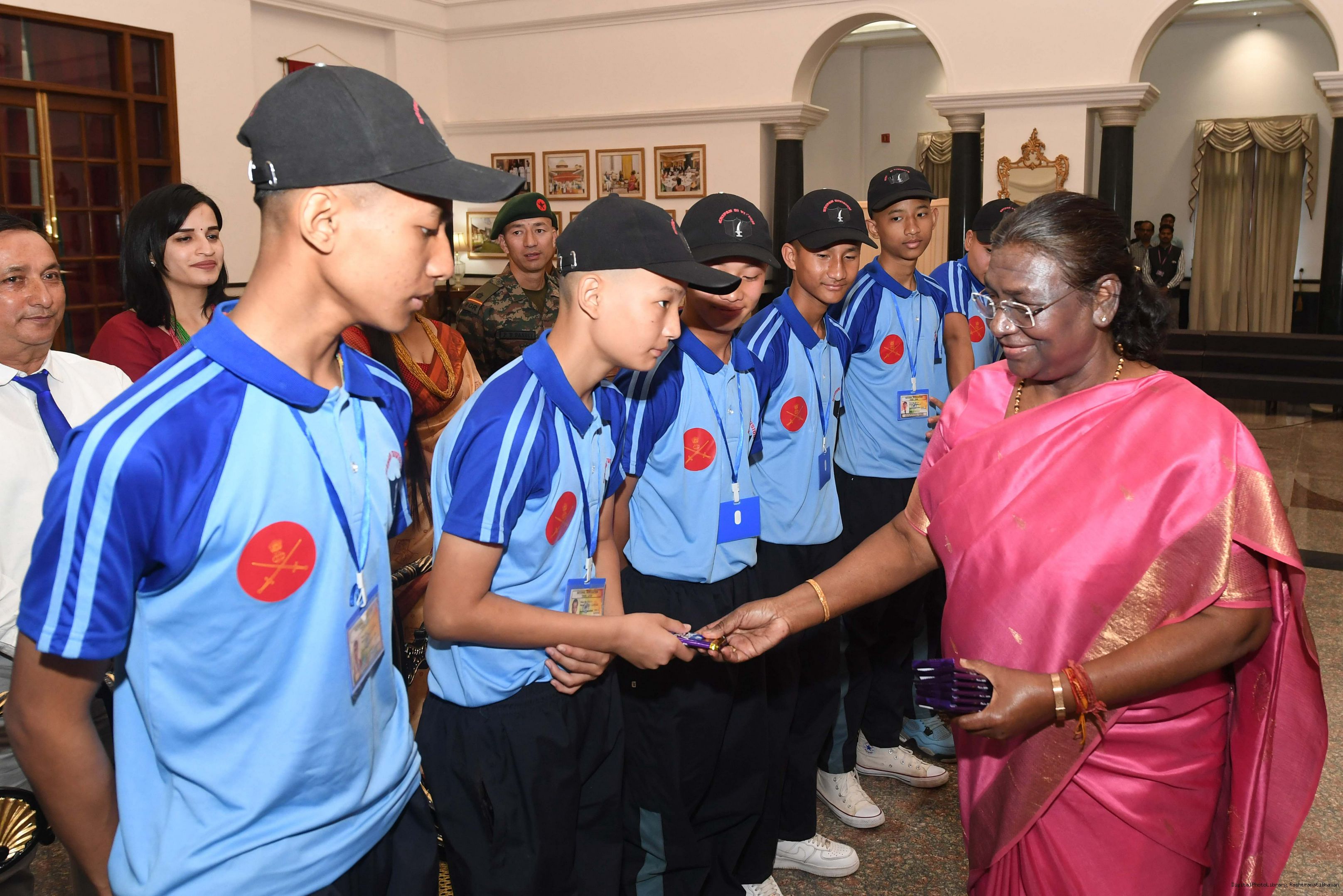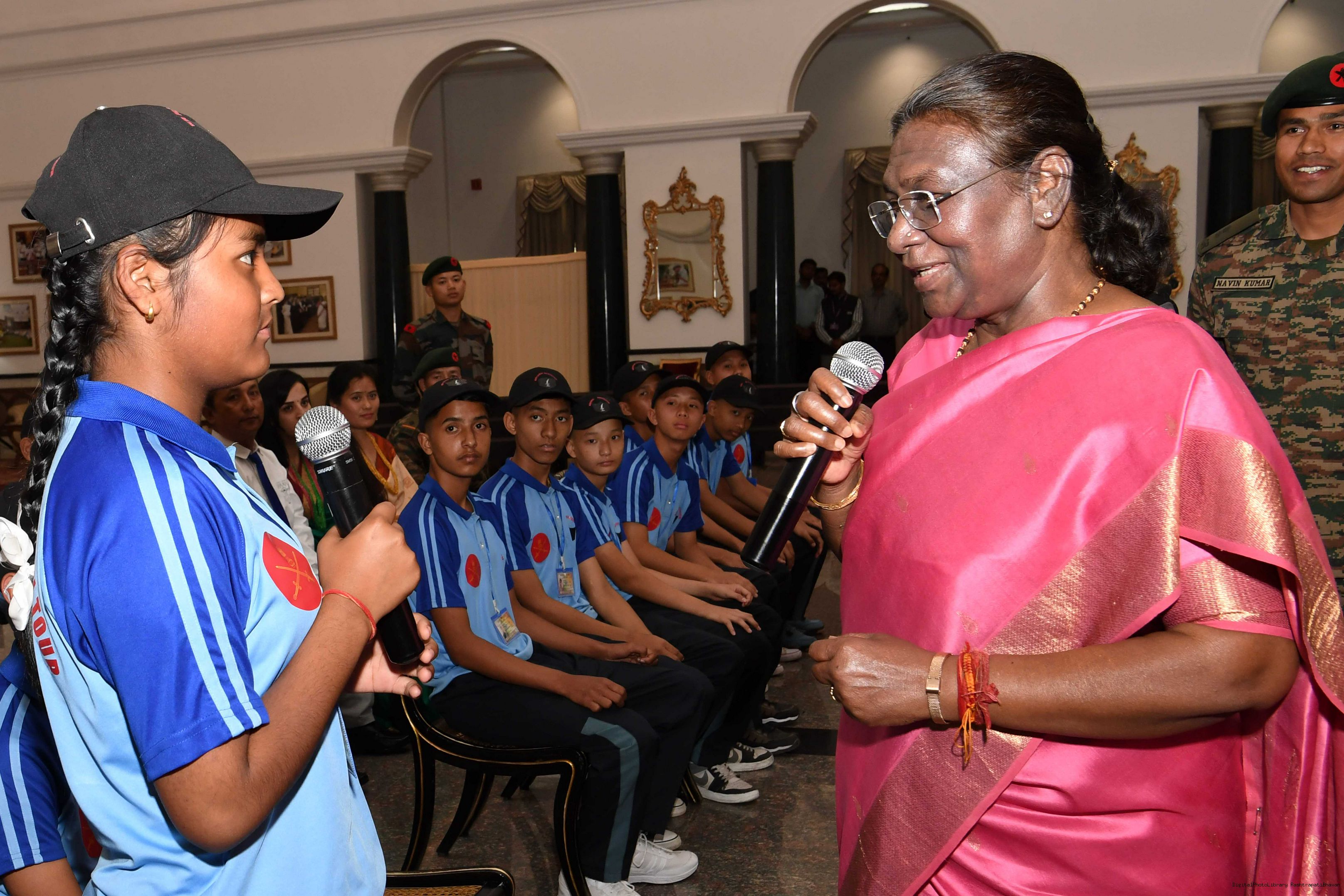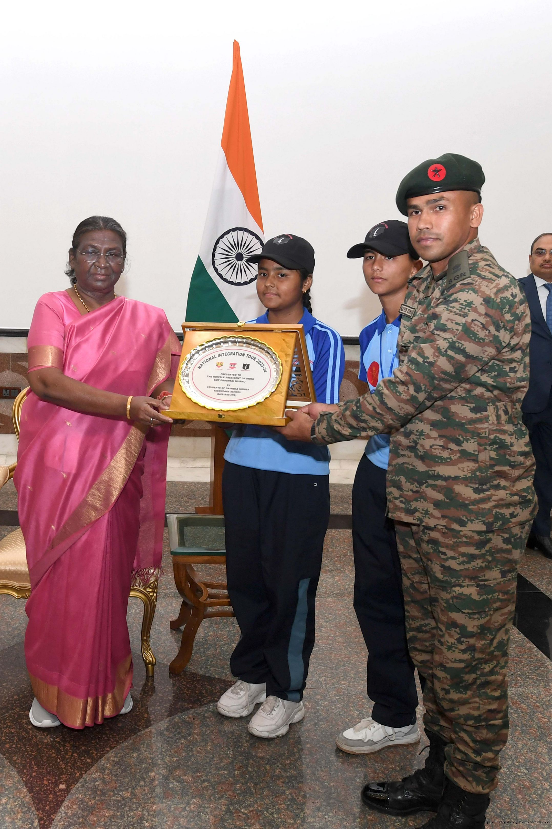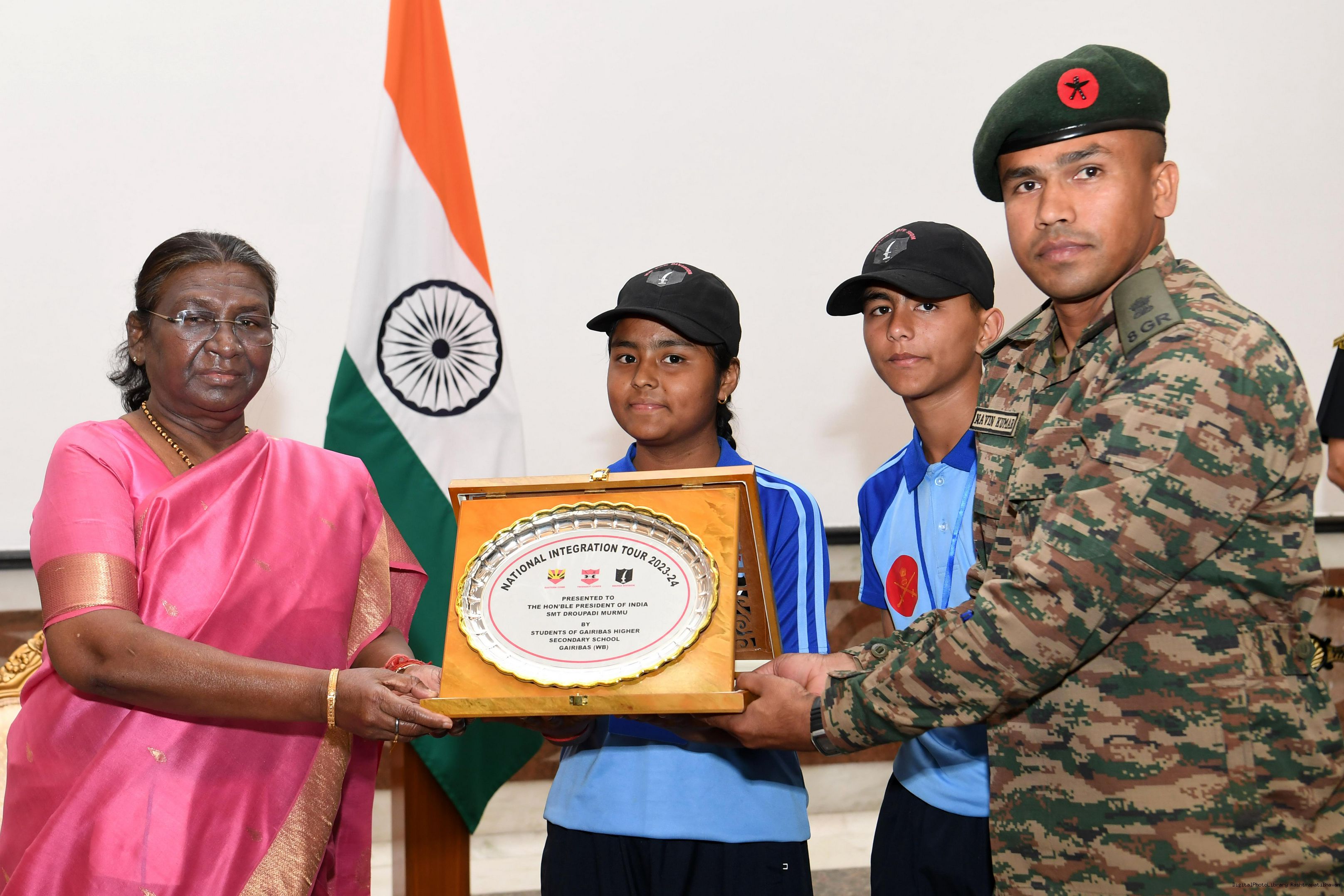 | Caption: | The President of India Smt Droupadi Murmu met a group of students from Gairibas Higher Secondary School, Dalgaon, Kalimpong, West Bengal as a part of National Integration Tour(NIT) at Rashtrapati Bhavan on March 18, 2024. |