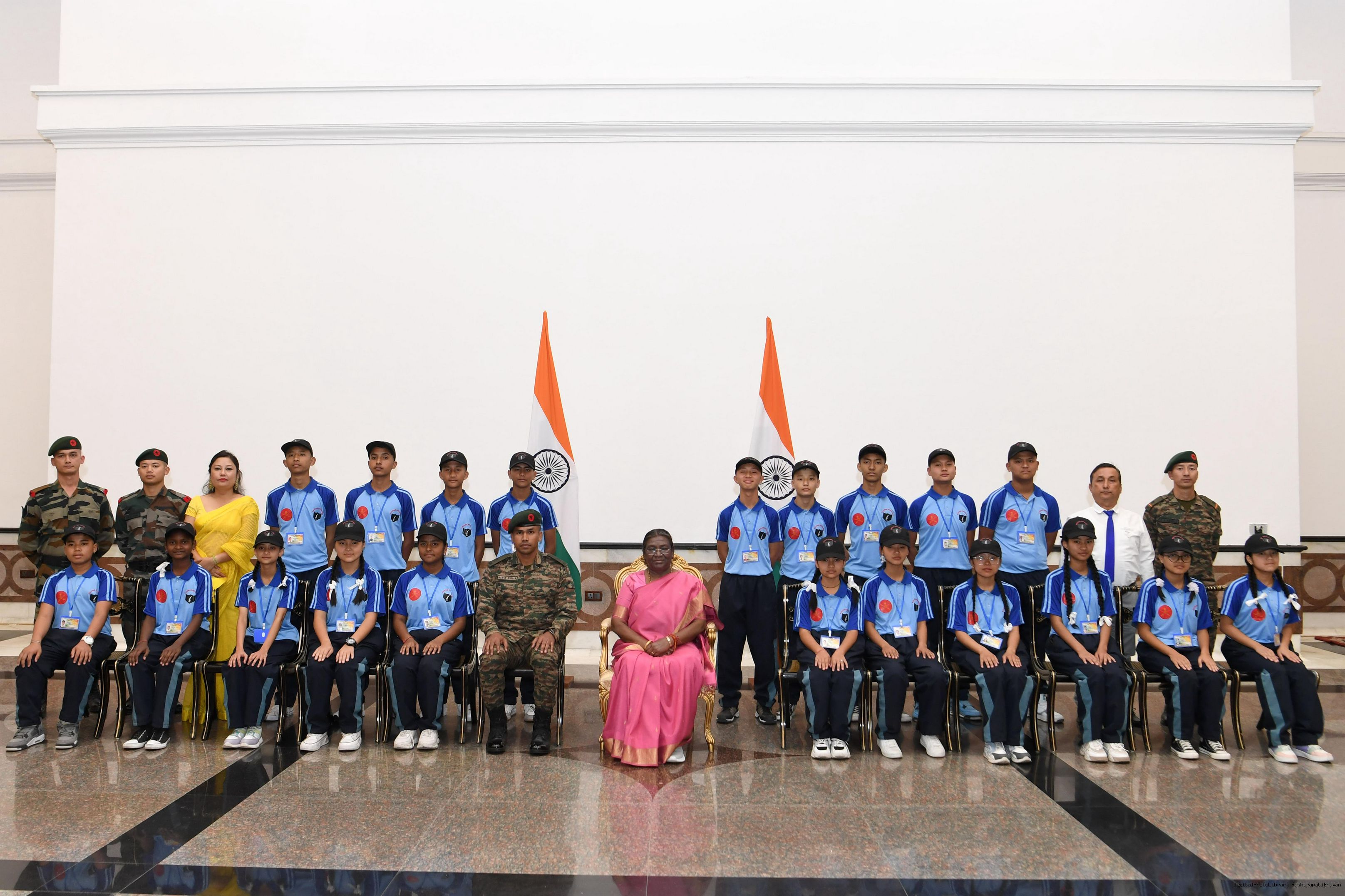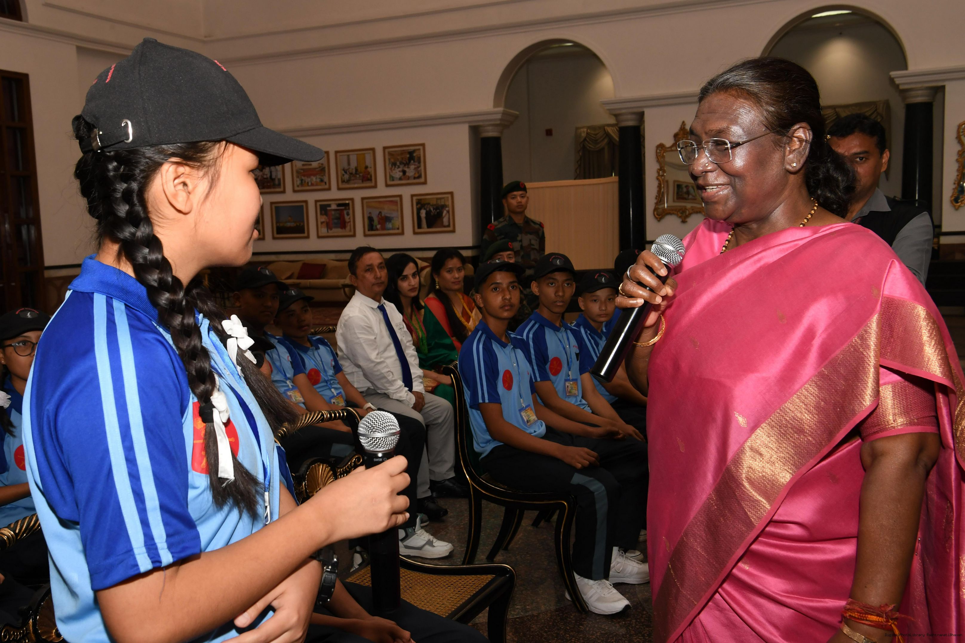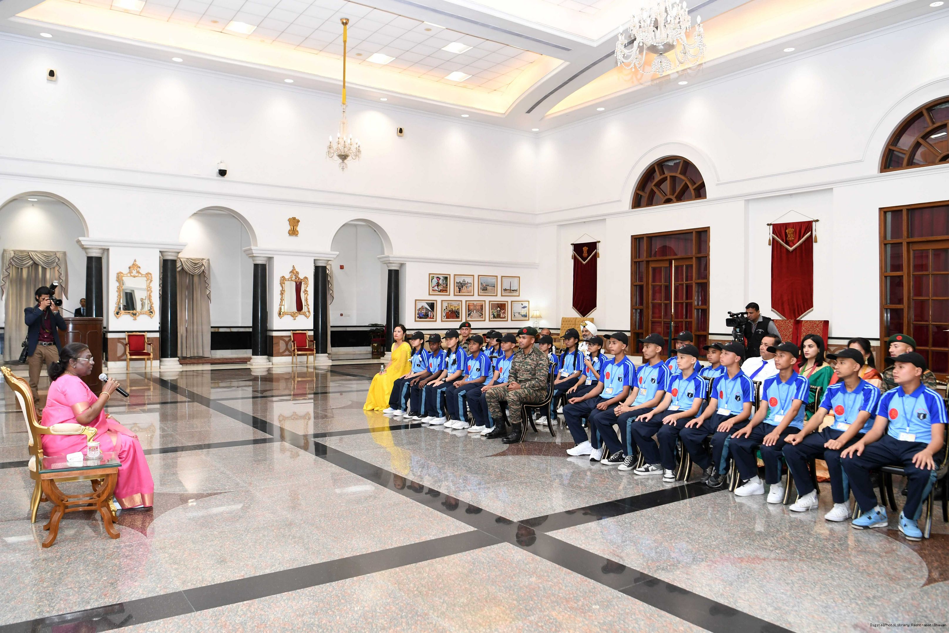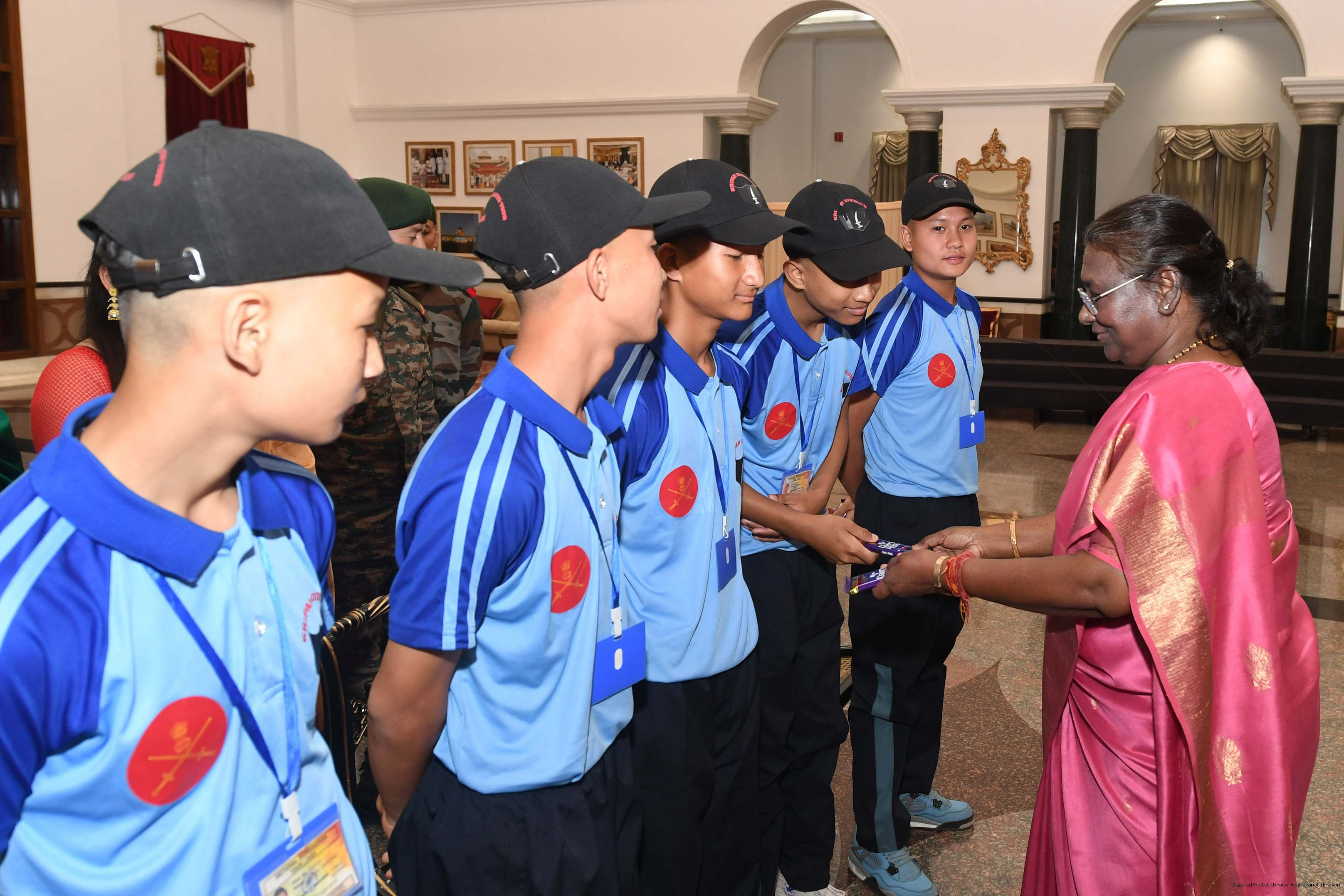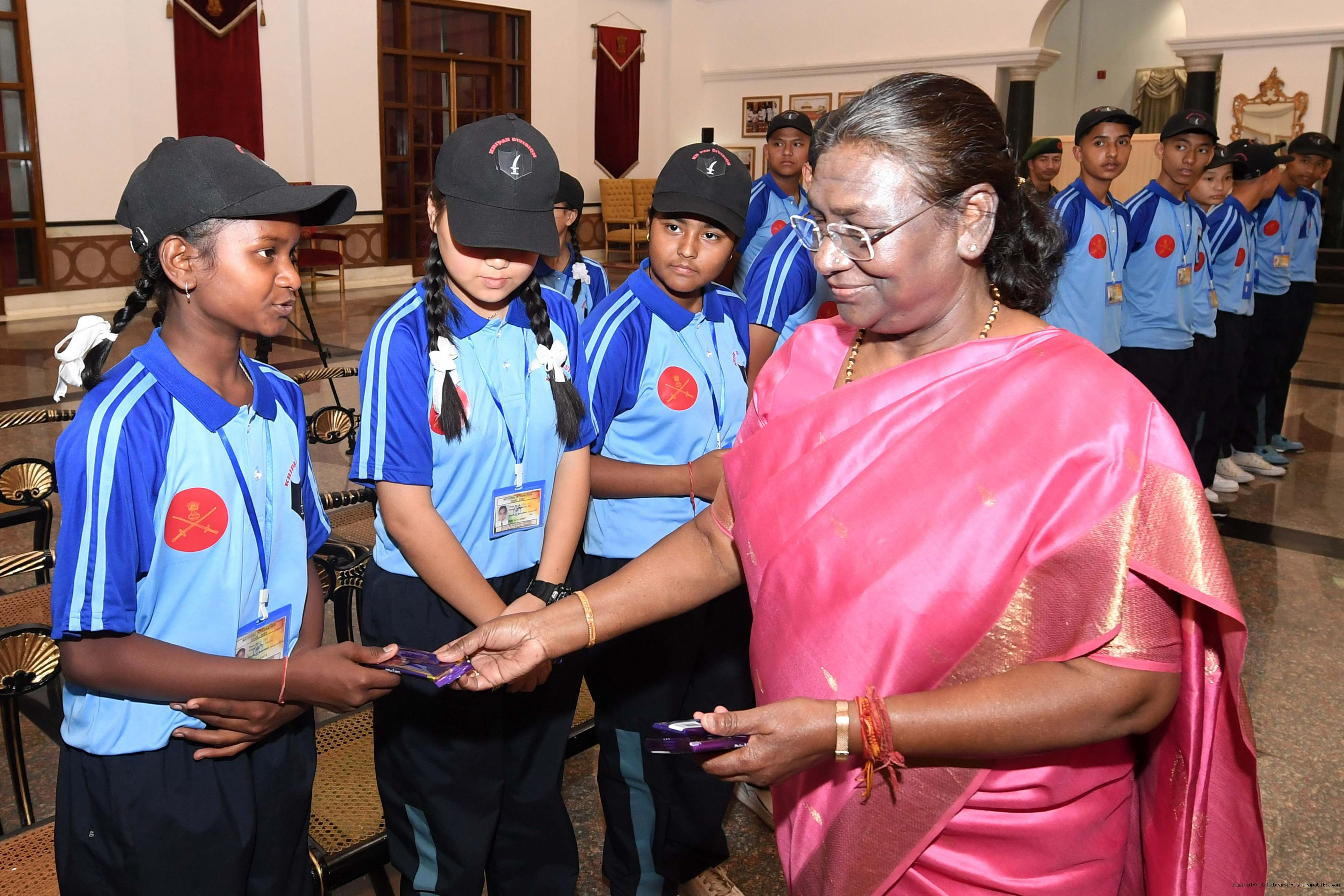 | Caption: | The President of India Smt Droupadi Murmu met a group of students from Gairibas Higher Secondary School, Dalgaon, Kalimpong, West Bengal as a part of National Integration Tour(NIT) at Rashtrapati Bhavan on March 18, 2024. |
