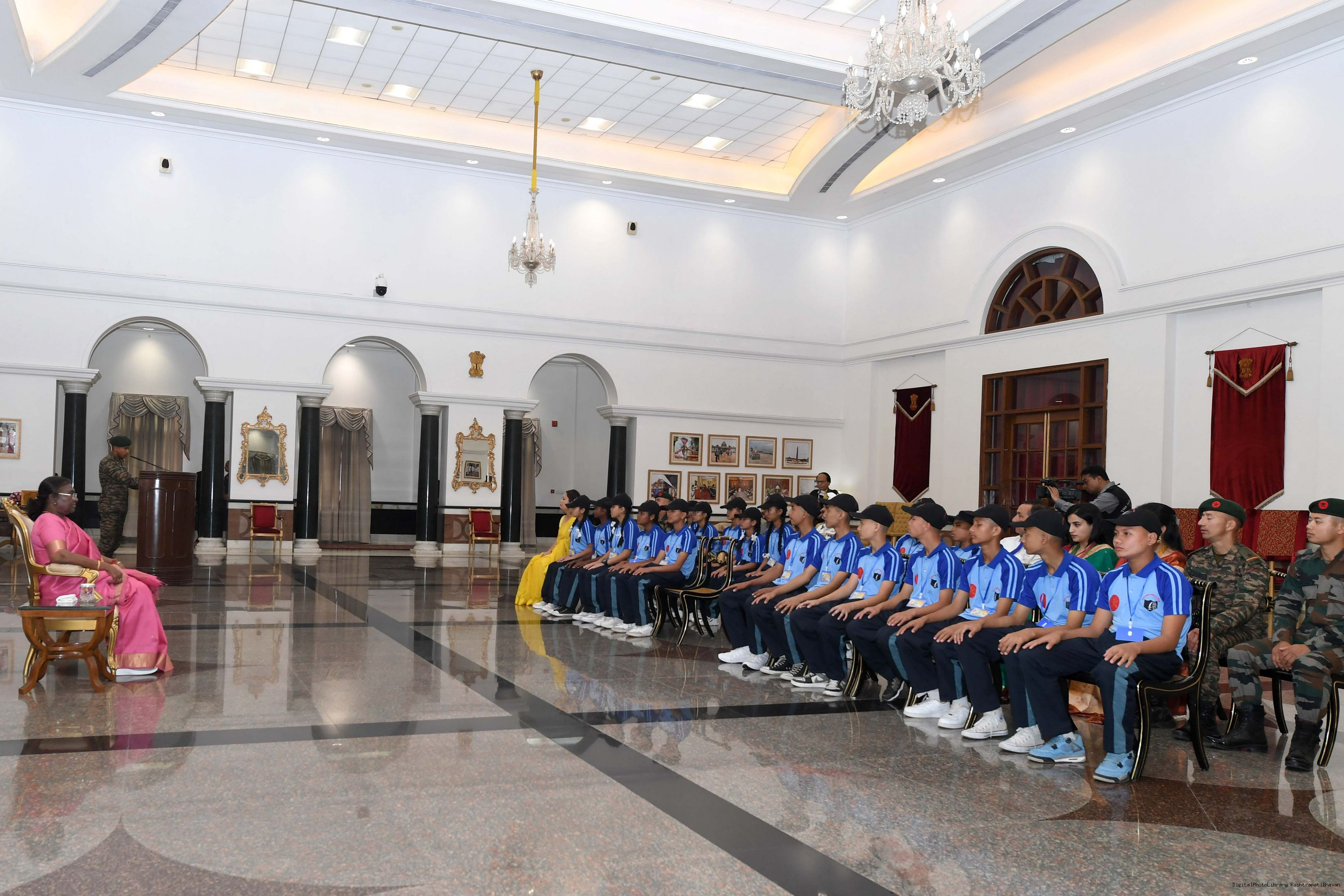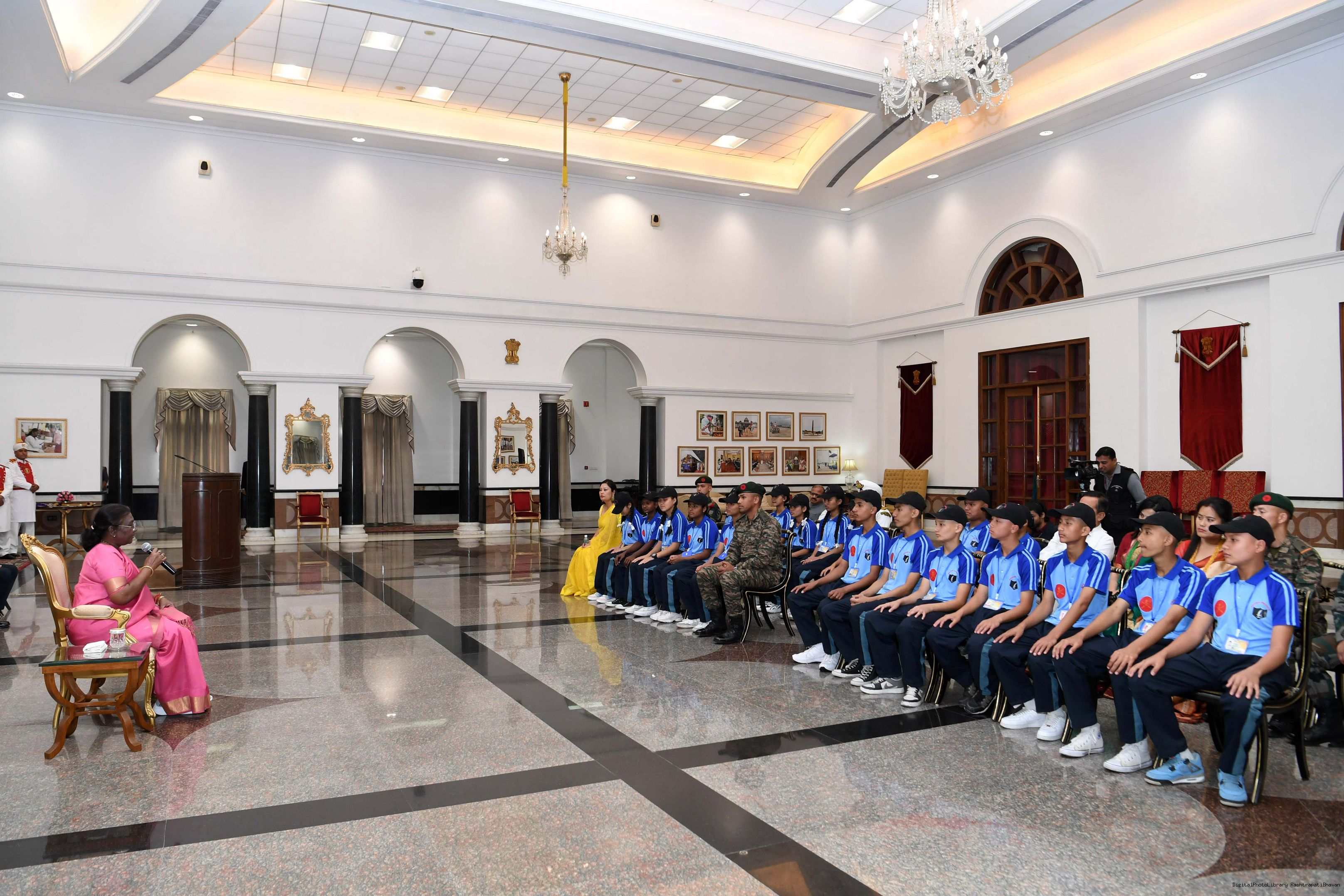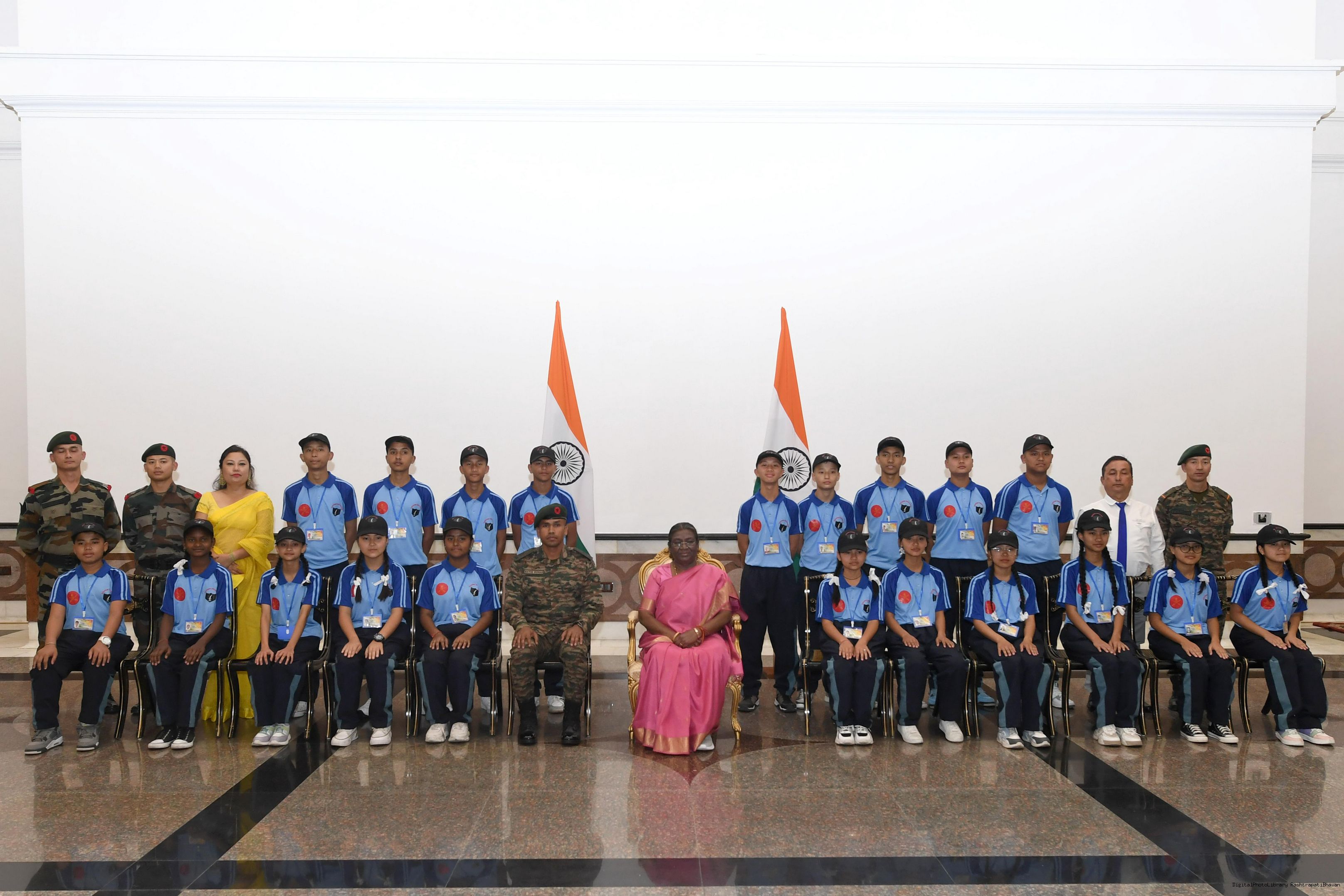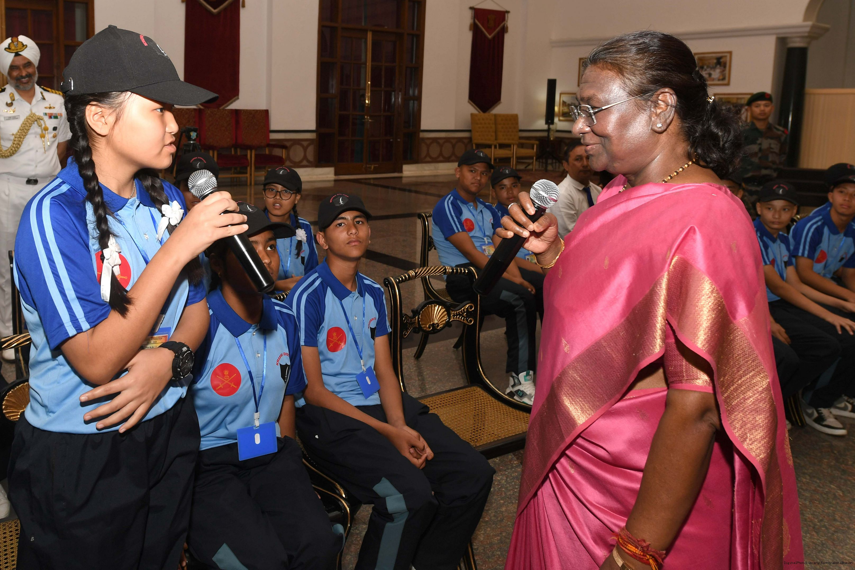 | Caption: | The President of India Smt Droupadi Murmu met a group of students from Gairibas Higher Secondary School, Dalgaon, Kalimpong, West Bengal as a part of National Integration Tour(NIT) at Rashtrapati Bhavan on March 18, 2024. |