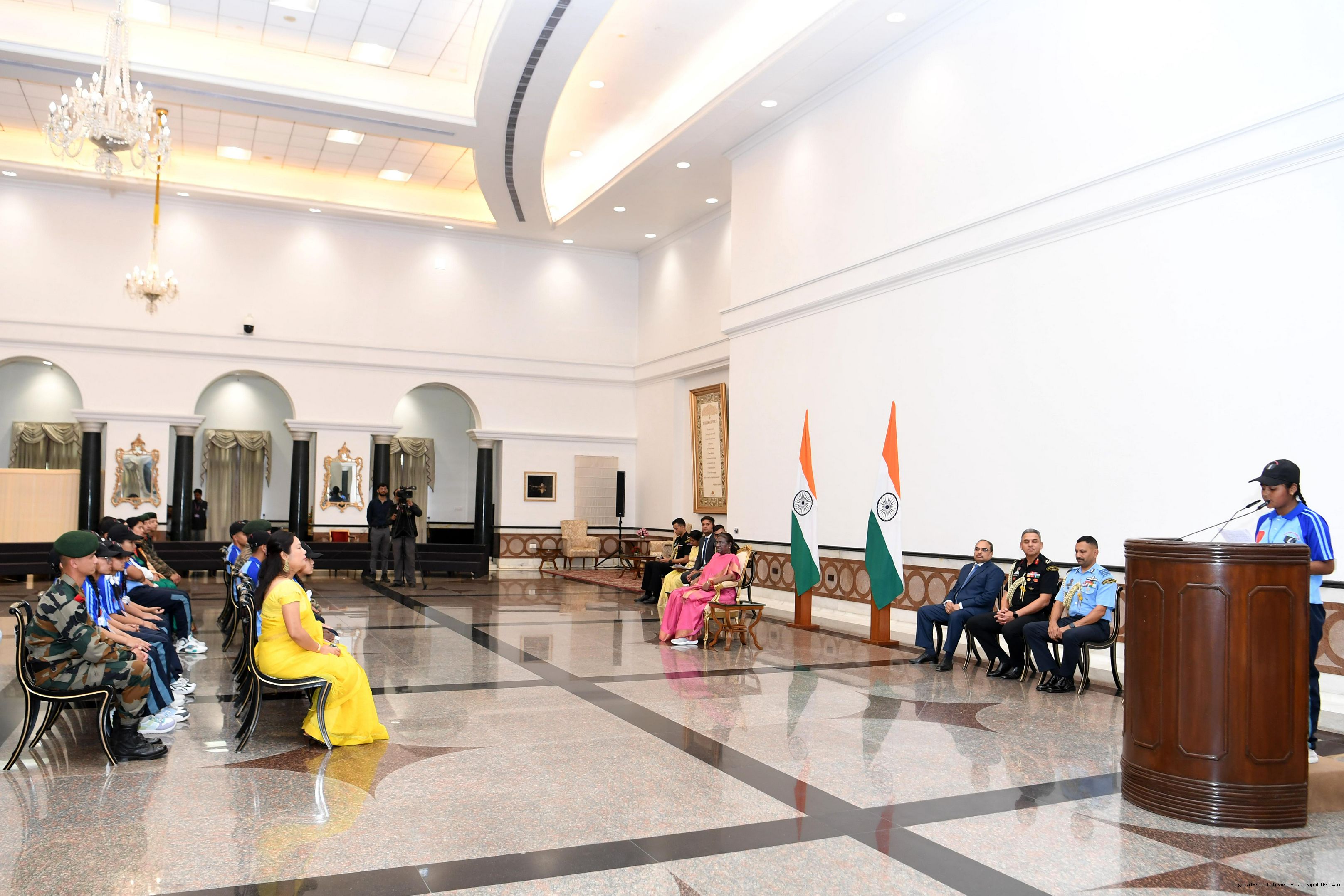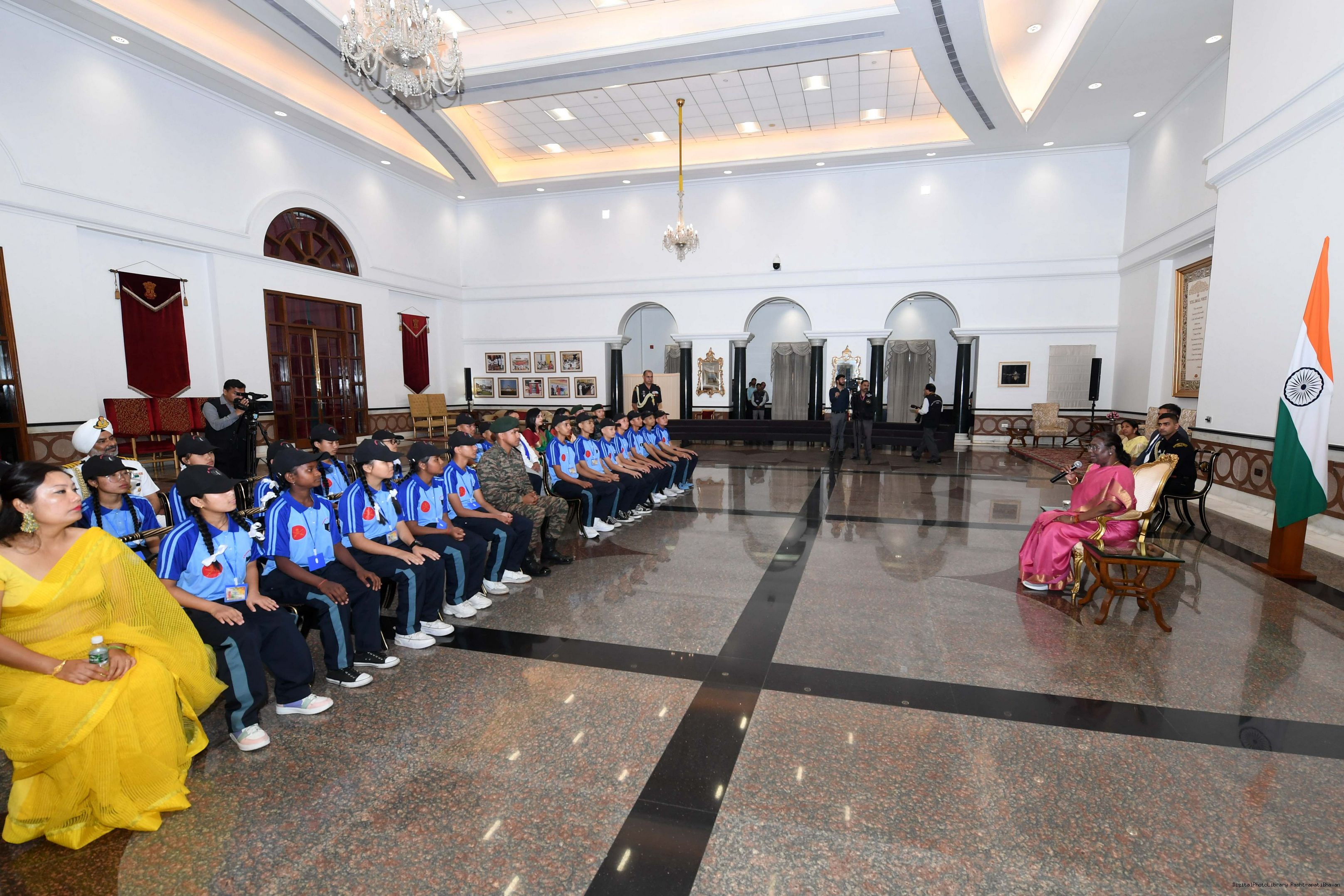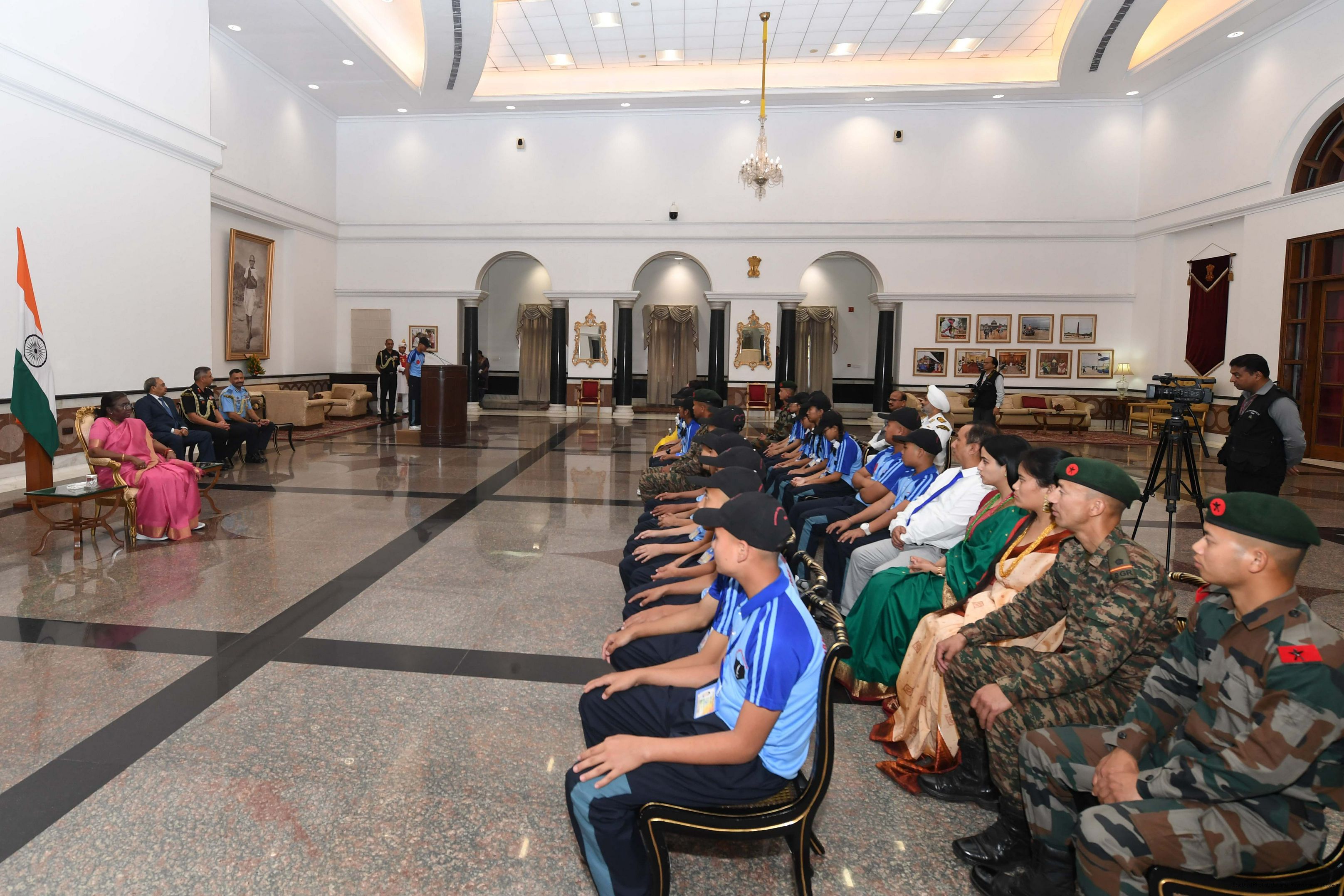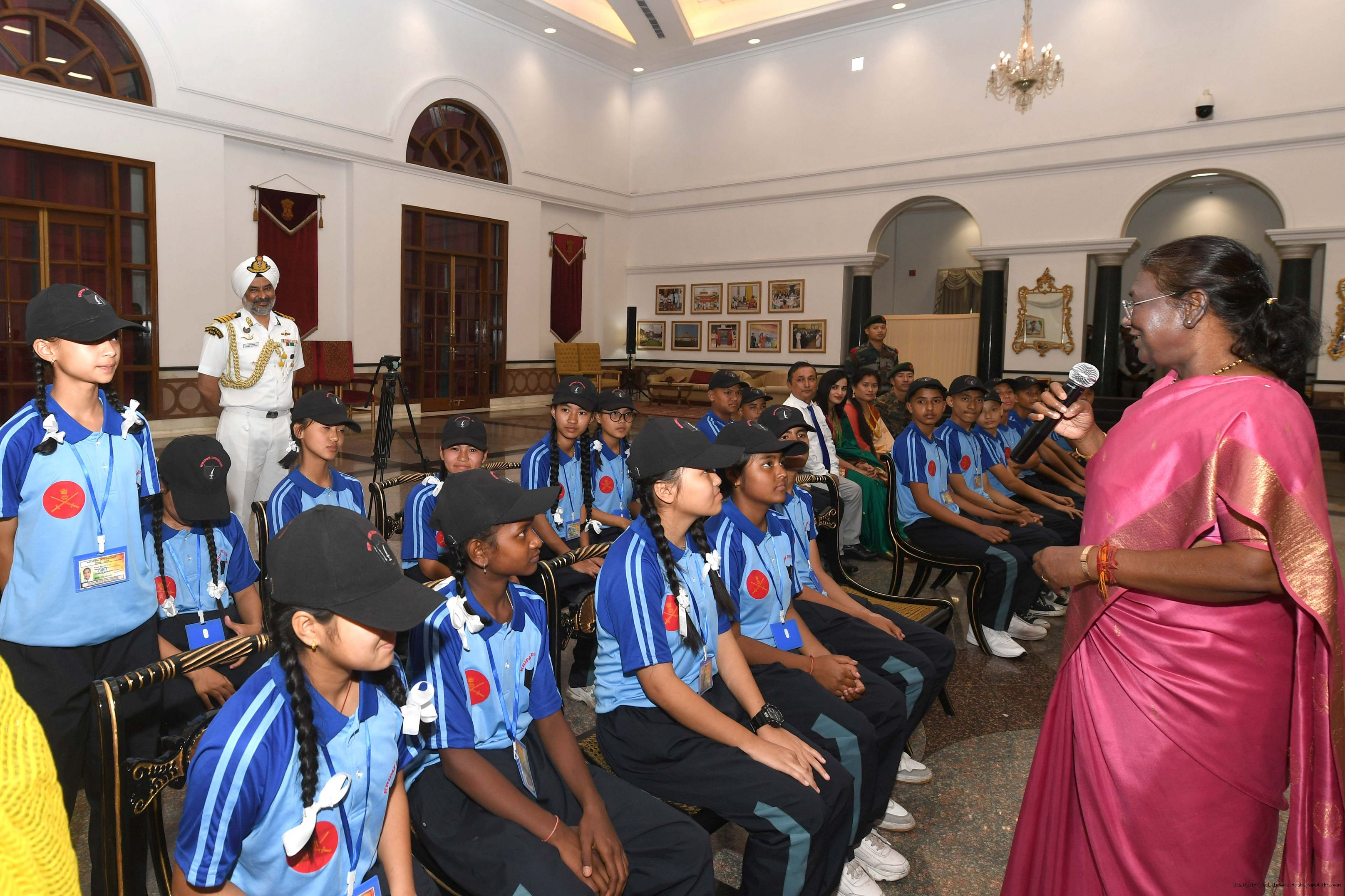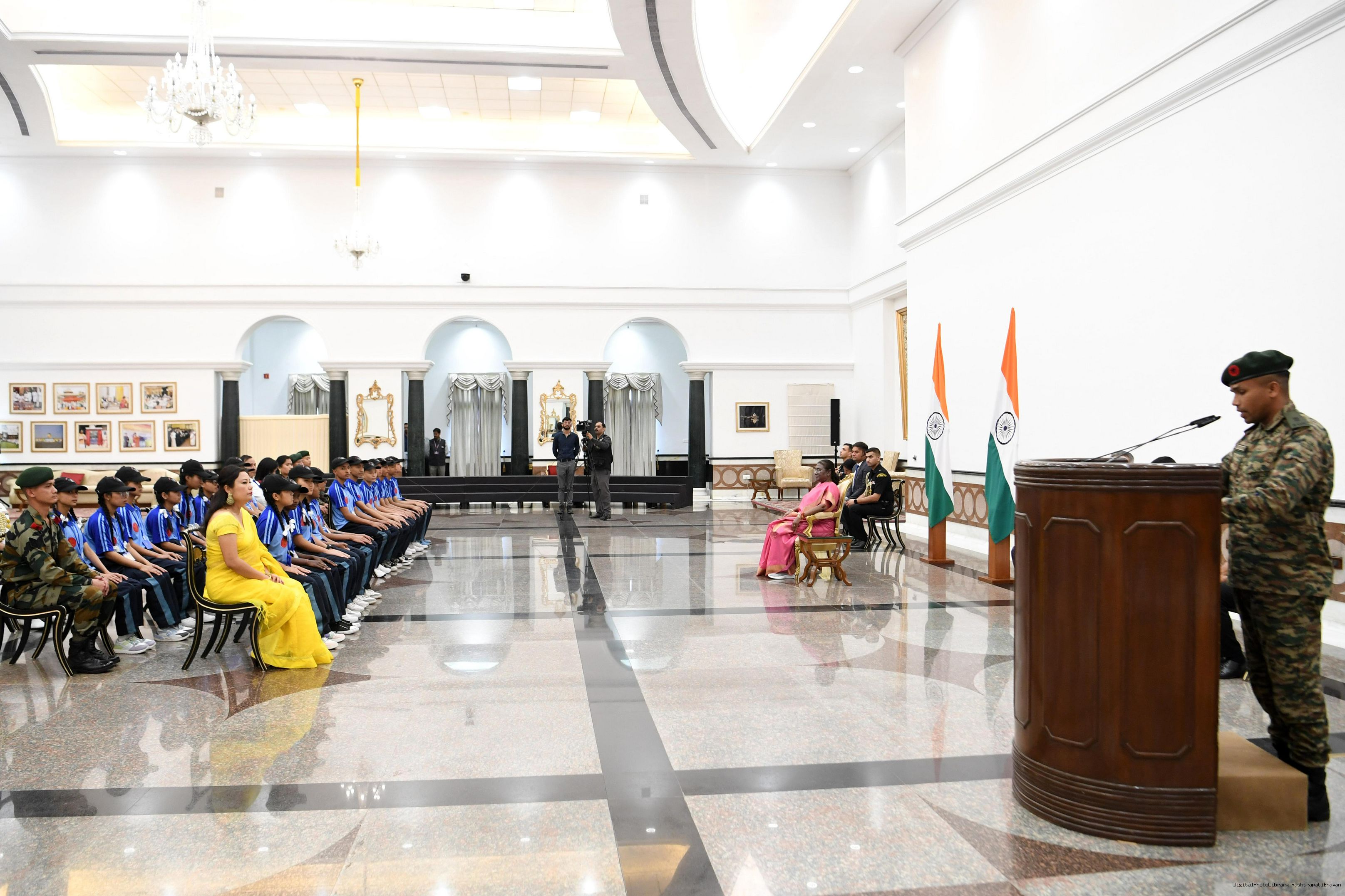 | Caption: | The President of India Smt Droupadi Murmu met a group of students from Gairibas Higher Secondary School, Dalgaon, Kalimpong, West Bengal as a part of National Integration Tour(NIT) at Rashtrapati Bhavan on March 18, 2024. |