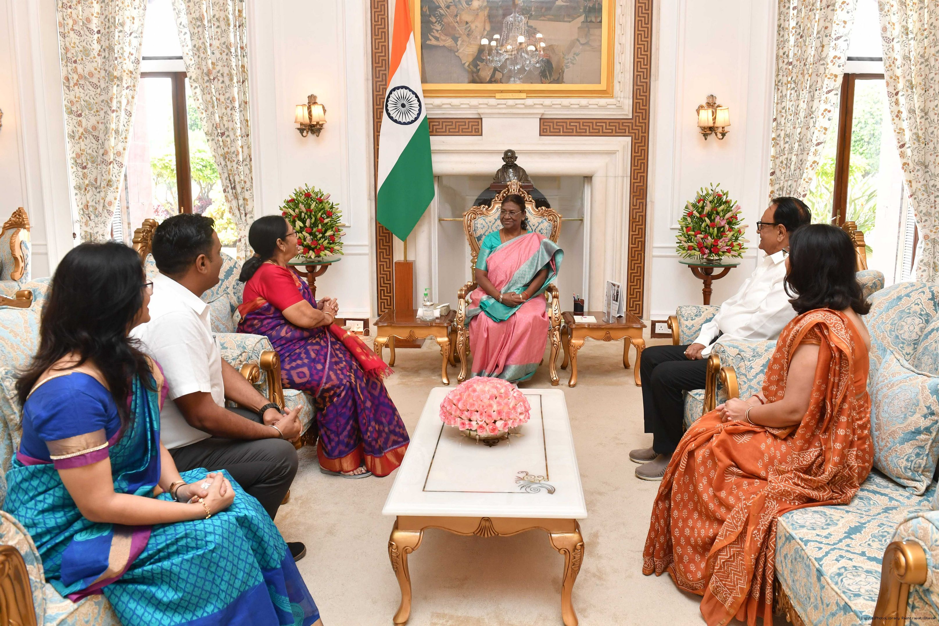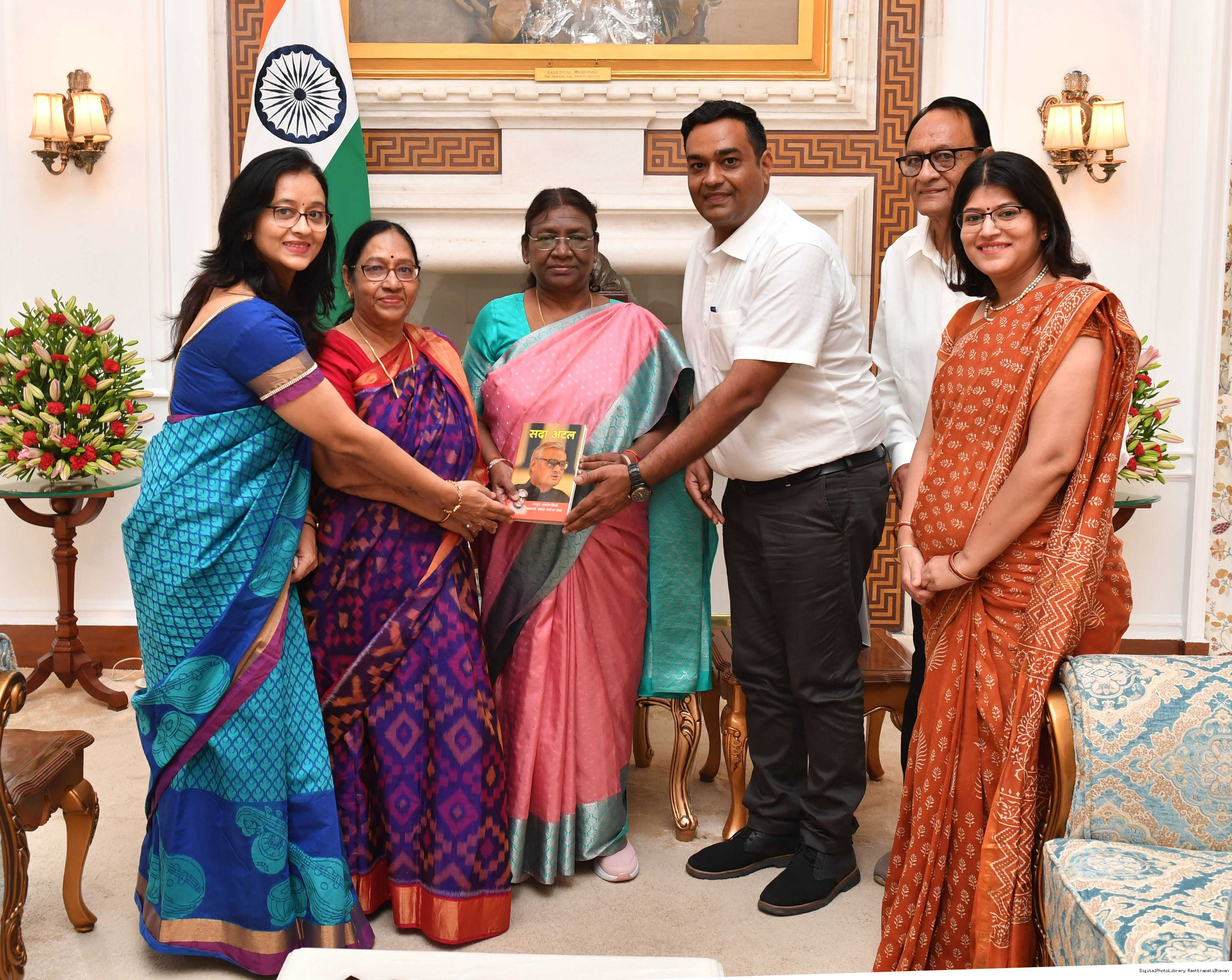 | Caption: | Smt Mala Vajpayee Tiwari, Niece of former Prime Minister of India, Bharat Ratna Shri Atal Bihari Vajpayee along with others meeting with the President of India, Smt. Droupadi Murmu at Rashtrapati Bhavan on September 14, 2023. |