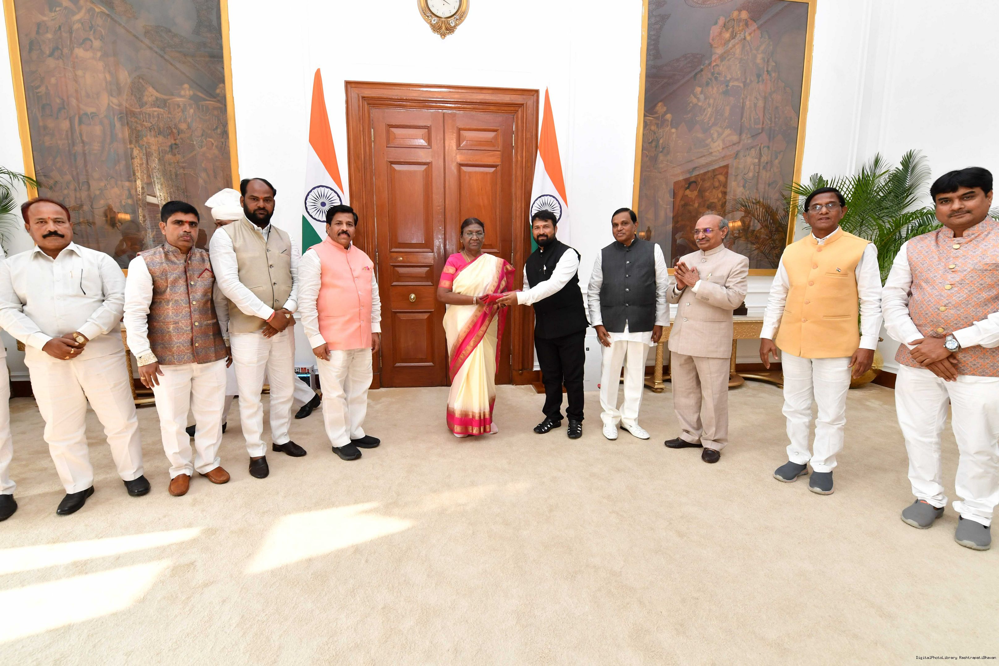 | Caption: | Shri Girapnore Dinesh Patil, State Treasurer, Lingayath Linga Balija Sangham, Telagana State along with others meeting with the President of India, Smt. Droupadi Murmu at Rashtrapati Bhavan on September 14, 2023. |