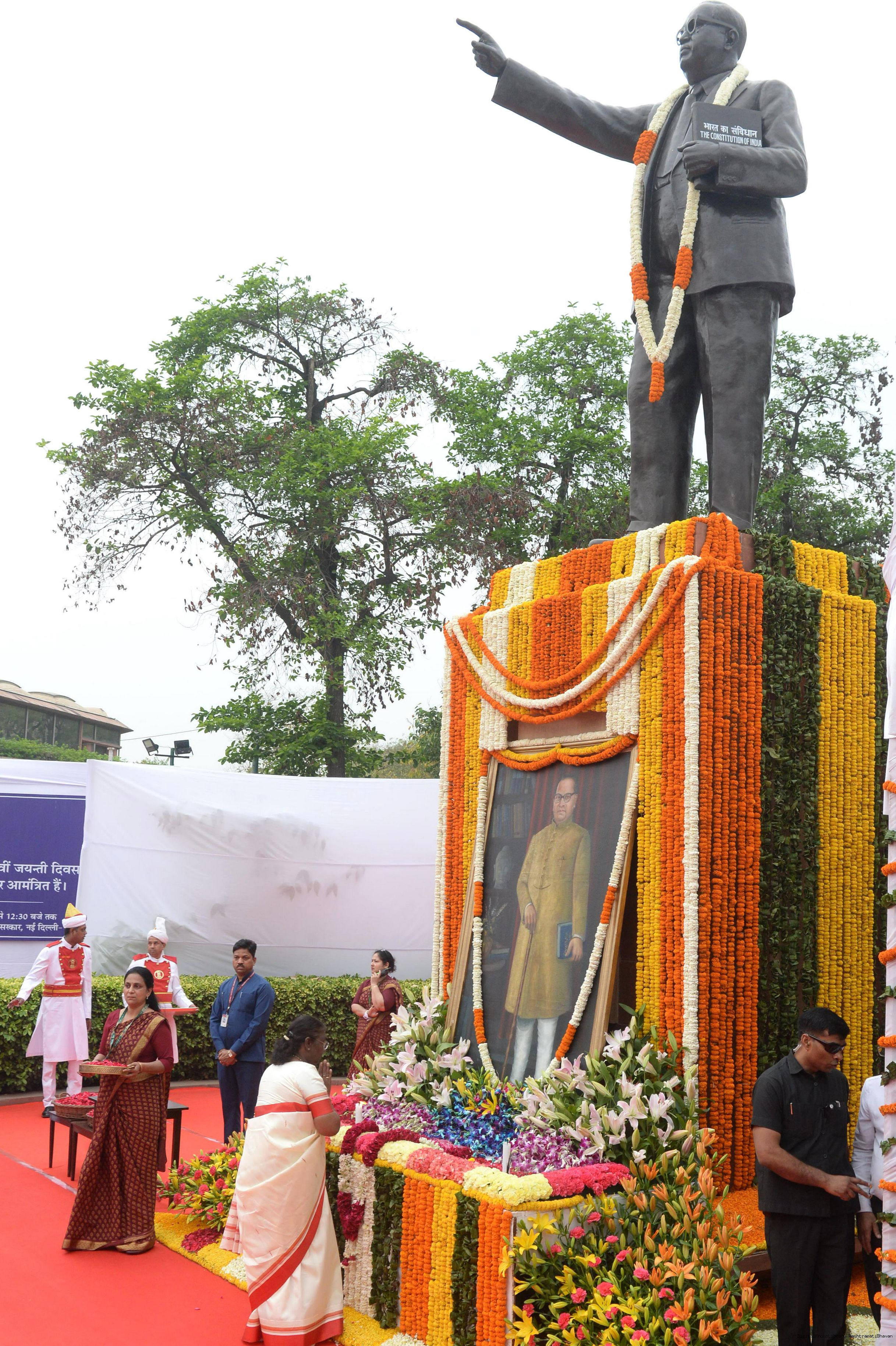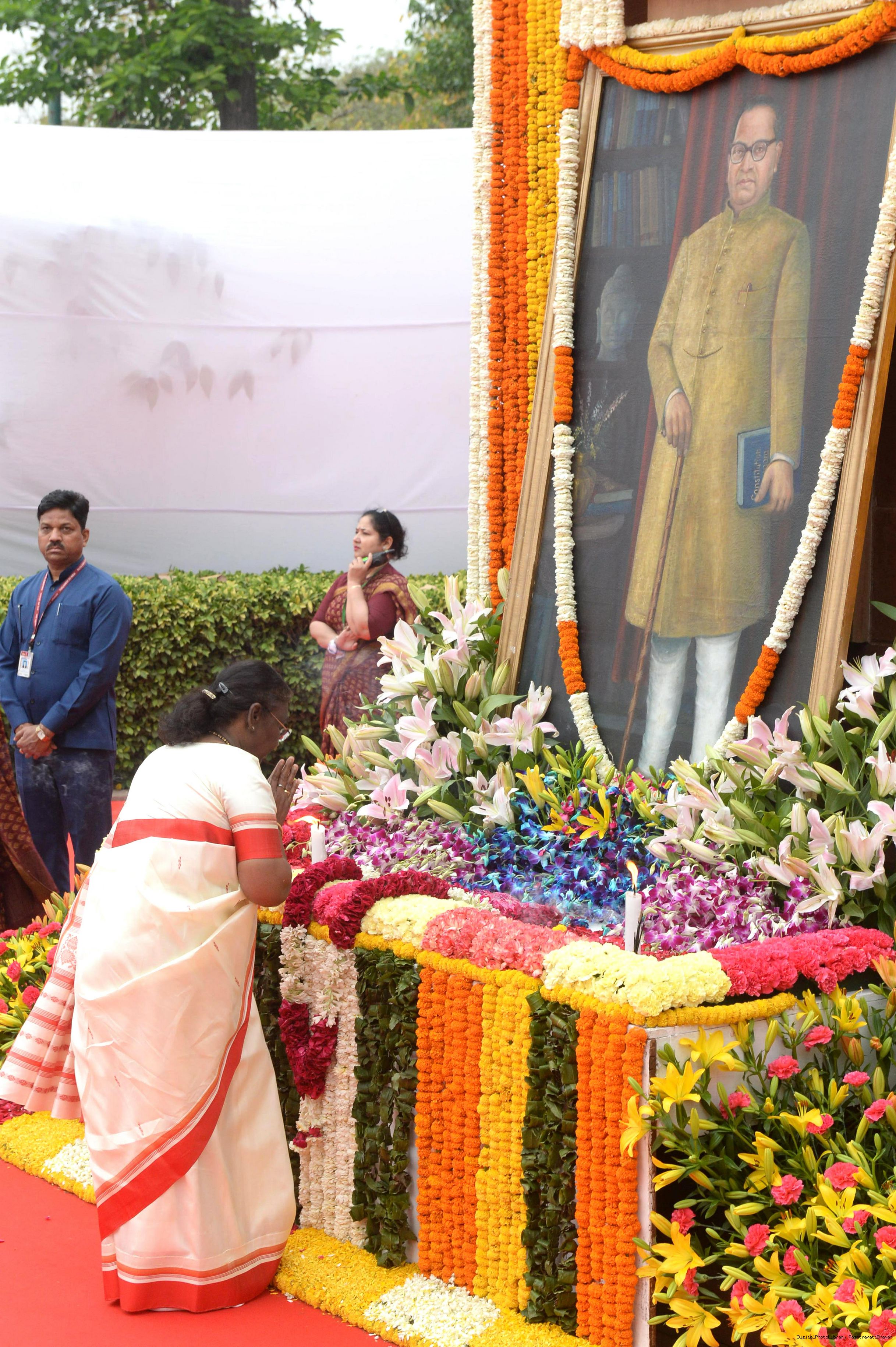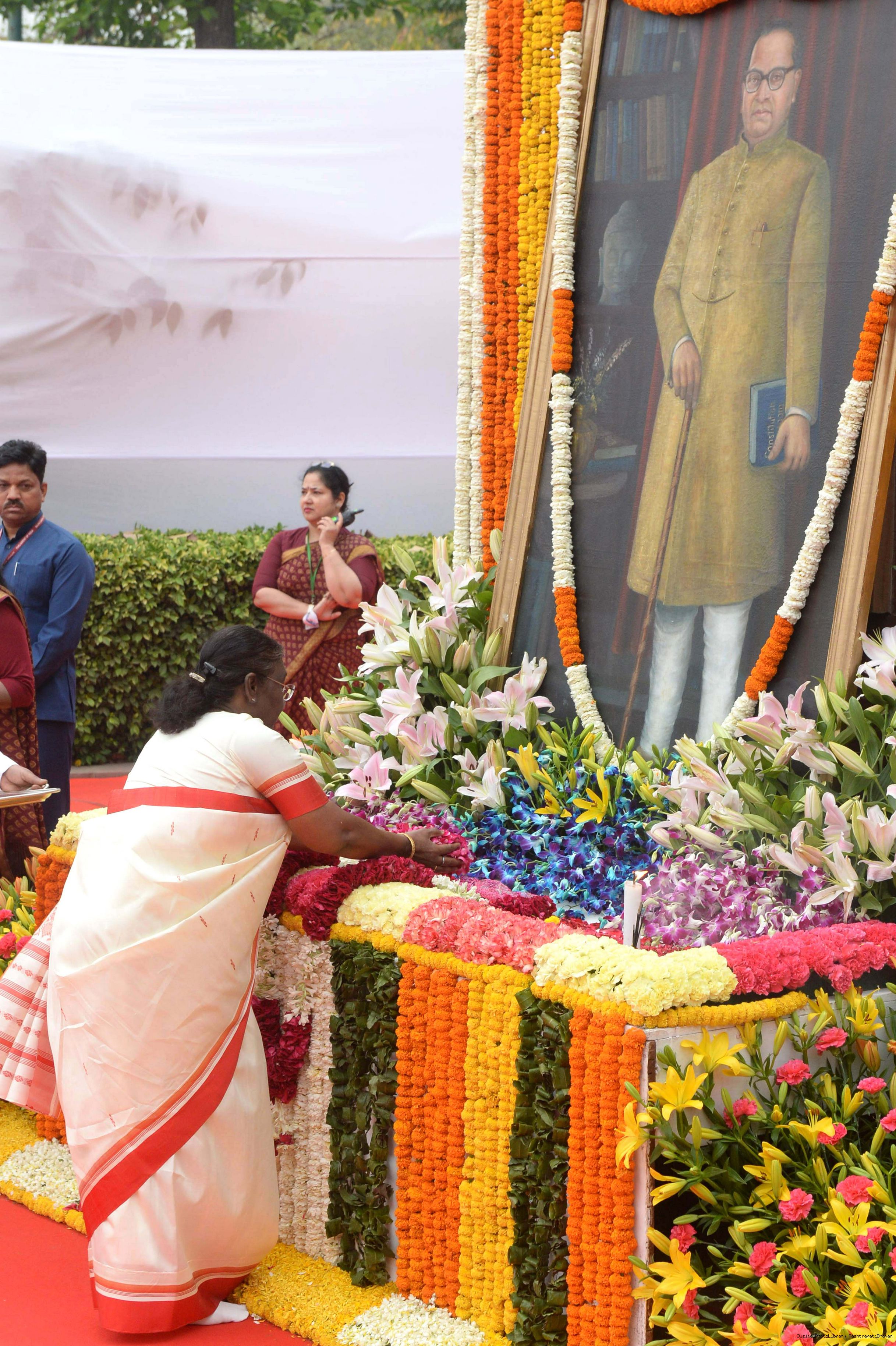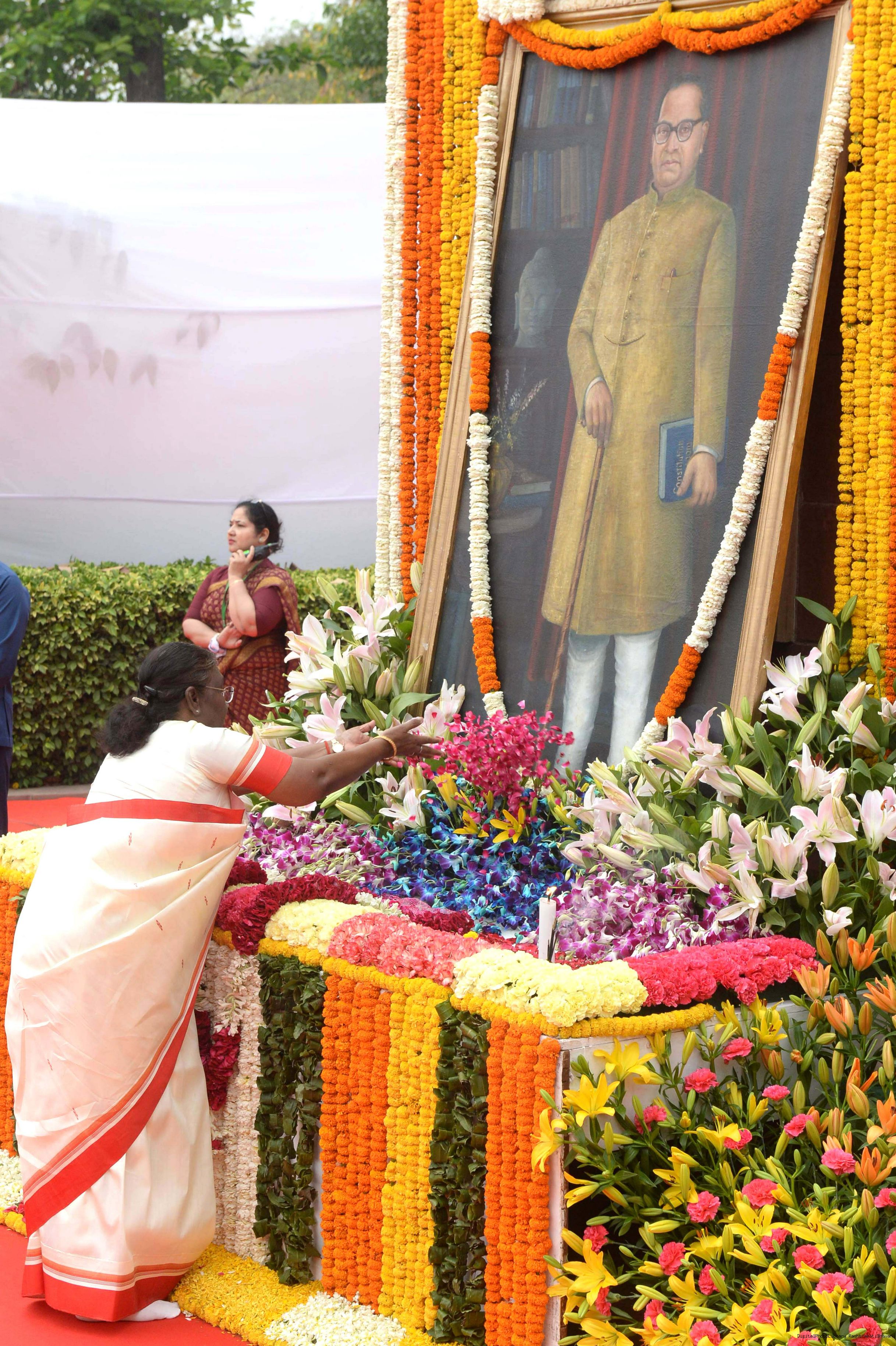 | Caption: | The President of India, Smt. Droupadi Murmu paying floral tributes to Babasaheb Dr. B.R. Ambedkar on his birth anniversary, in New Delhi on April 14, 2024. |