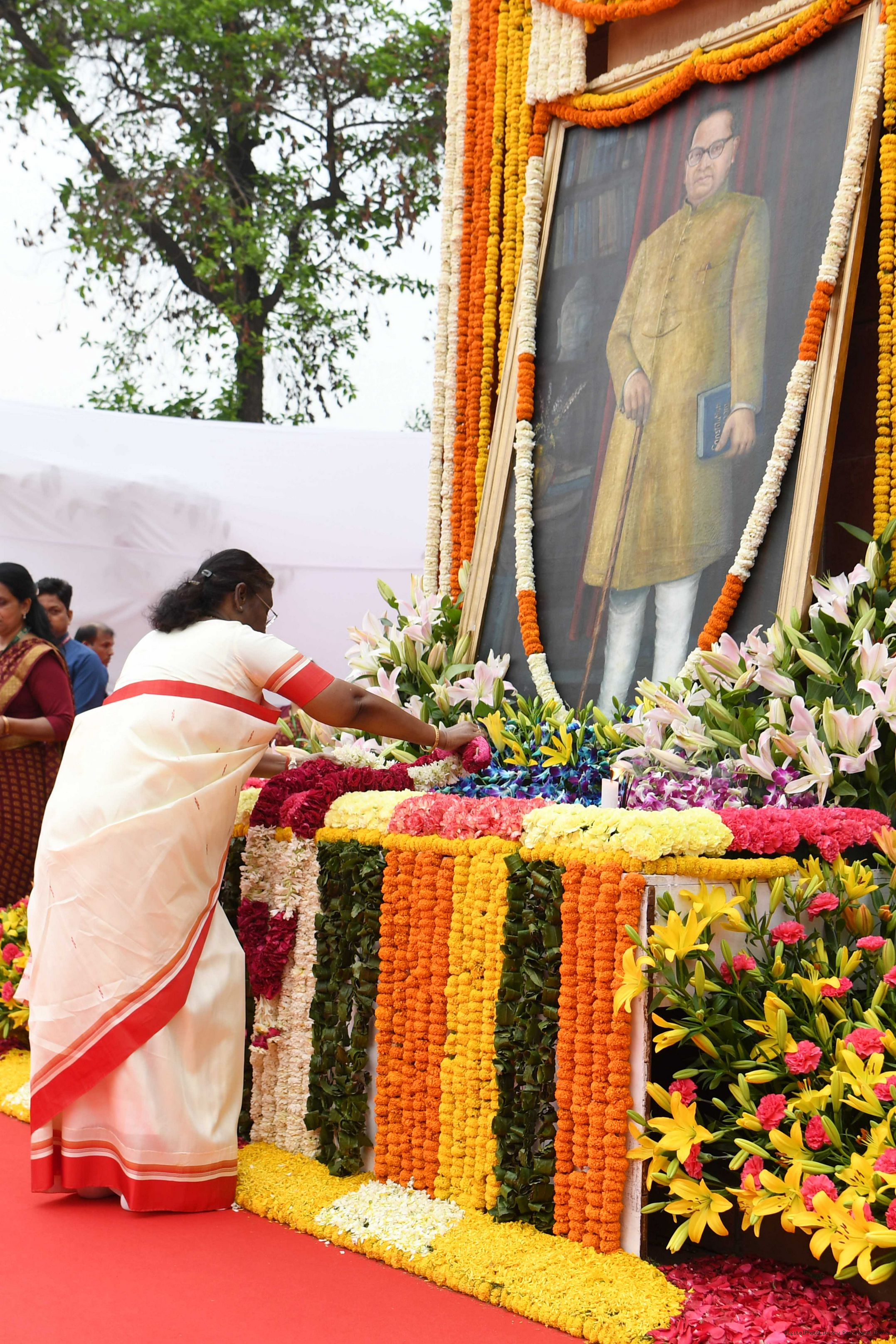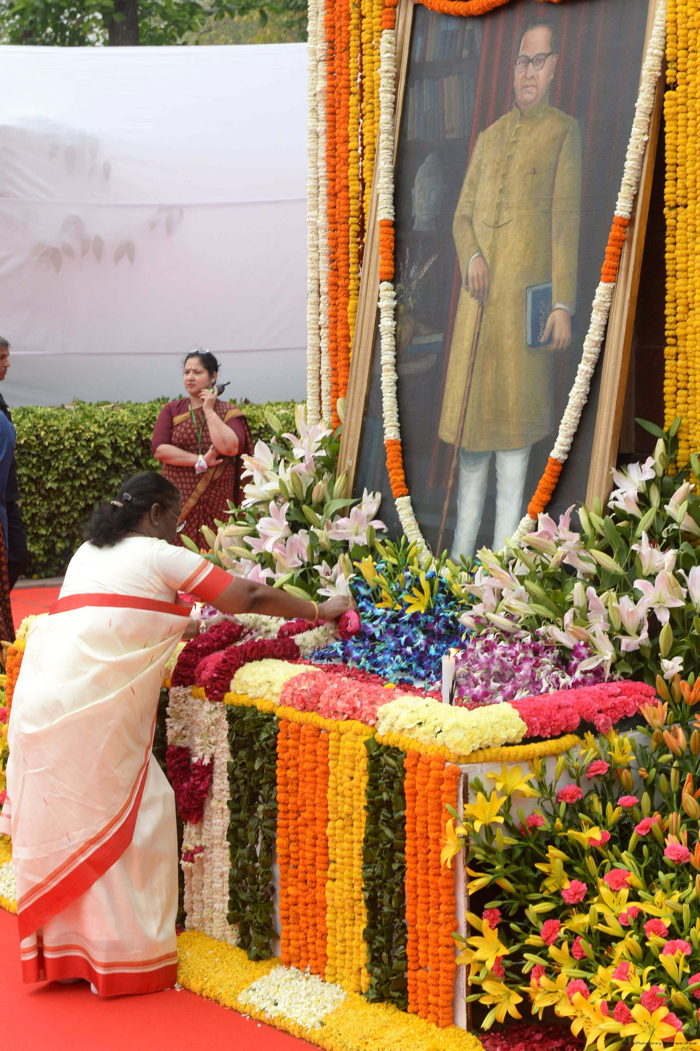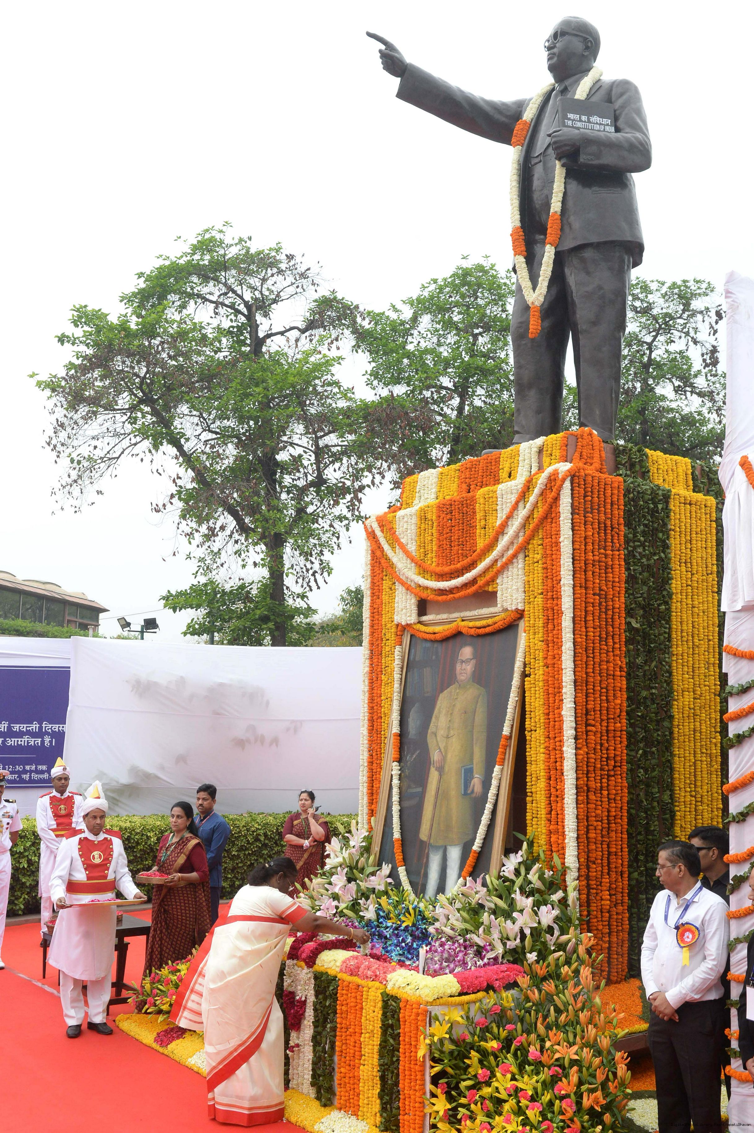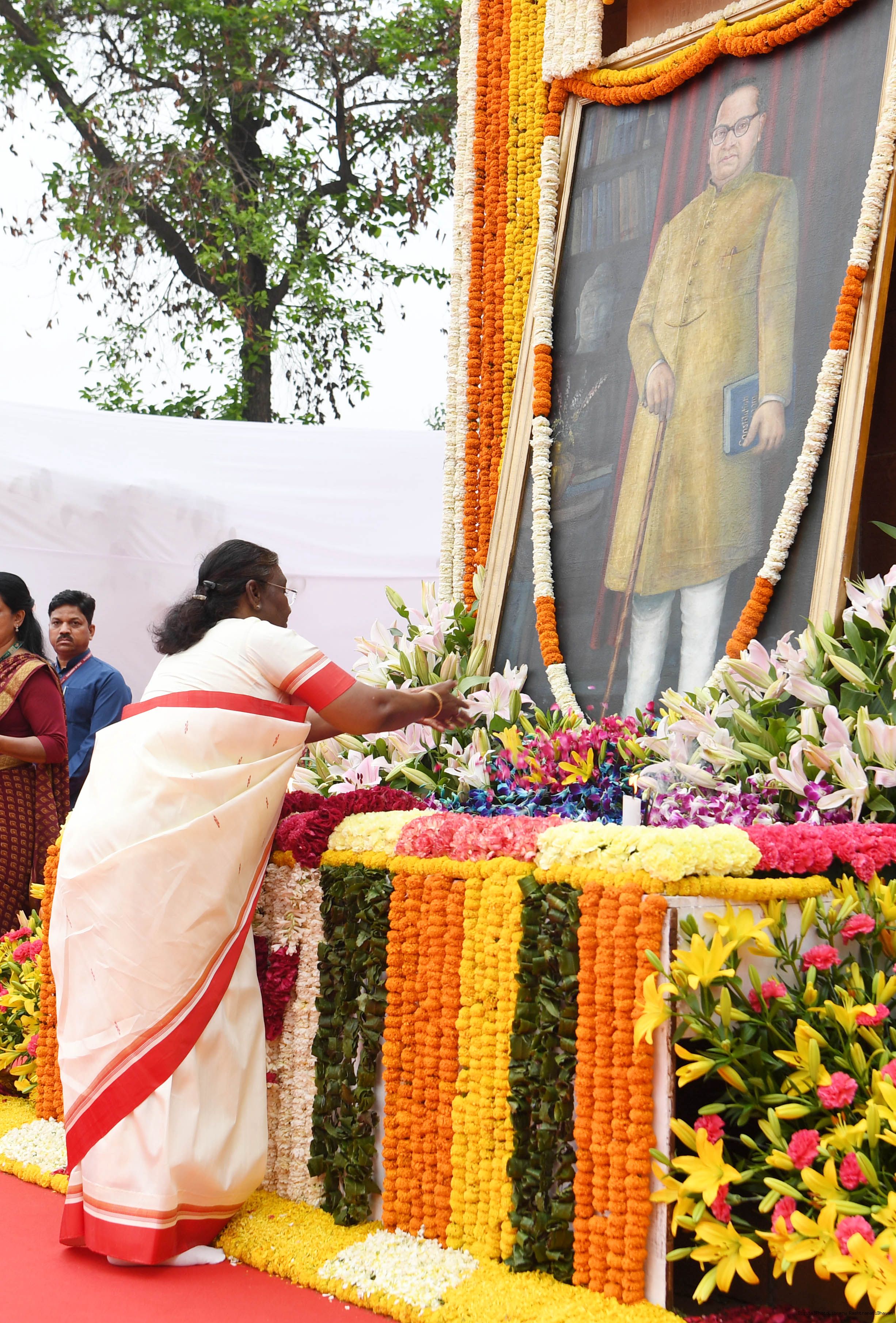 | Caption: | The President of India, Smt. Droupadi Murmu paying floral tributes to Babasaheb Dr. B.R. Ambedkar on his birth anniversary, in New Delhi on April 14, 2024. |