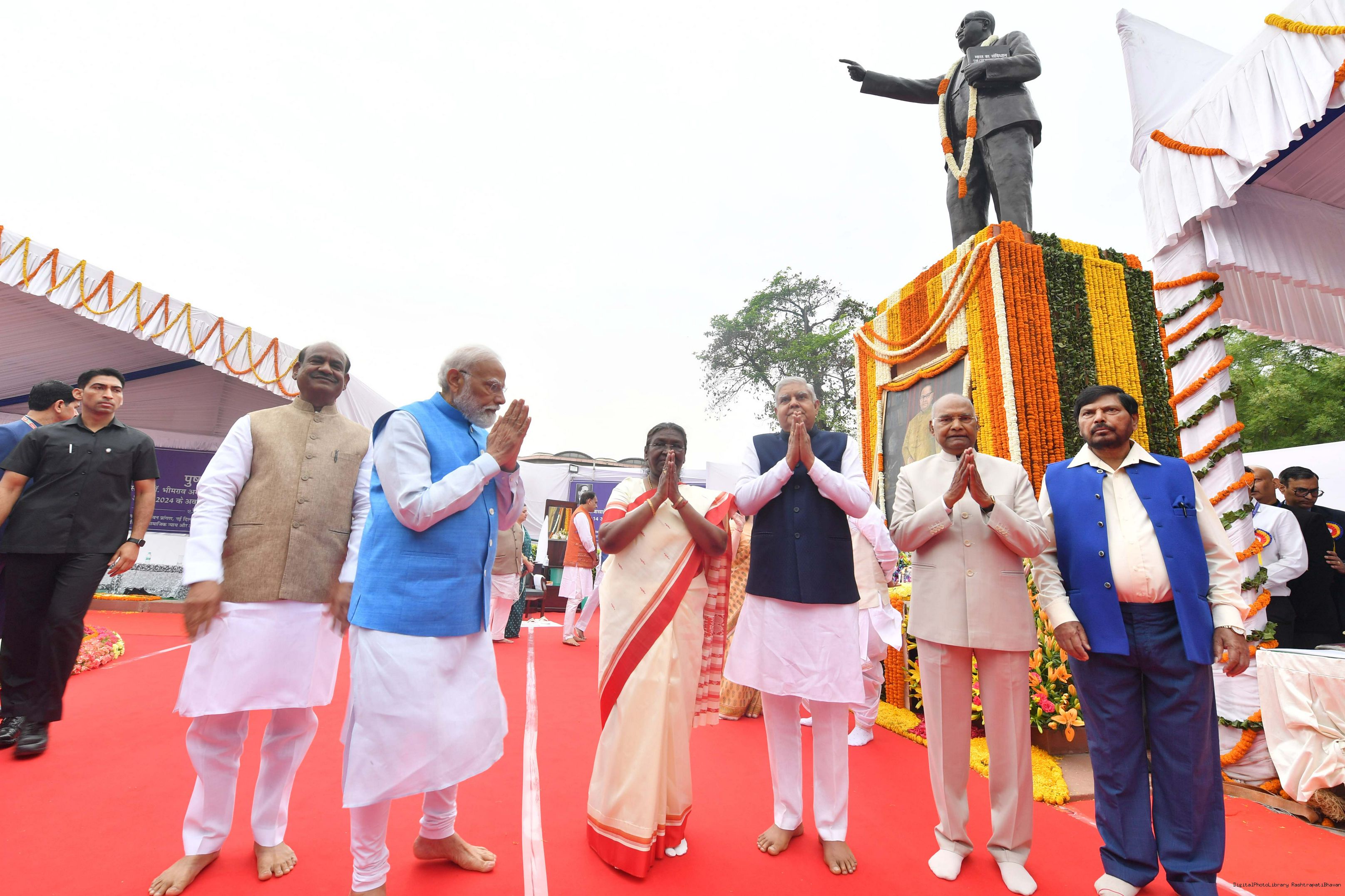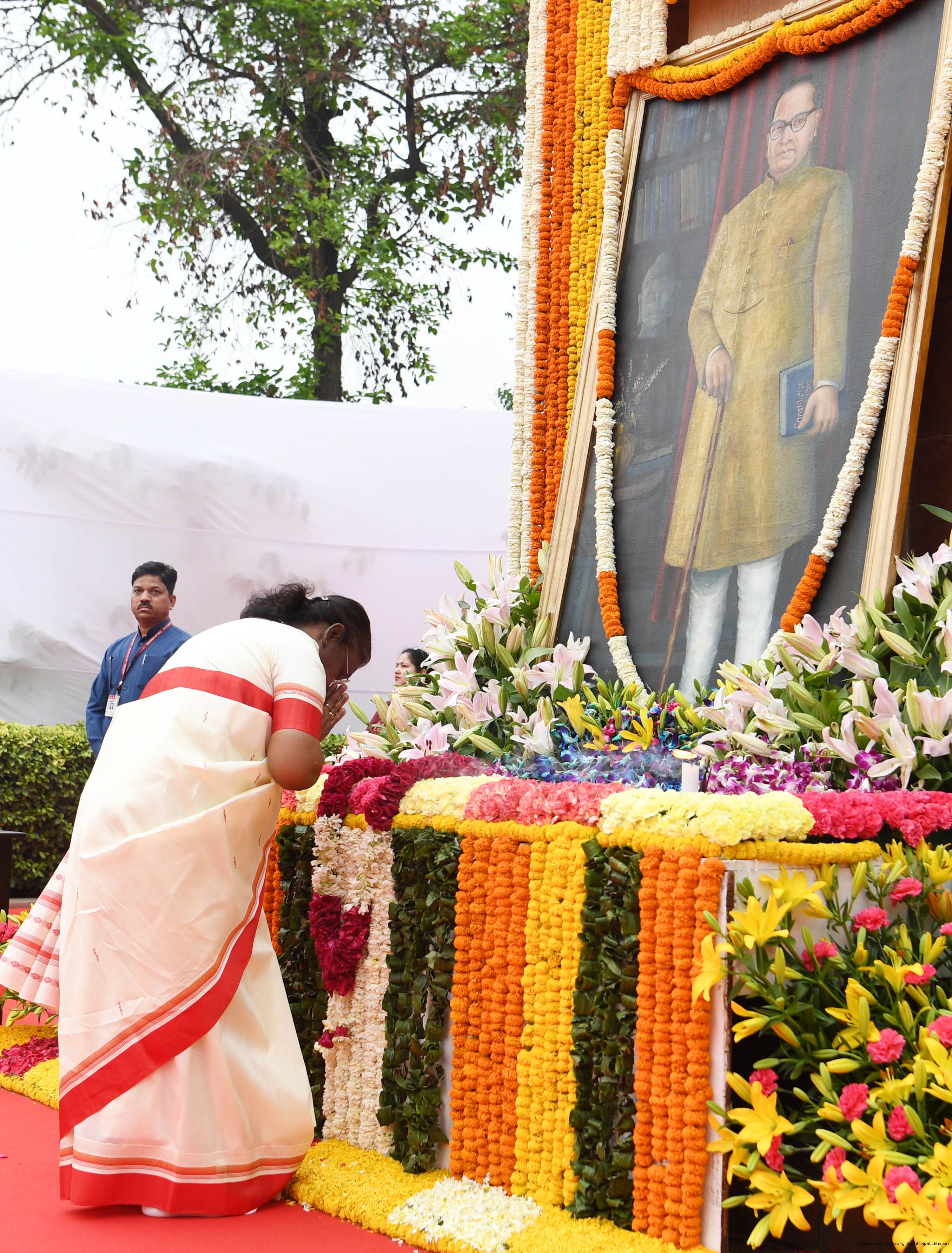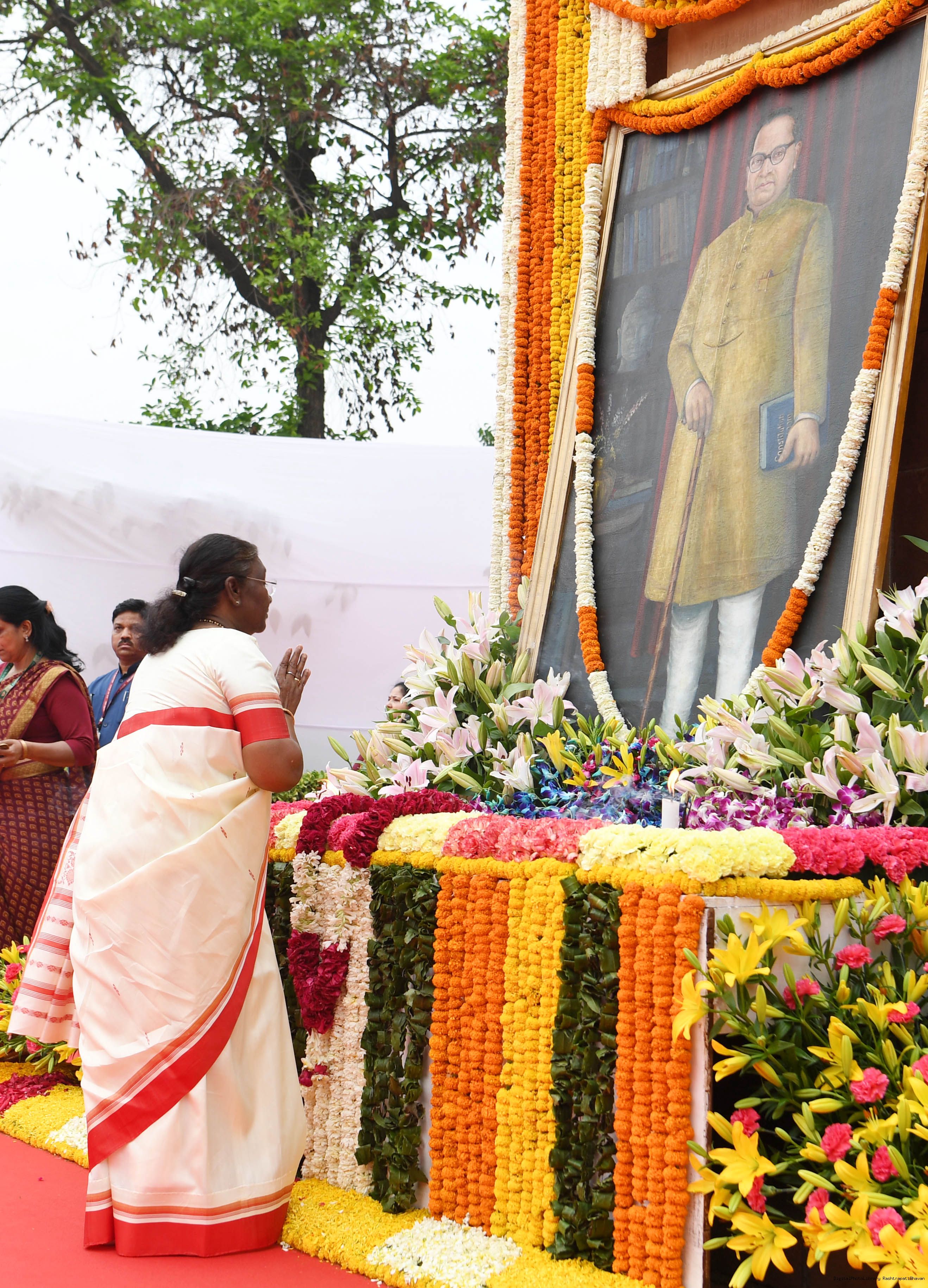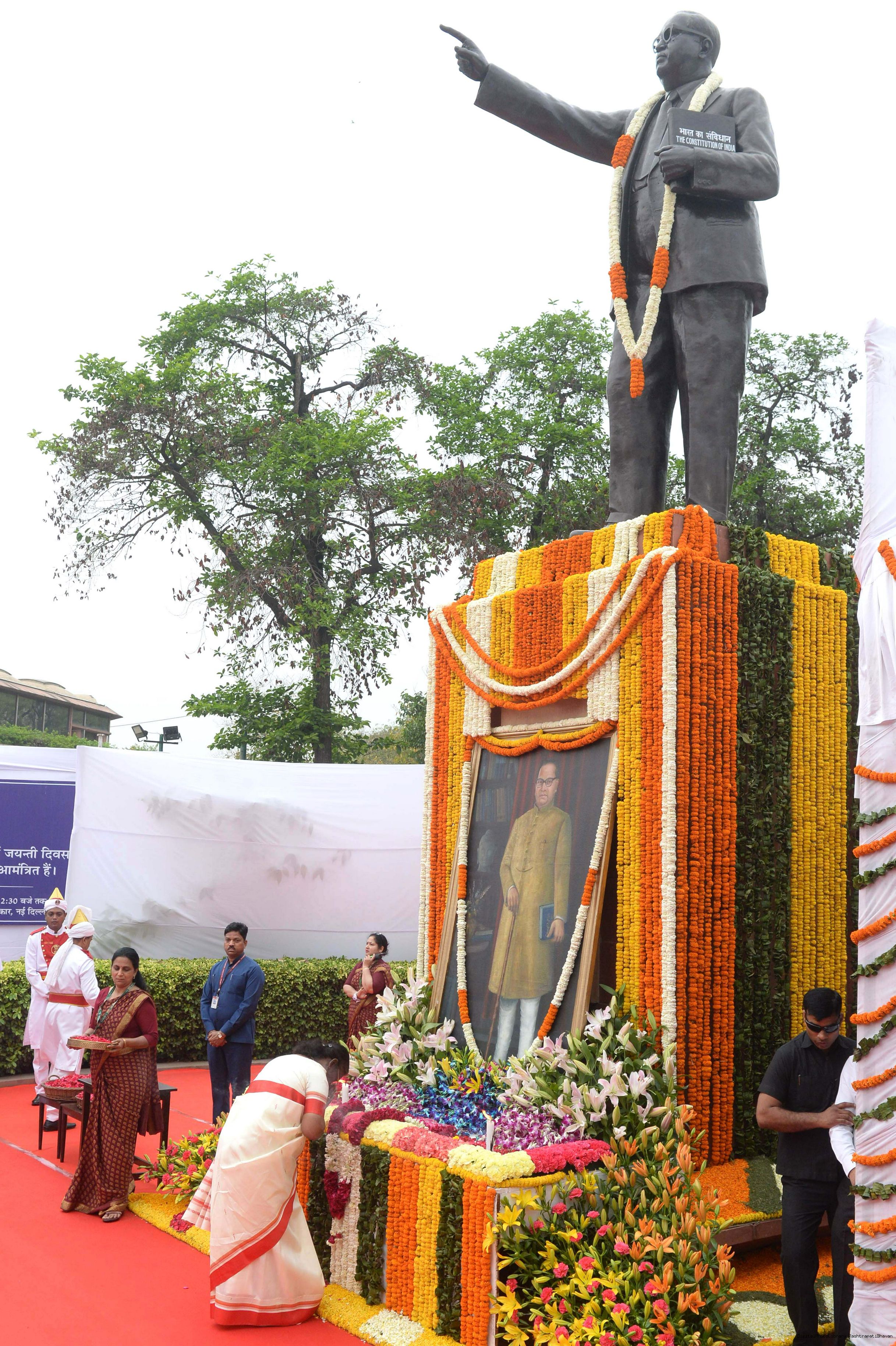 | Caption: | The President of India, Smt. Droupadi Murmu paying floral tributes to Babasaheb Dr. B.R. Ambedkar on his birth anniversary, in New Delhi on April 14, 2024. |