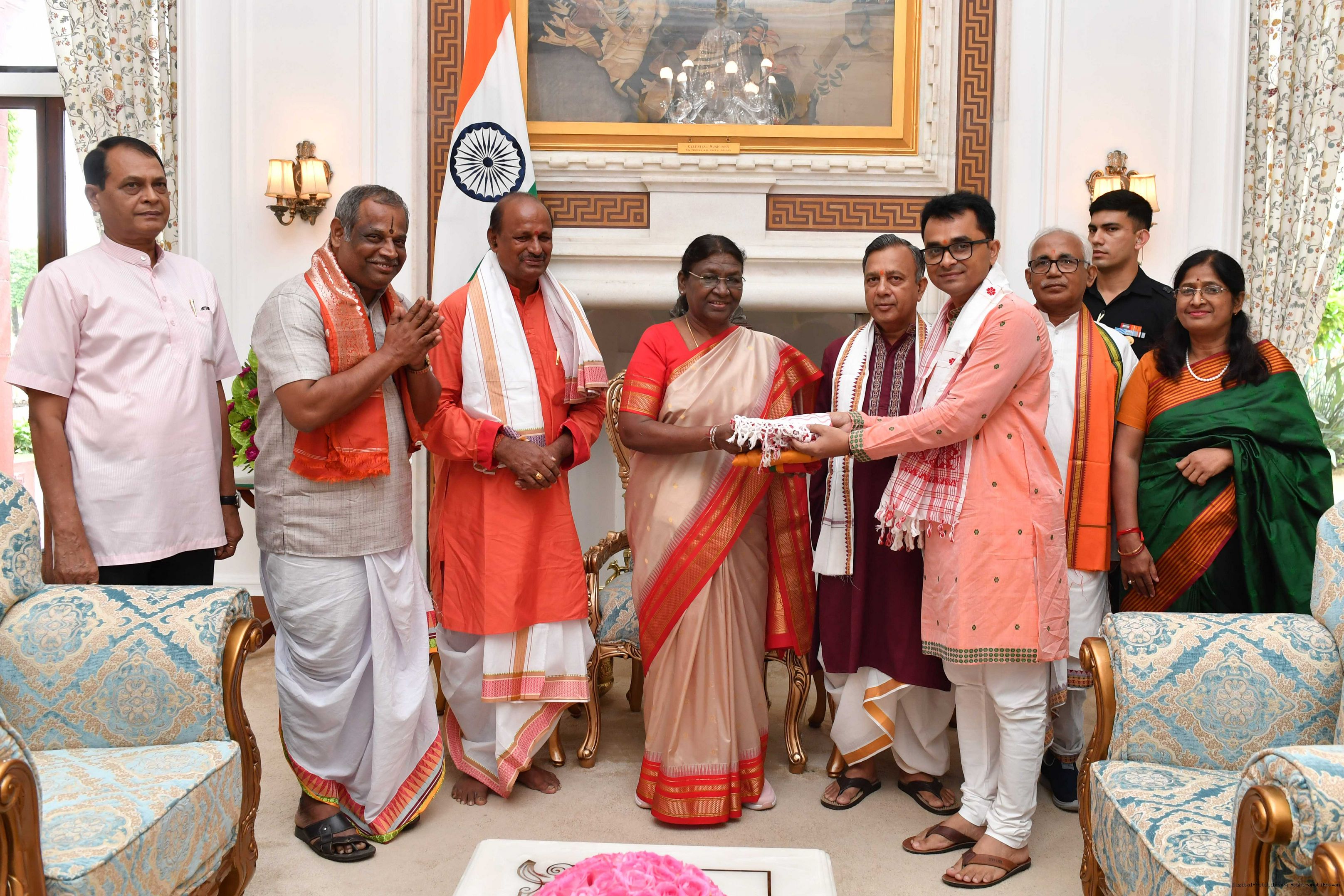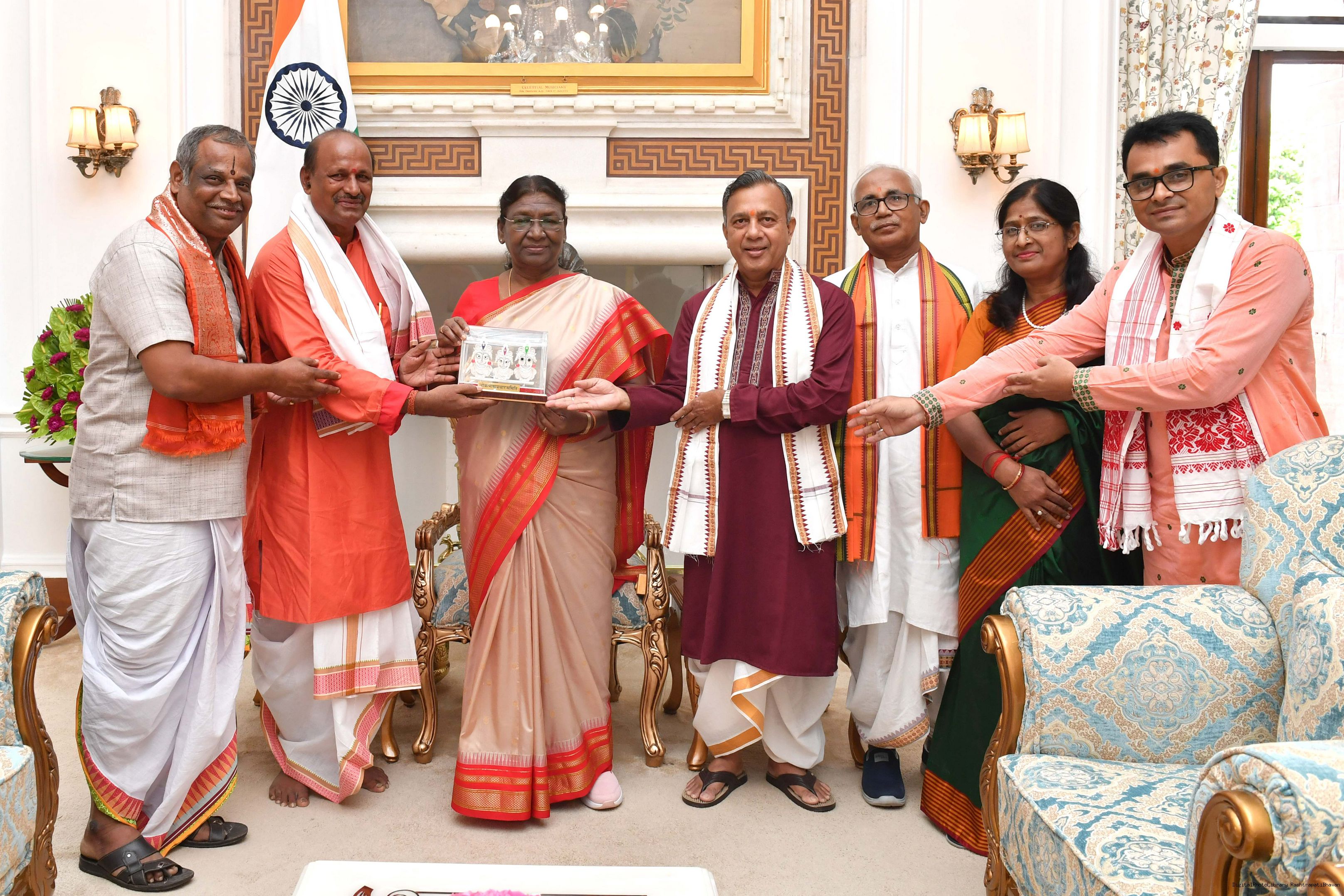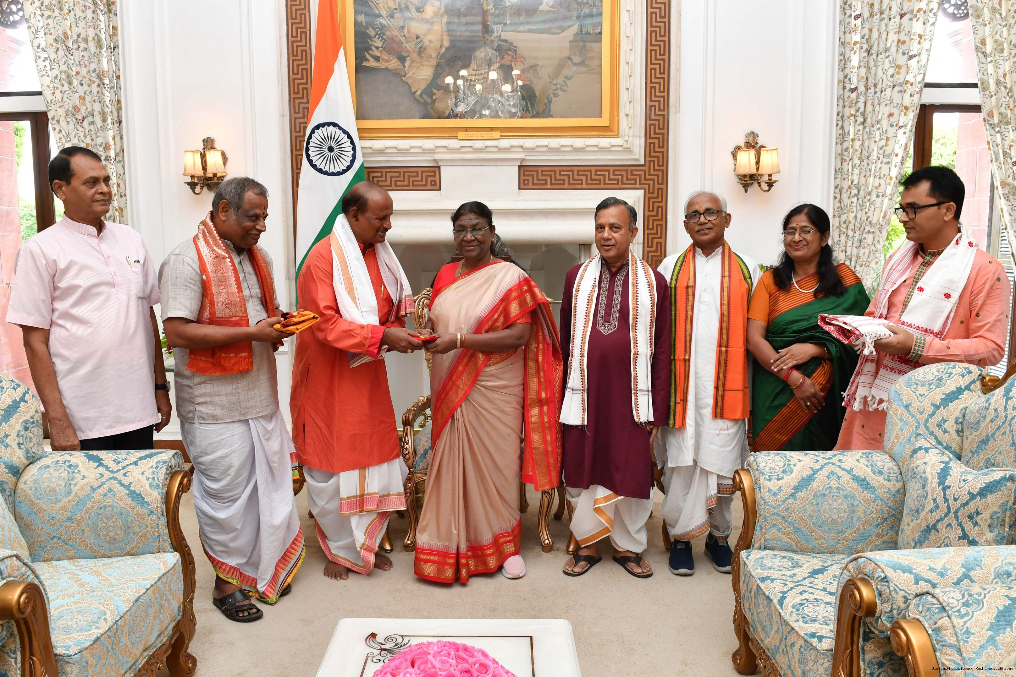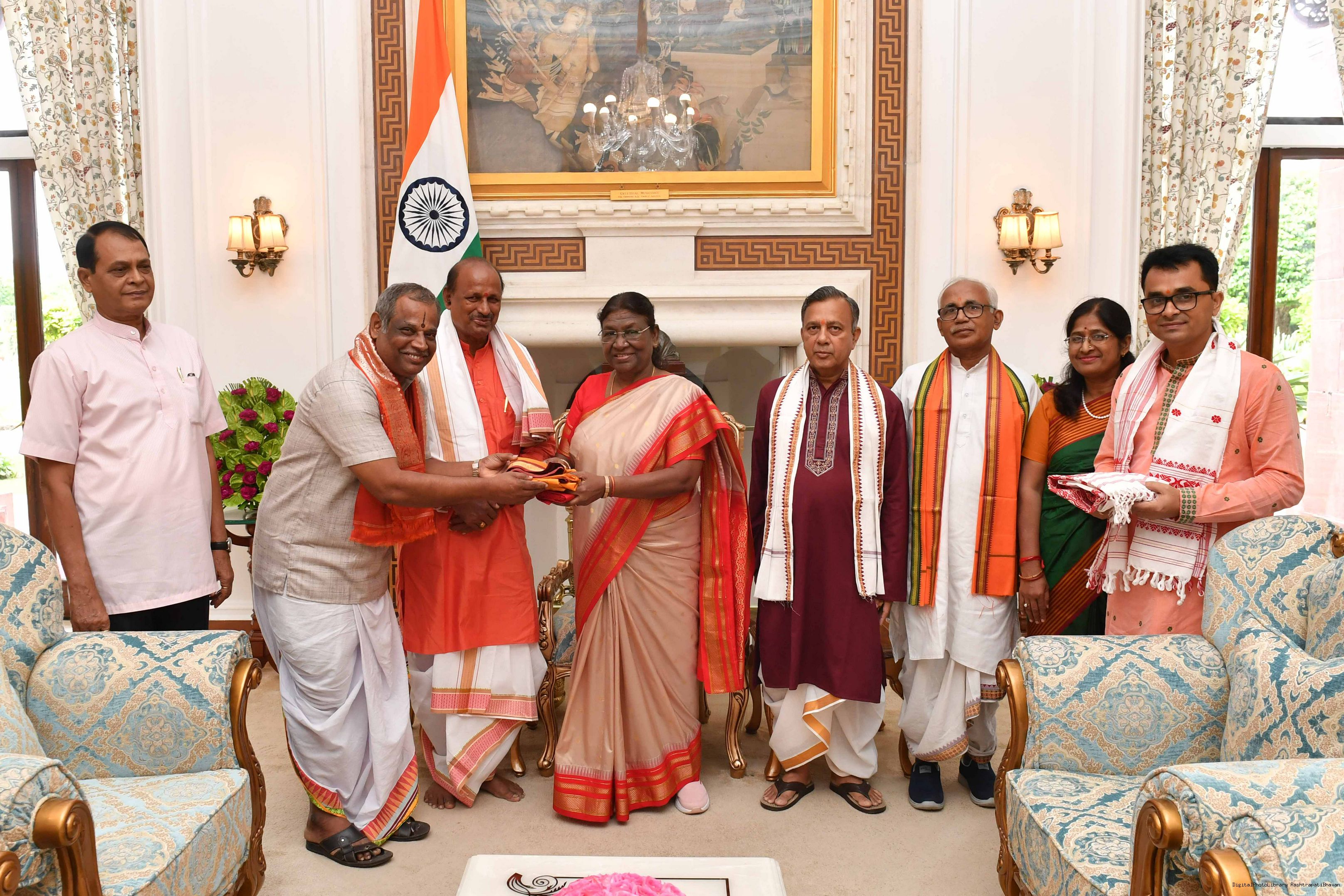 | Caption: | Dr. Sadananda Dikshita, National President, Lokabhasha Prachara Samitih, Bhubaneswar along with others meeting with the President of India, Smt. Droupadi Murmu at Rashtrapati Bhavan on September 18, 2023. |