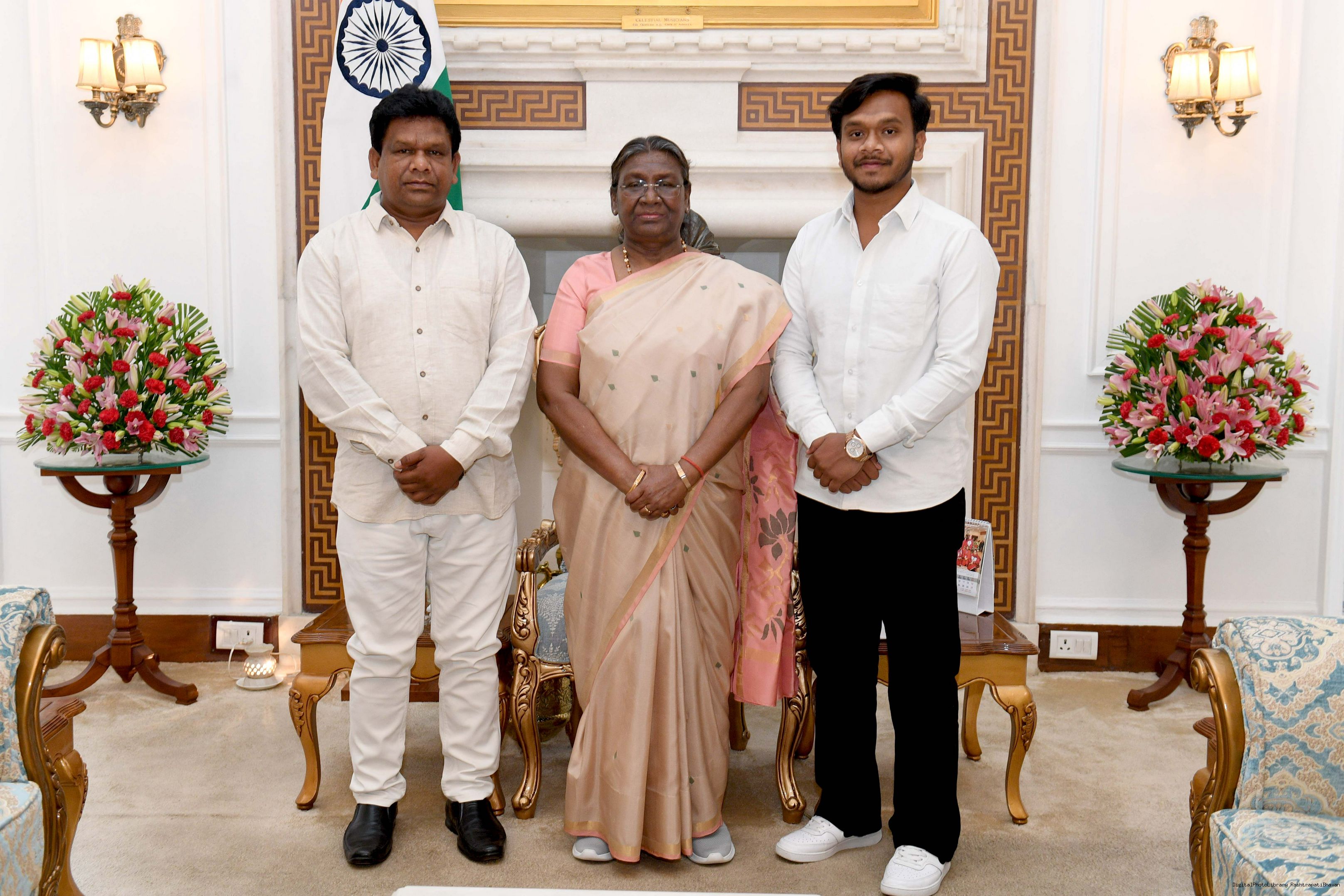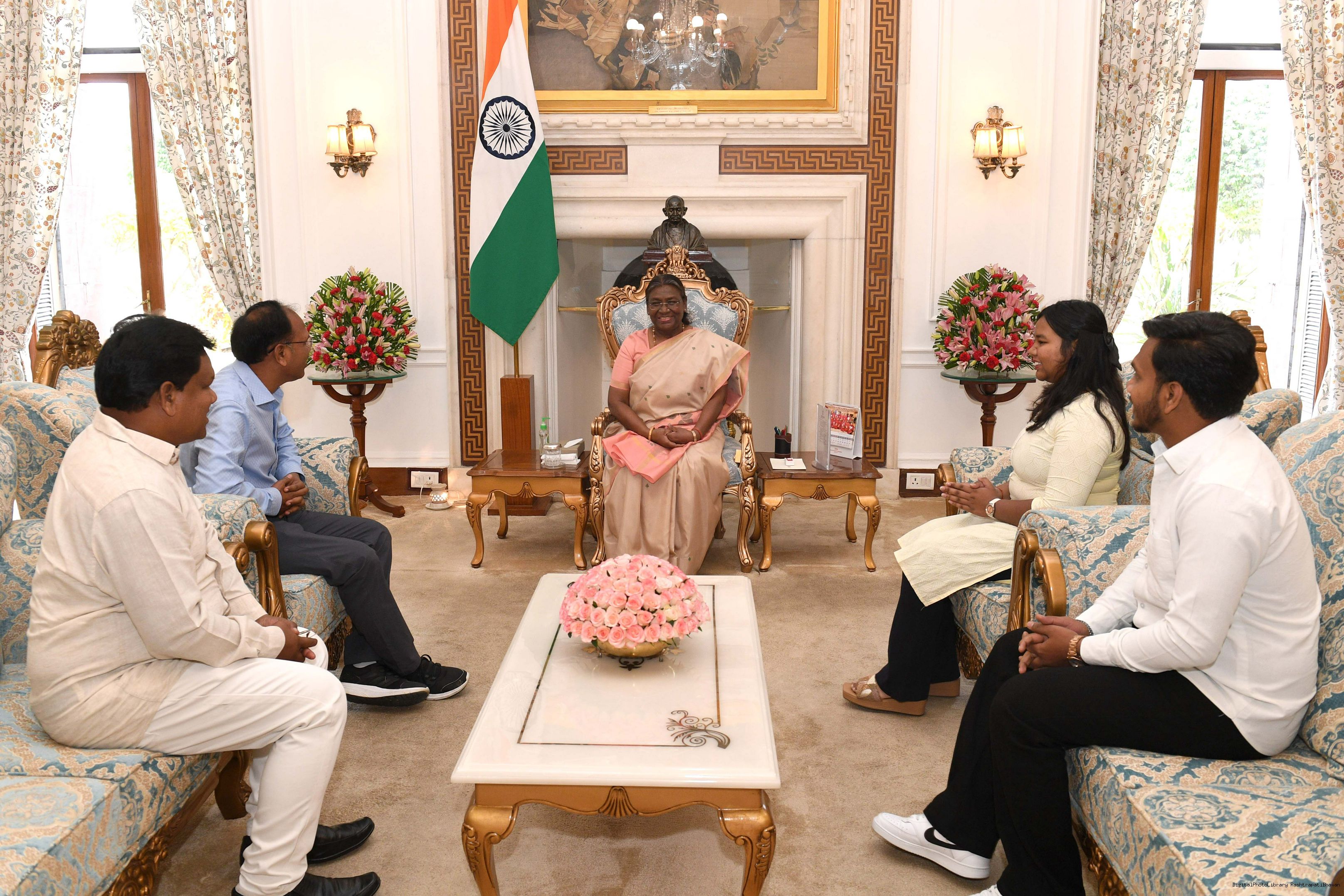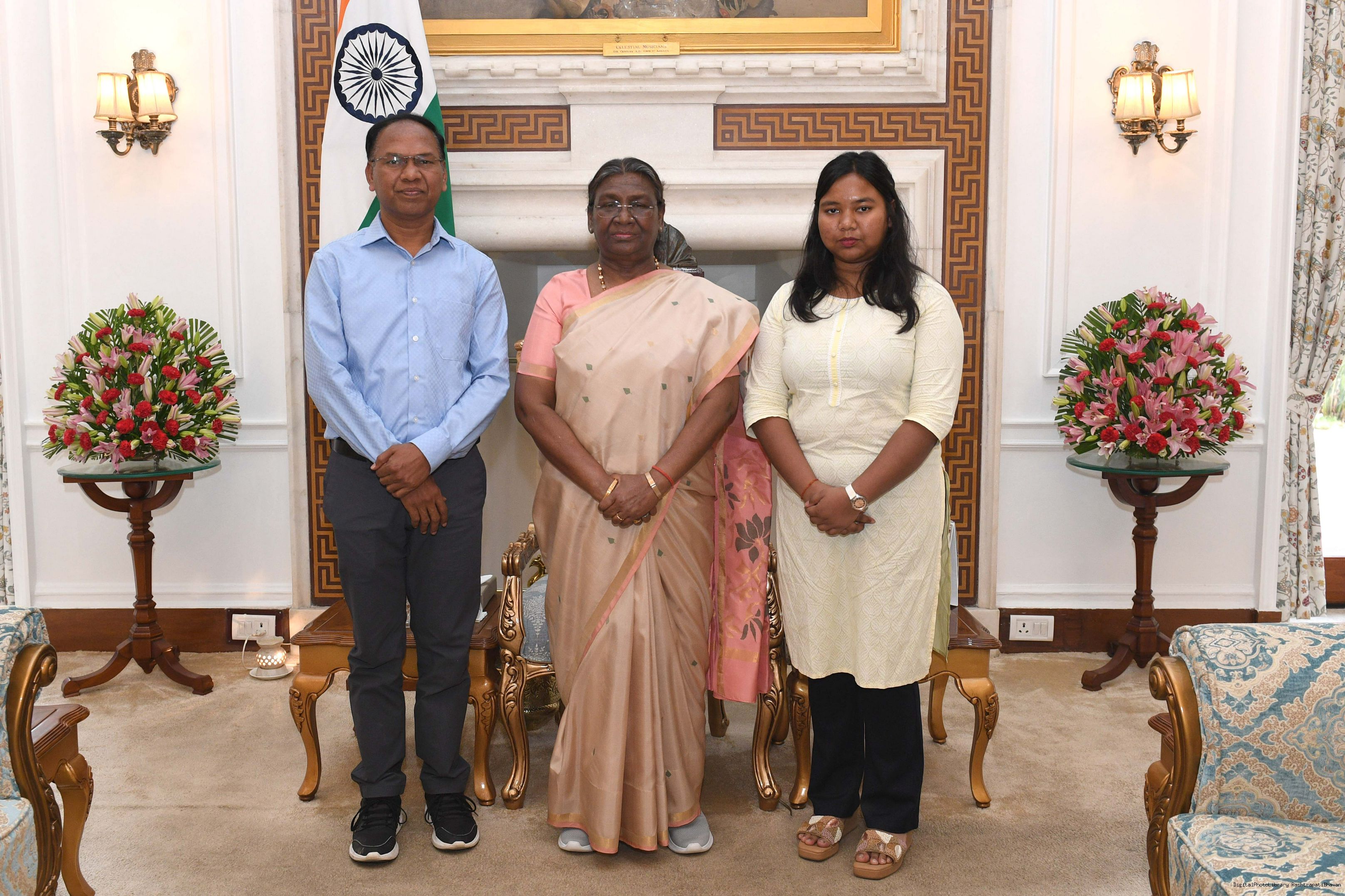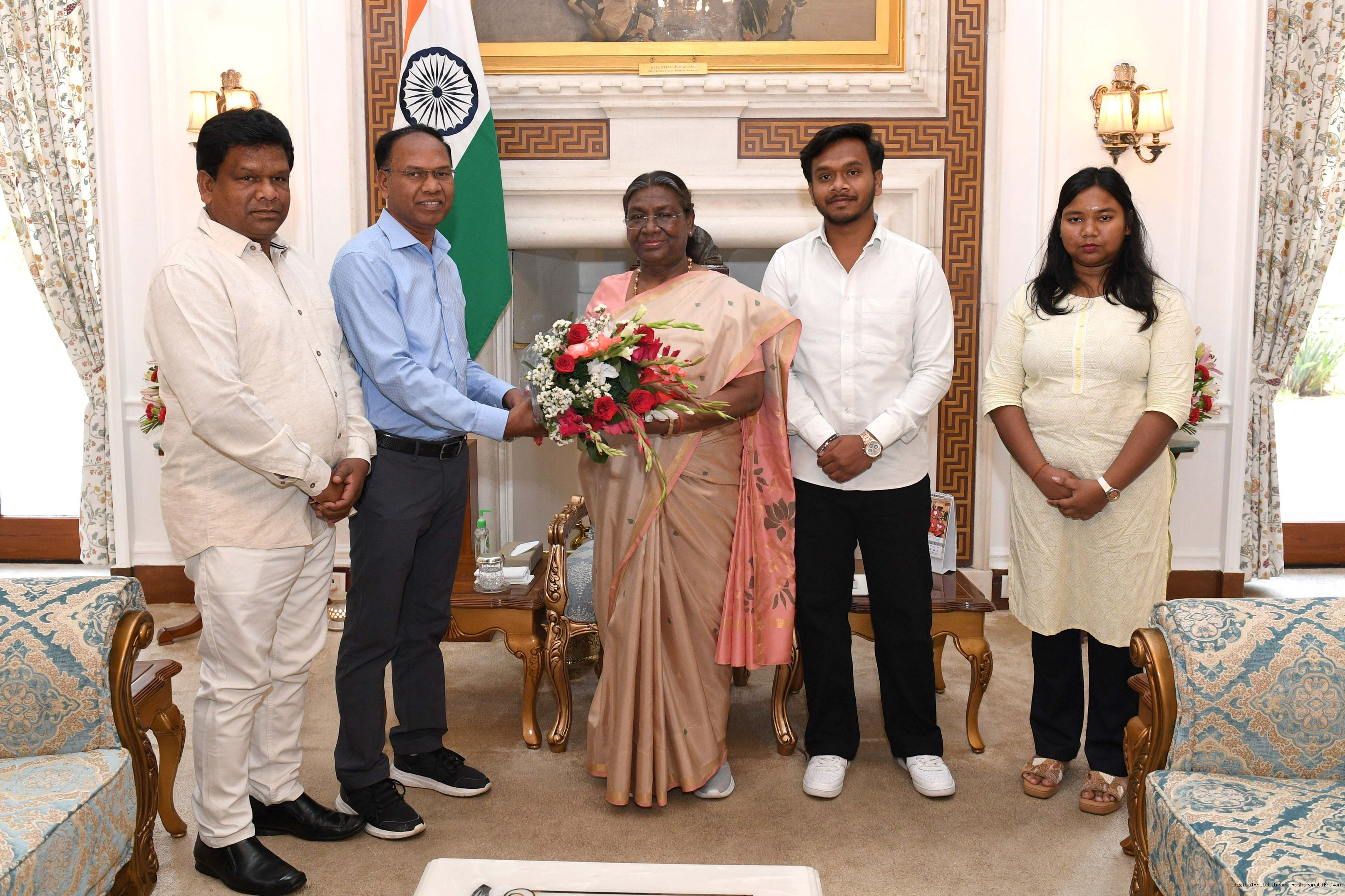 | Caption: | Shri Mahesh Chandra Hembram from Badampahar, Mayurbhanj, Odisha along with family members meeting with the President of India Smt. Droupadi Murmu at Rashtrapati Bhavan on April 29, 2024. |