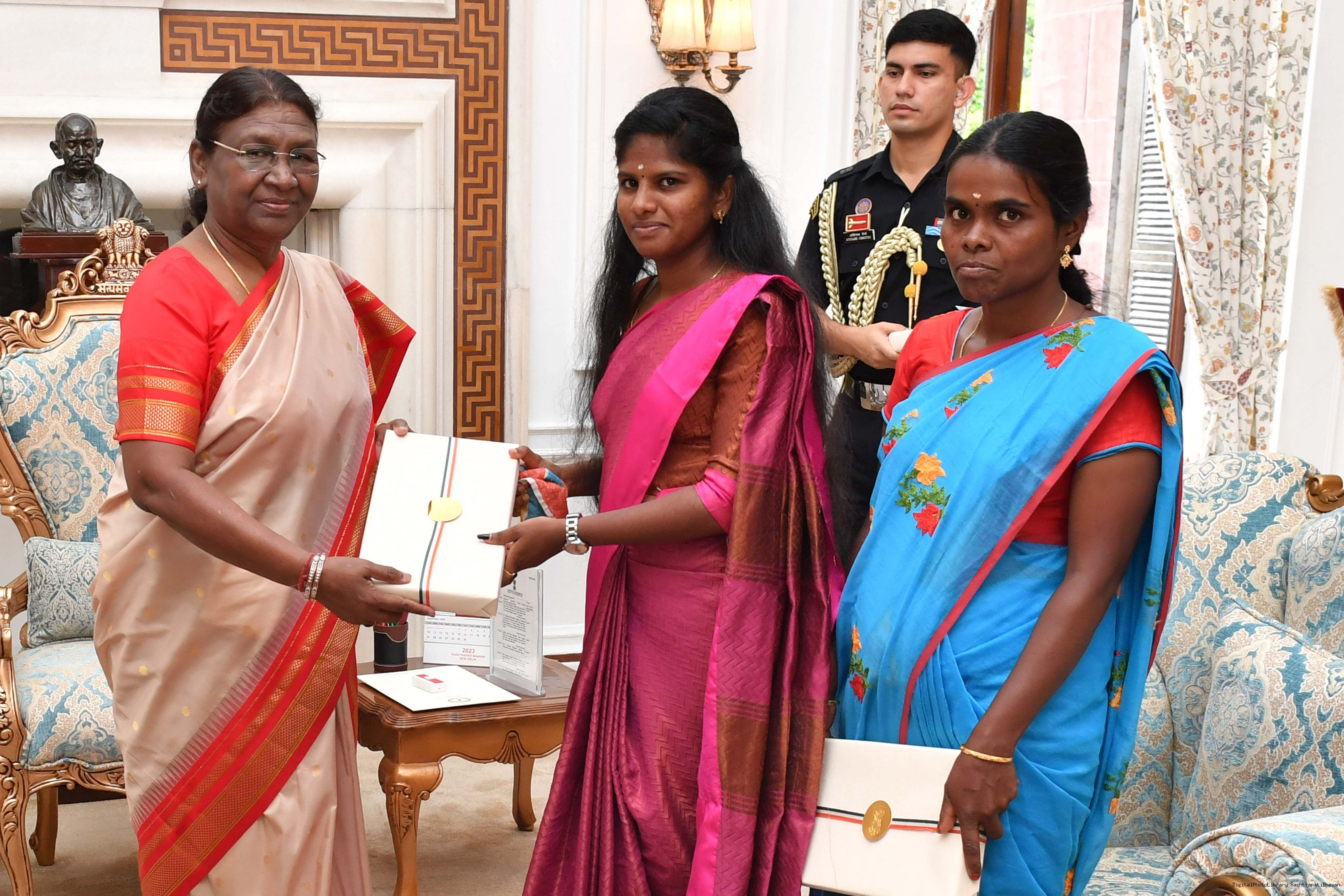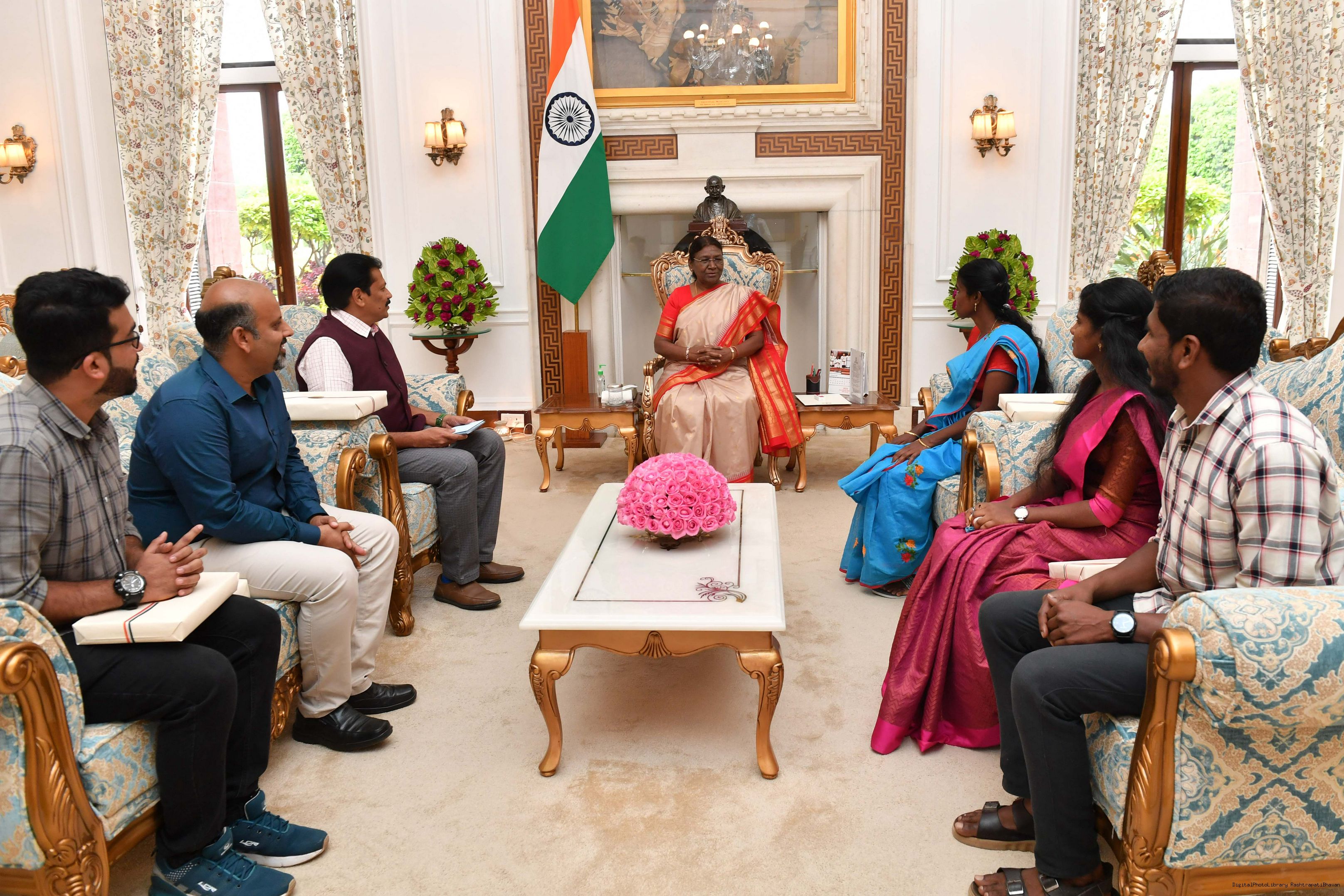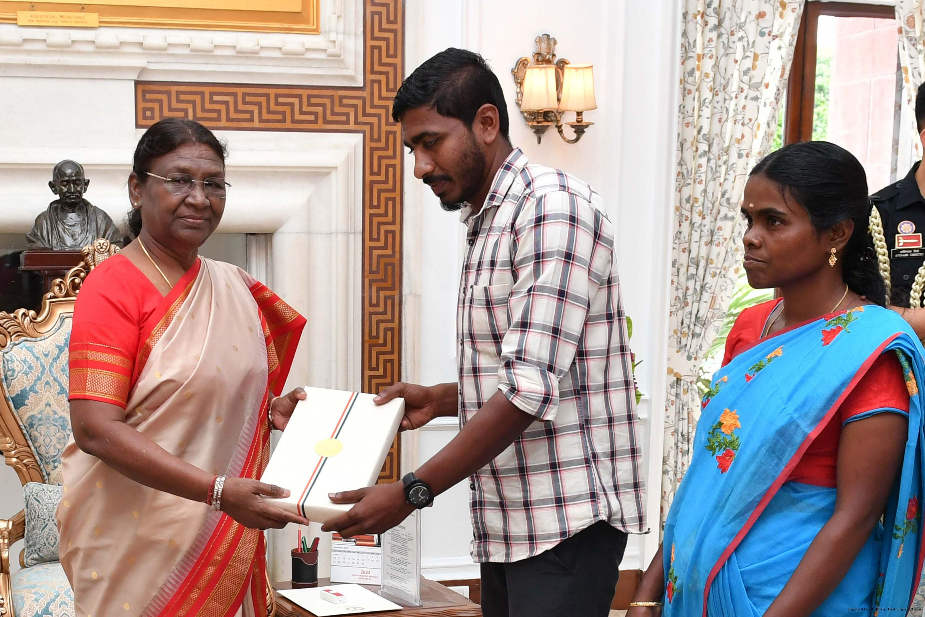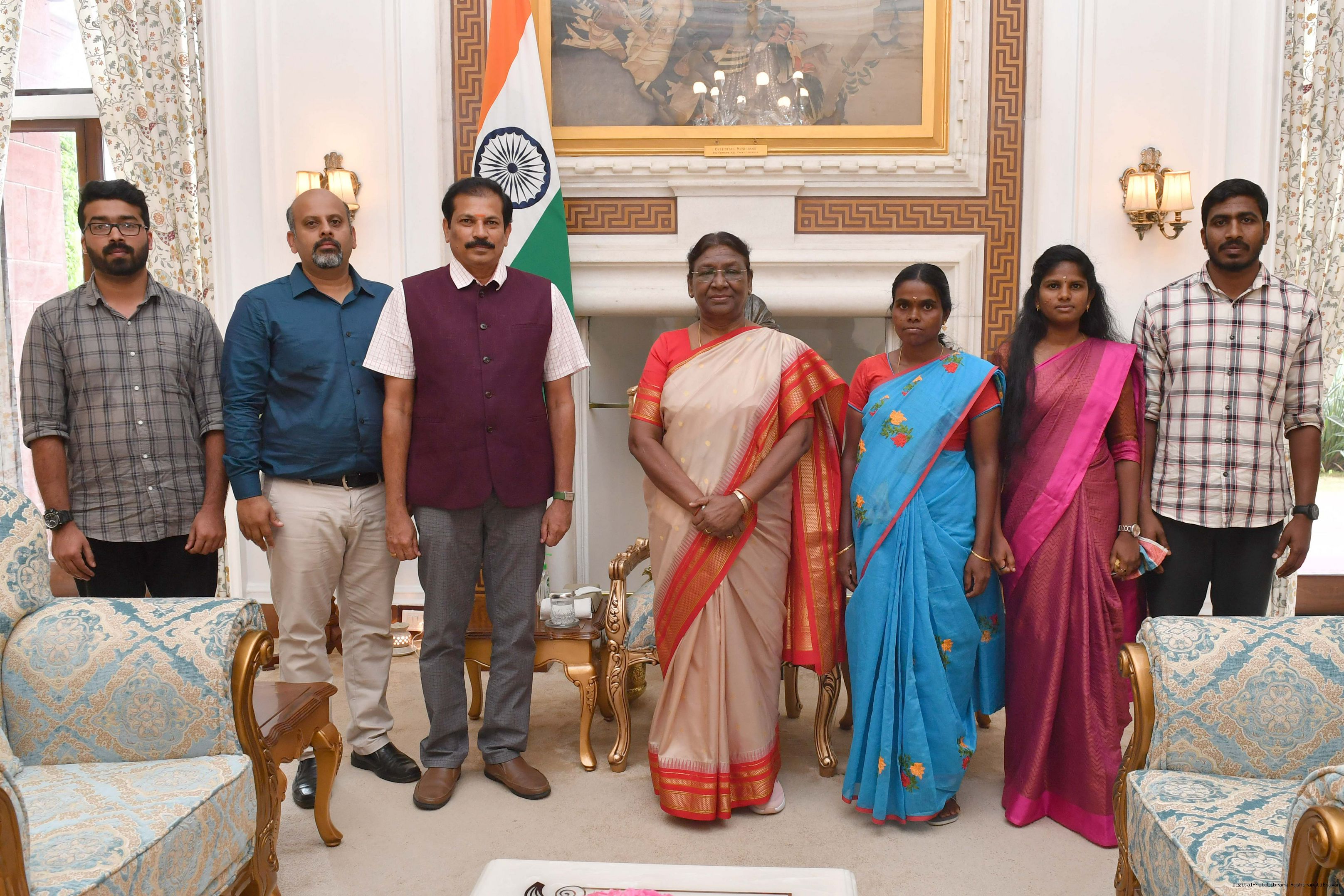 | Caption: | Shri D. Venkatesh, IFS, Conservator of Forests Field Director, Madhumalai Tiger Reserve, Nilgiris along with others meeting with the President of India, Smt. Droupadi Murmu at Rashtrapati Bhavan on September 18, 2023. |