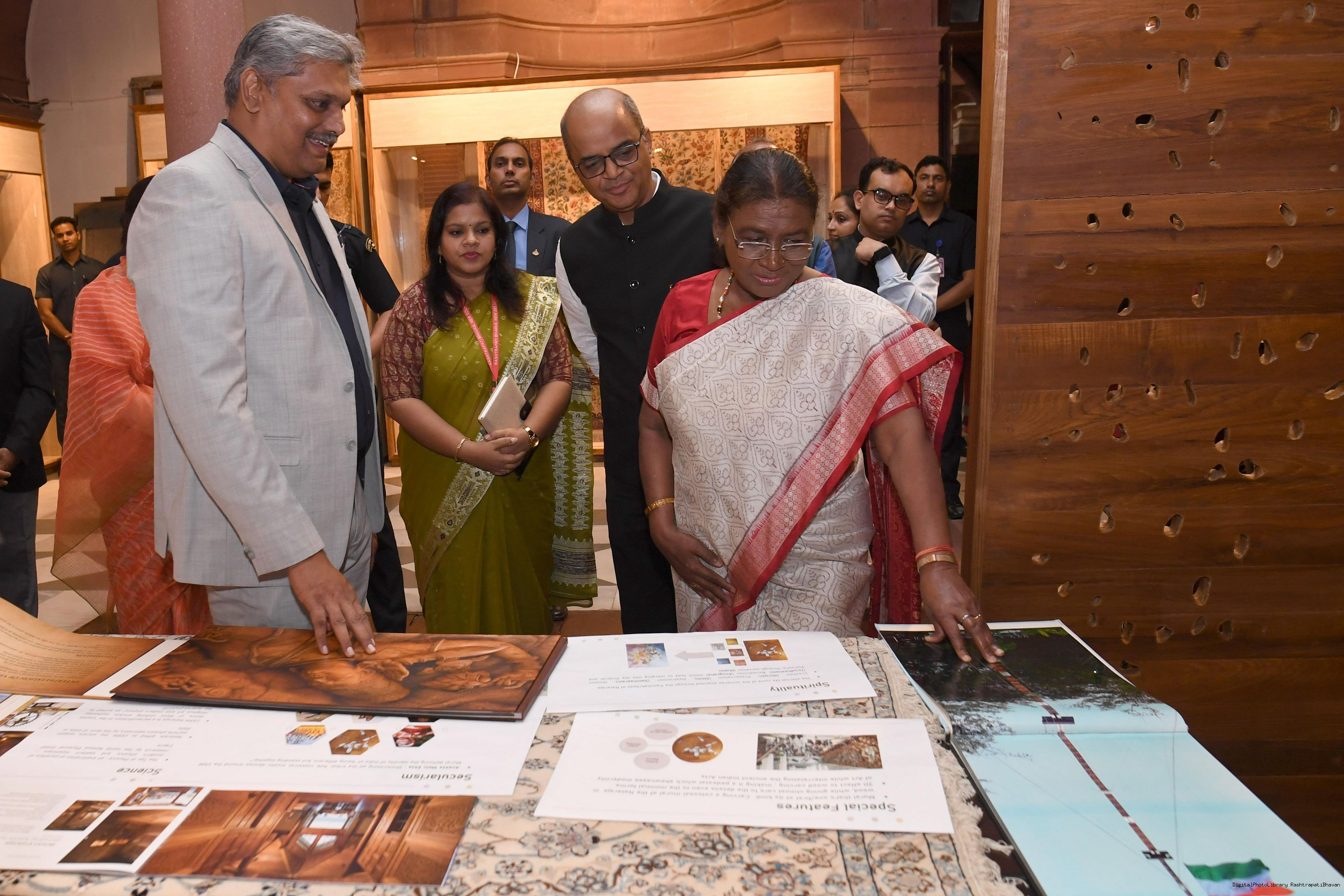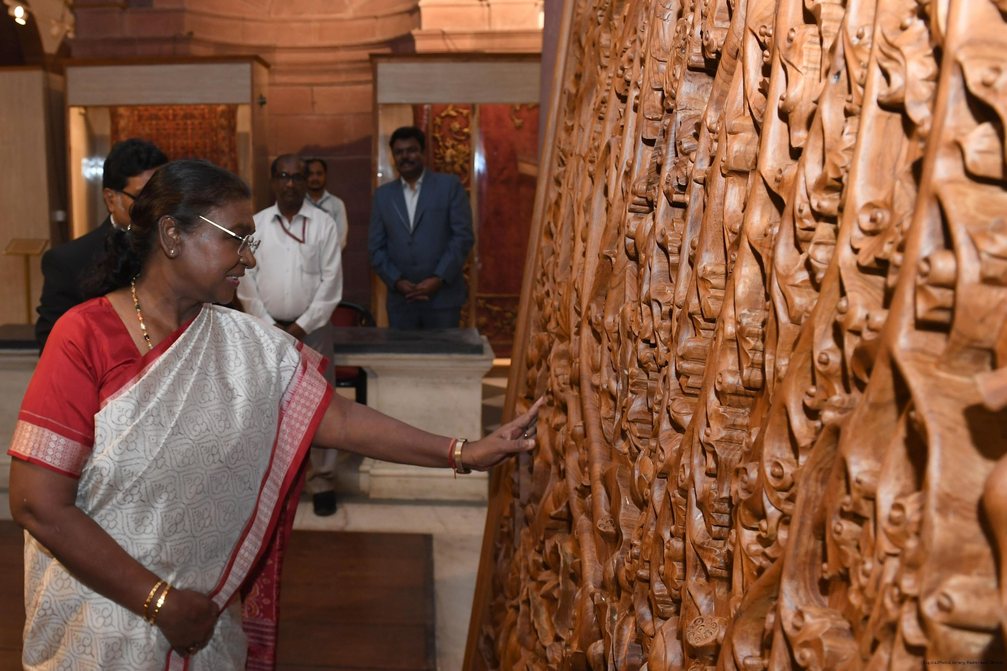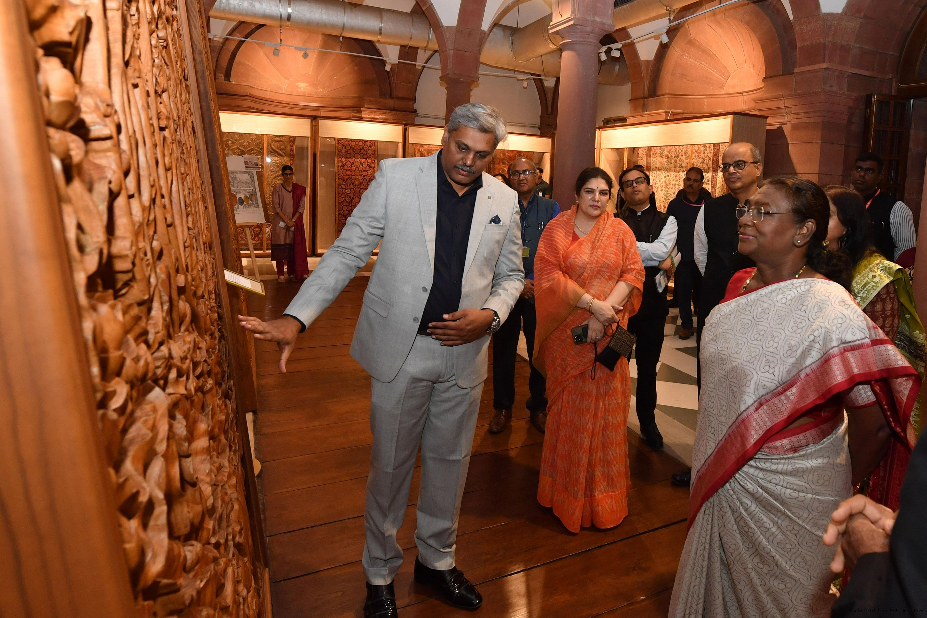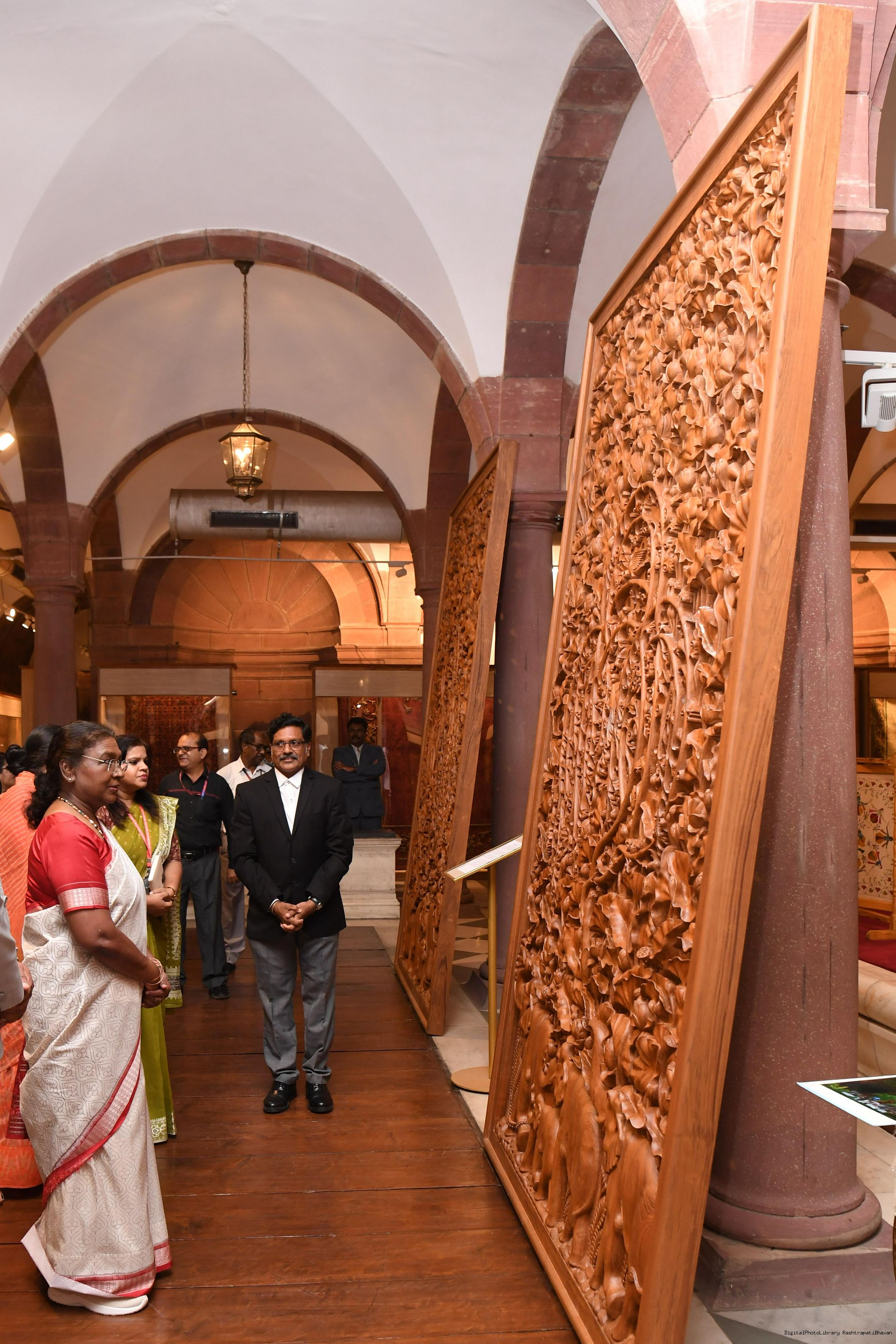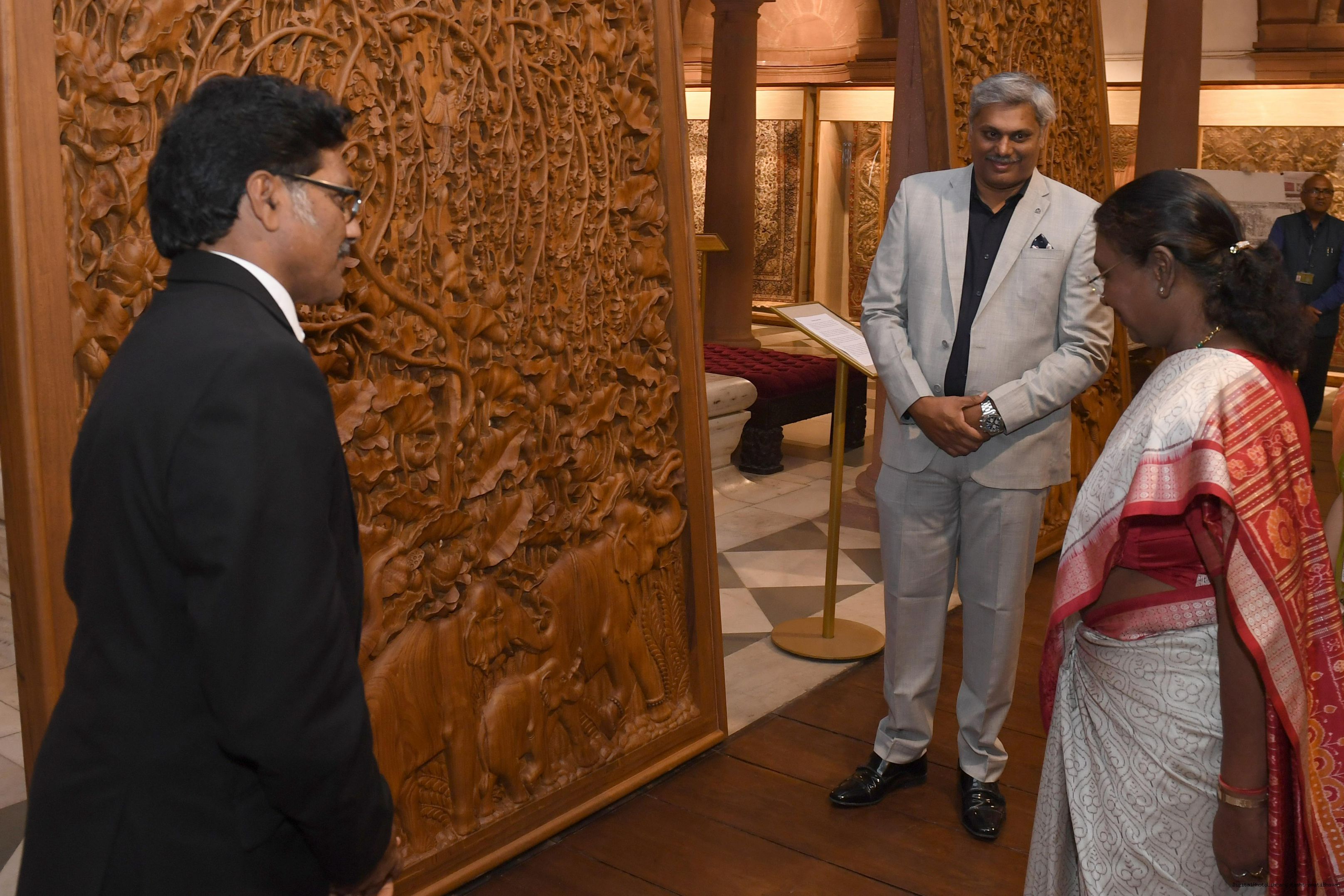 | Caption: | The President of India, Smt. Draupadi Murmu was present during the display of wooden panels of artworks of MS Anuradha Timbers International at Rashtrapati Bhavan on September 10, 2024. |