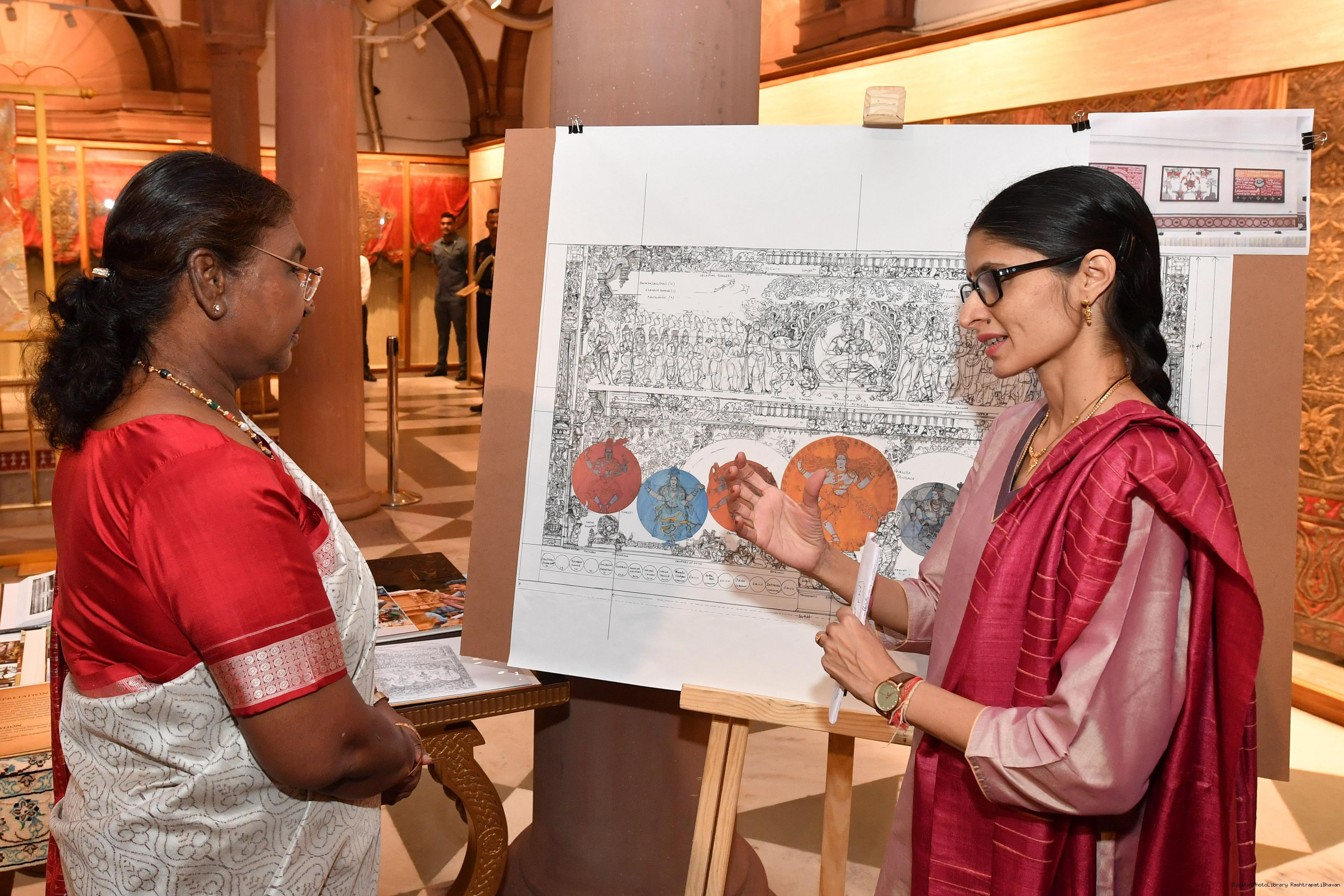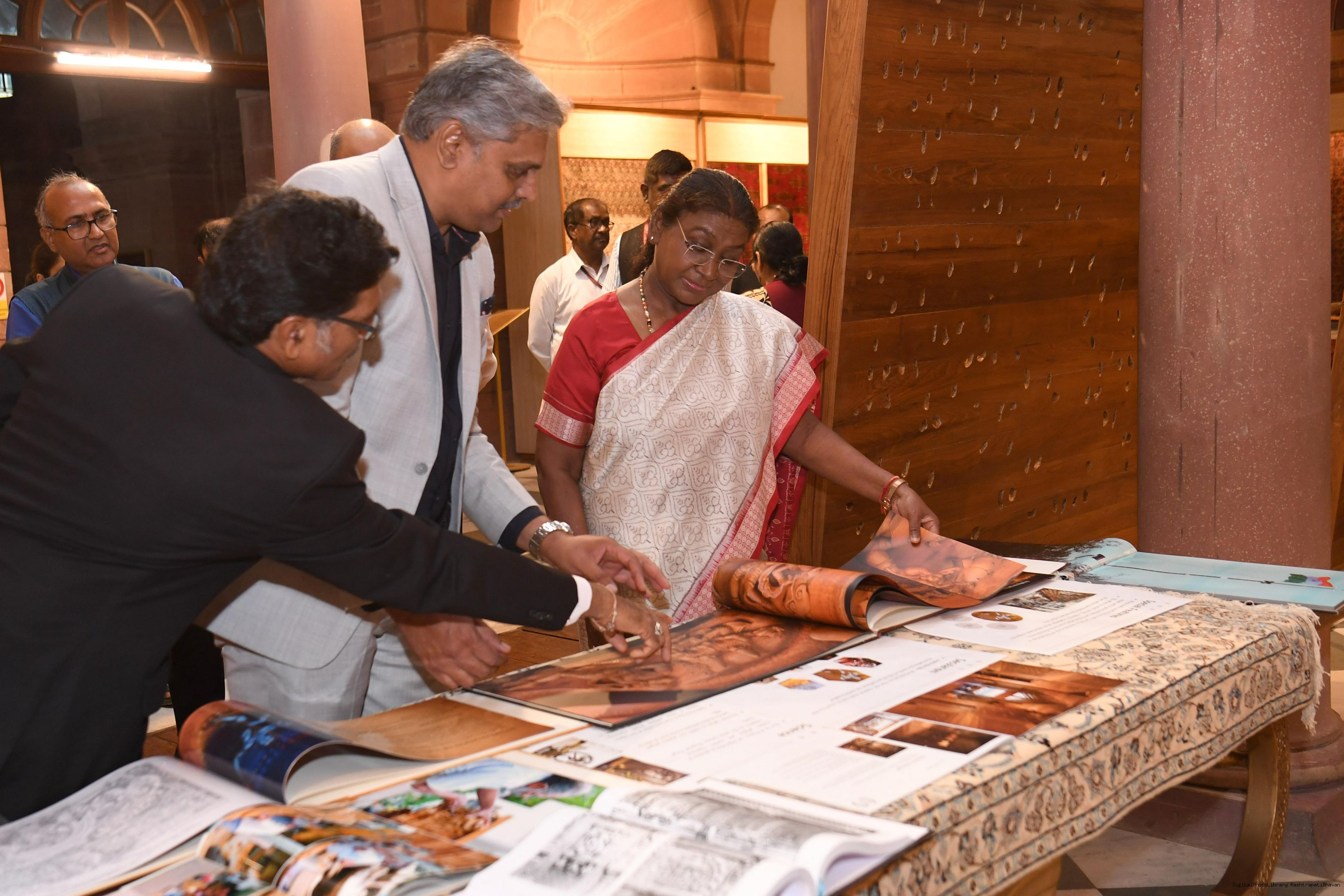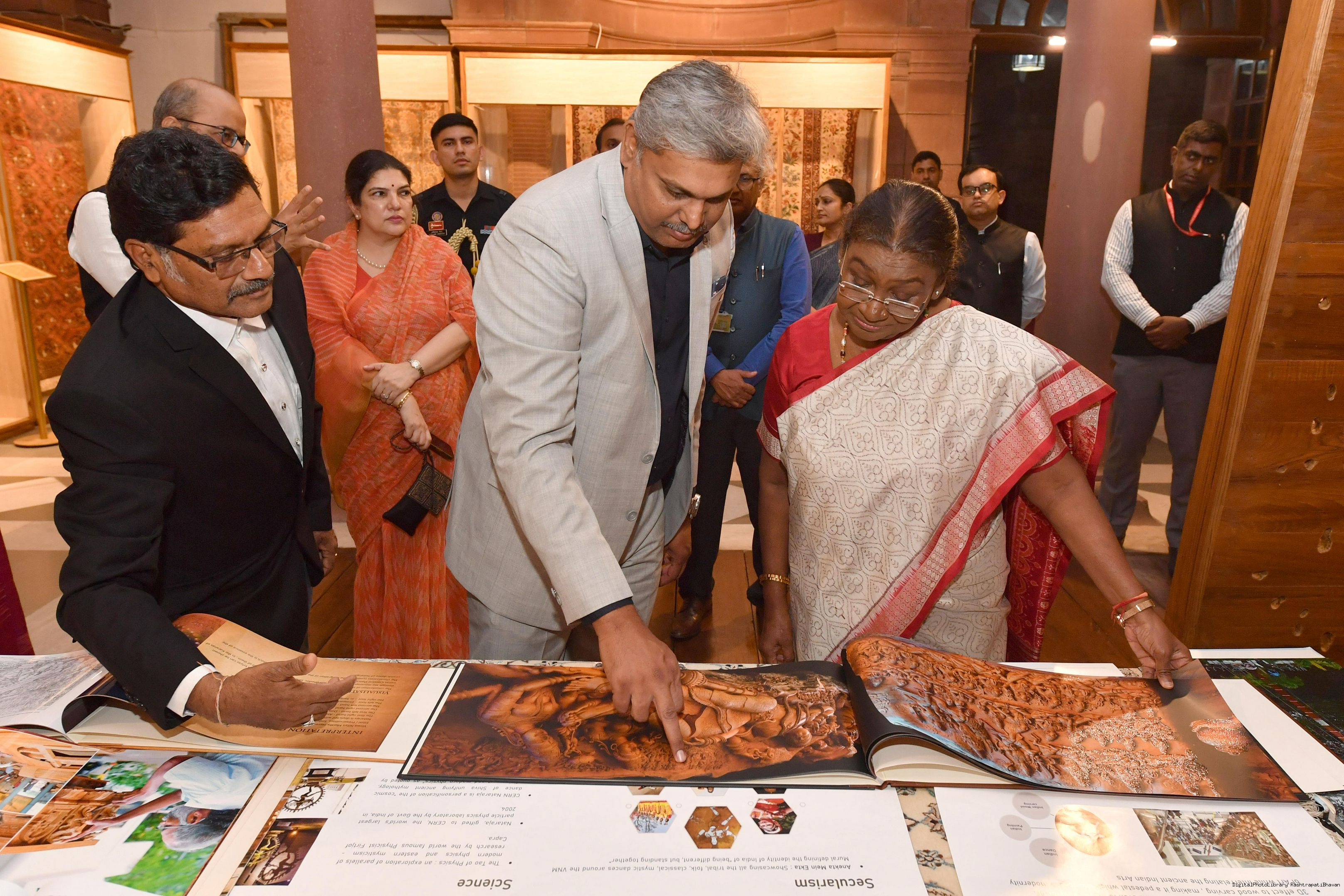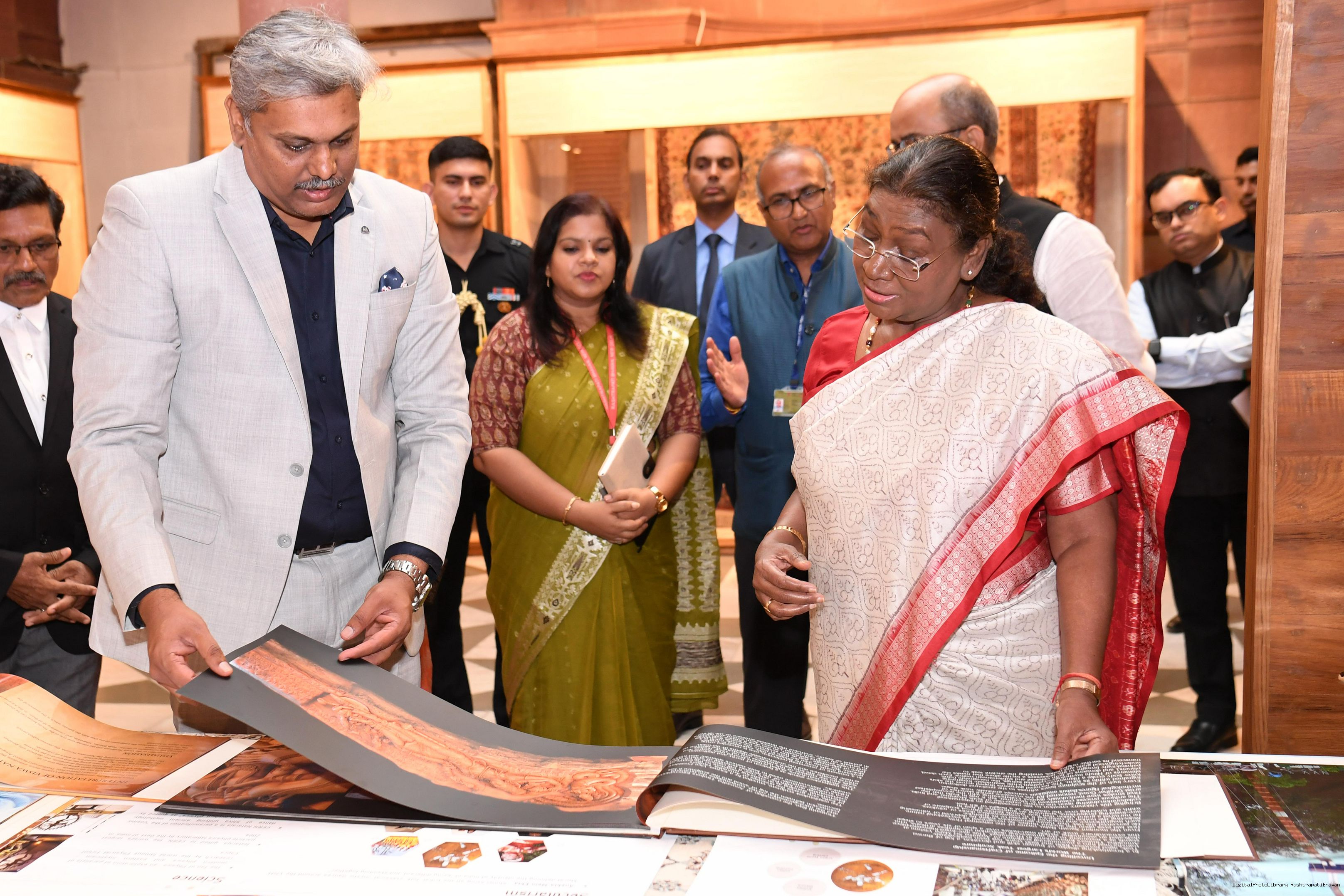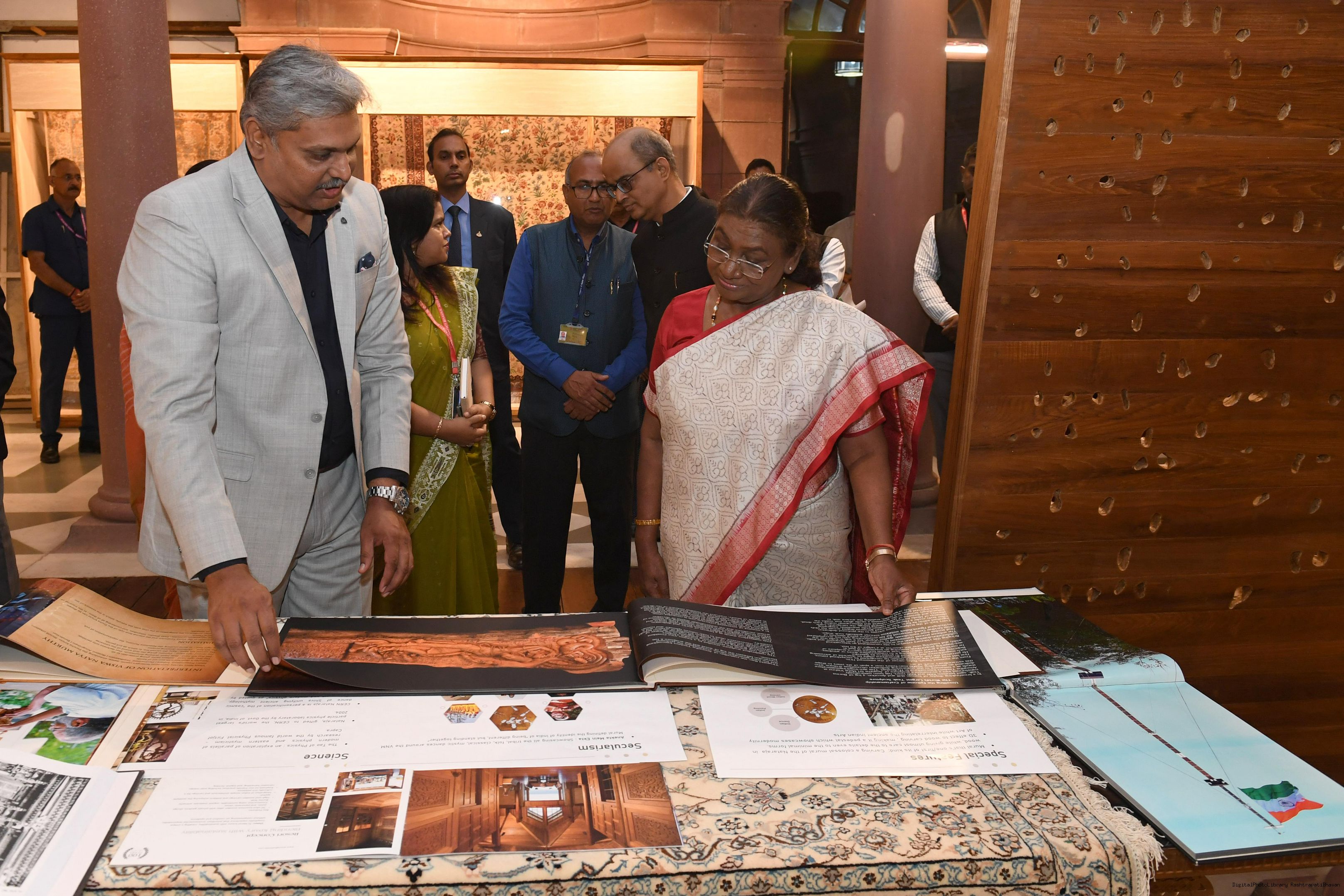 | Caption: | The President of India, Smt. Draupadi Murmu was present during the display of wooden panels of artworks of MS Anuradha Timbers International at Rashtrapati Bhavan on September 10, 2024. |