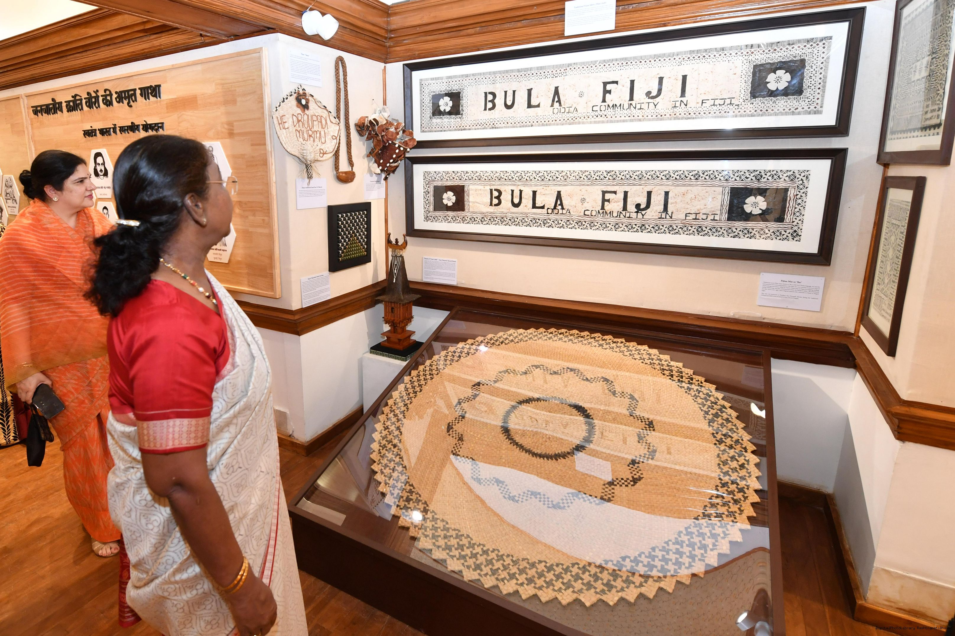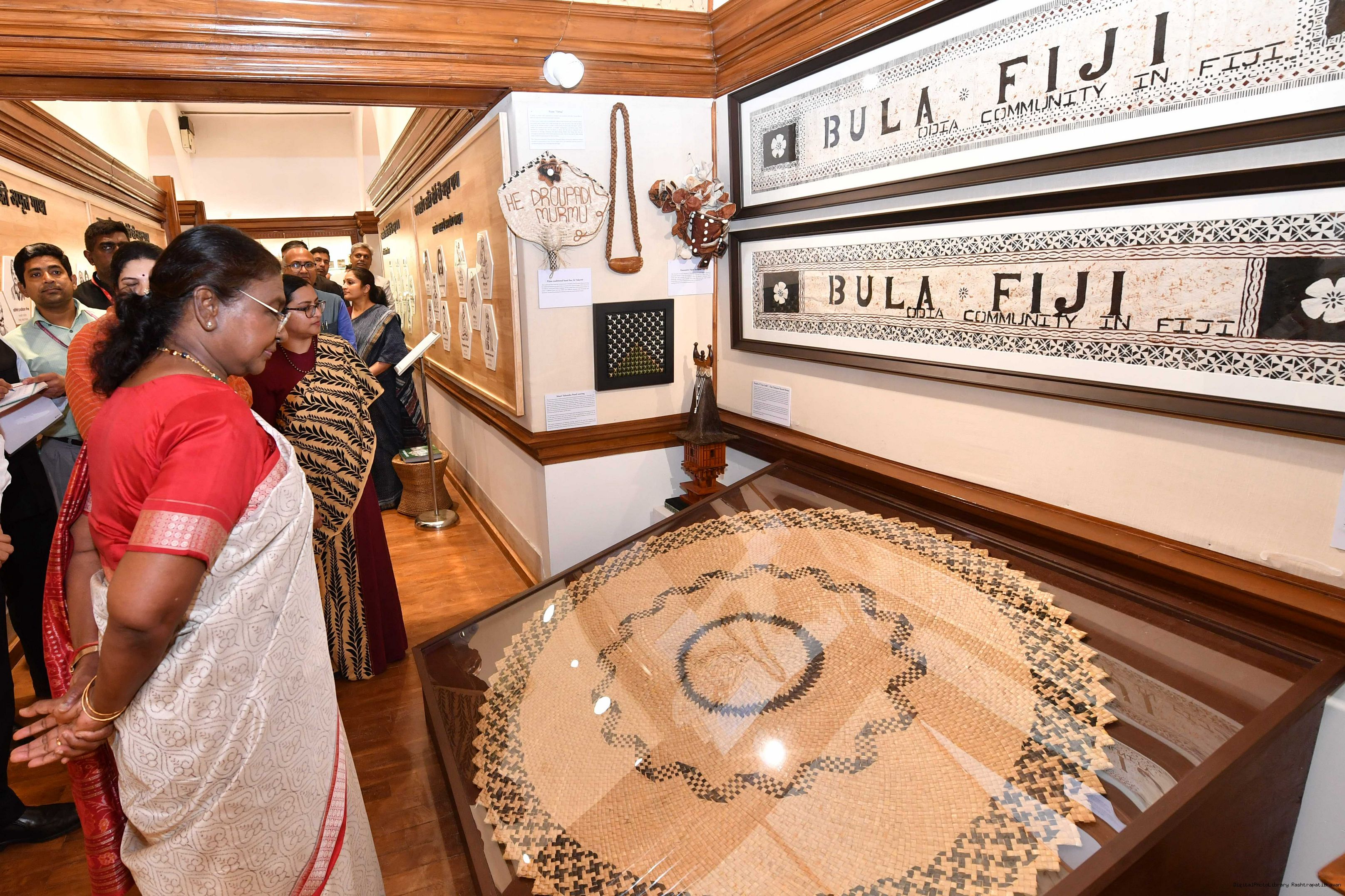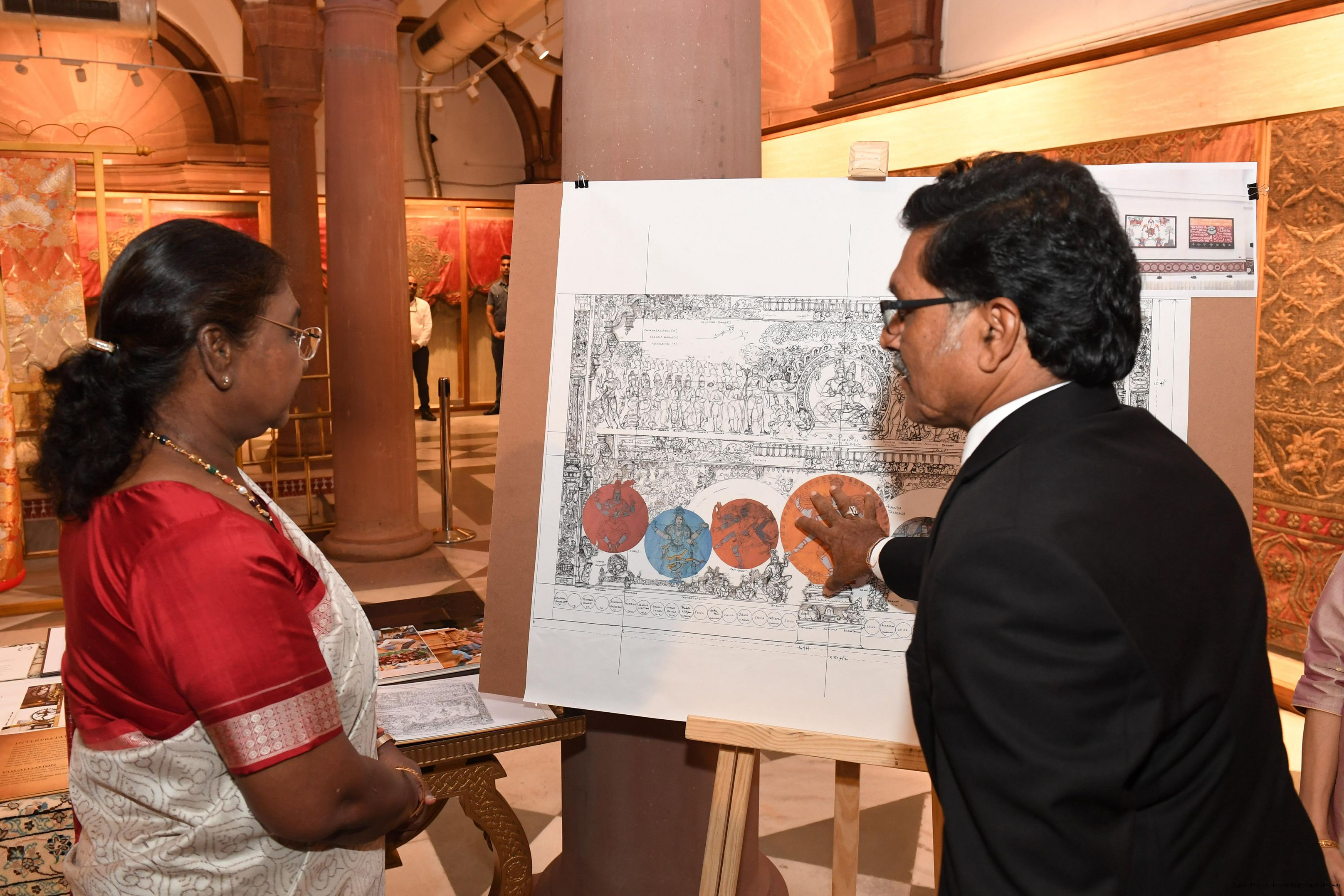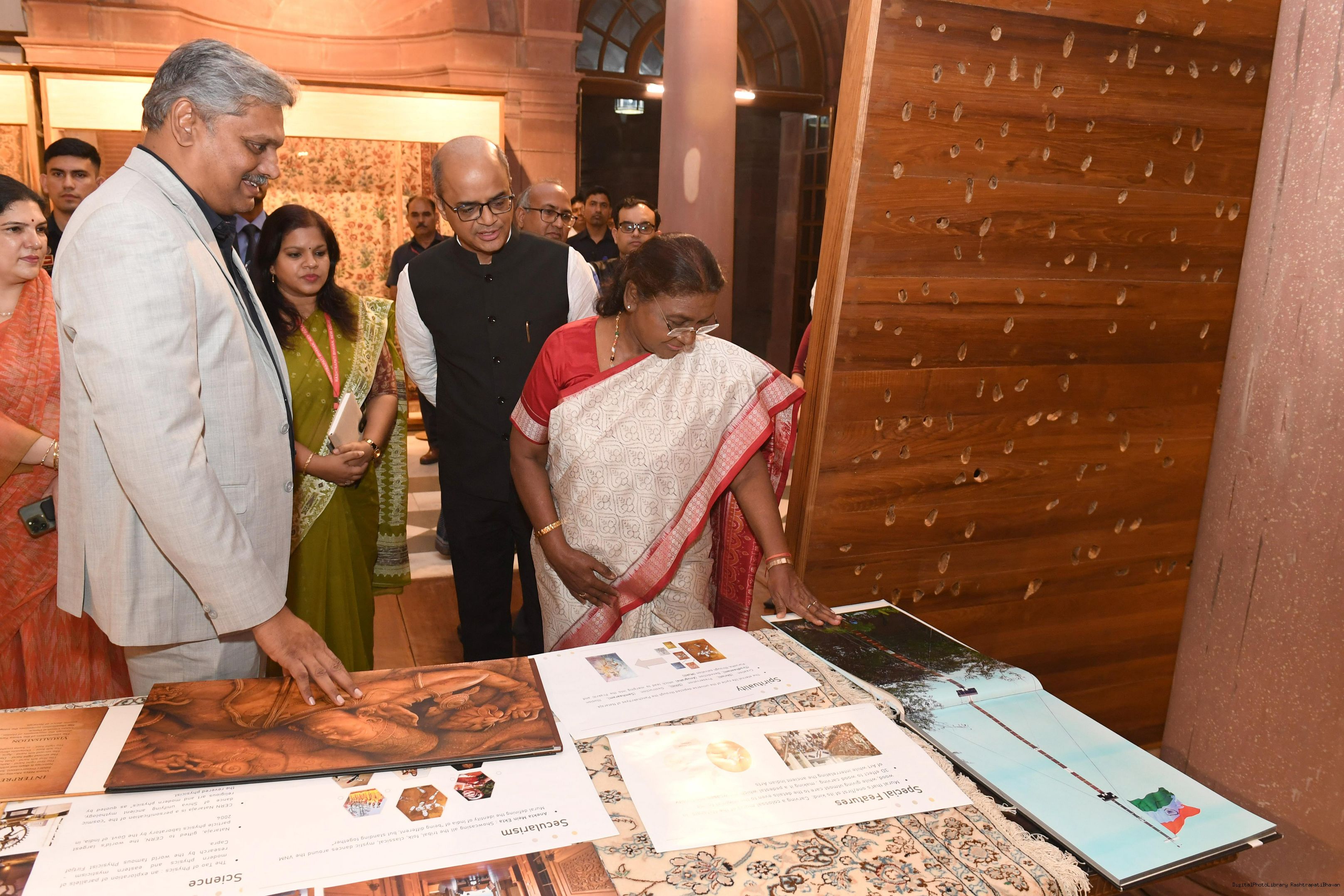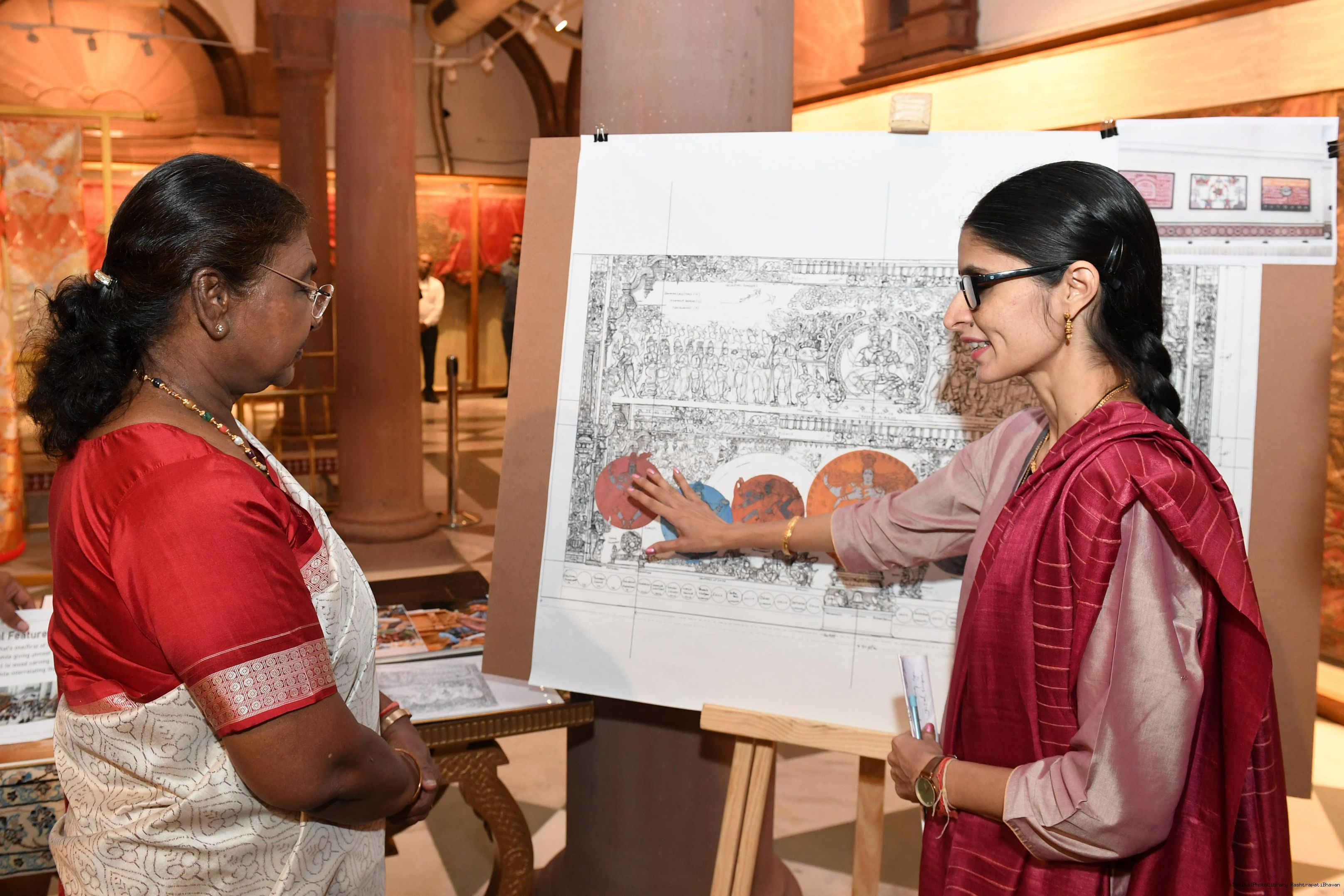 | Caption: | The President of India, Smt. Draupadi Murmu was present during the display of wooden panels of artworks of MS Anuradha Timbers International at Rashtrapati Bhavan on September 10, 2024. |