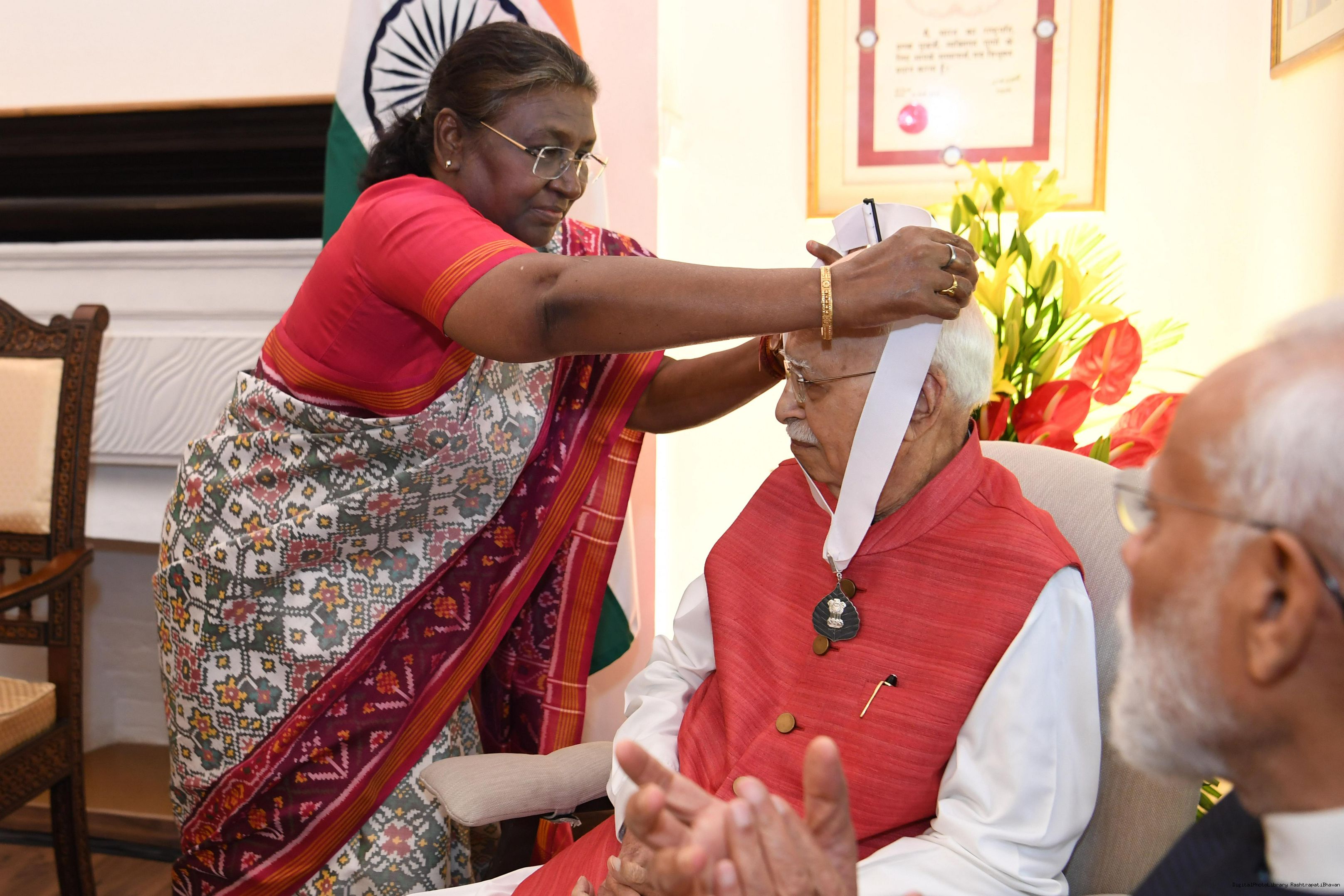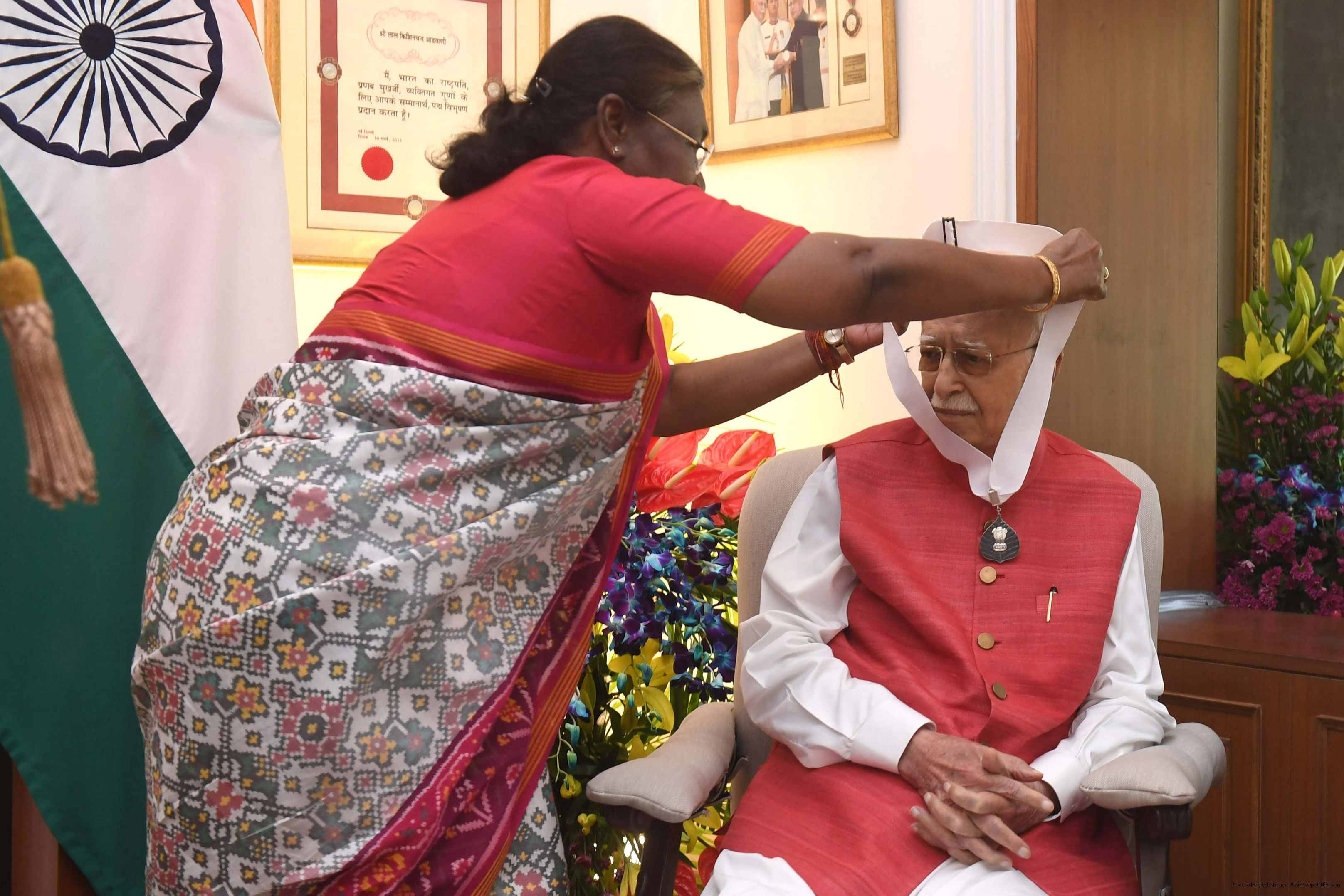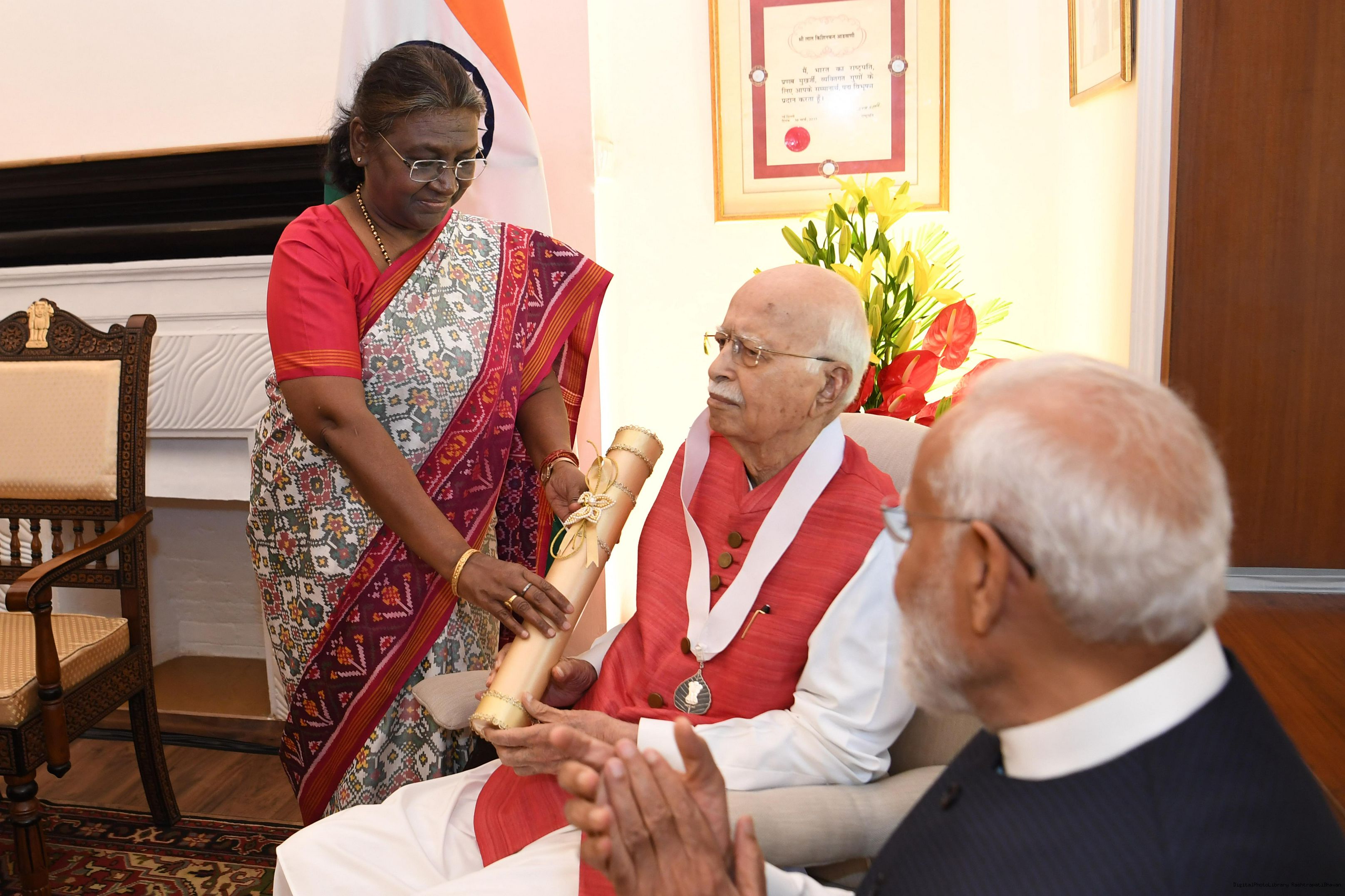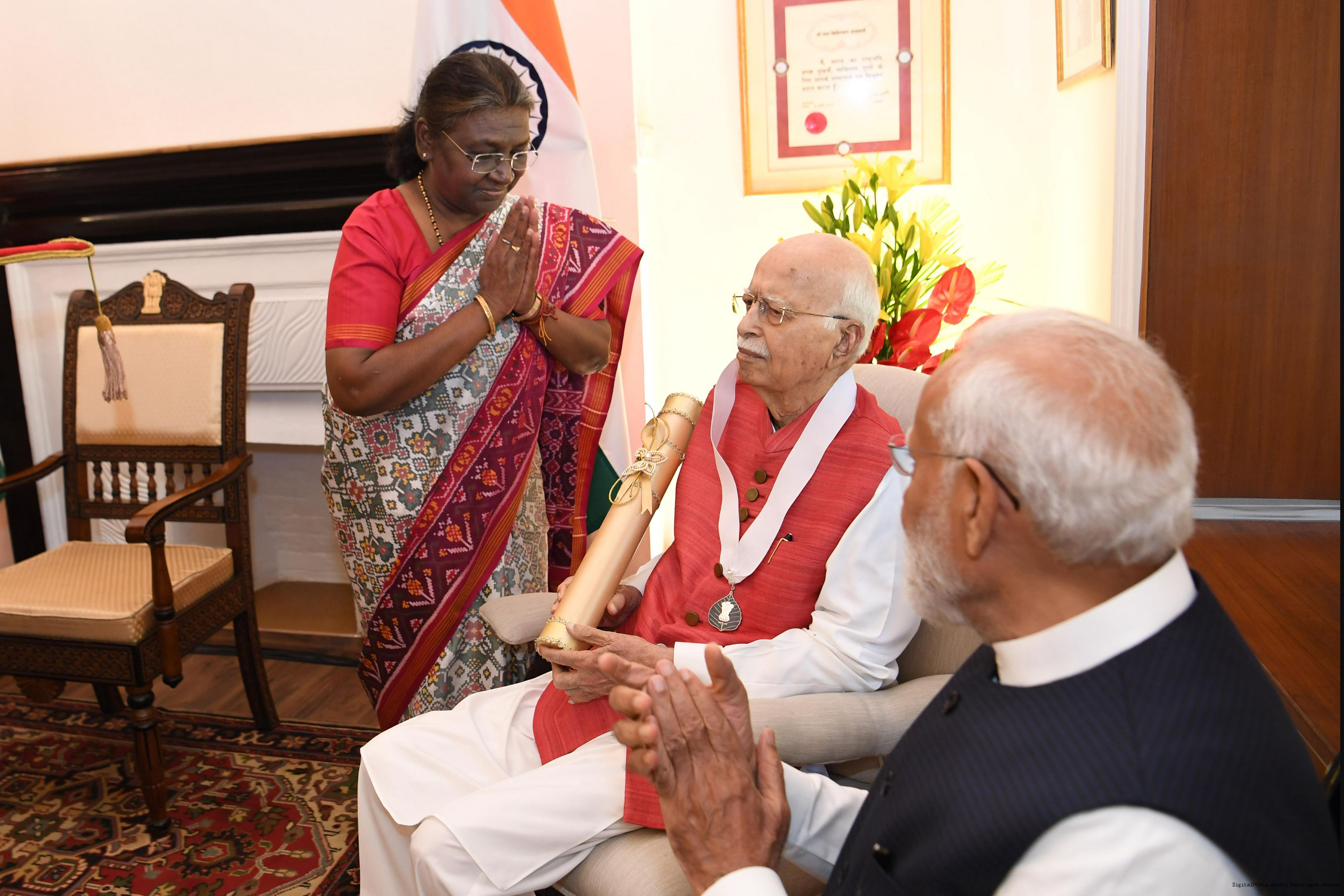 | Caption: | The President of India Smt. Droupadi Murmu presenting Bharat Ratna to Shri L. K. Advani at his residence in New Delhi On March 31, 2024 |