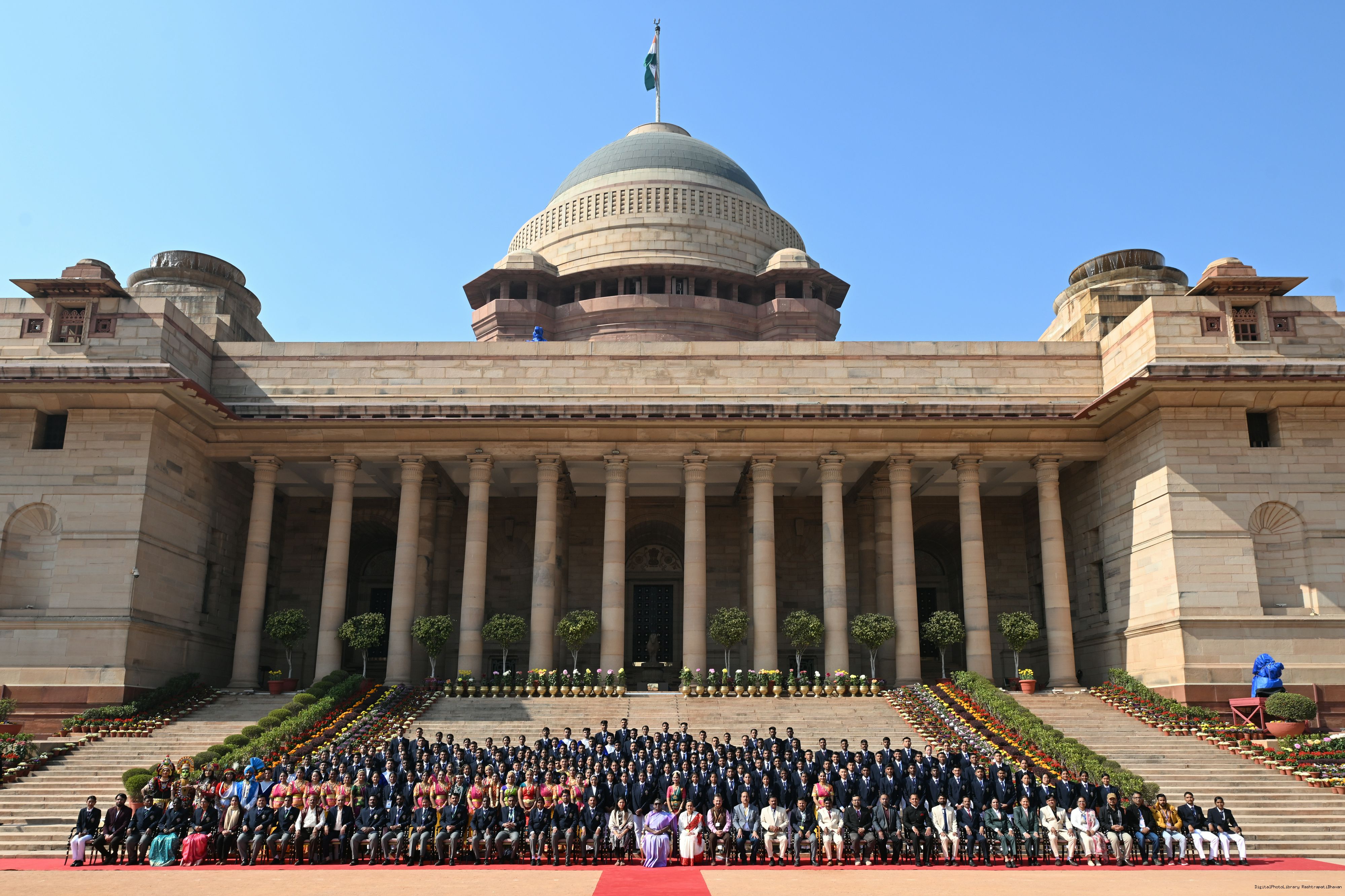 | Caption: | The President of India, Smt. Droupadi Murmu met and posing a group photographs with members of colloborating organizations pertaining to the theme of the At Home event held at Rashtrapati Bhavan on 26th January, 2025 viz State Bhavans, Sangeet Natak Akademi and NIFT at Rashtrapati Bhavan on January 28, 2025. |
