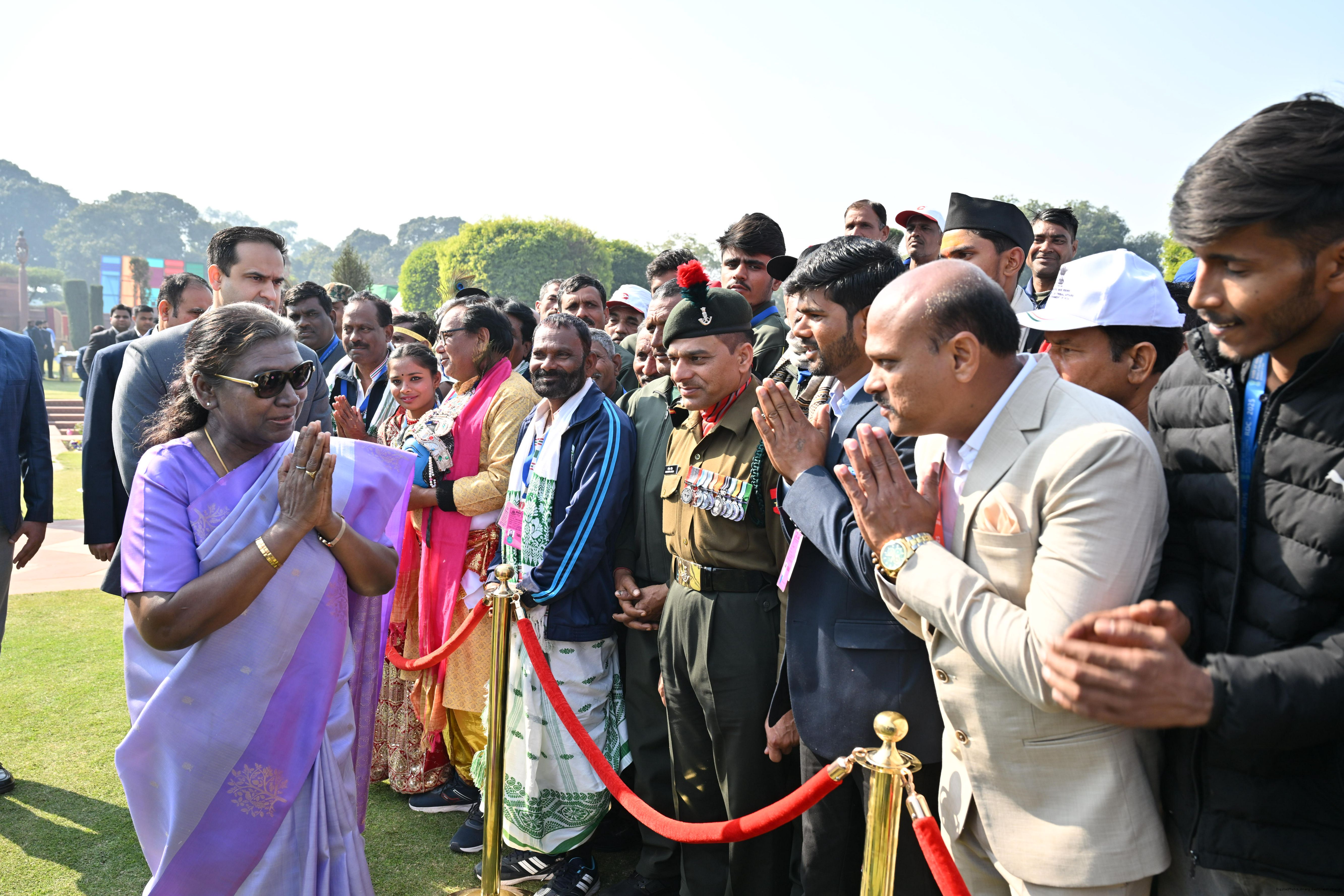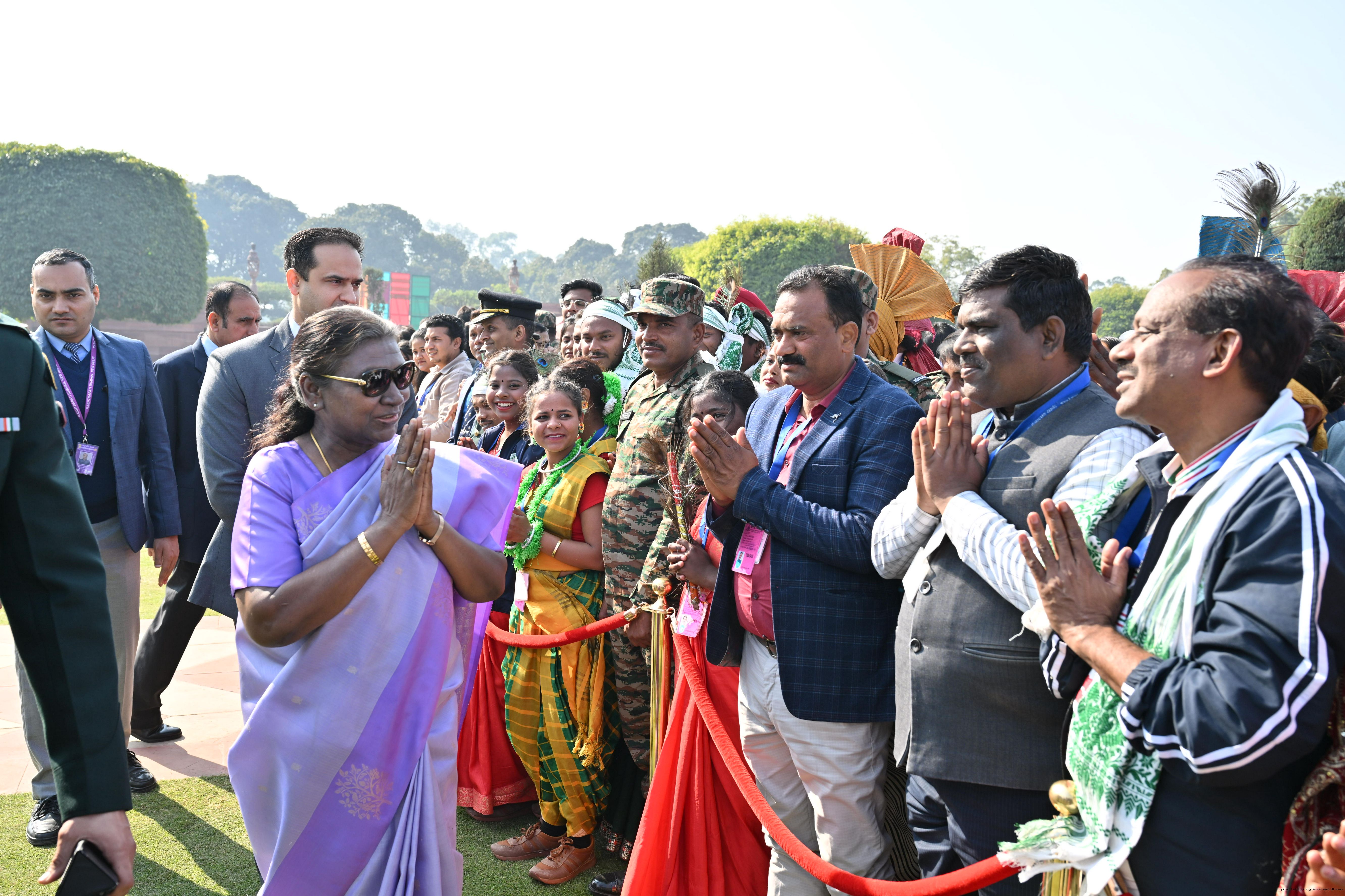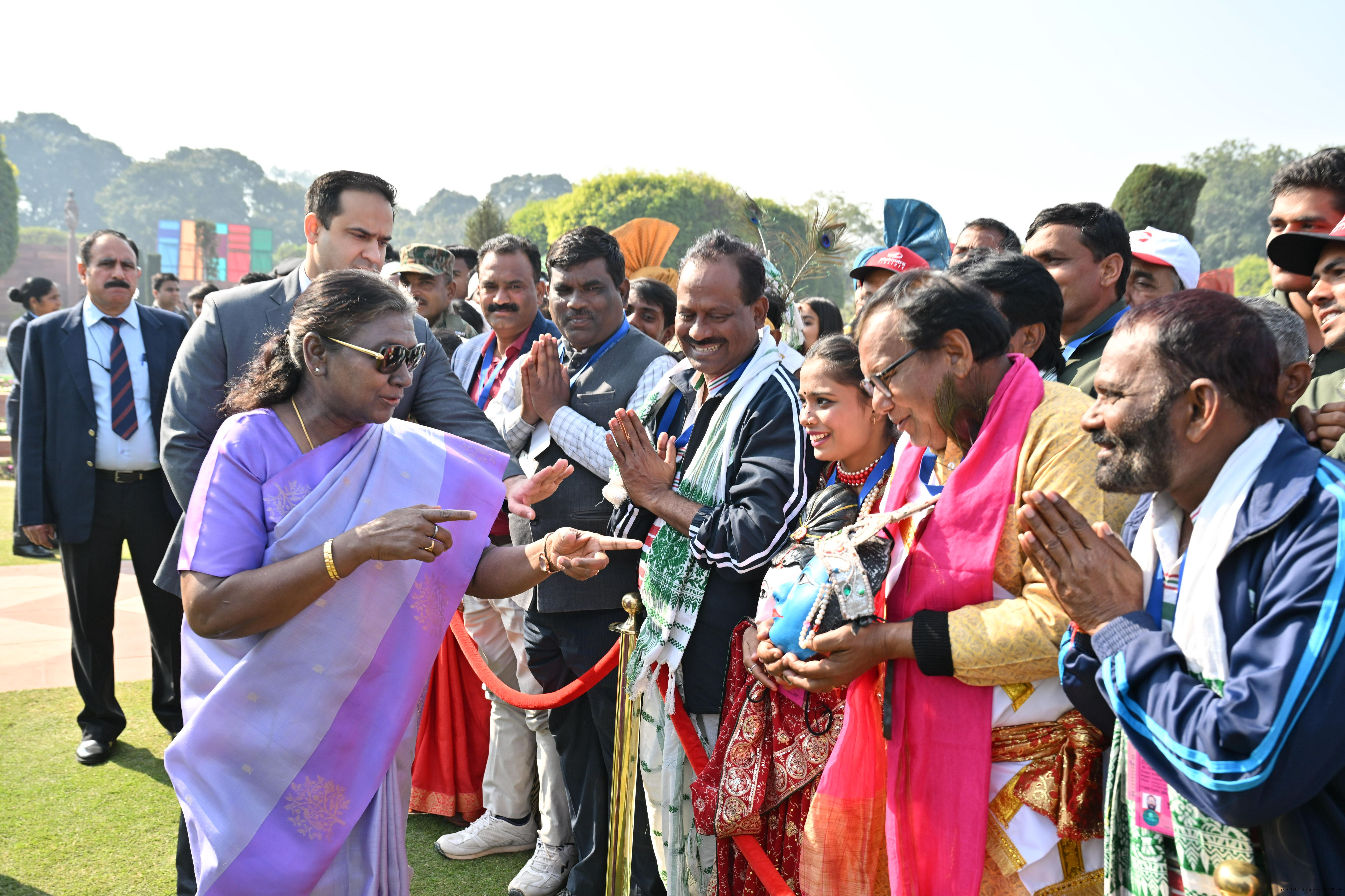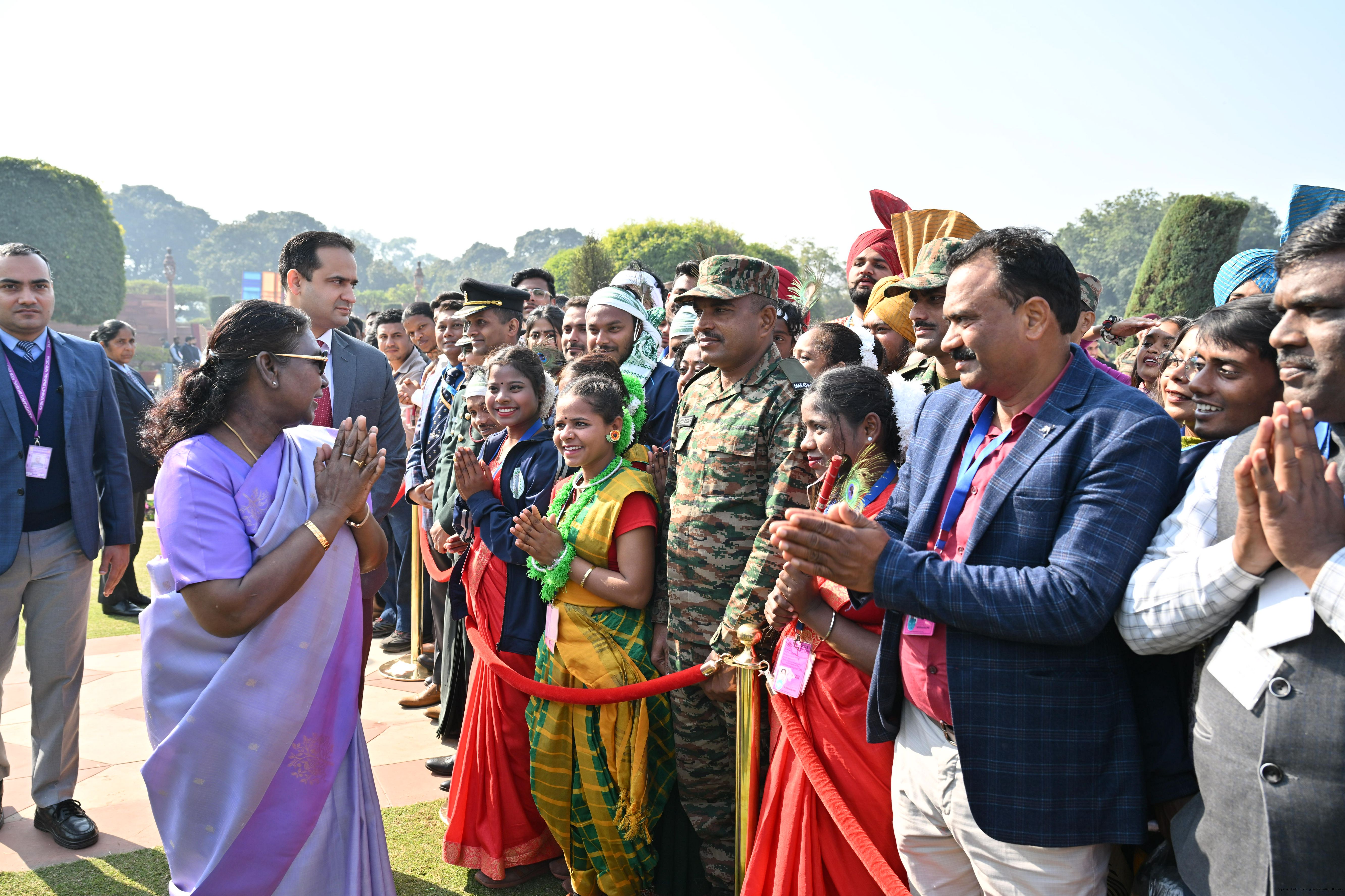 | Caption: | The President of India, Smt. Droupadi Murmu met and posing a group photographs tribal guests, tableaux artistes and tractor drivers, NSS volunteers and NCC cadets, officials and other participants of the Republic Day Parade 2025, at Rashtrapati Bhavan on January 28, 2025. |