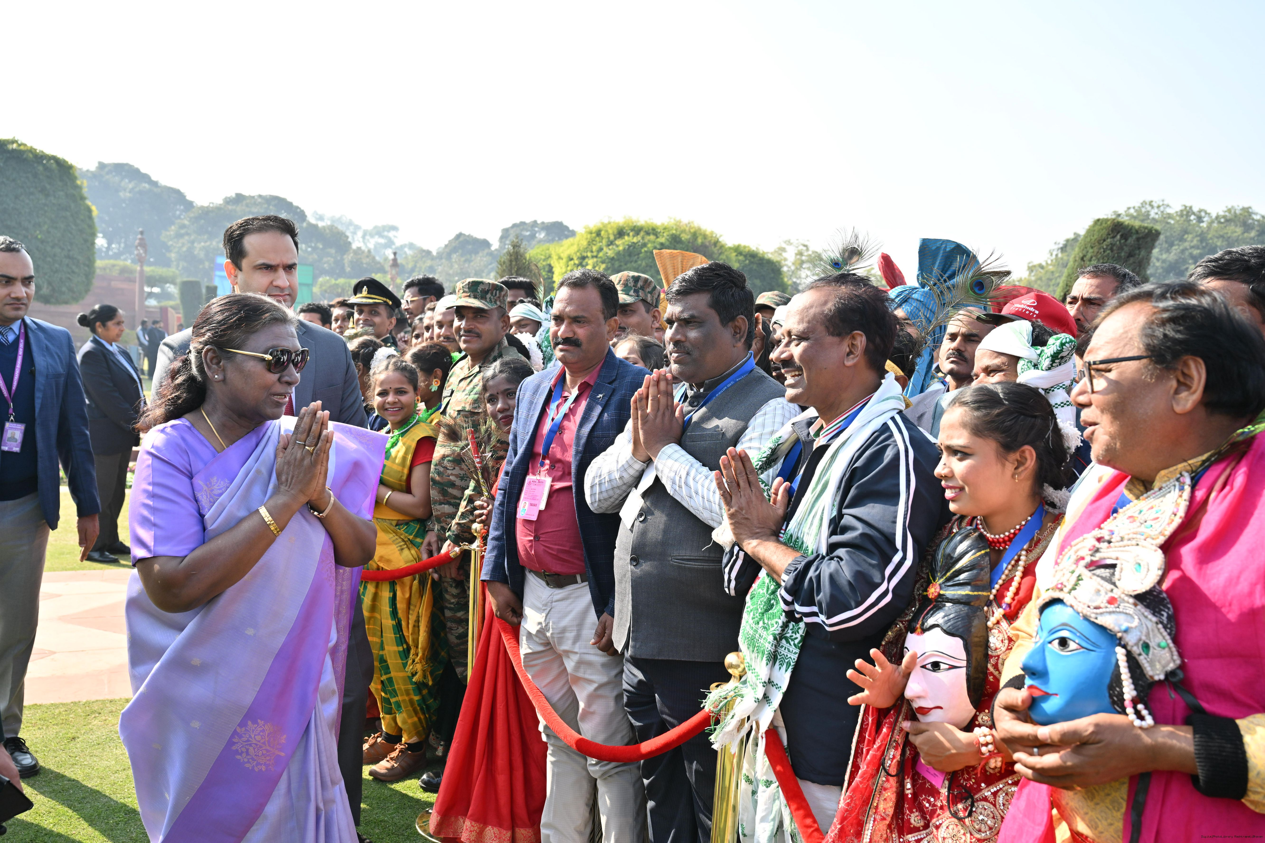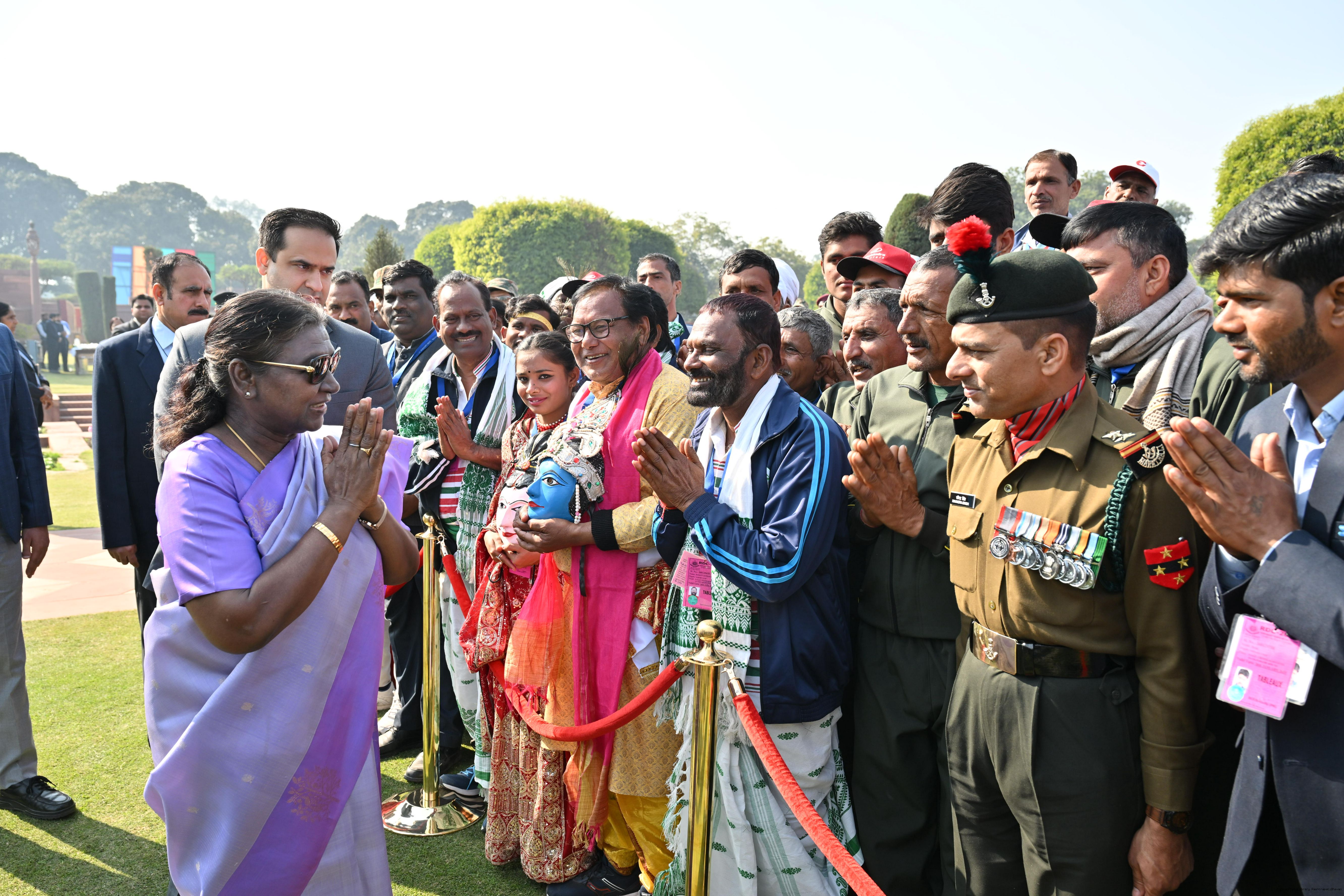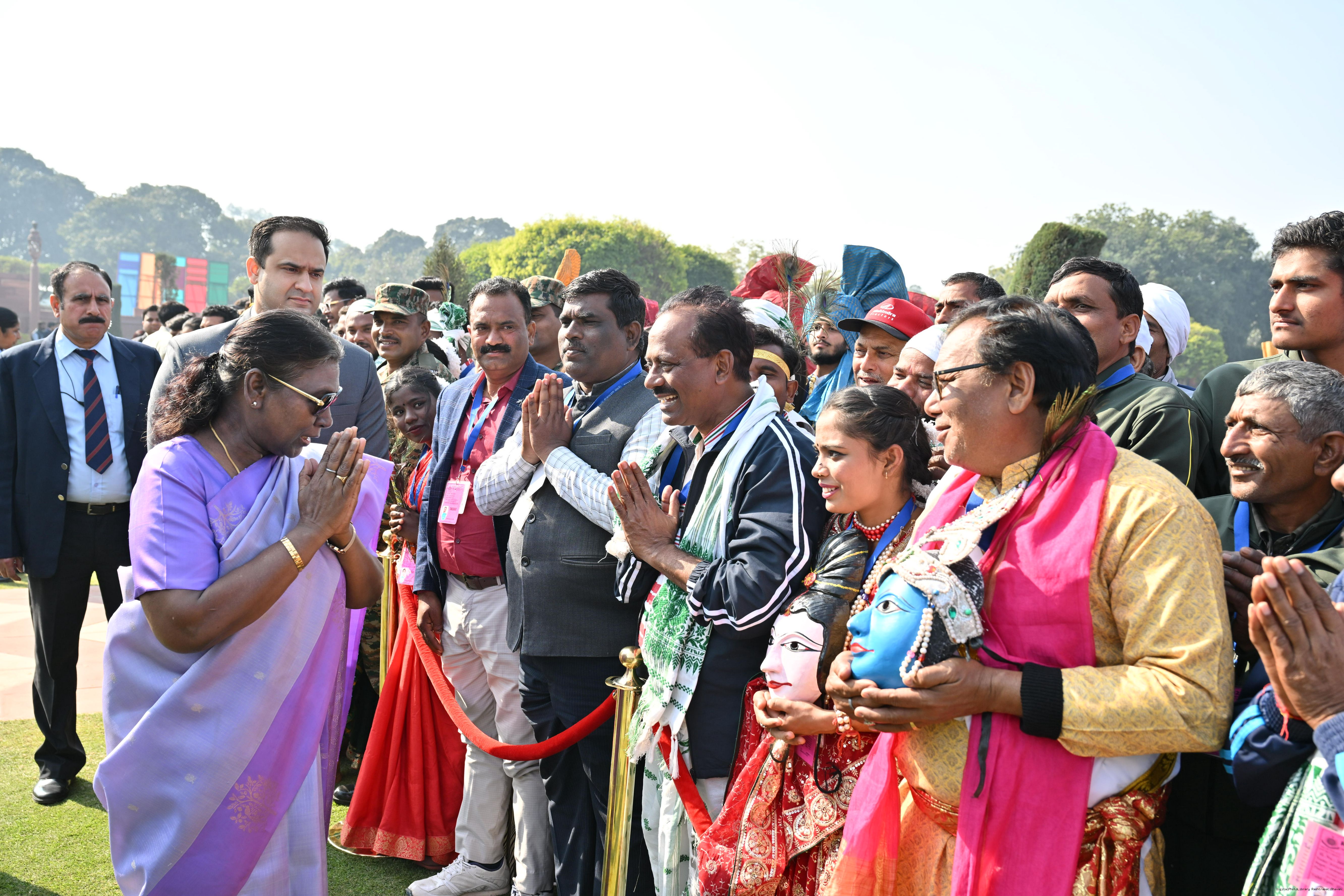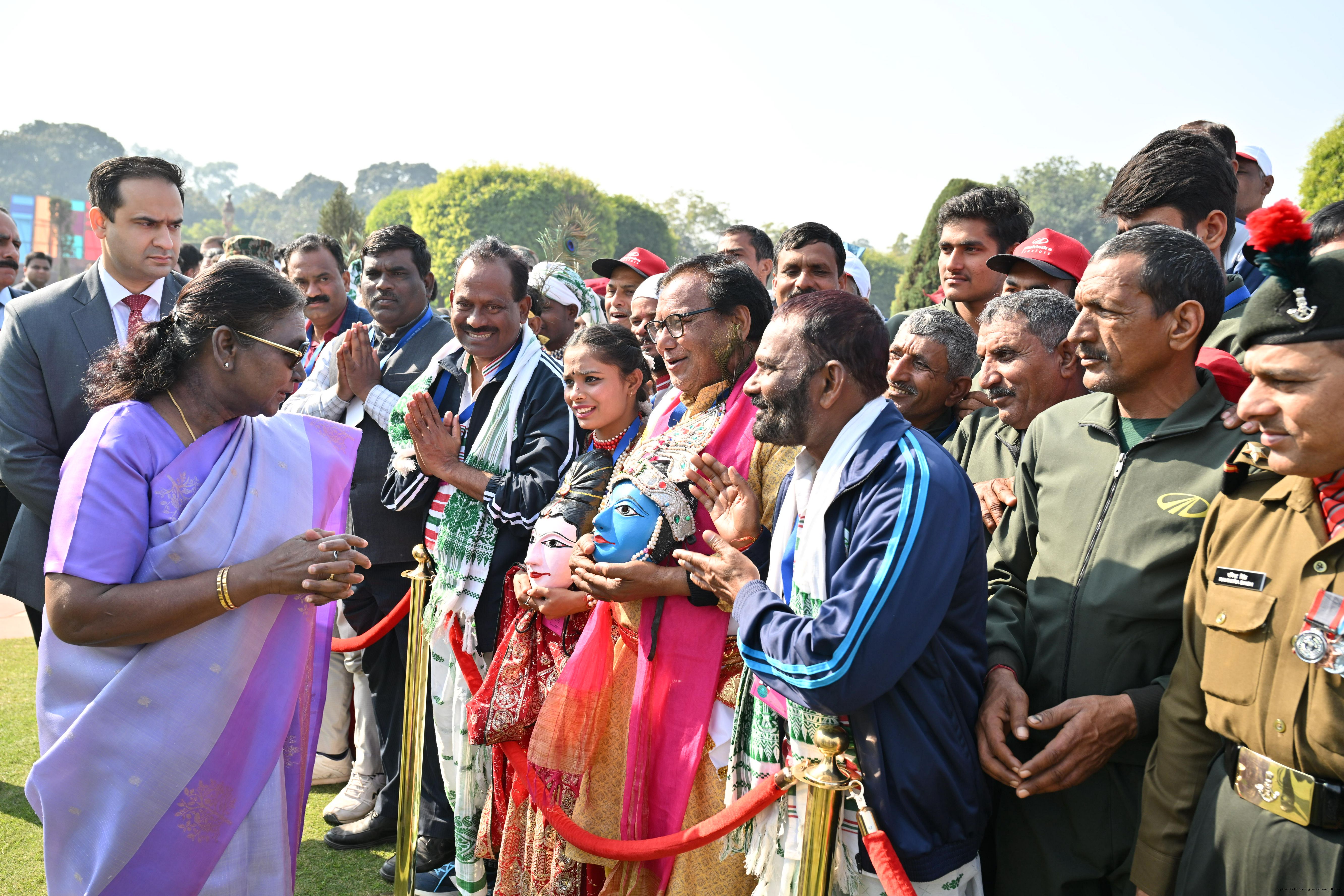 | Caption: | The President of India, Smt. Droupadi Murmu met and posing a group photographs tribal guests, tableaux artistes and tractor drivers, NSS volunteers and NCC cadets, officials and other participants of the Republic Day Parade 2025, at Rashtrapati Bhavan on January 28, 2025. |