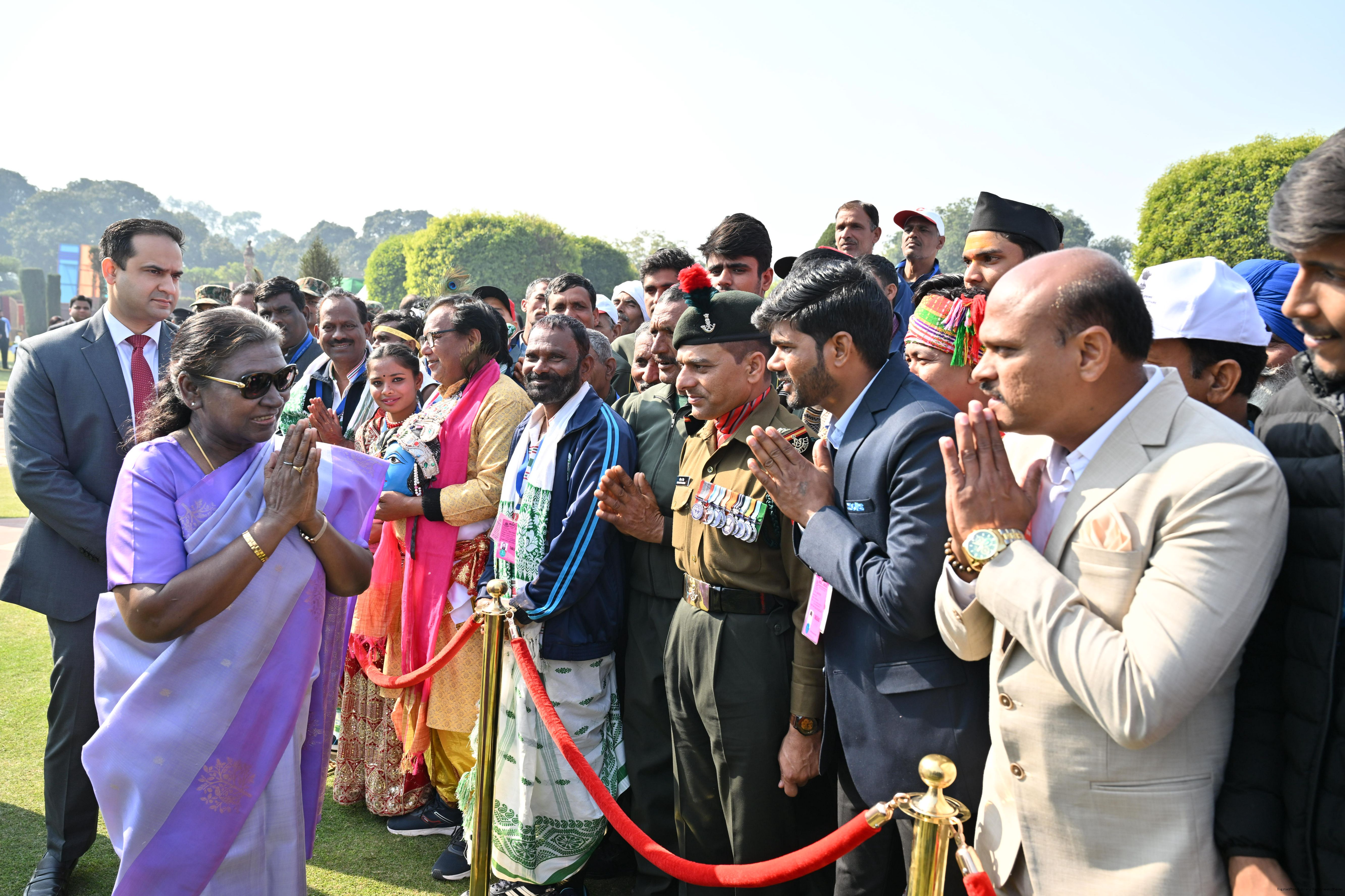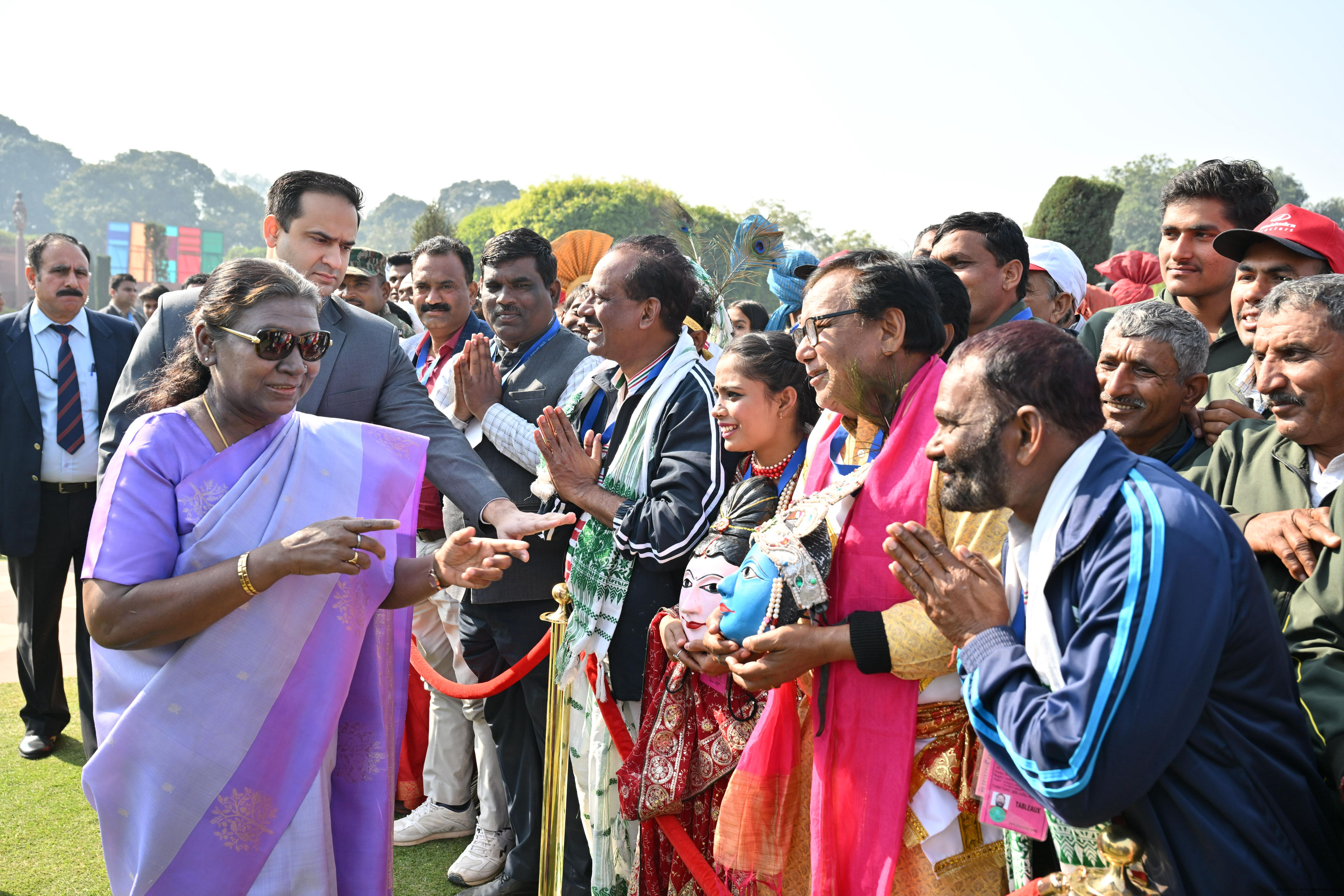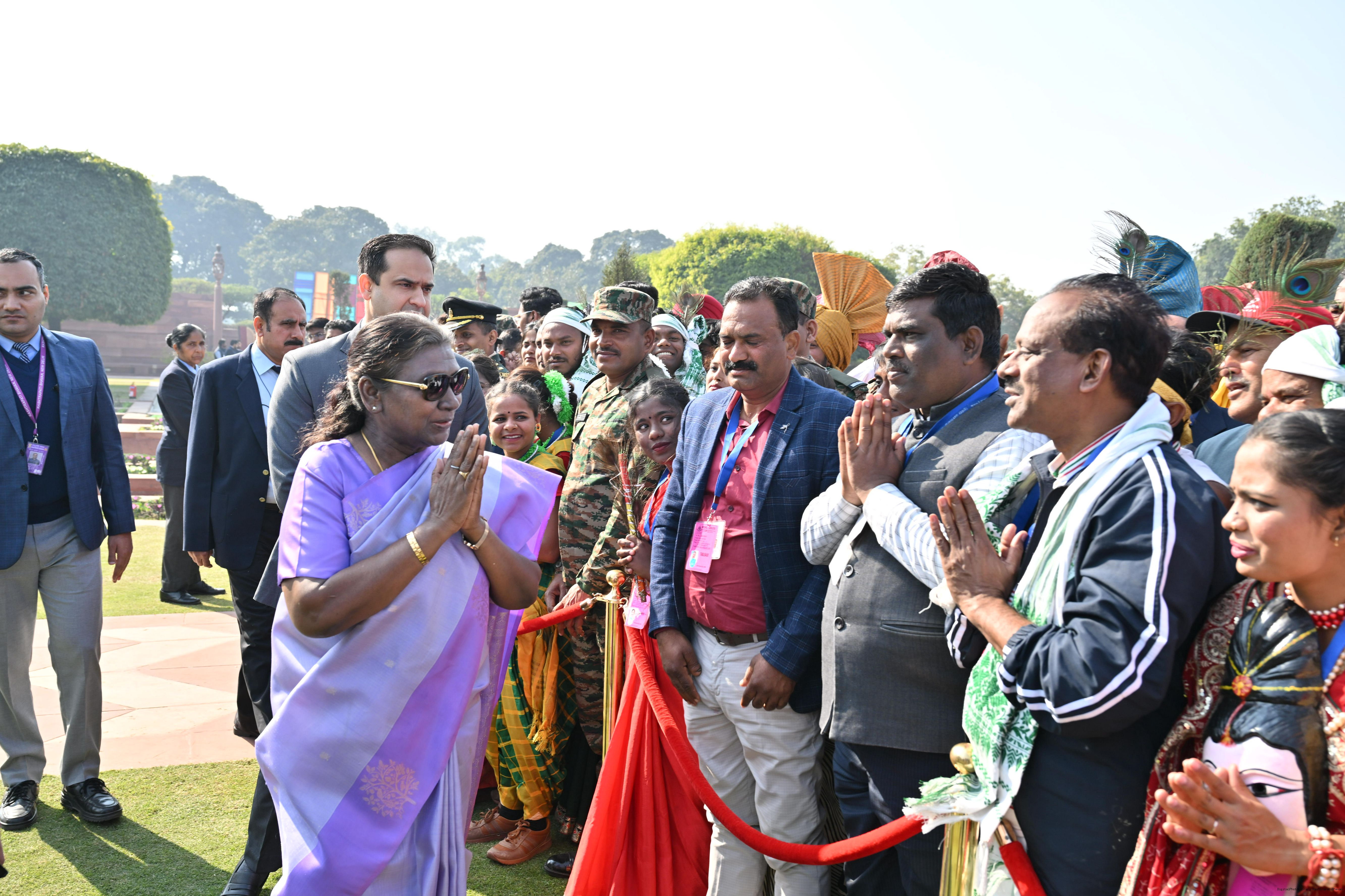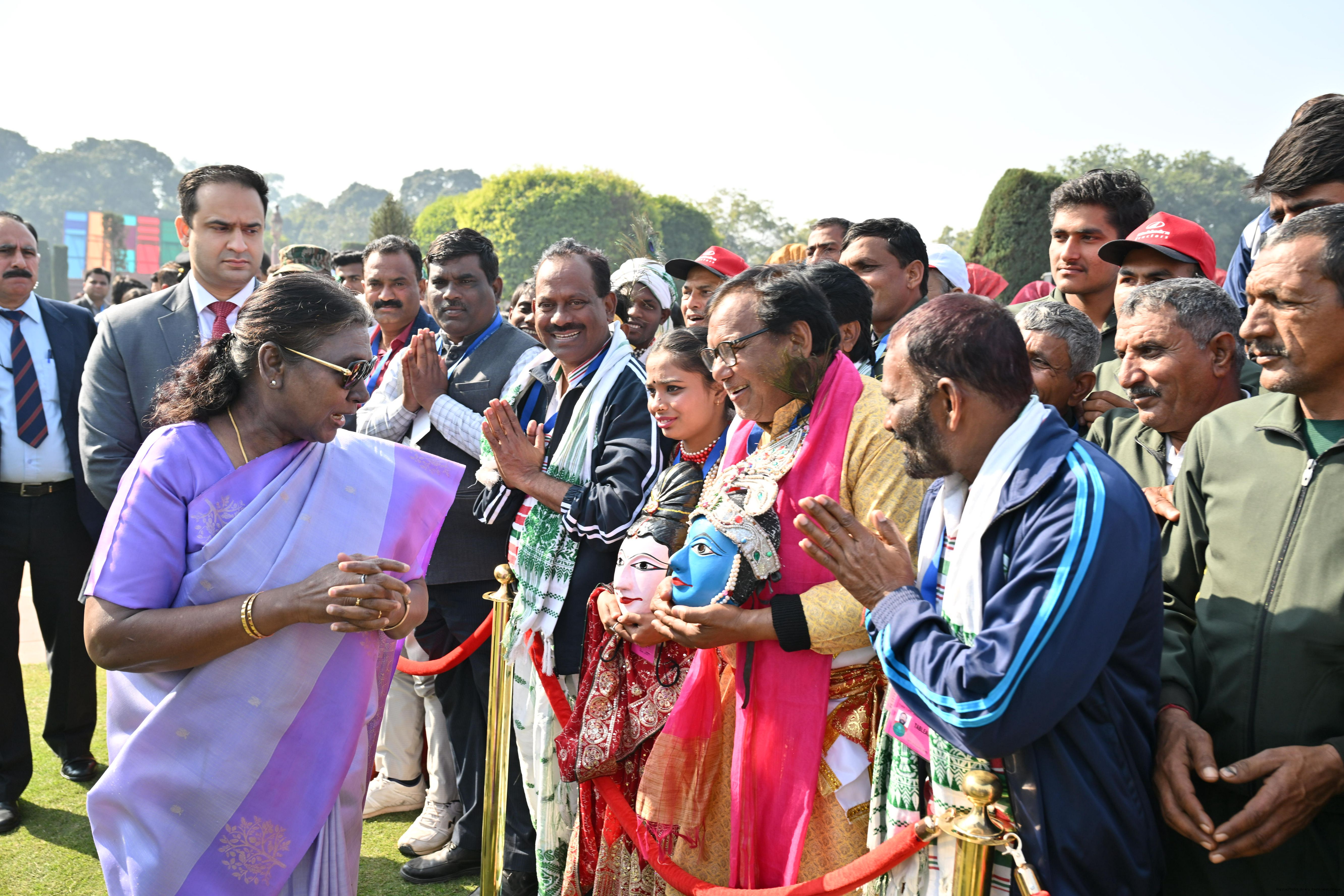 | Caption: | The President of India, Smt. Droupadi Murmu met and posing a group photographs tribal guests, tableaux artistes and tractor drivers, NSS volunteers and NCC cadets, officials and other participants of the Republic Day Parade 2025, at Rashtrapati Bhavan on January 28, 2025. |