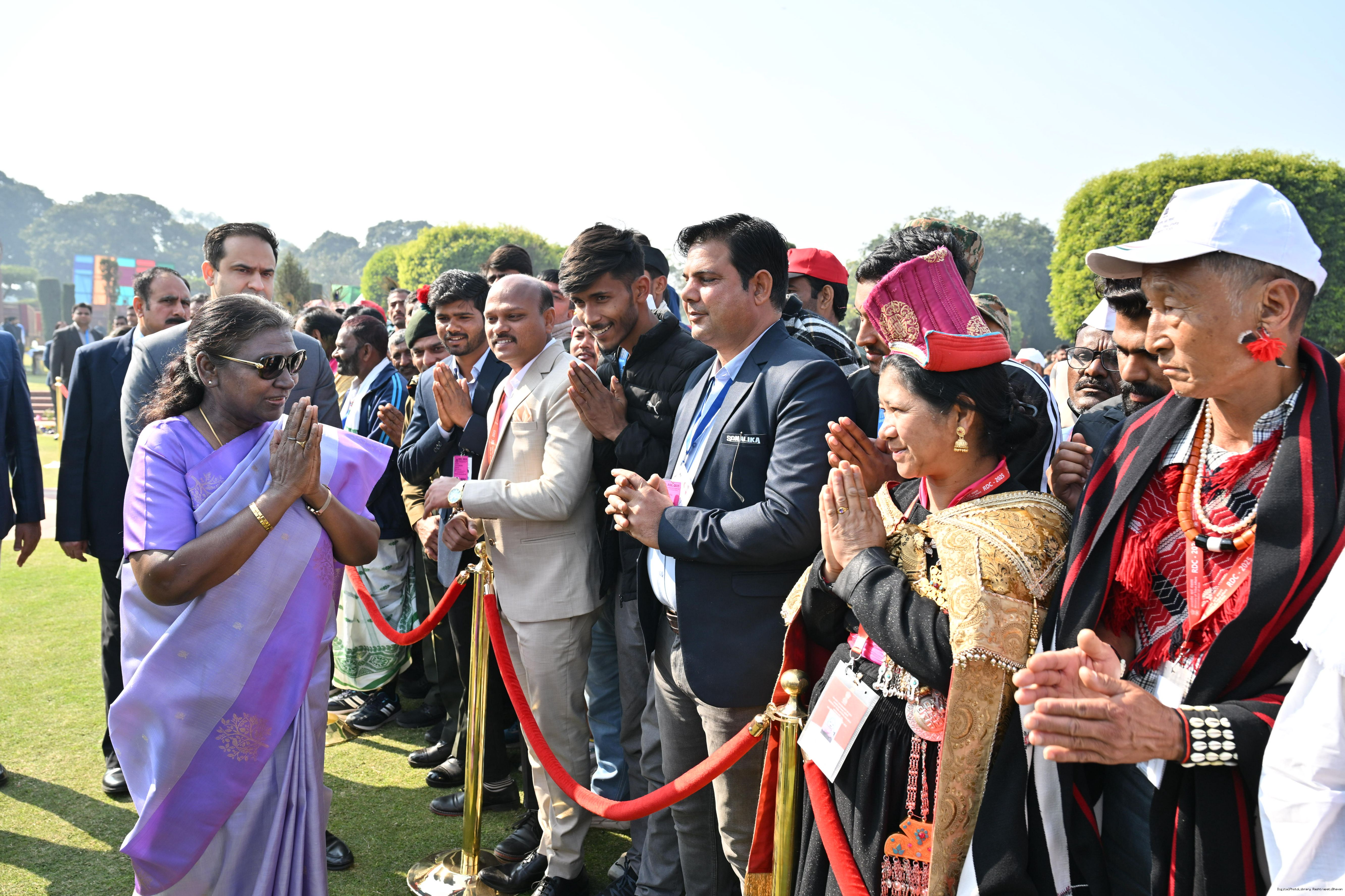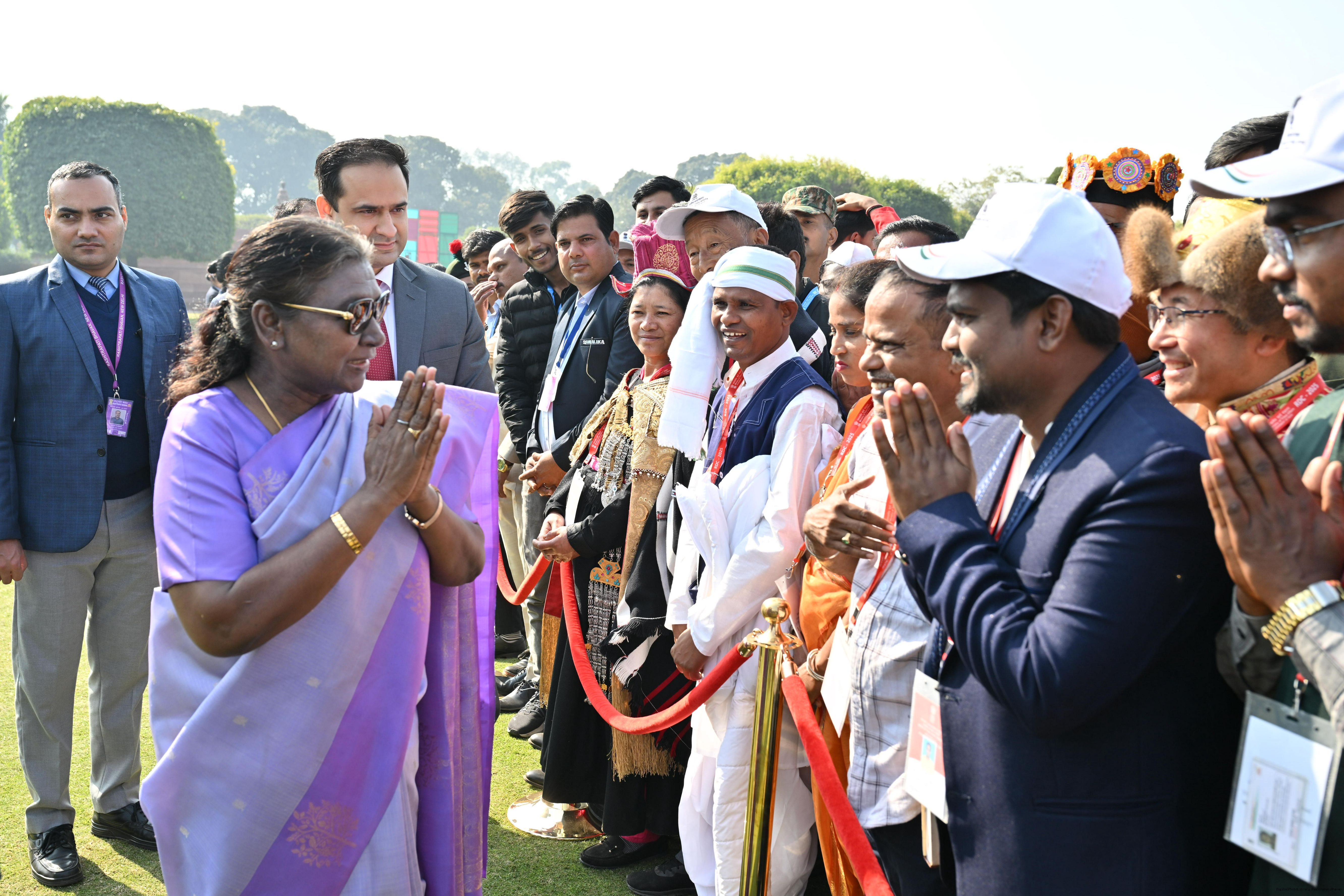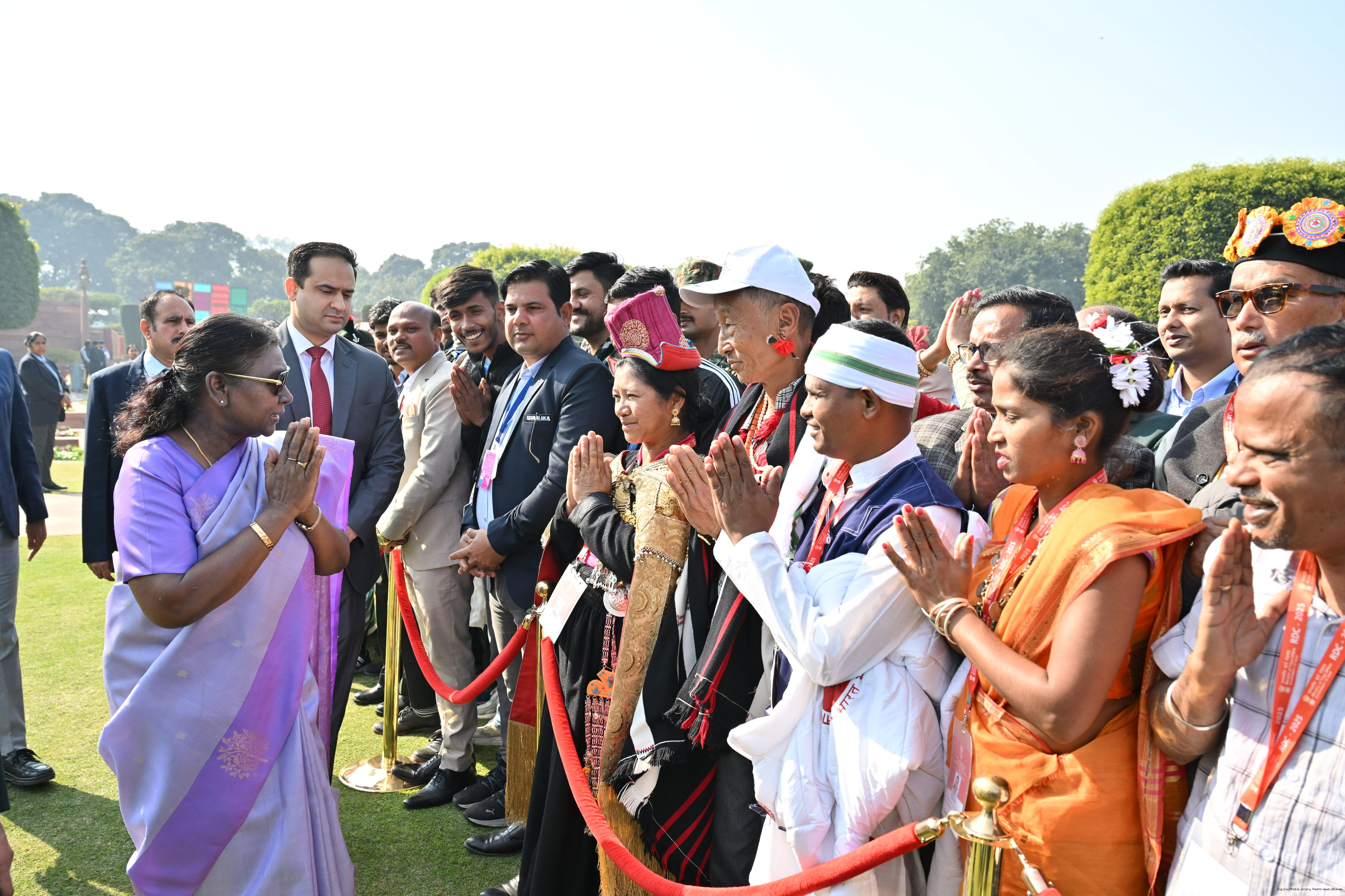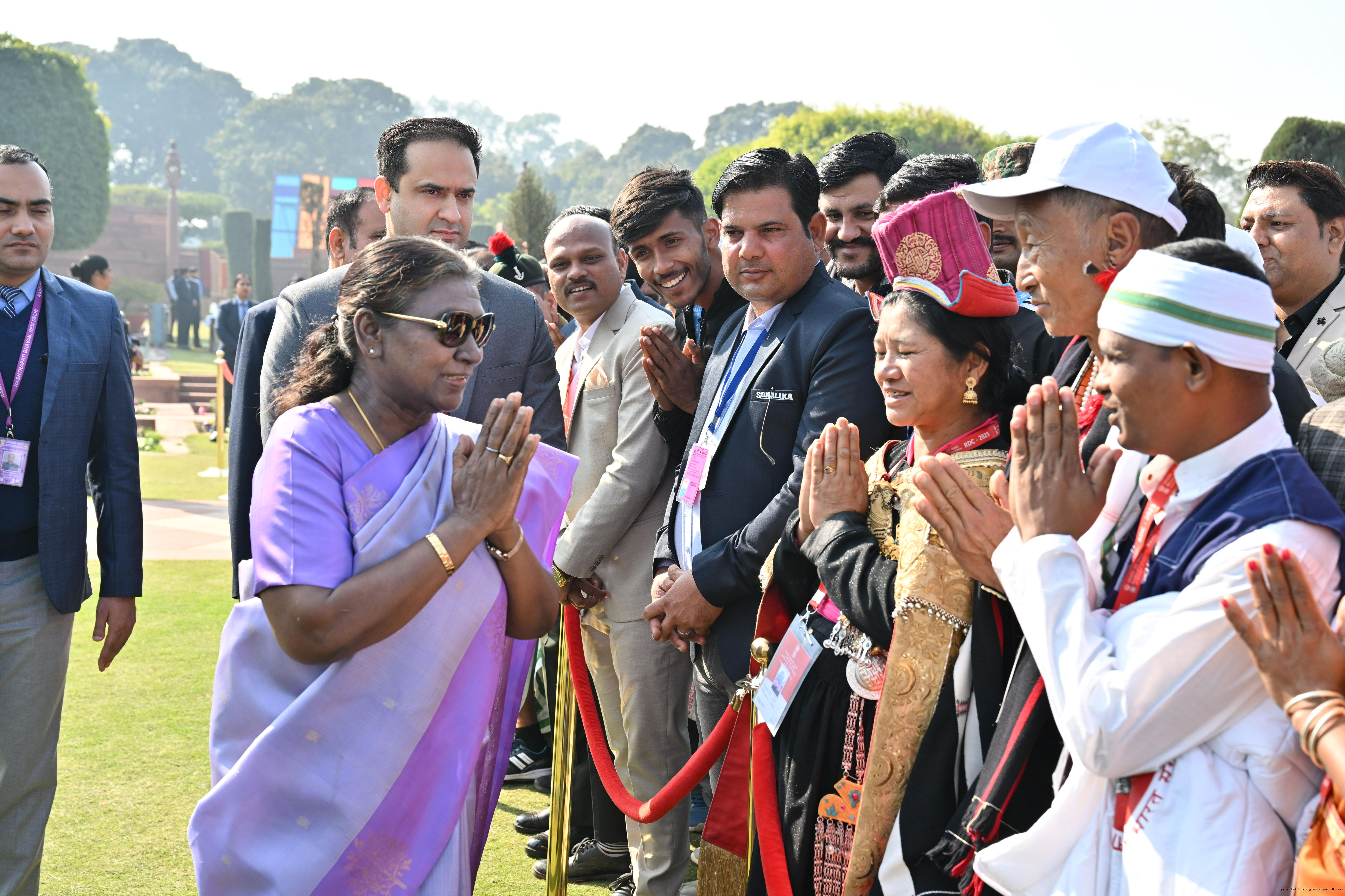 | Caption: | The President of India, Smt. Droupadi Murmu met and posing a group photographs tribal guests, tableaux artistes and tractor drivers, NSS volunteers and NCC cadets, officials and other participants of the Republic Day Parade 2025, at Rashtrapati Bhavan on January 28, 2025. |