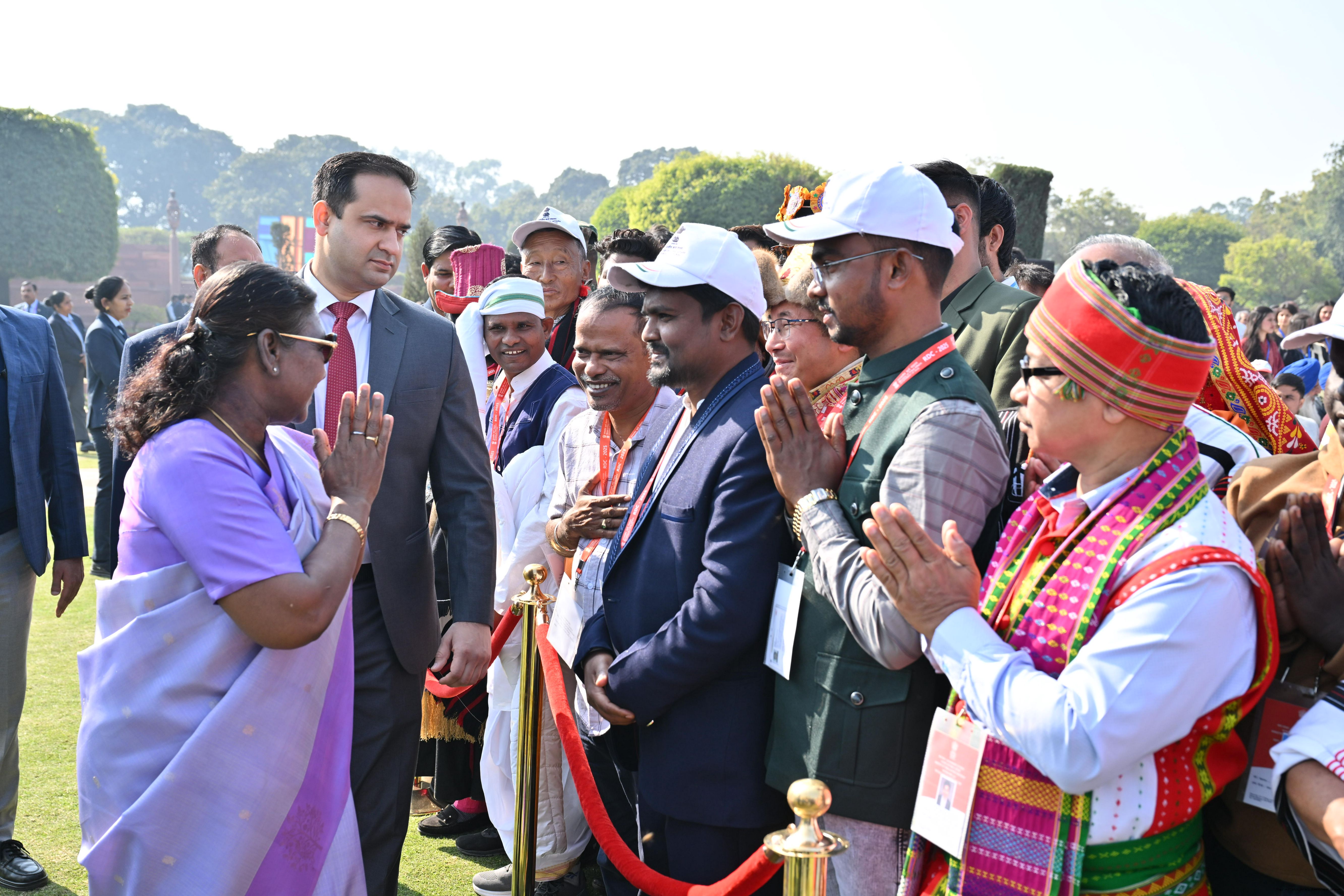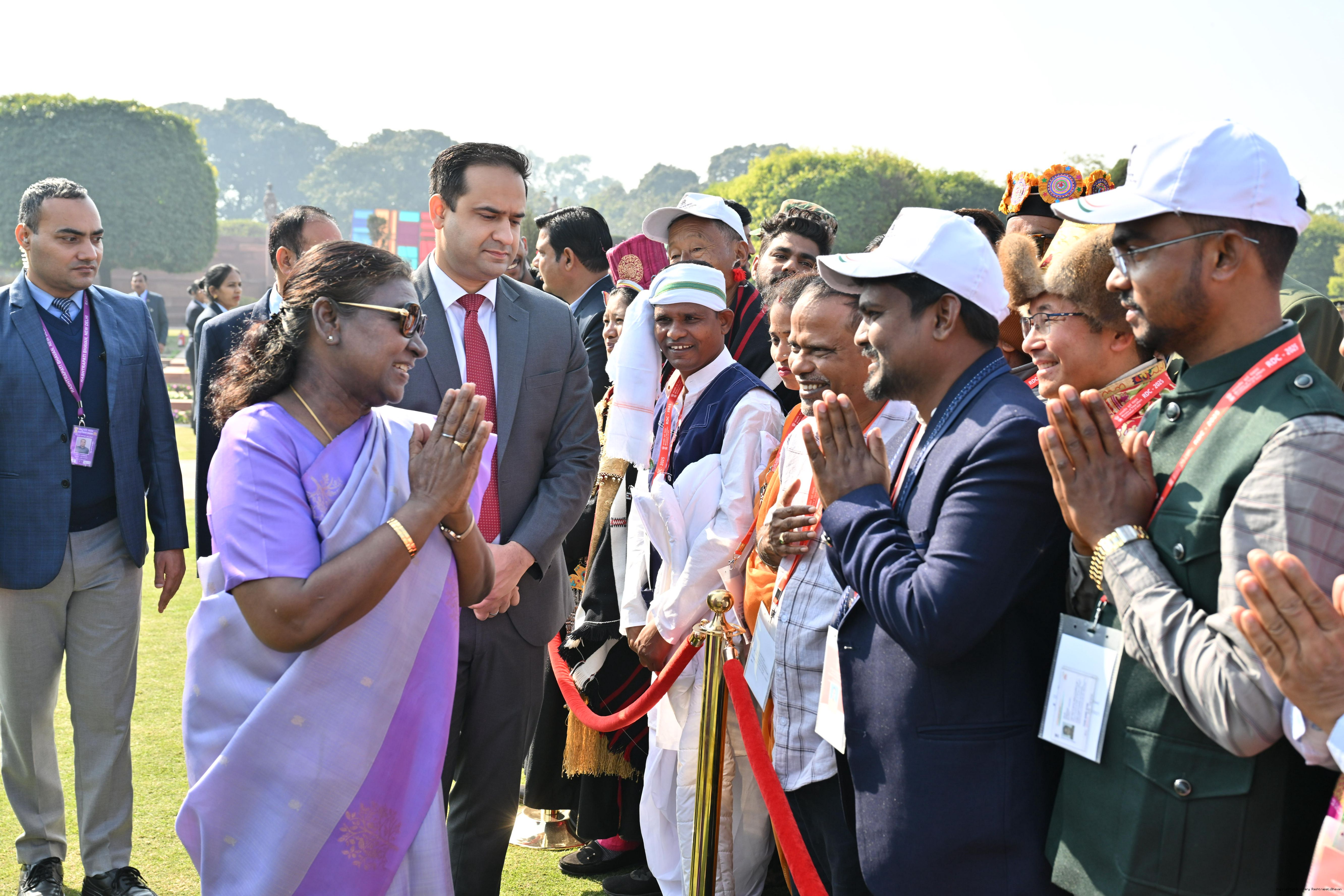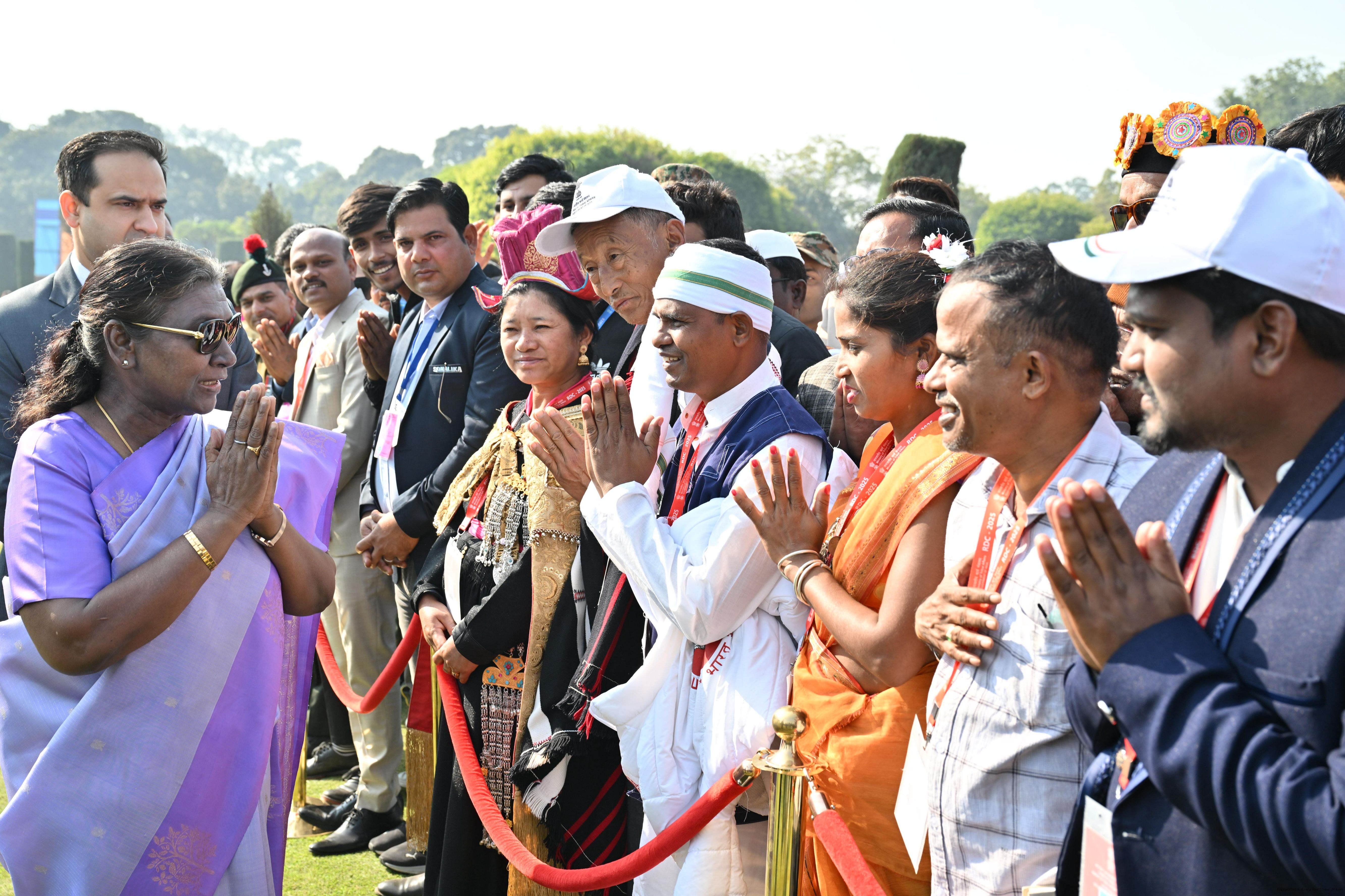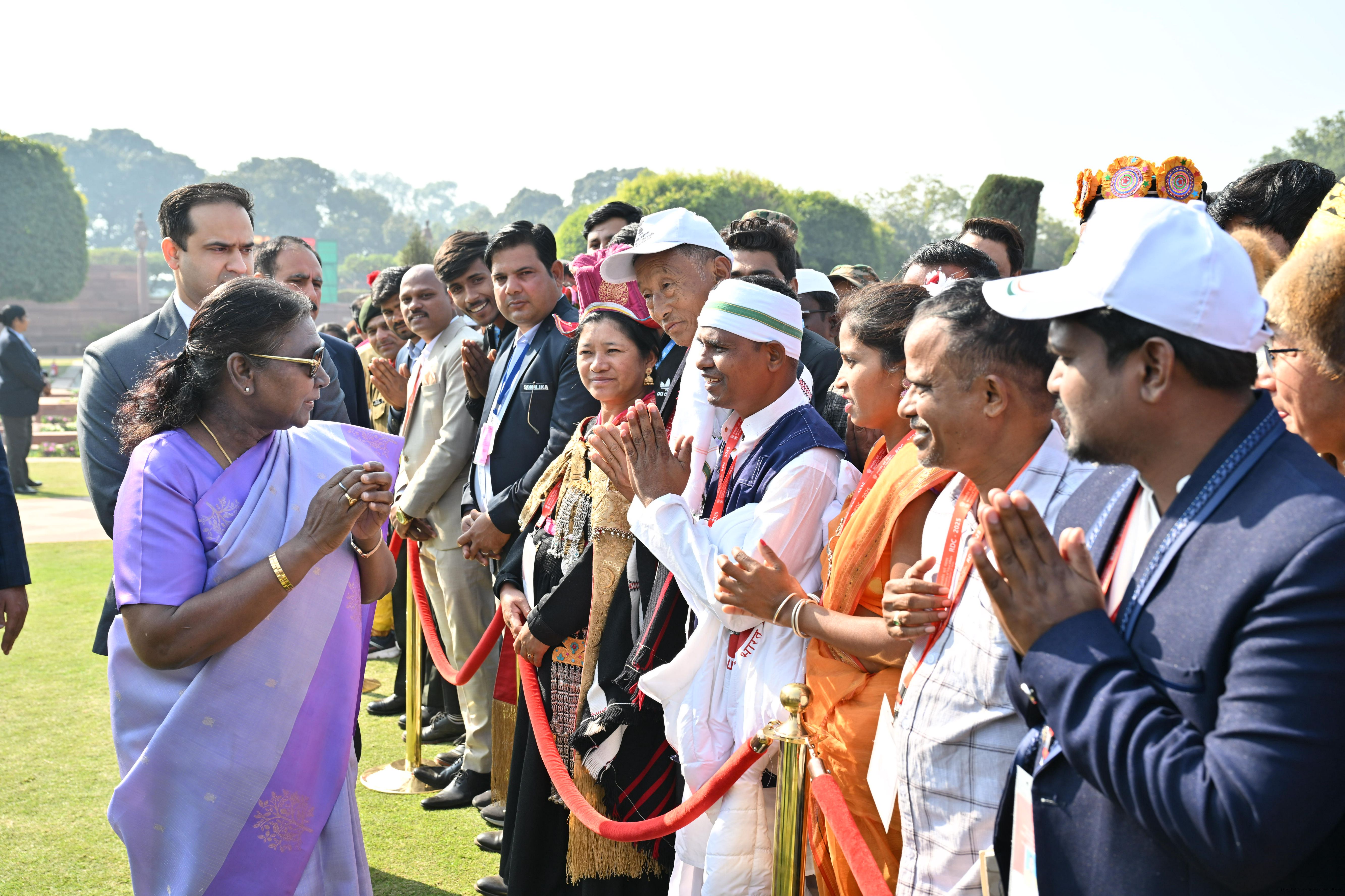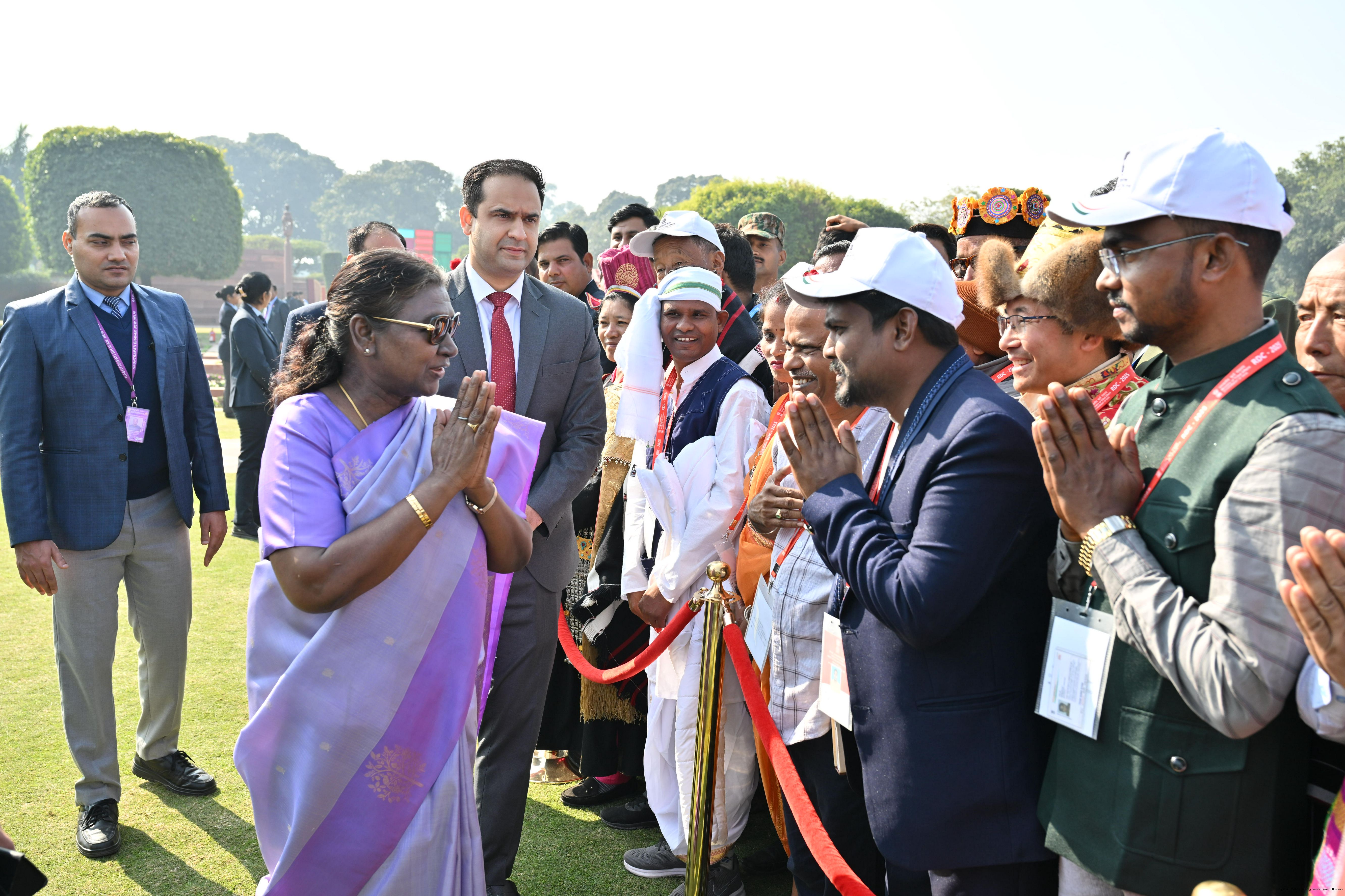 | Caption: | The President of India, Smt. Droupadi Murmu met and posing a group photographs tribal guests, tableaux artistes and tractor drivers, NSS volunteers and NCC cadets, officials and other participants of the Republic Day Parade 2025, at Rashtrapati Bhavan on January 28, 2025. |