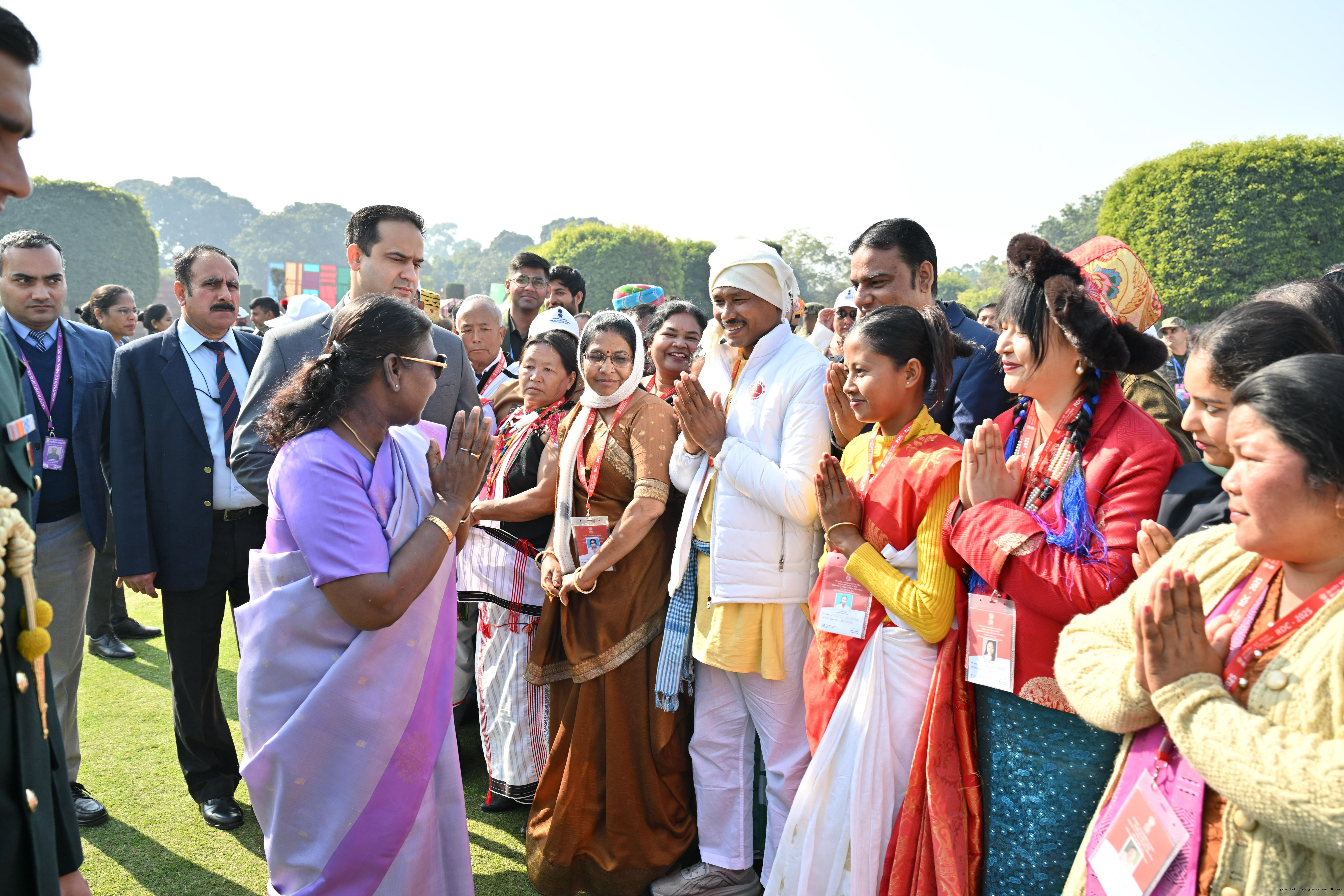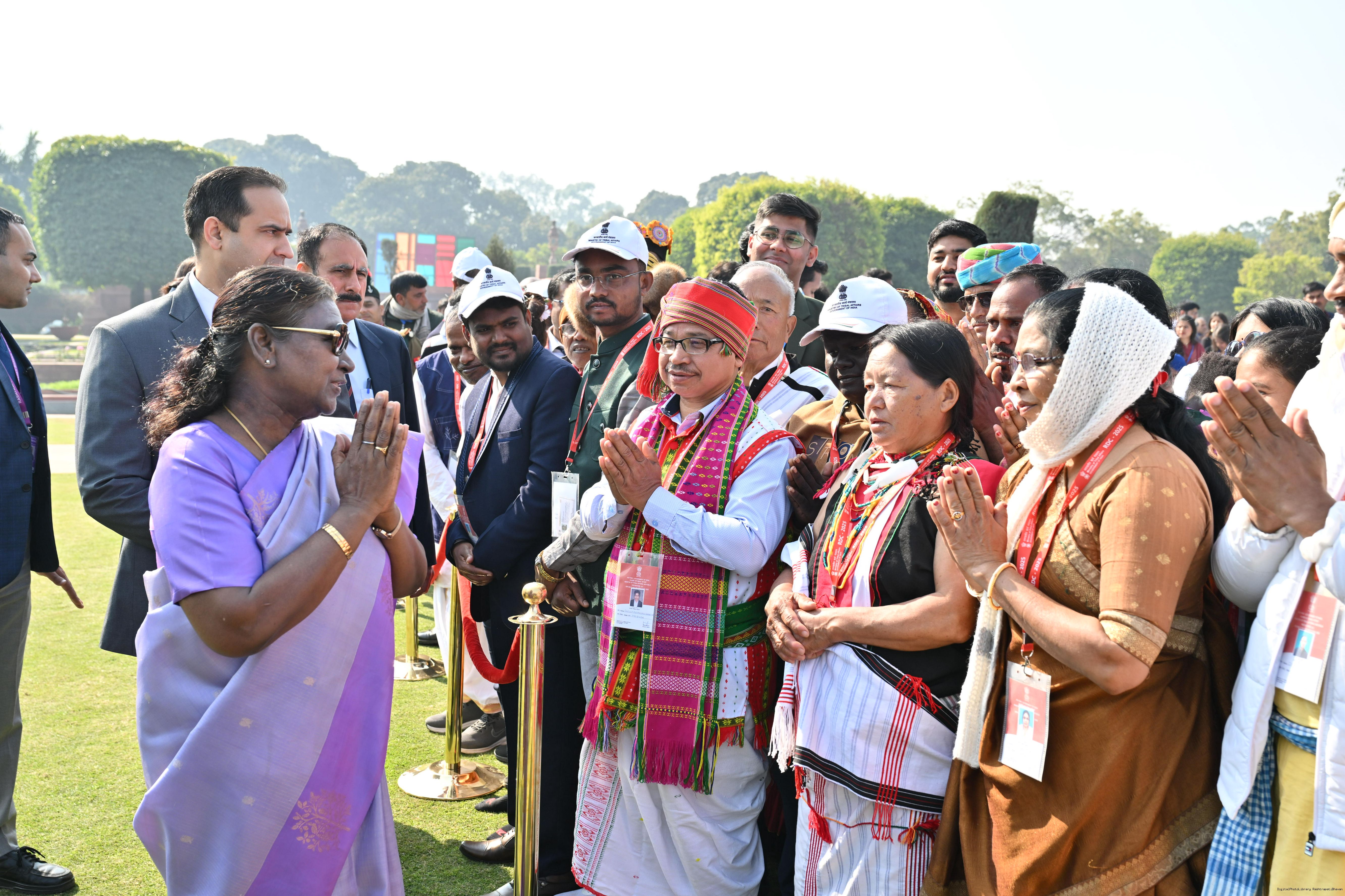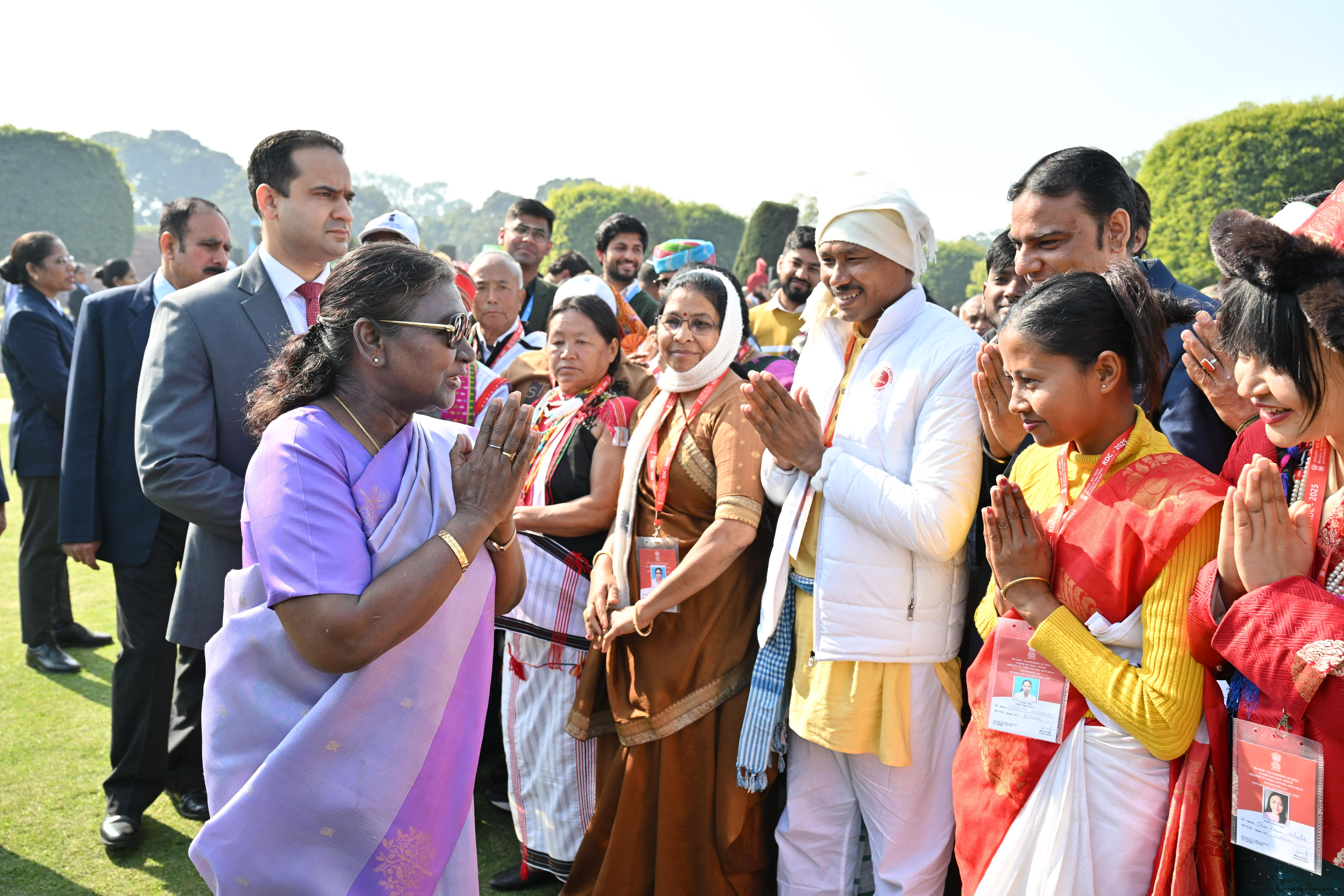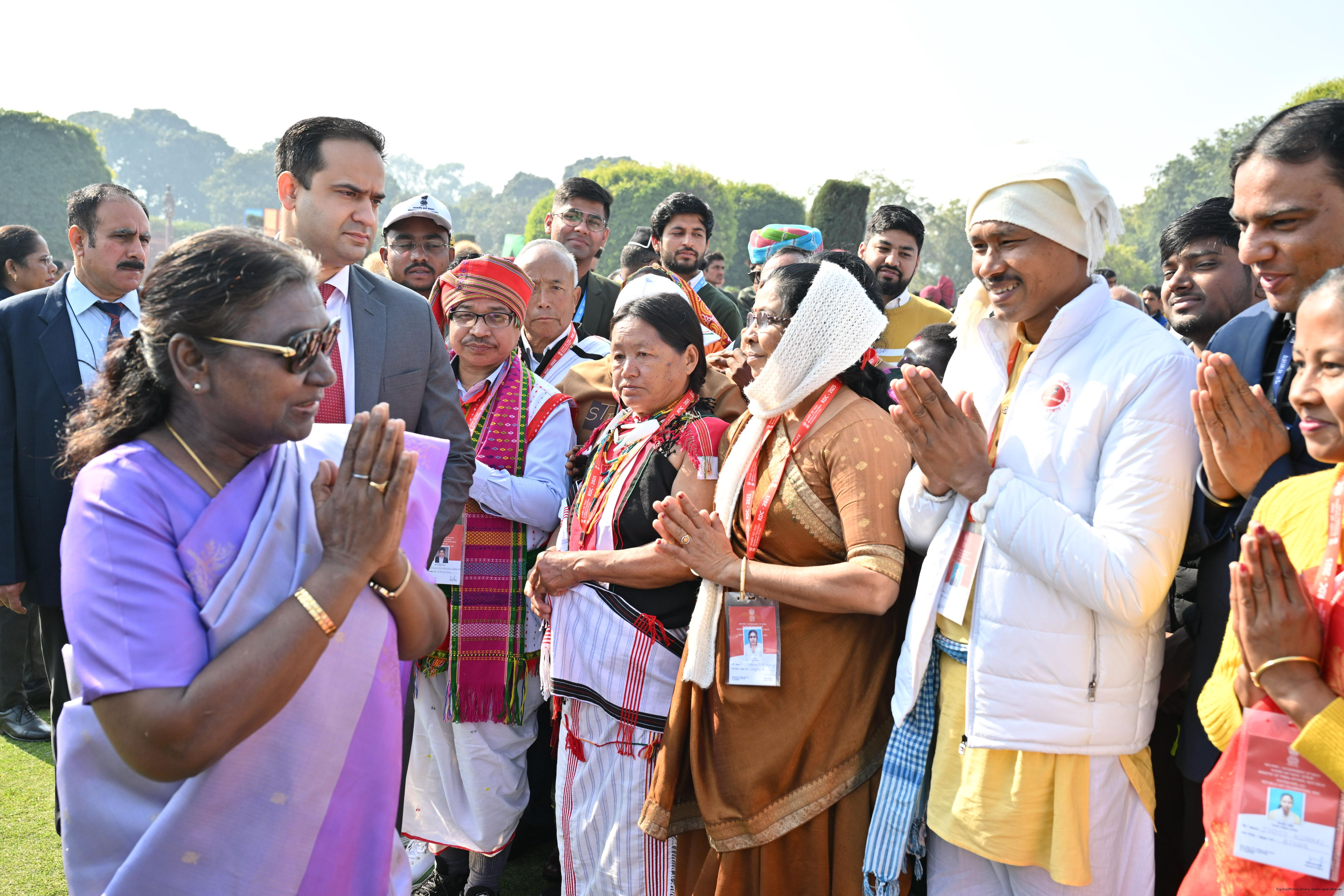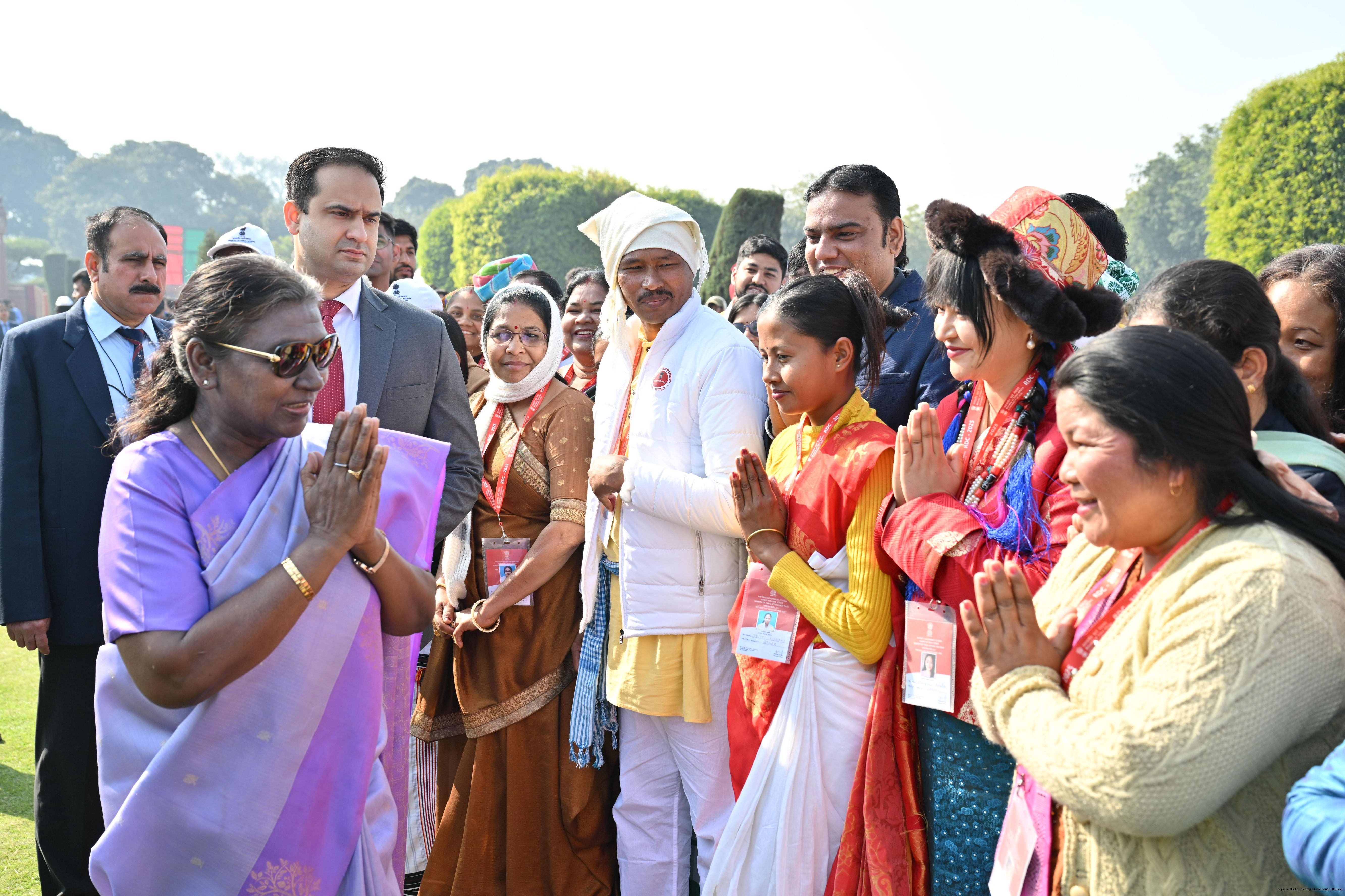 | Caption: | The President of India, Smt. Droupadi Murmu met and posing a group photographs tribal guests, tableaux artistes and tractor drivers, NSS volunteers and NCC cadets, officials and other participants of the Republic Day Parade 2025, at Rashtrapati Bhavan on January 28, 2025. |