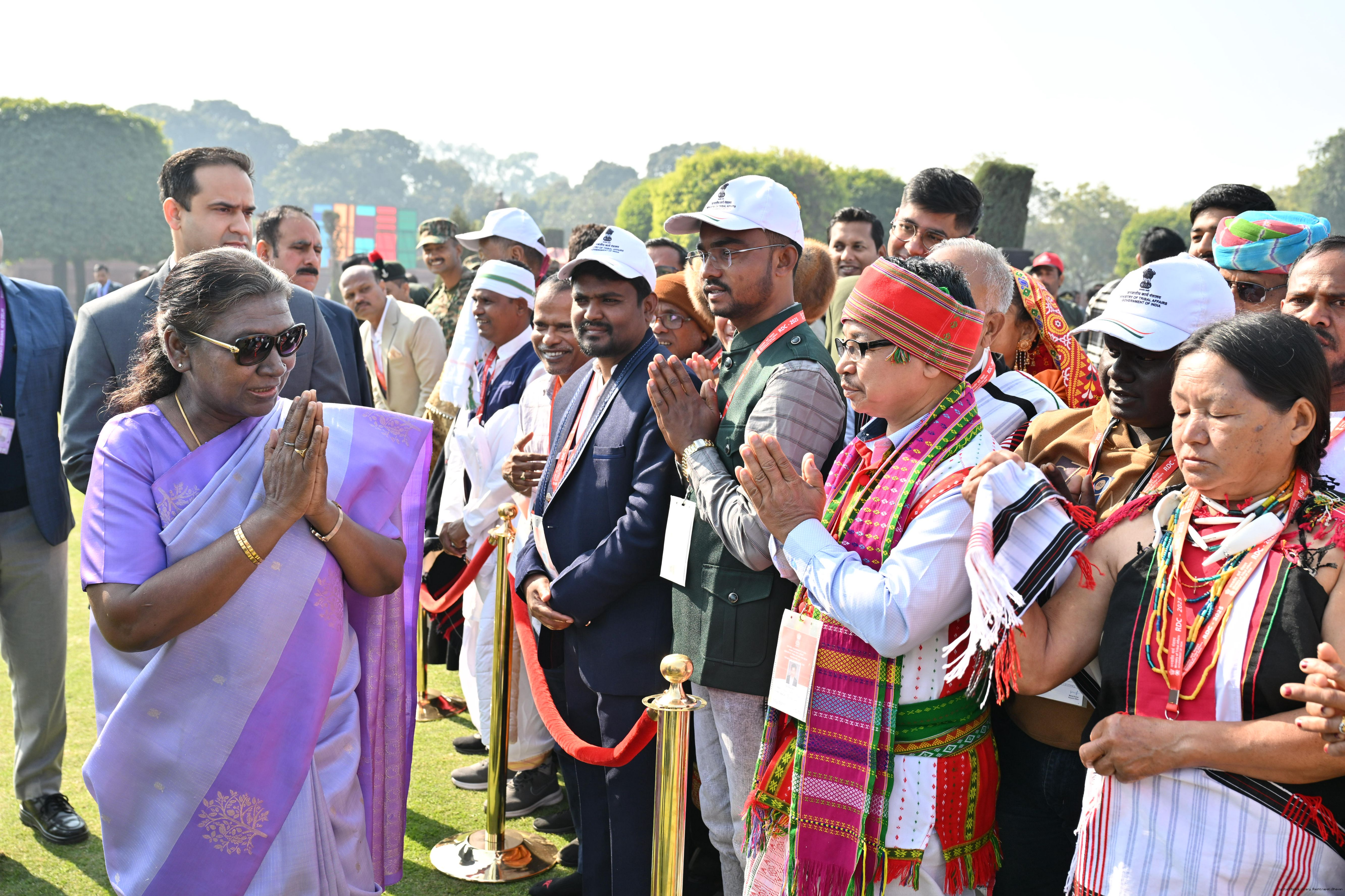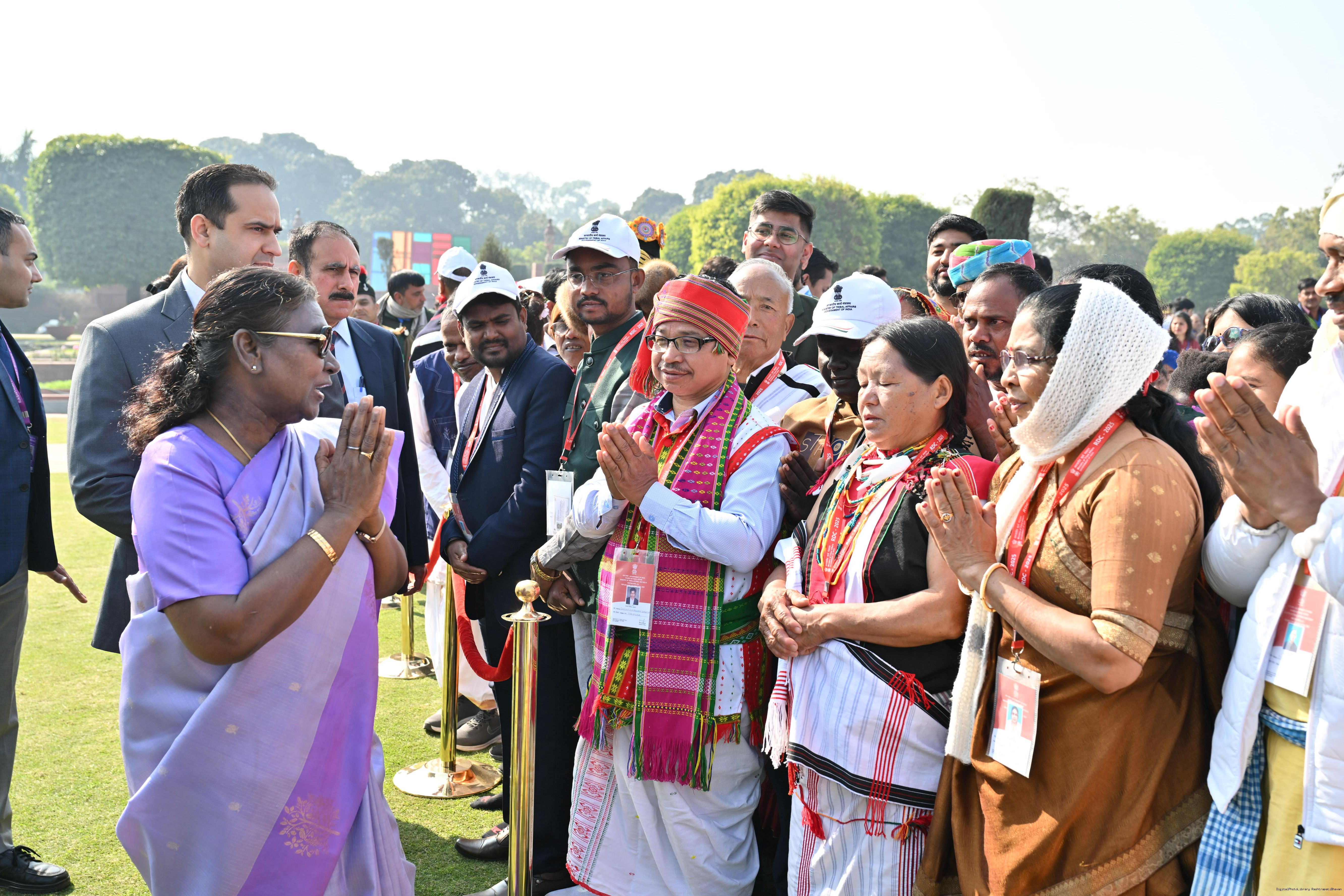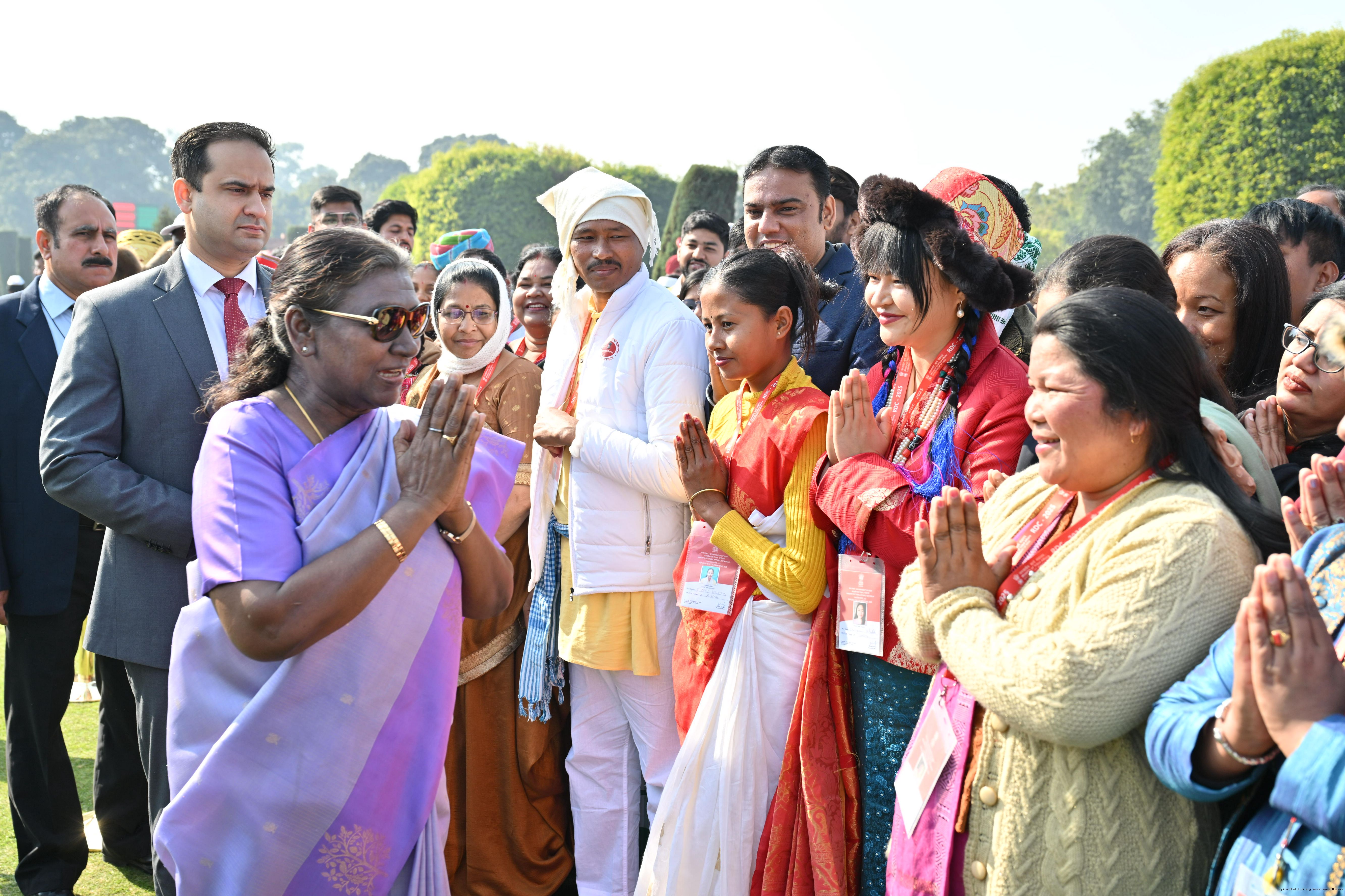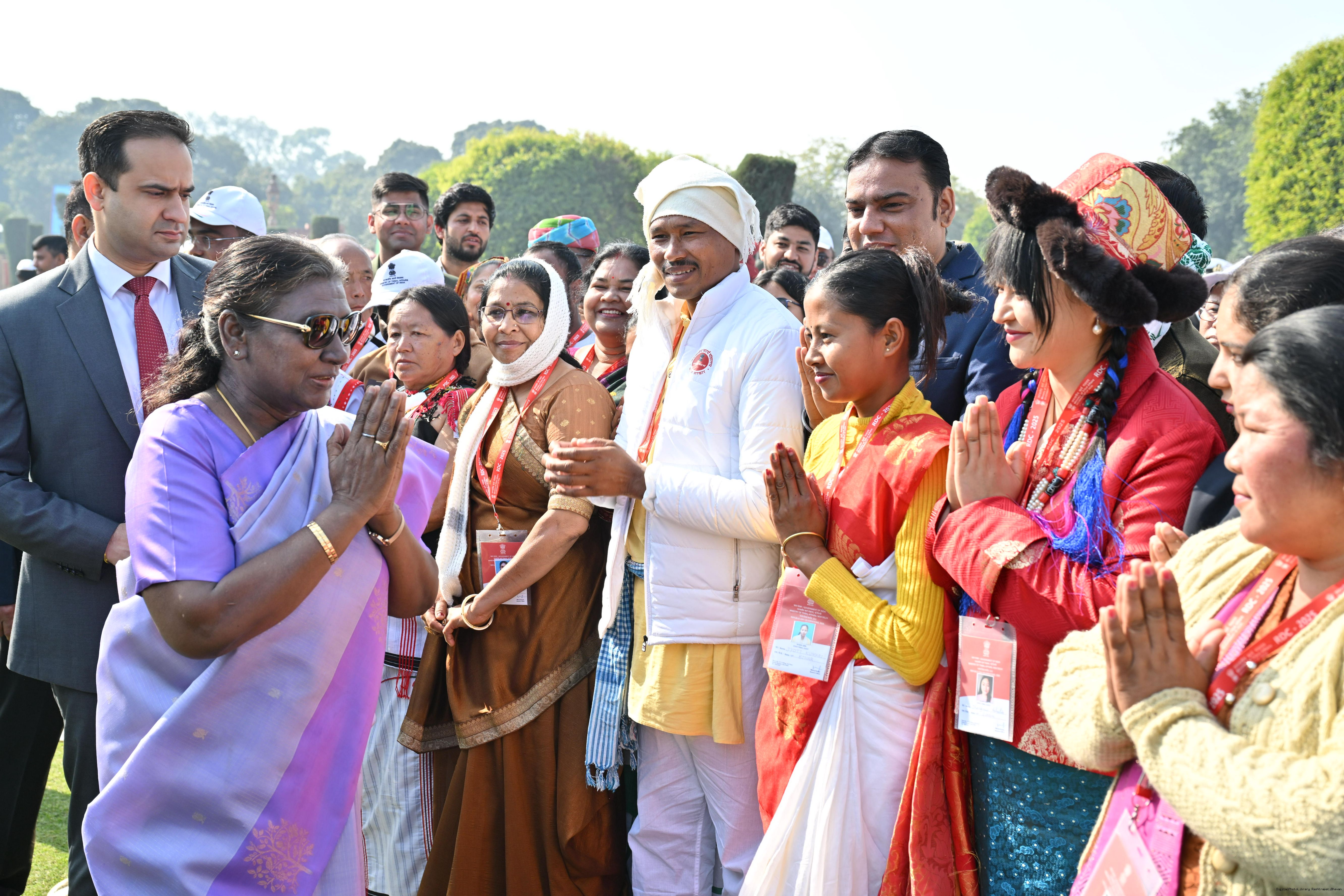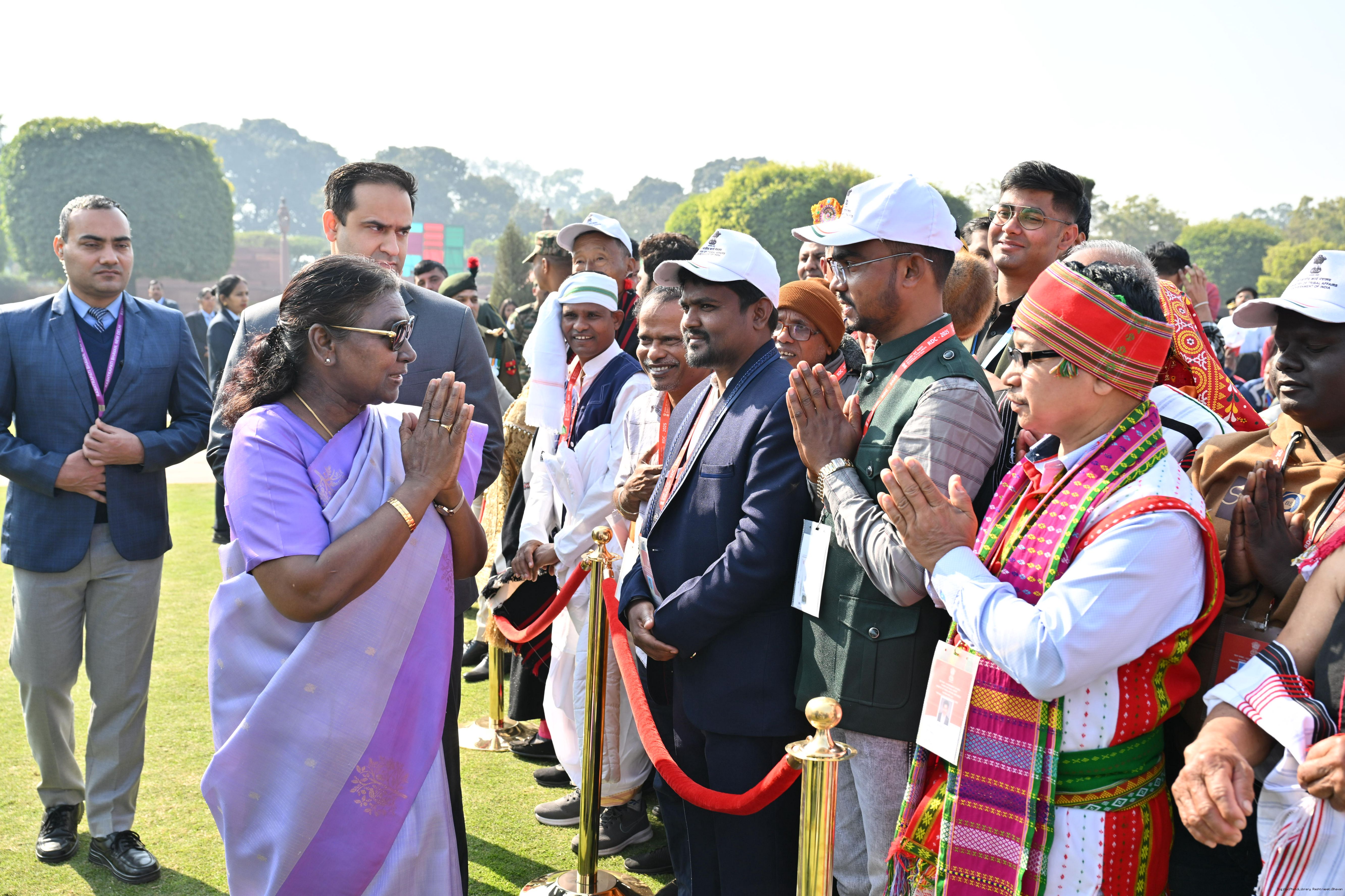 | Caption: | The President of India, Smt. Droupadi Murmu met and posing a group photographs tribal guests, tableaux artistes and tractor drivers, NSS volunteers and NCC cadets, officials and other participants of the Republic Day Parade 2025, at Rashtrapati Bhavan on January 28, 2025. |