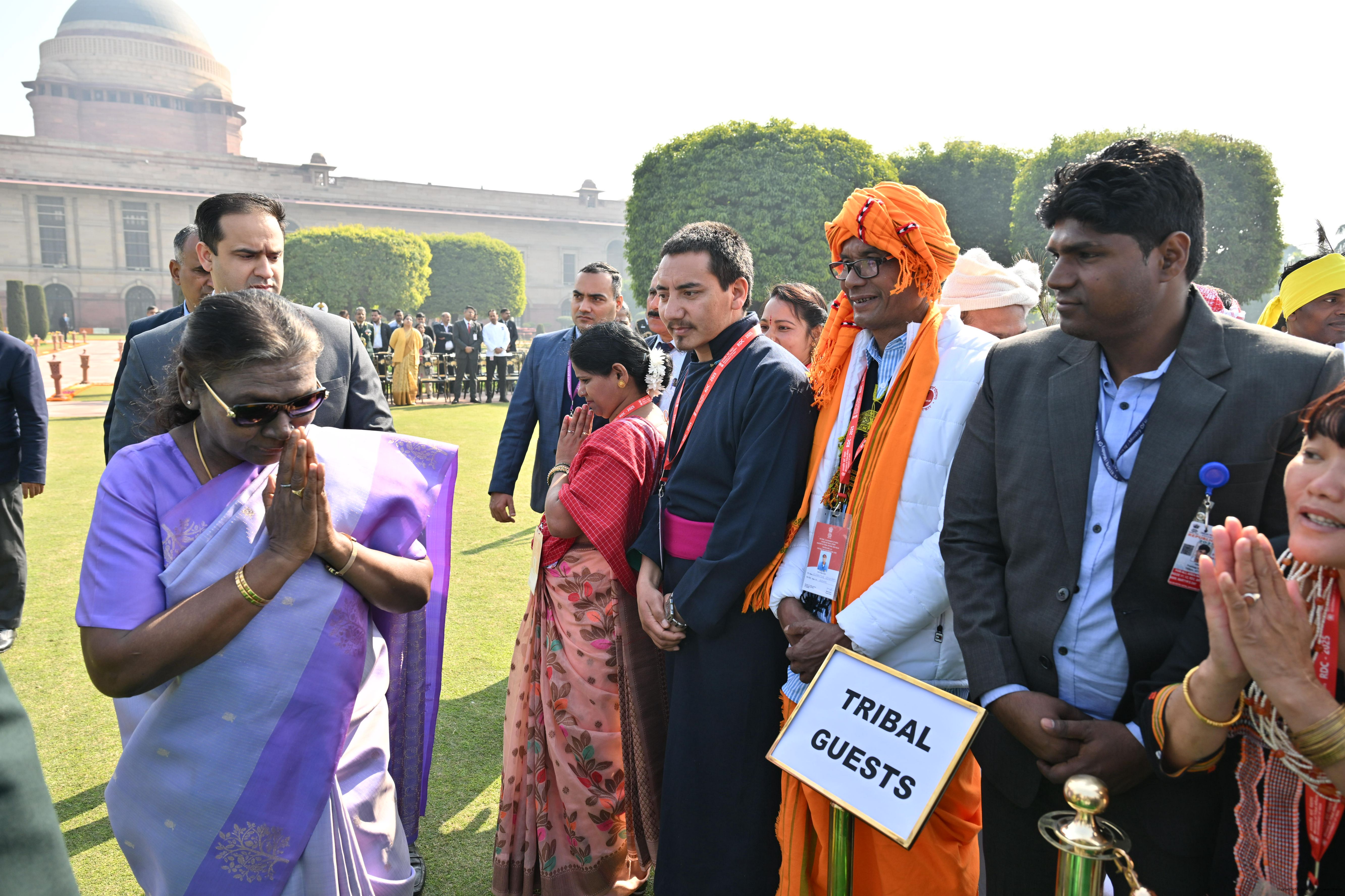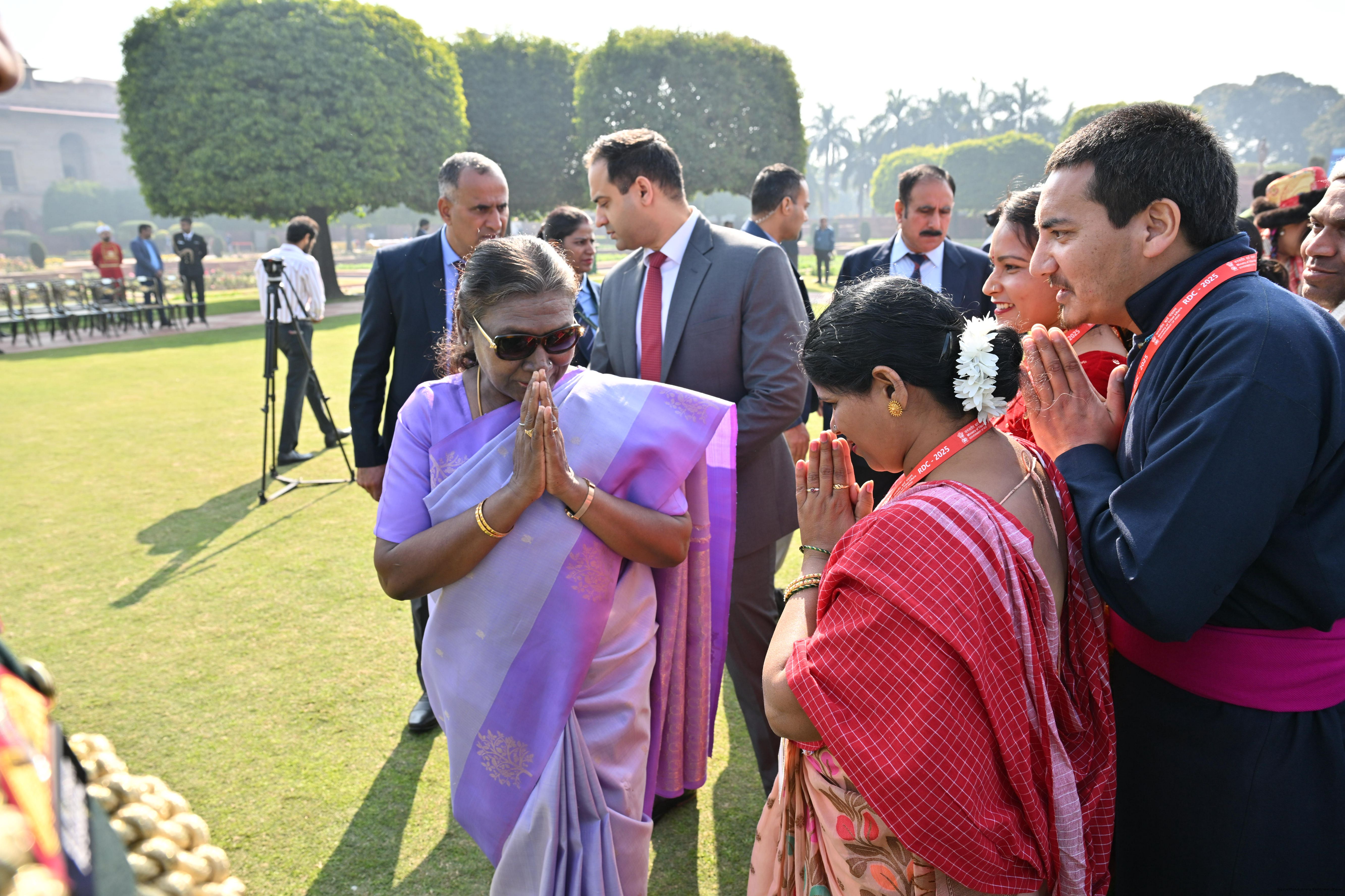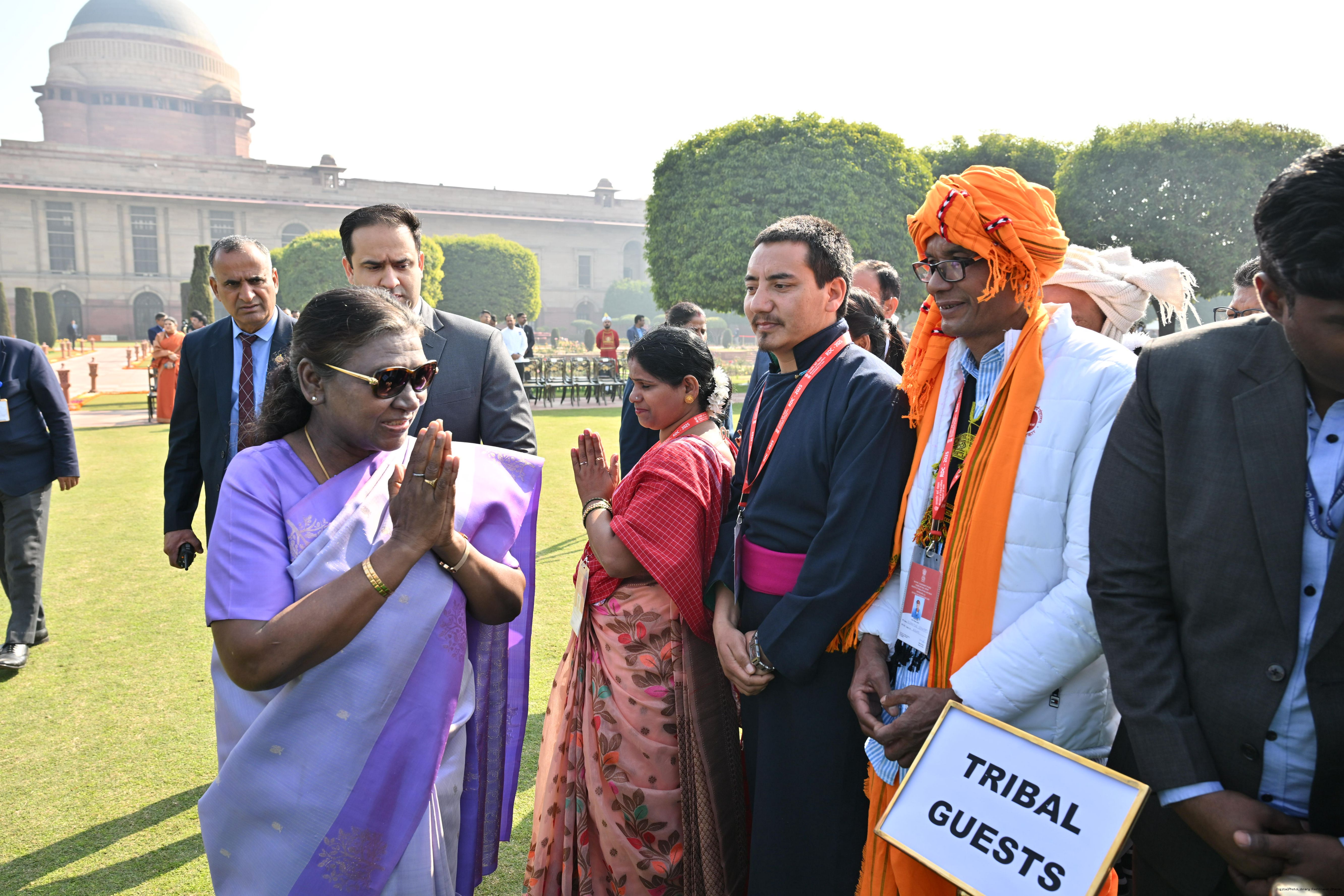 | Caption: | The President of India, Smt. Droupadi Murmu met and posing a group photographs tribal guests, tableaux artistes and tractor drivers, NSS volunteers and NCC cadets, officials and other participants of the Republic Day Parade 2025, at Rashtrapati Bhavan on January 28, 2025. |