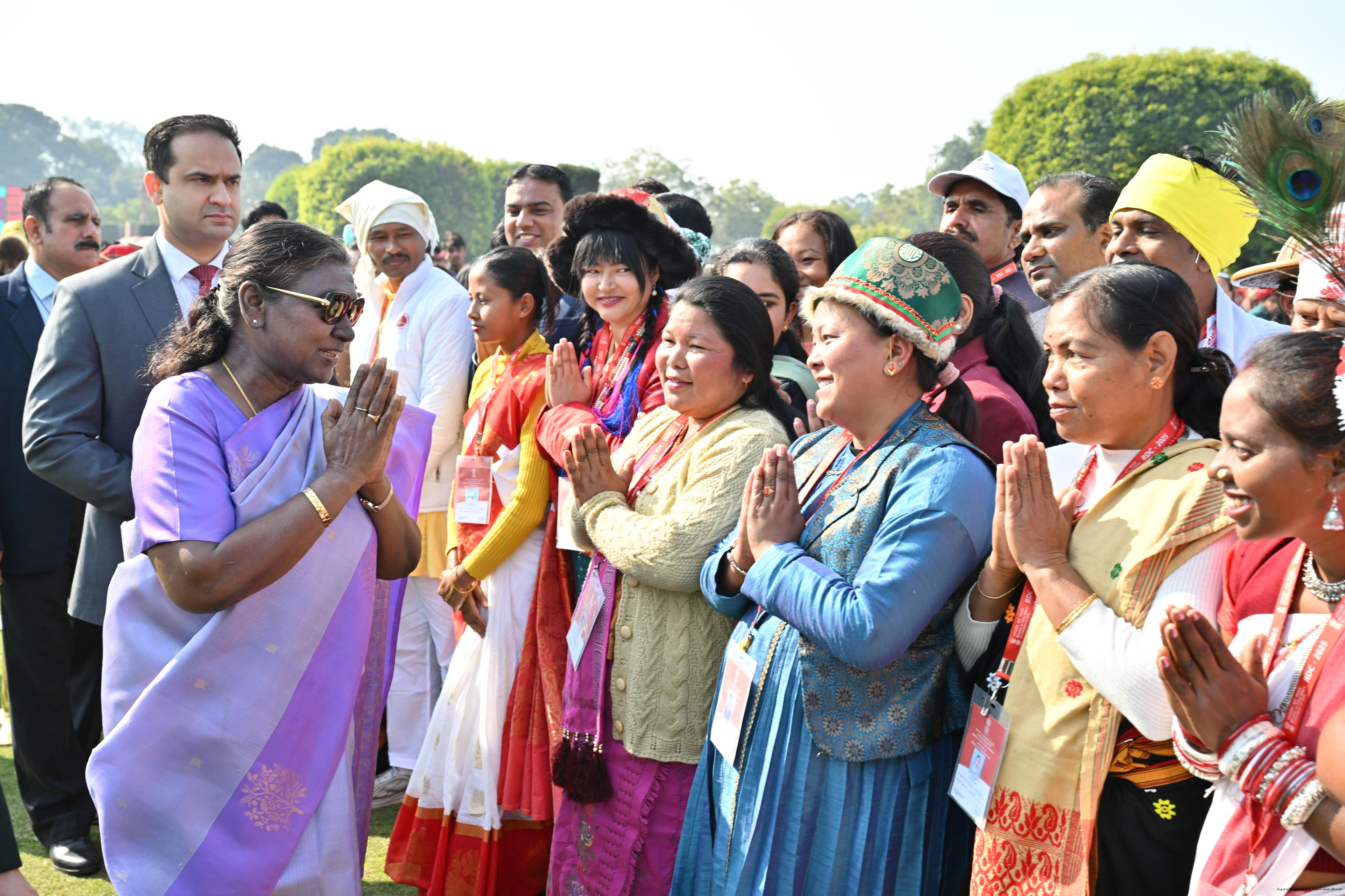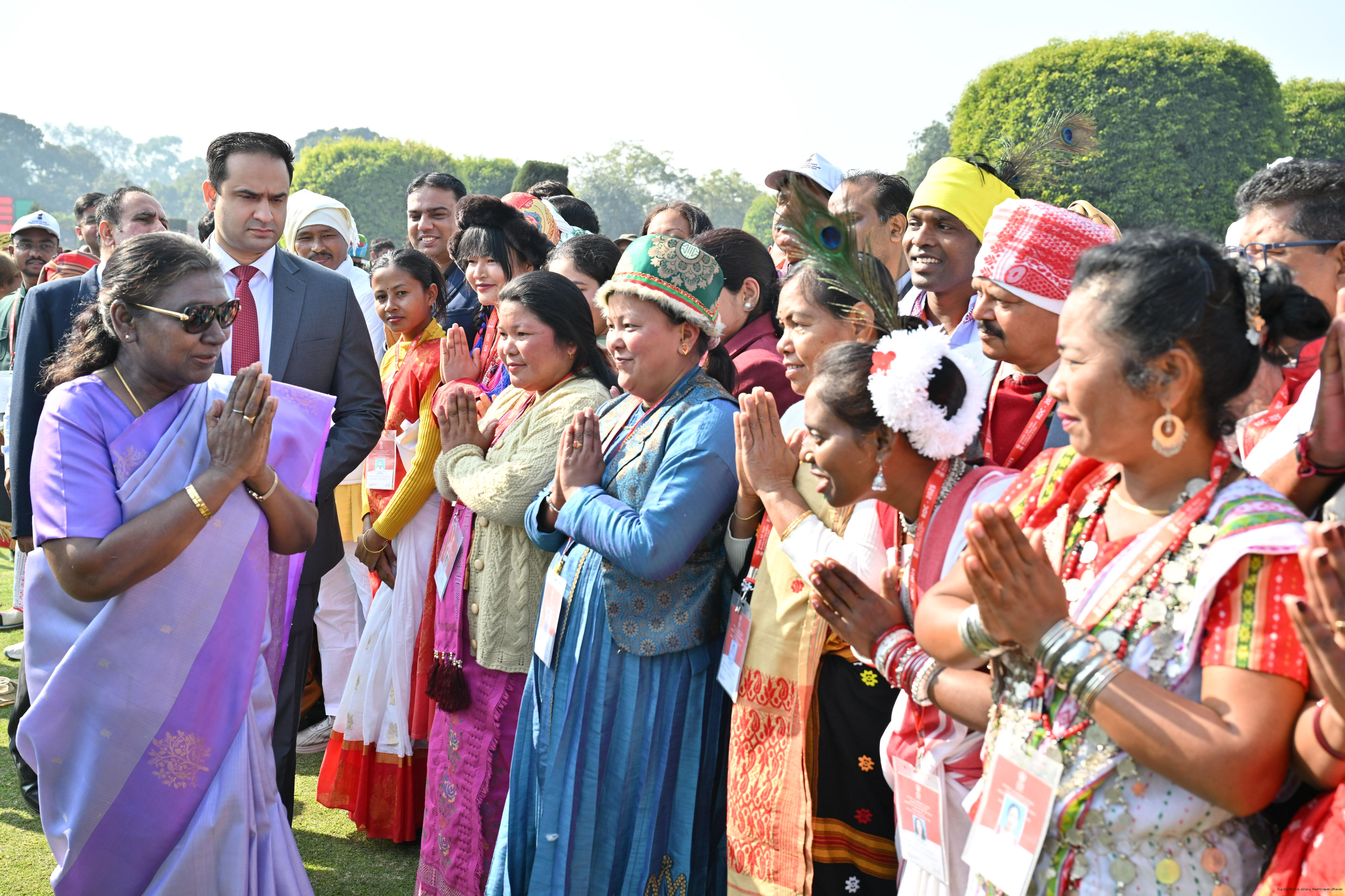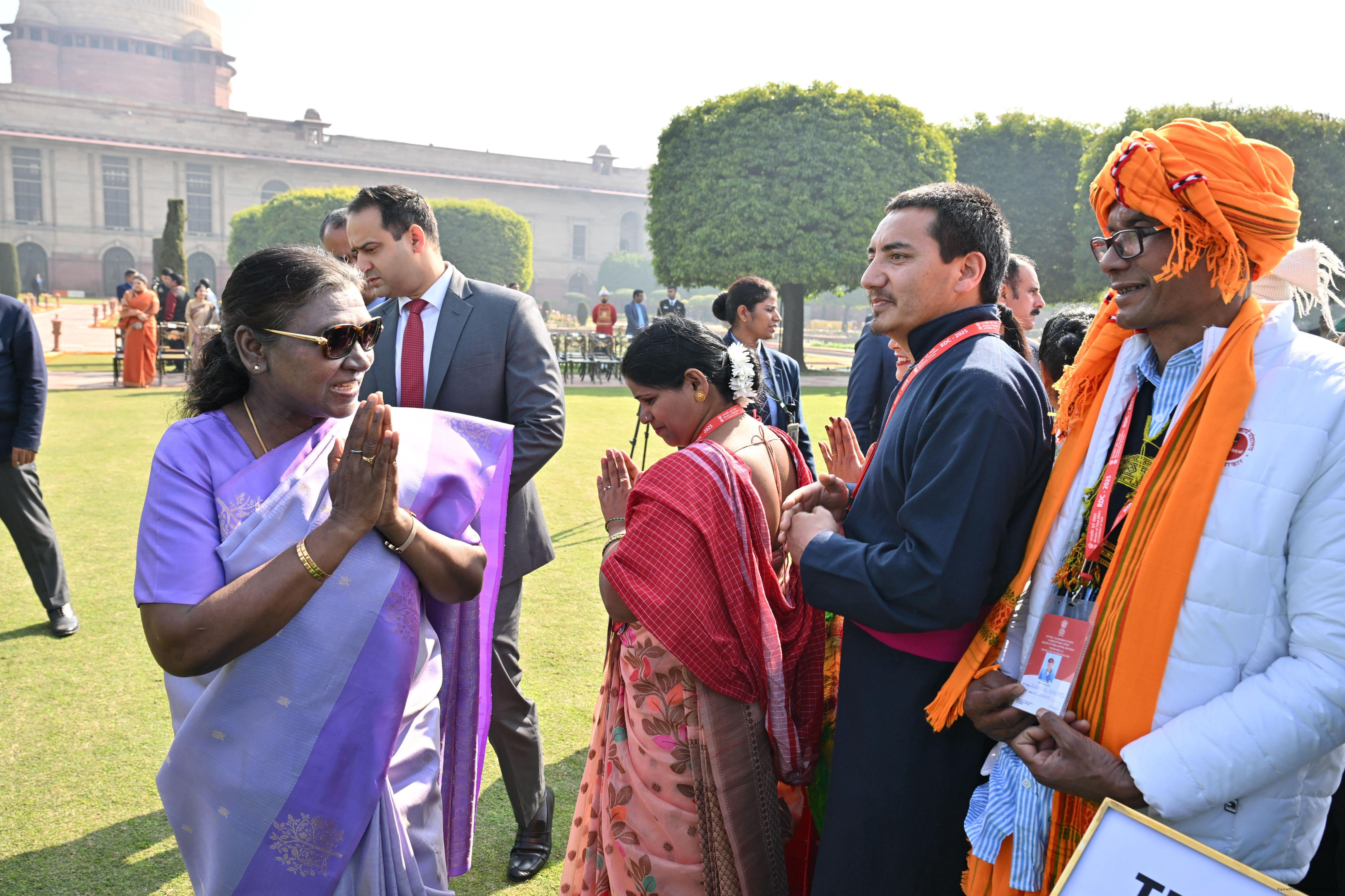 | Caption: | The President of India, Smt. Droupadi Murmu met and posing a group photographs tribal guests, tableaux artistes and tractor drivers, NSS volunteers and NCC cadets, officials and other participants of the Republic Day Parade 2025, at Rashtrapati Bhavan on January 28, 2025. |