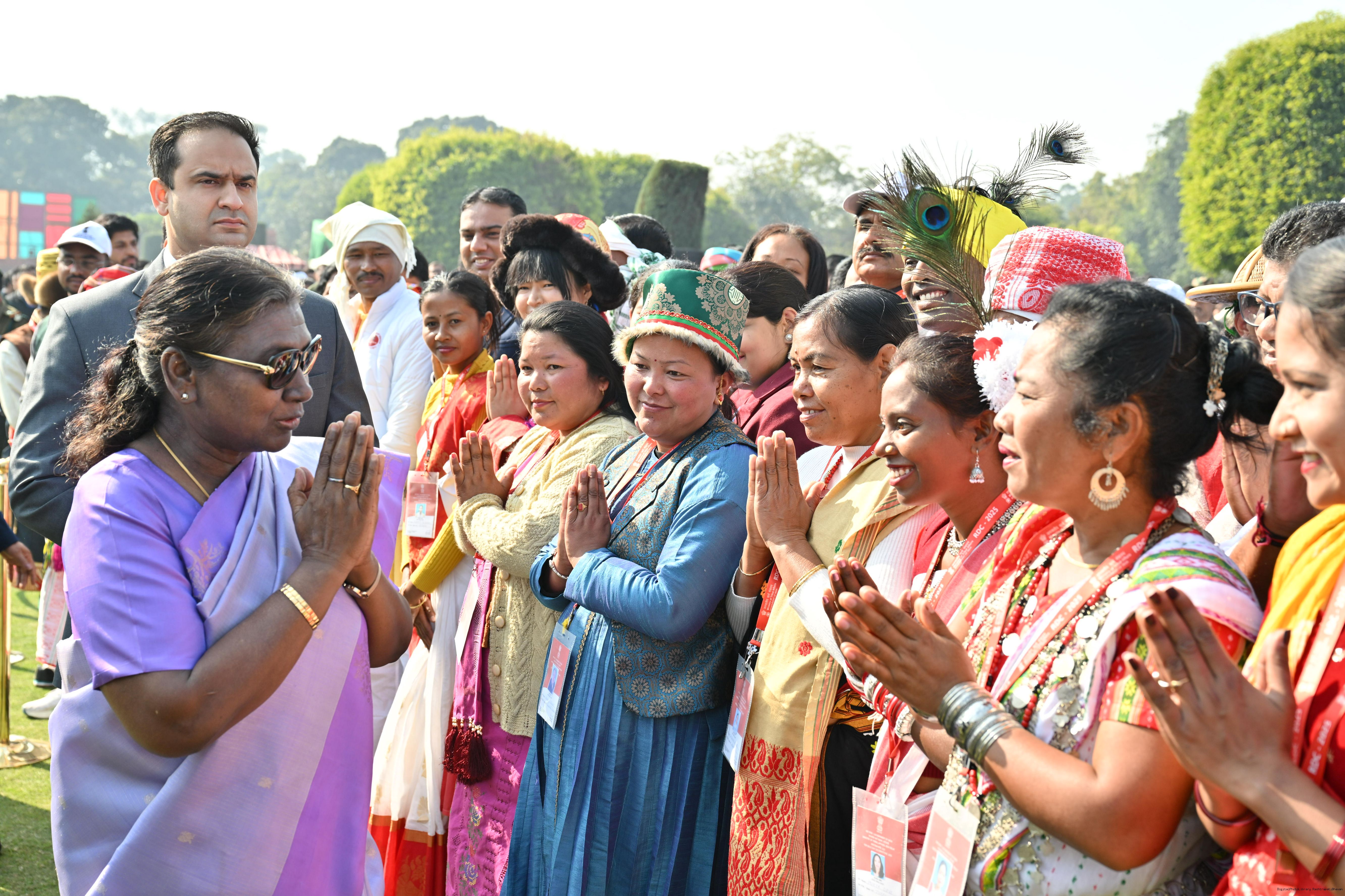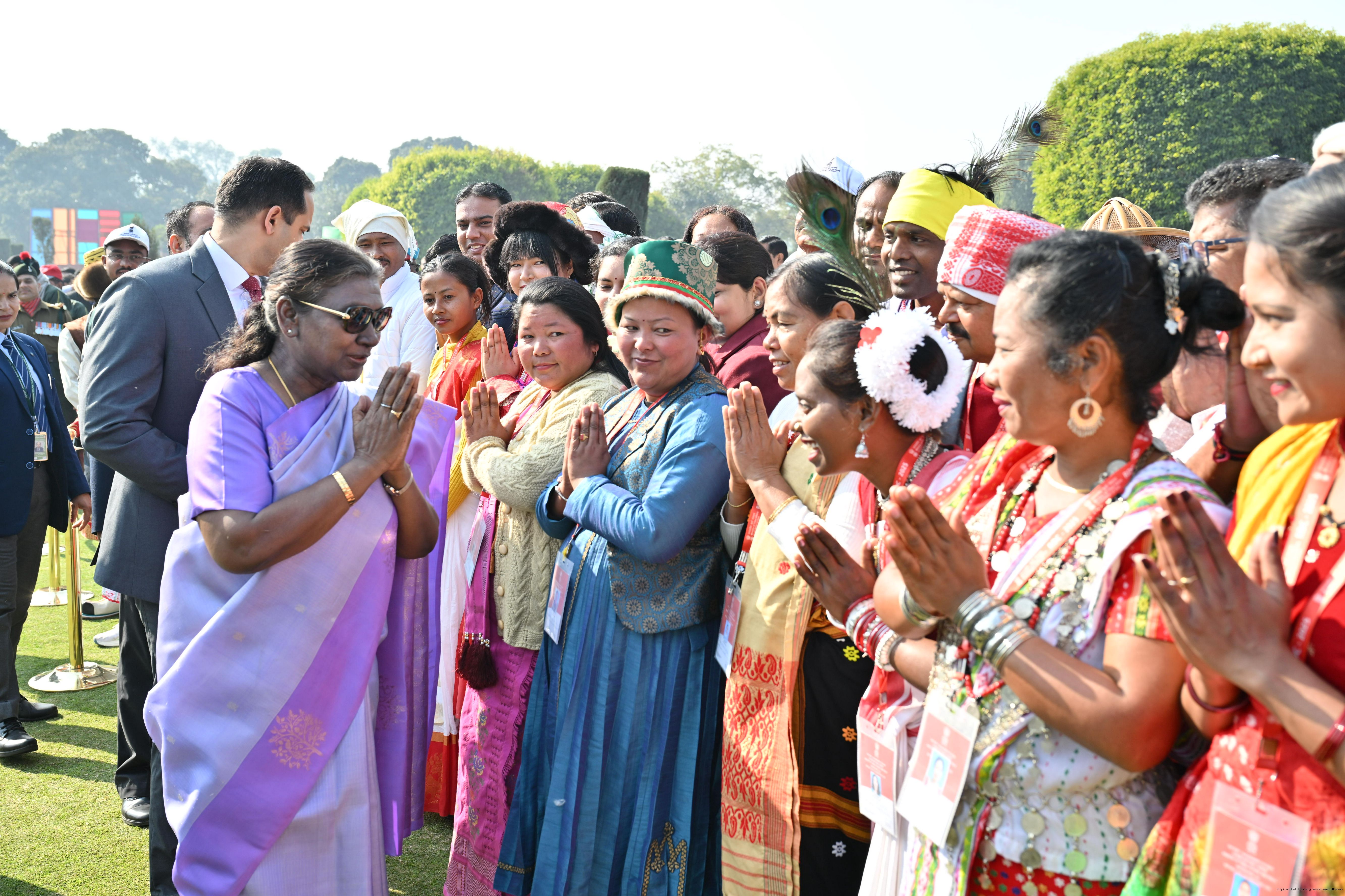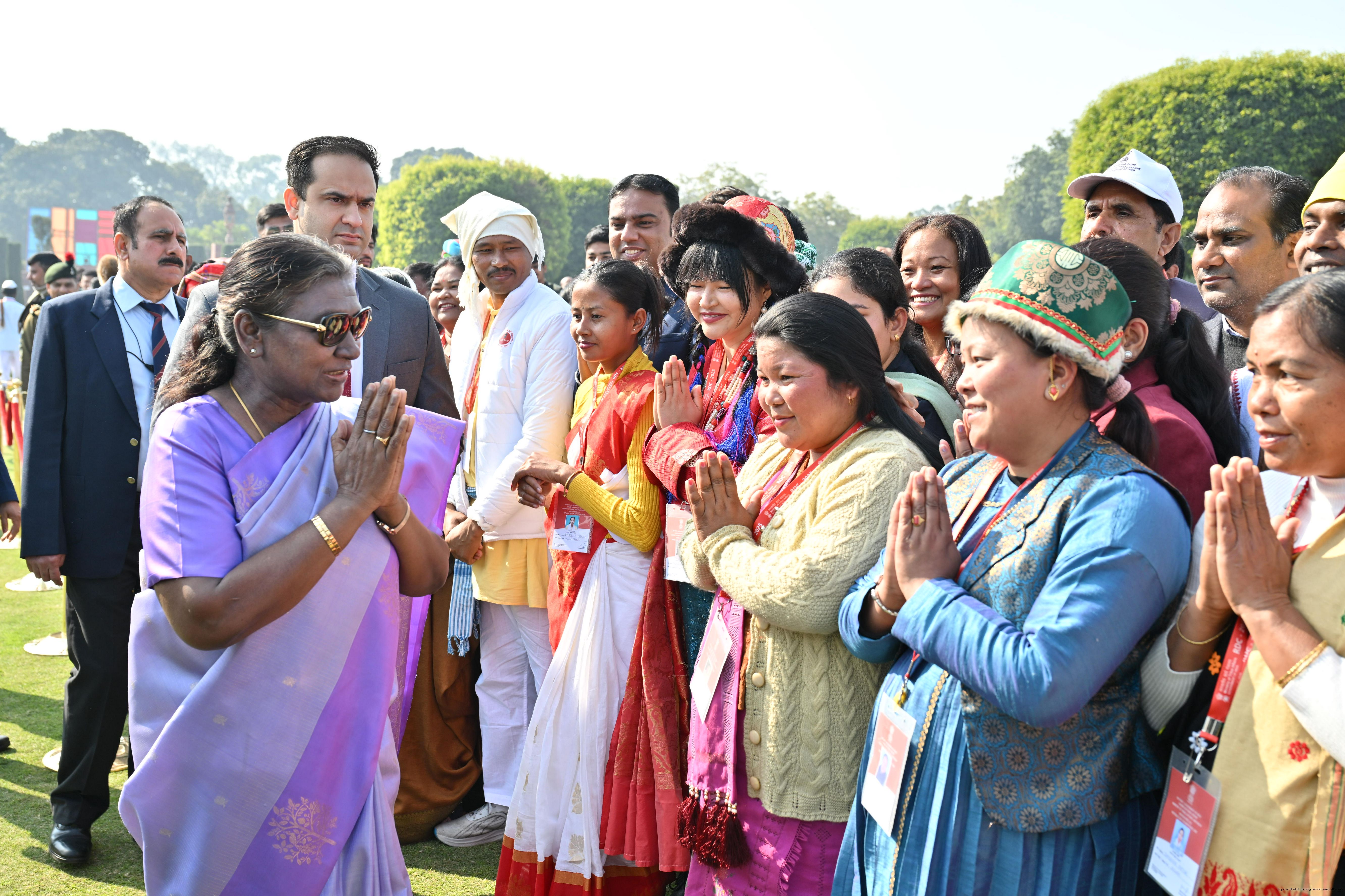 | Category: | The President met and posing a group photographs tribal guests, tableaux artistes and tractor drivers, NSS volunteers and NCC cadets, officials 28-01-2025 |