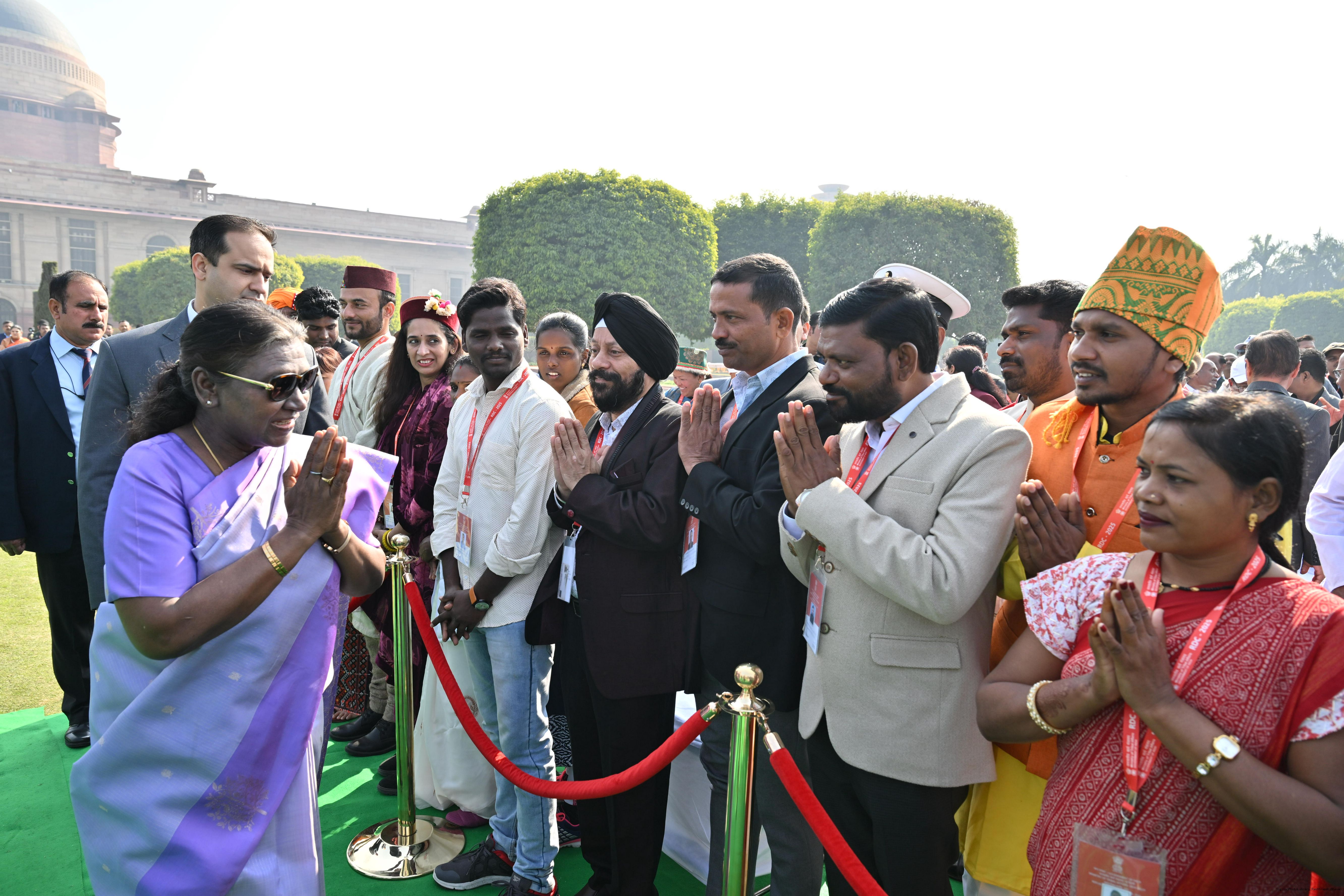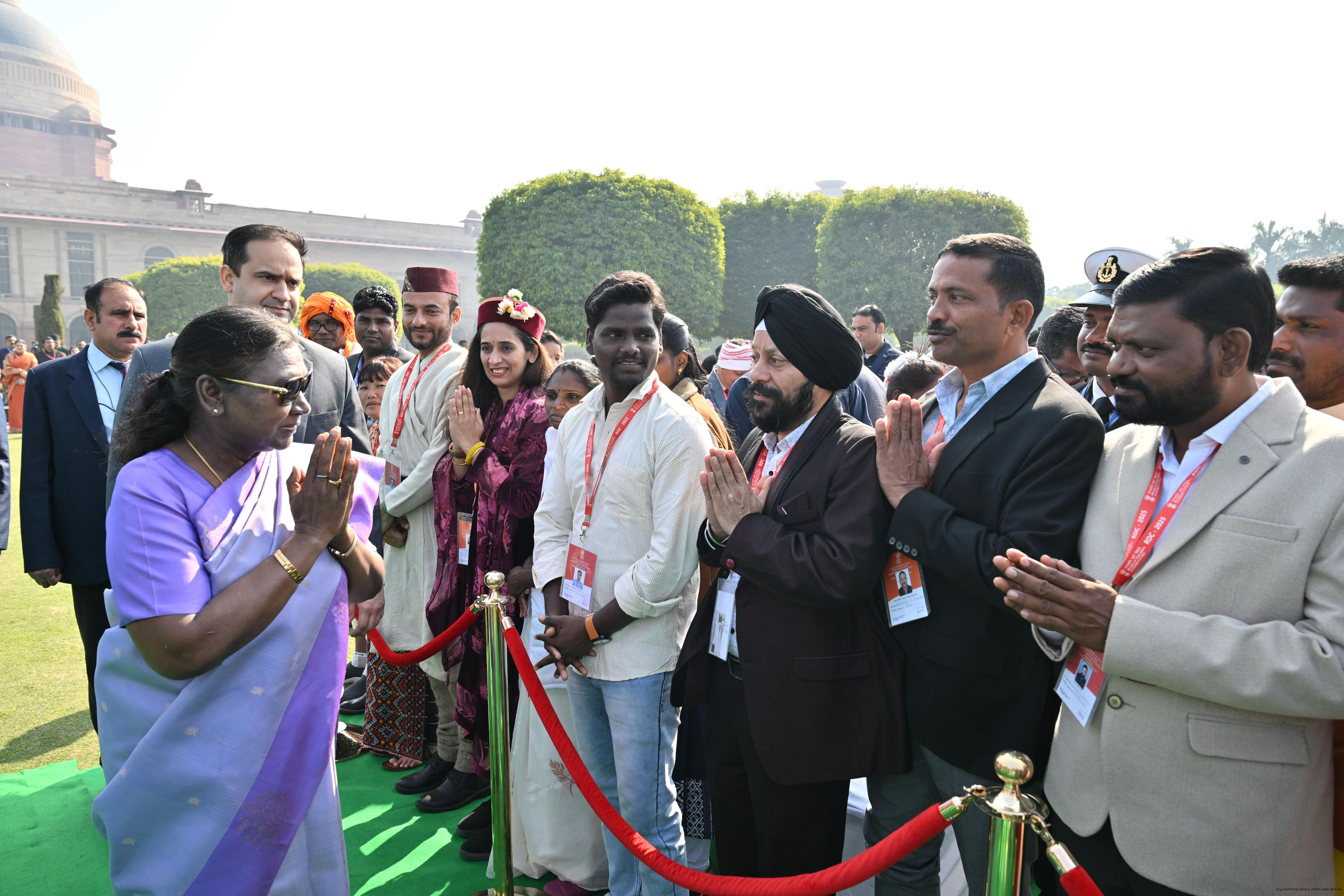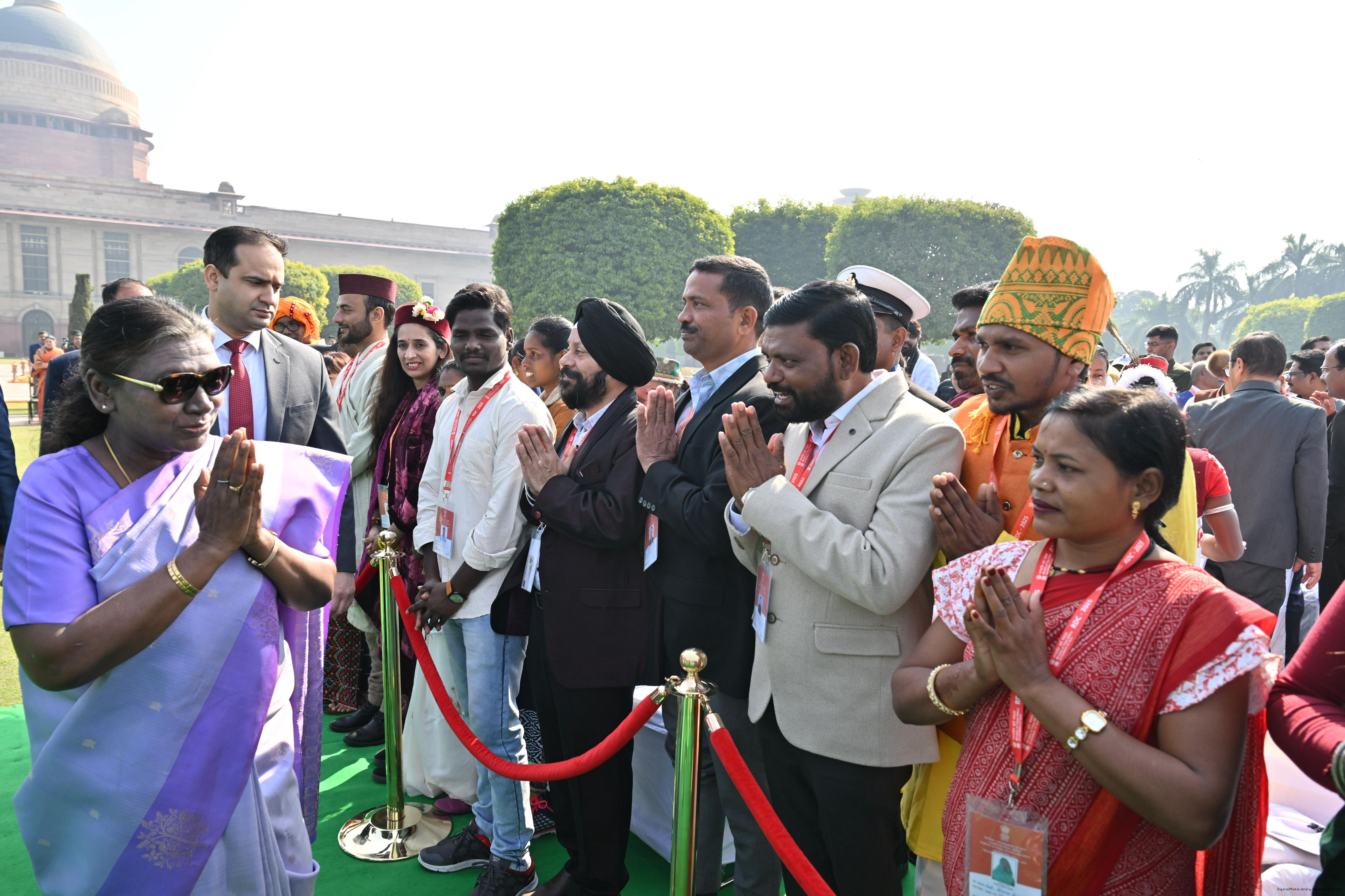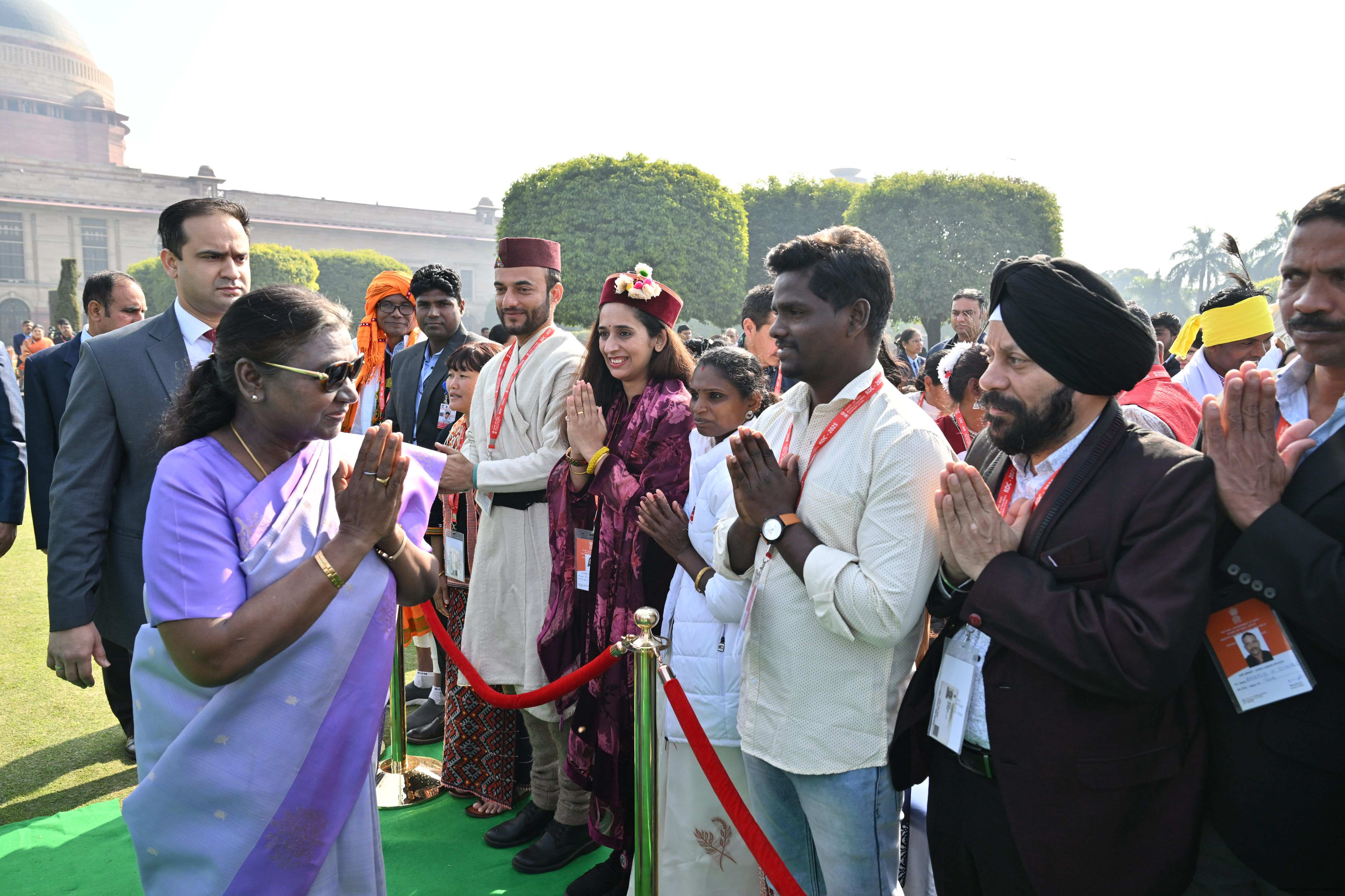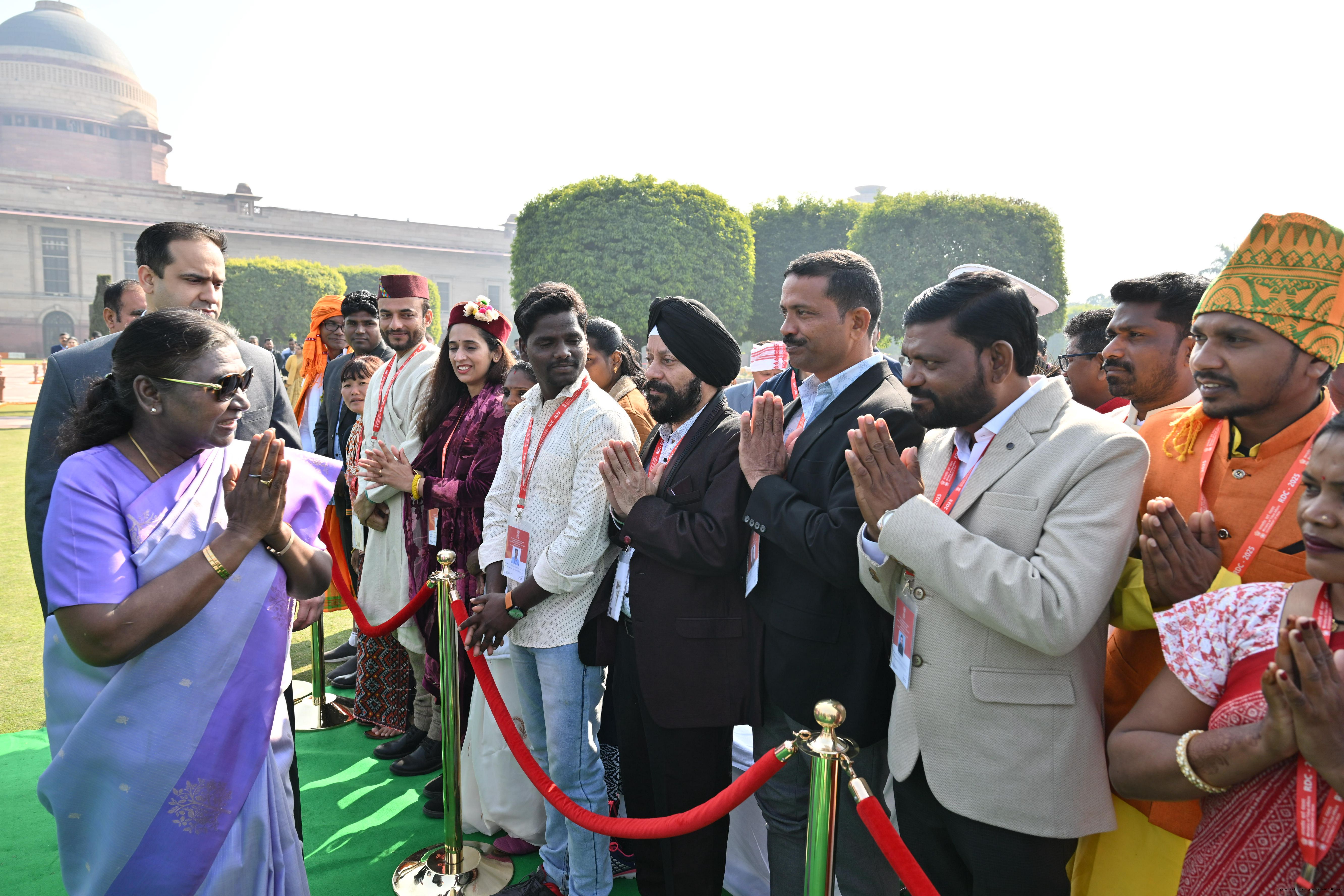 | Caption: | The President of India, Smt. Droupadi Murmu met and posing a group photographs tribal guests, tableaux artistes and tractor drivers, NSS volunteers and NCC cadets, officials and other participants of the Republic Day Parade 2025, at Rashtrapati Bhavan on January 28, 2025. |
