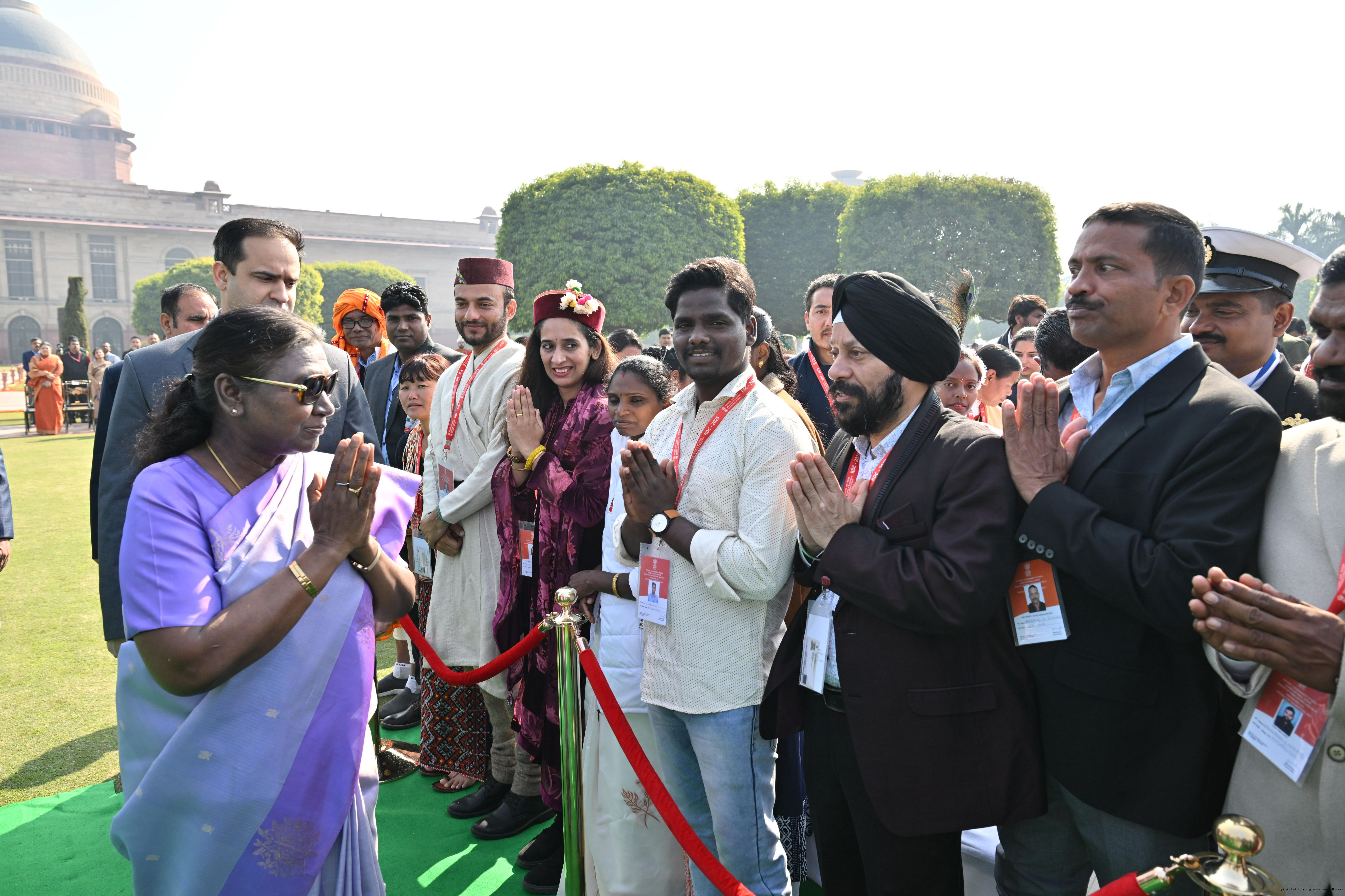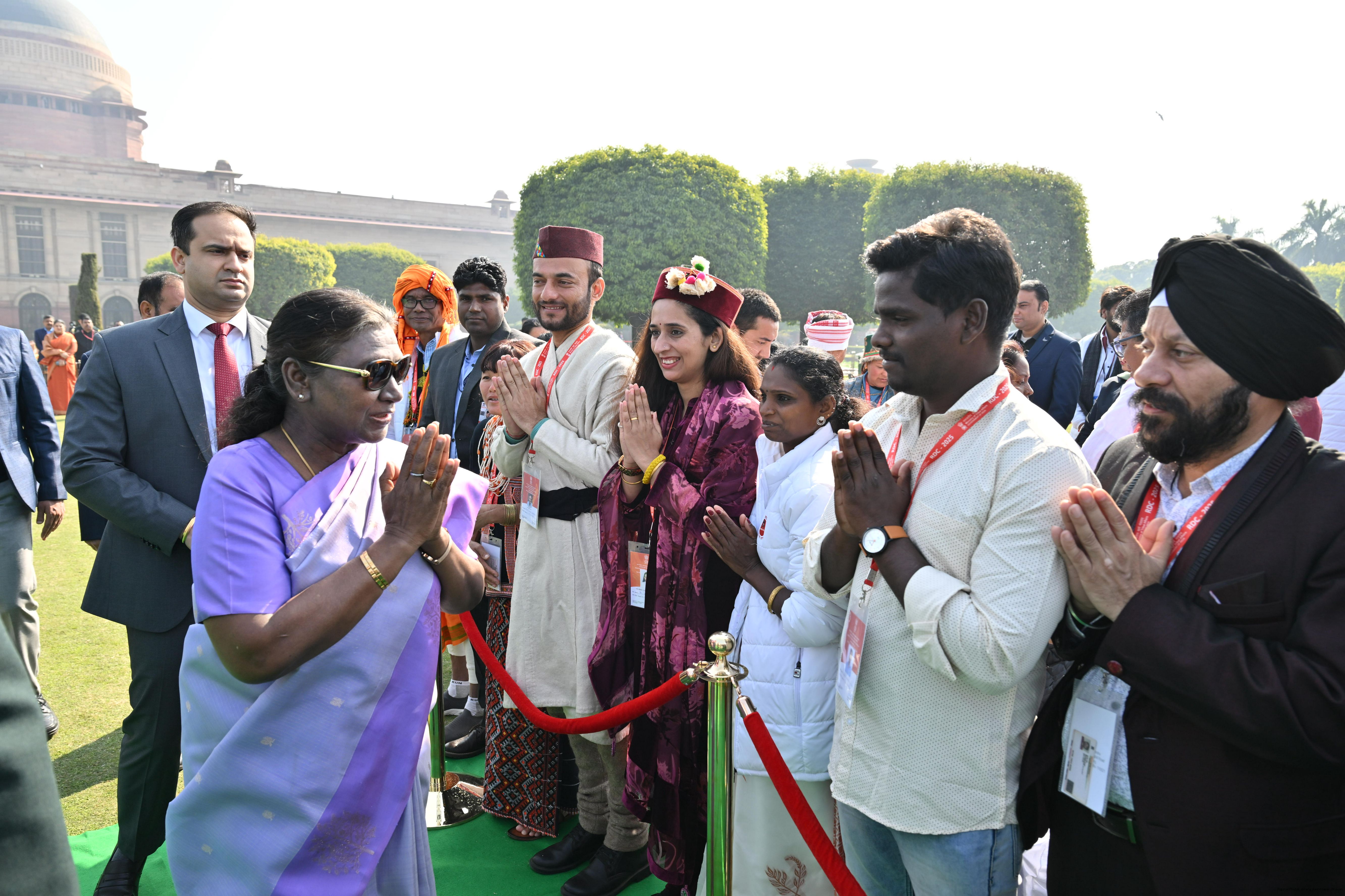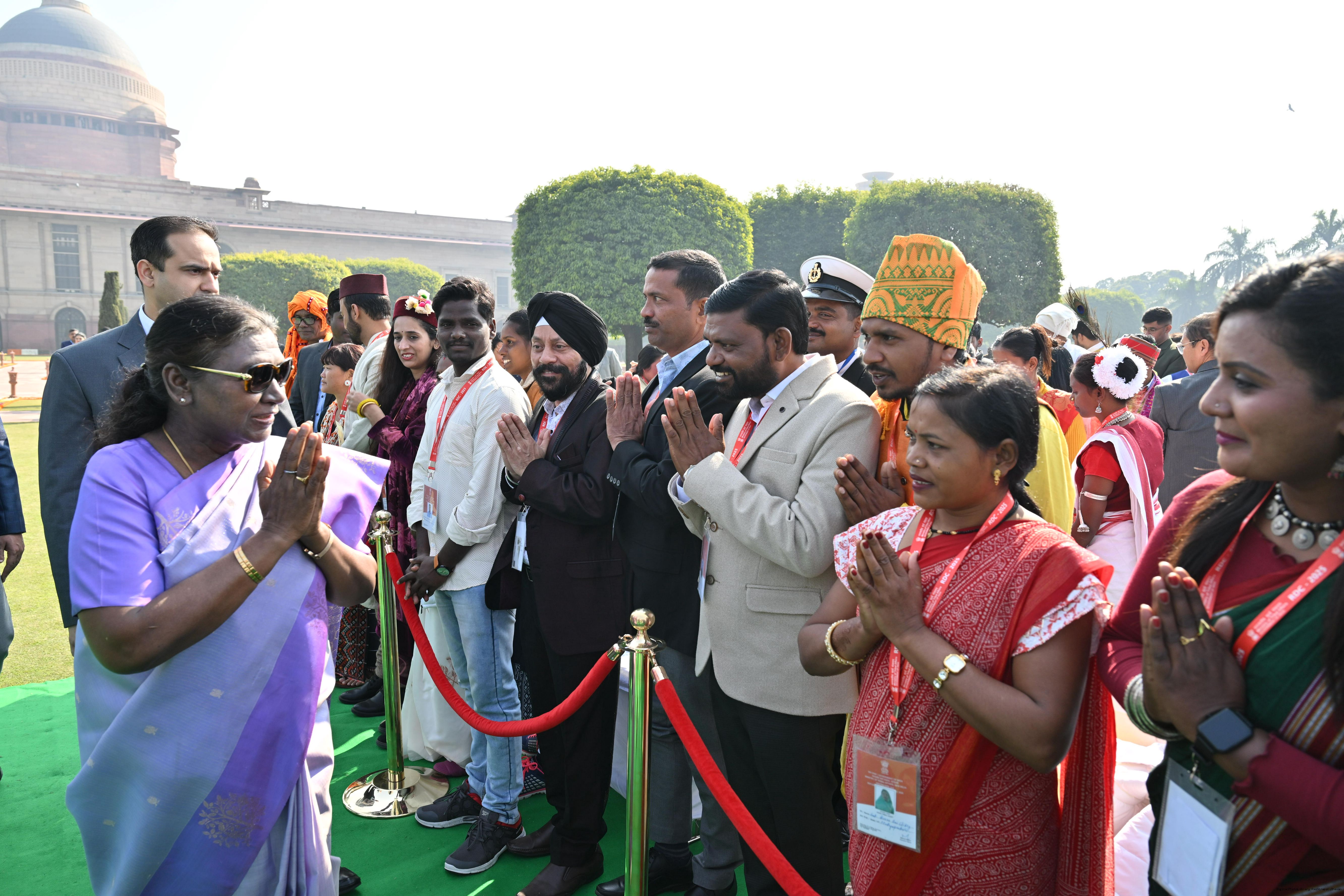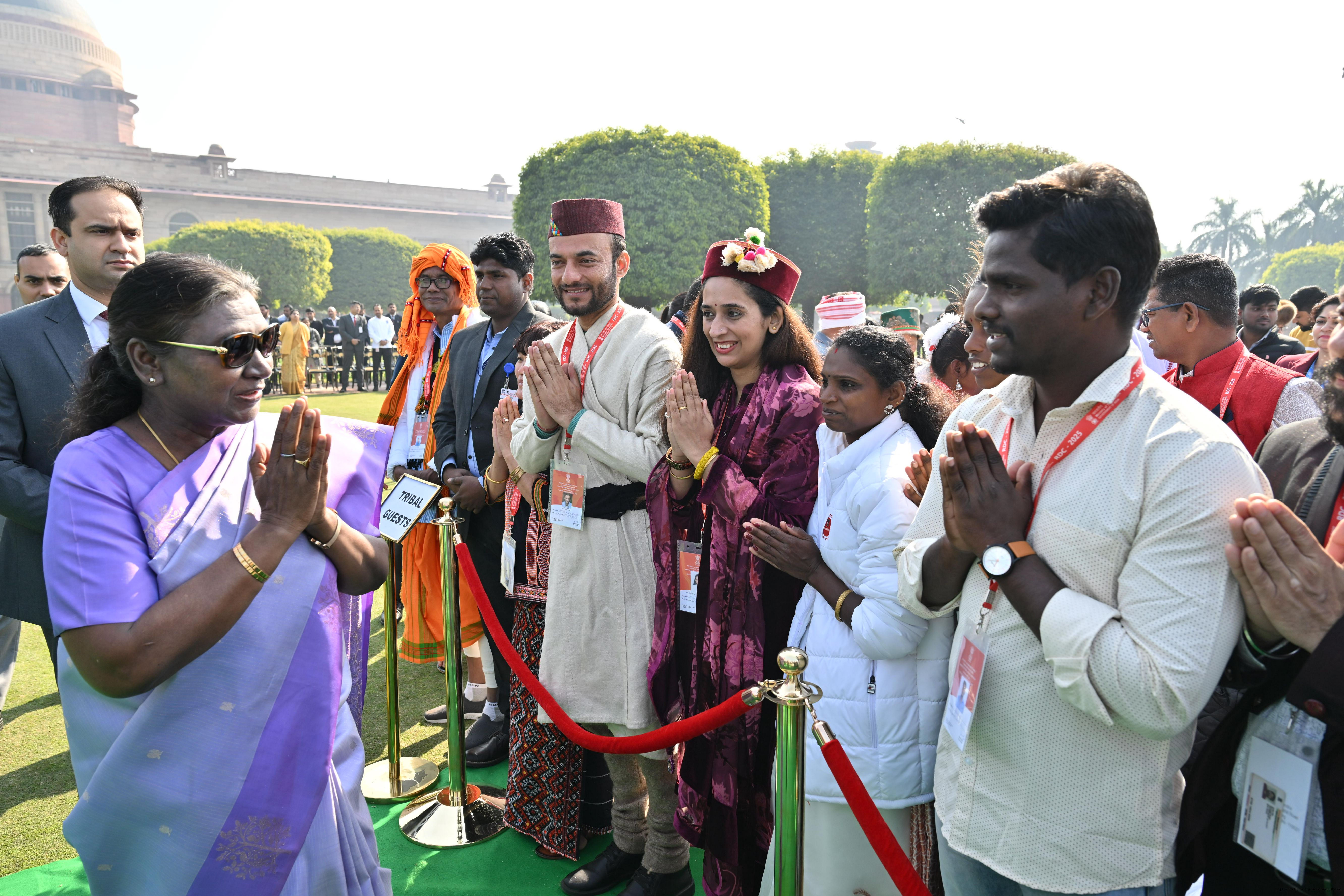 | Caption: | The President of India, Smt. Droupadi Murmu met and posing a group photographs tribal guests, tableaux artistes and tractor drivers, NSS volunteers and NCC cadets, officials and other participants of the Republic Day Parade 2025, at Rashtrapati Bhavan on January 28, 2025. |