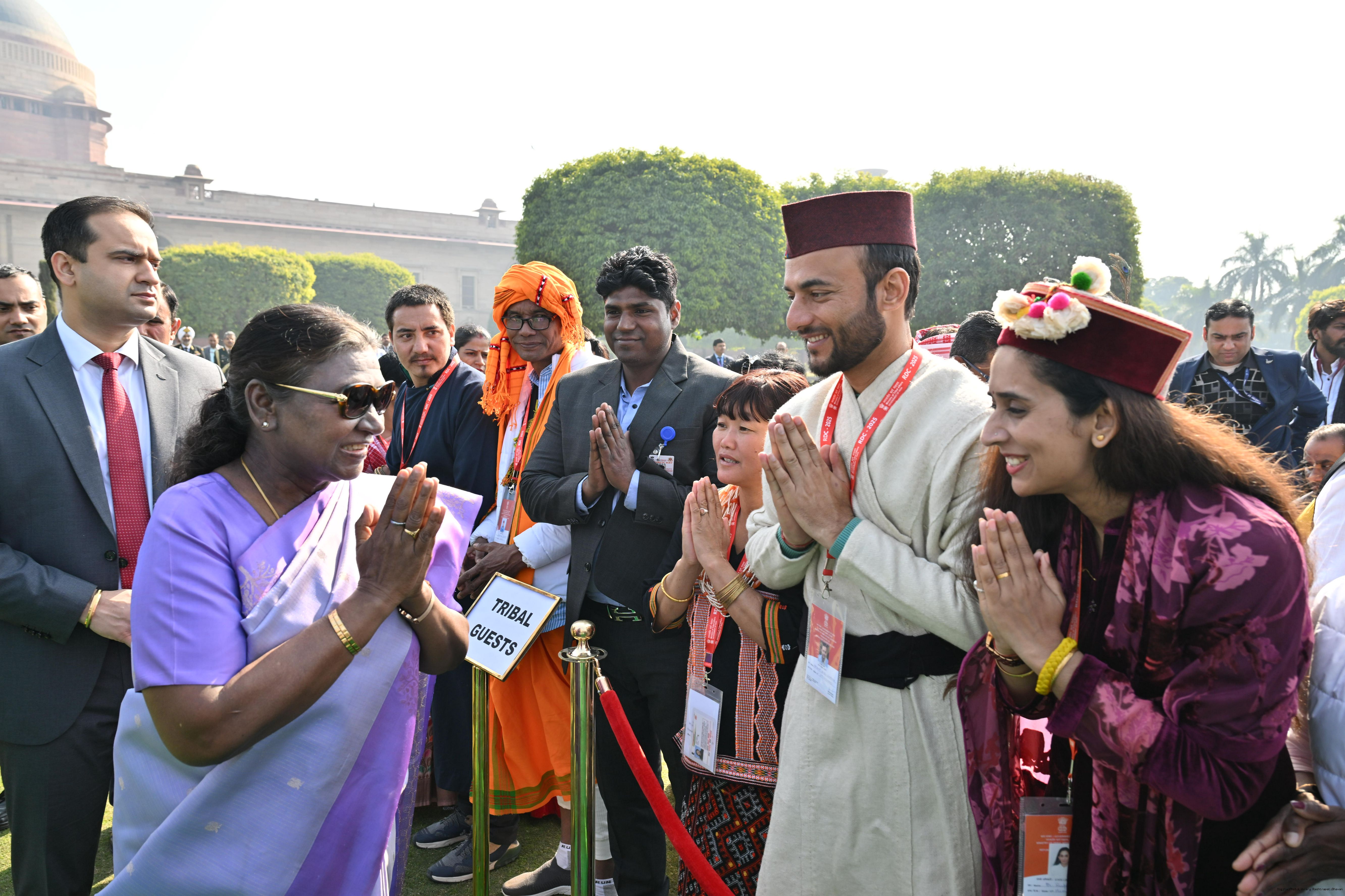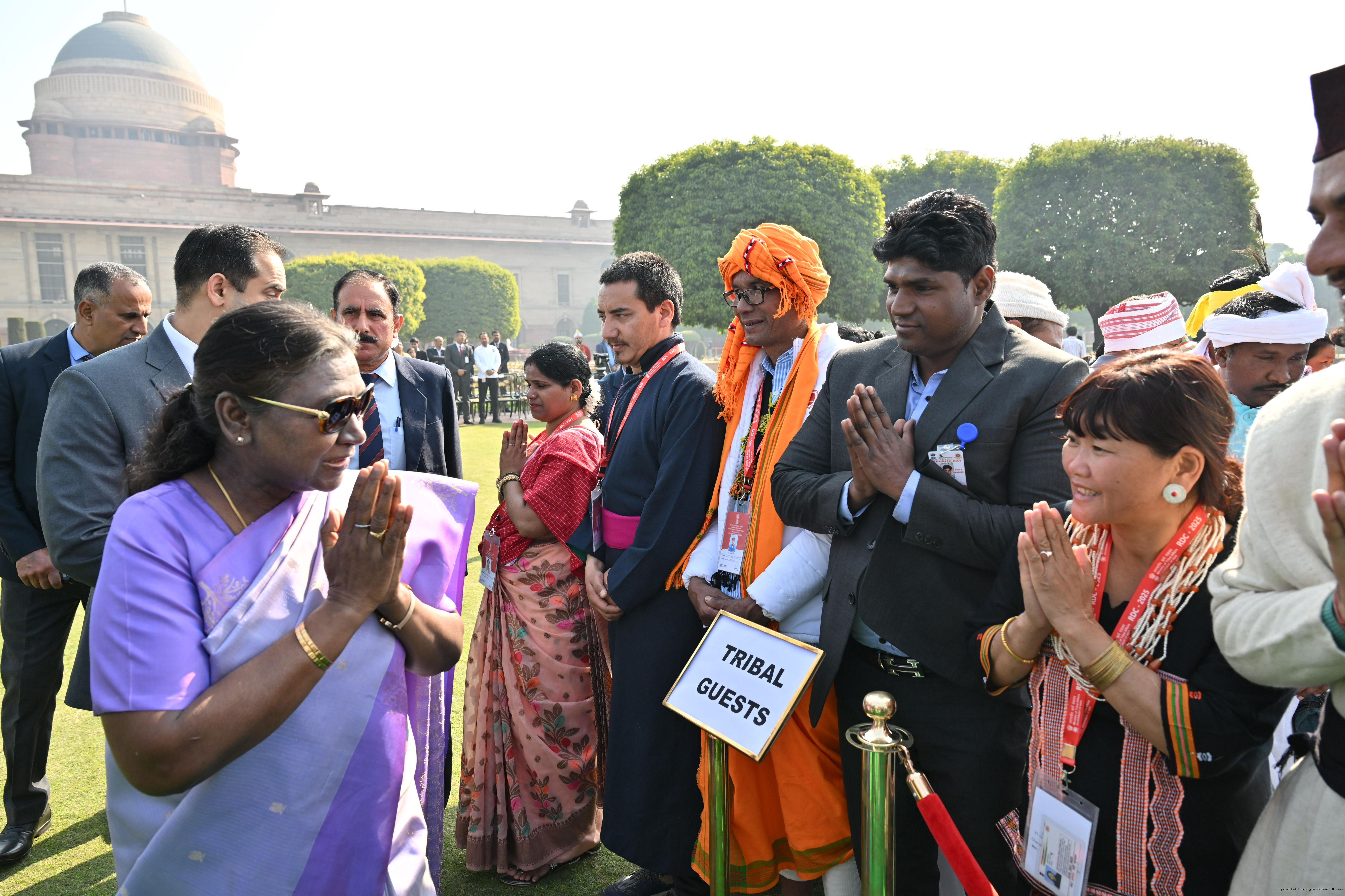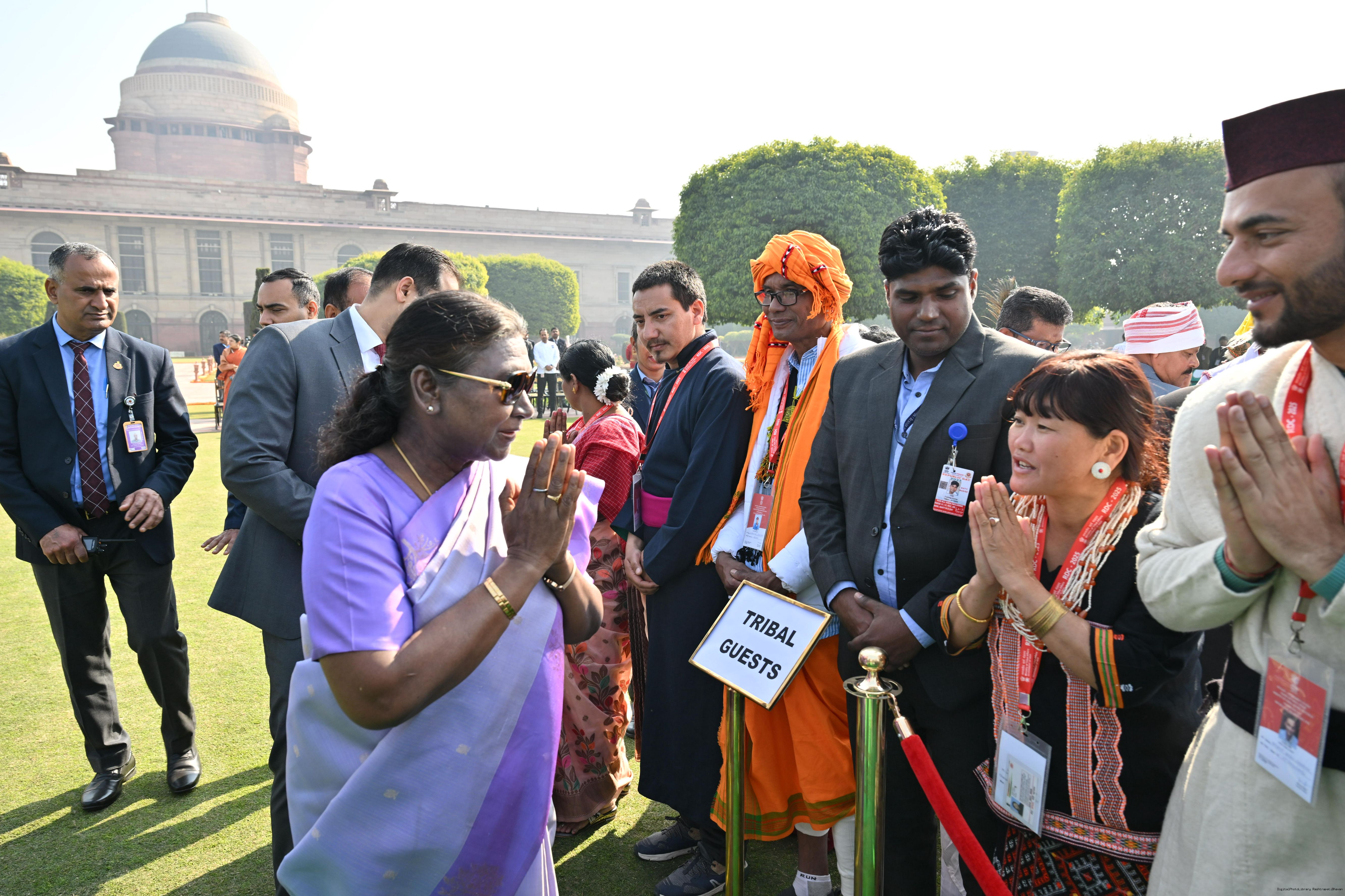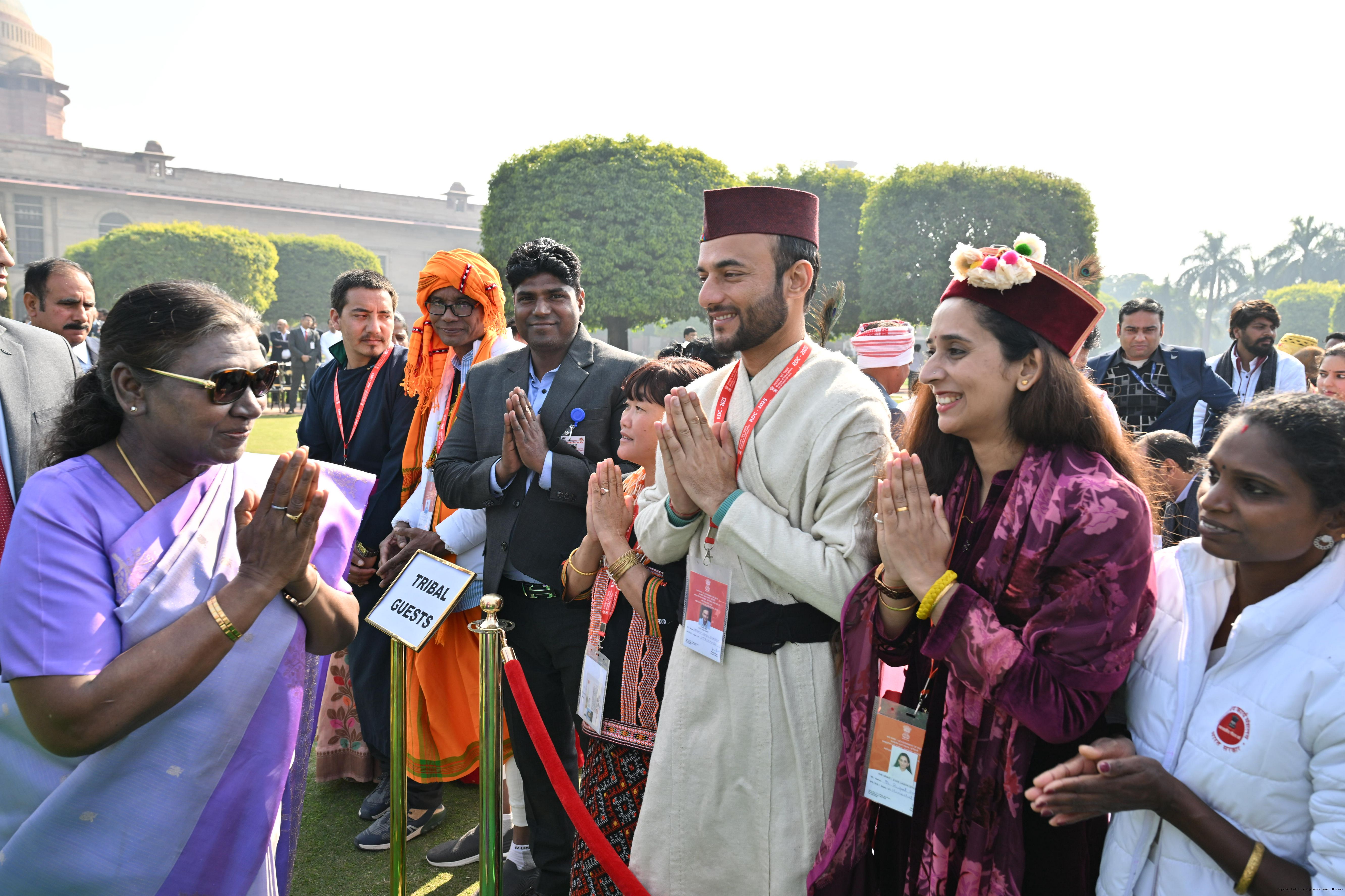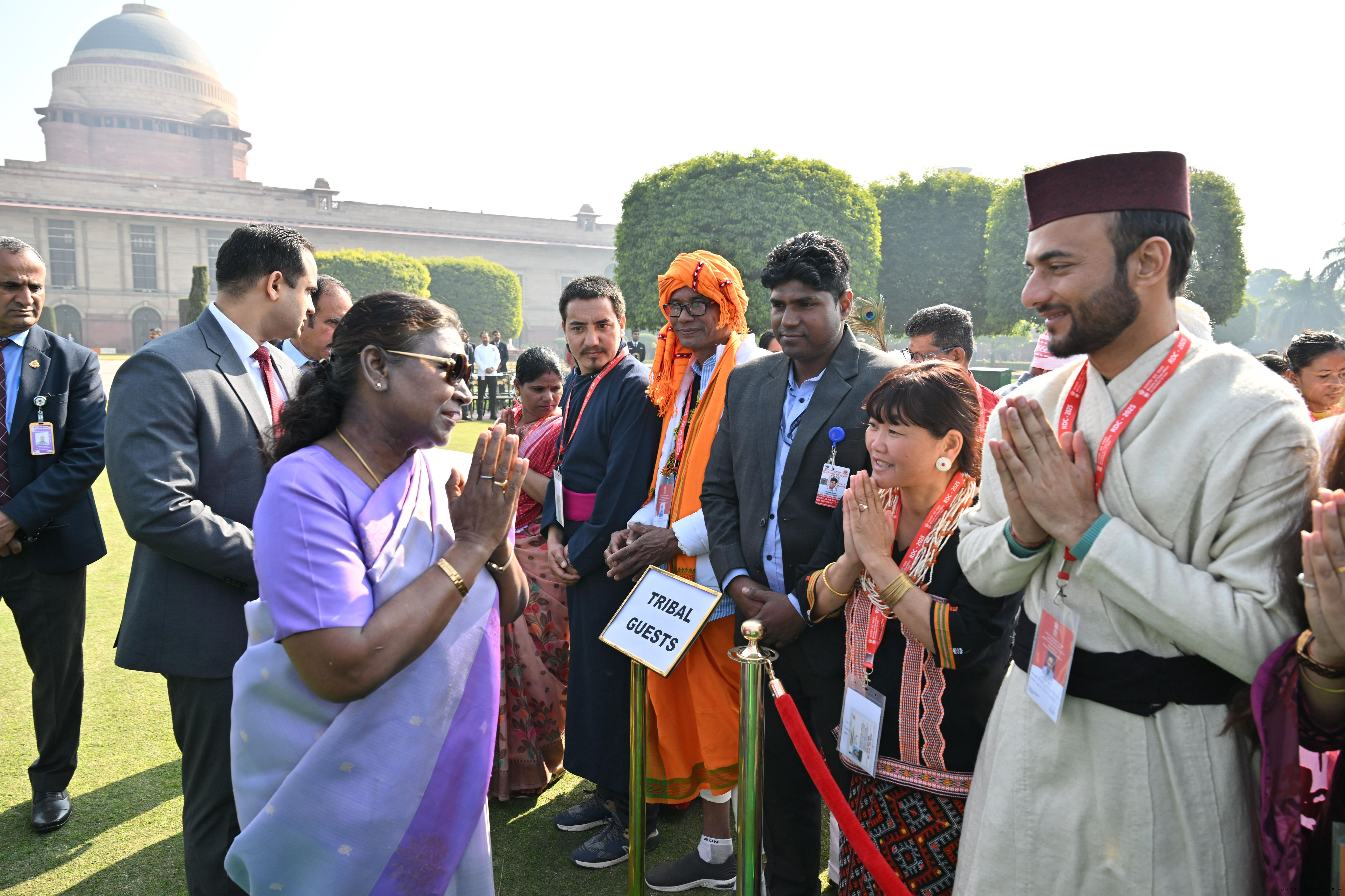 | Caption: | The President of India, Smt. Droupadi Murmu met and posing a group photographs tribal guests, tableaux artistes and tractor drivers, NSS volunteers and NCC cadets, officials and other participants of the Republic Day Parade 2025, at Rashtrapati Bhavan on January 28, 2025. |