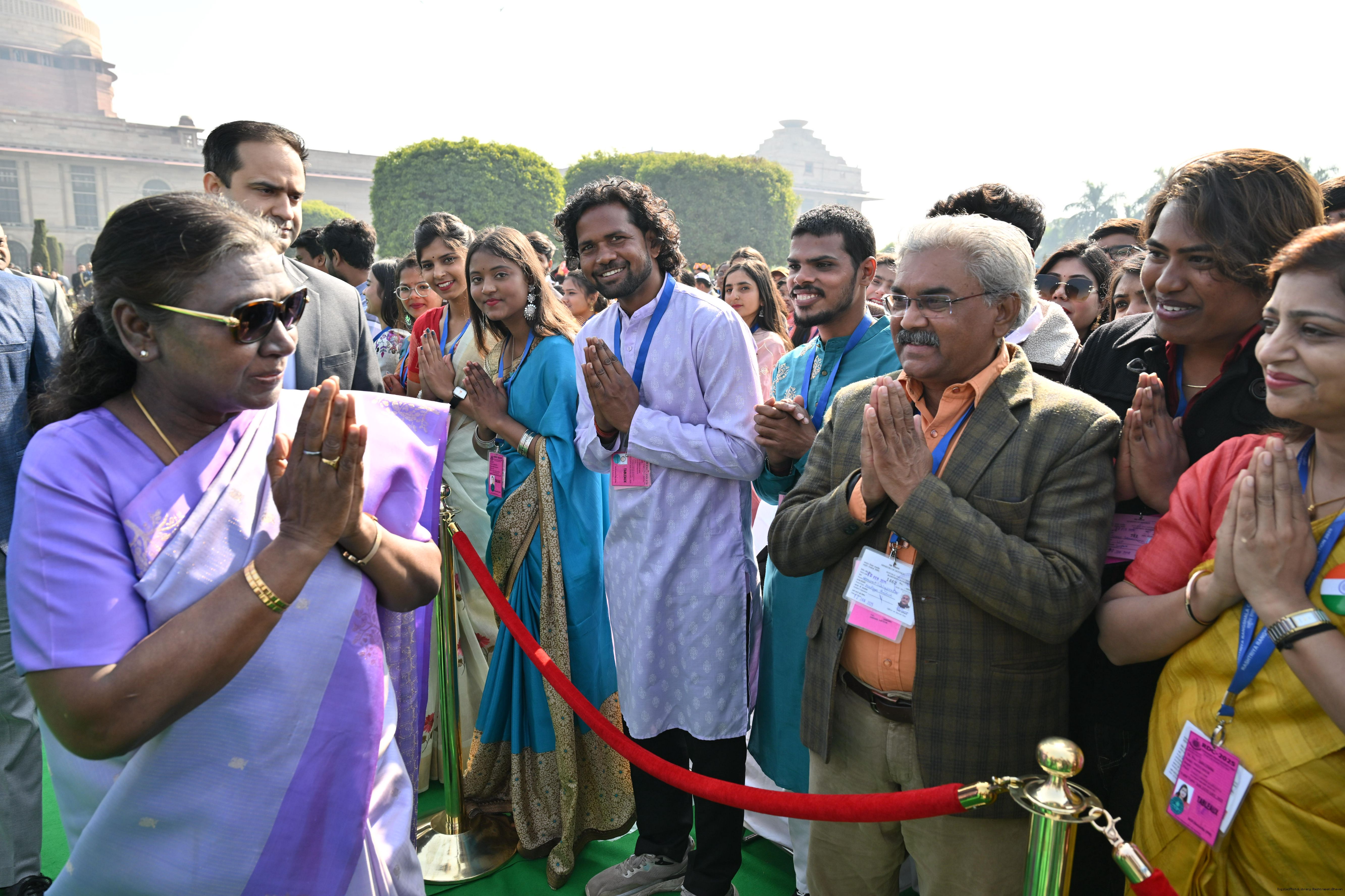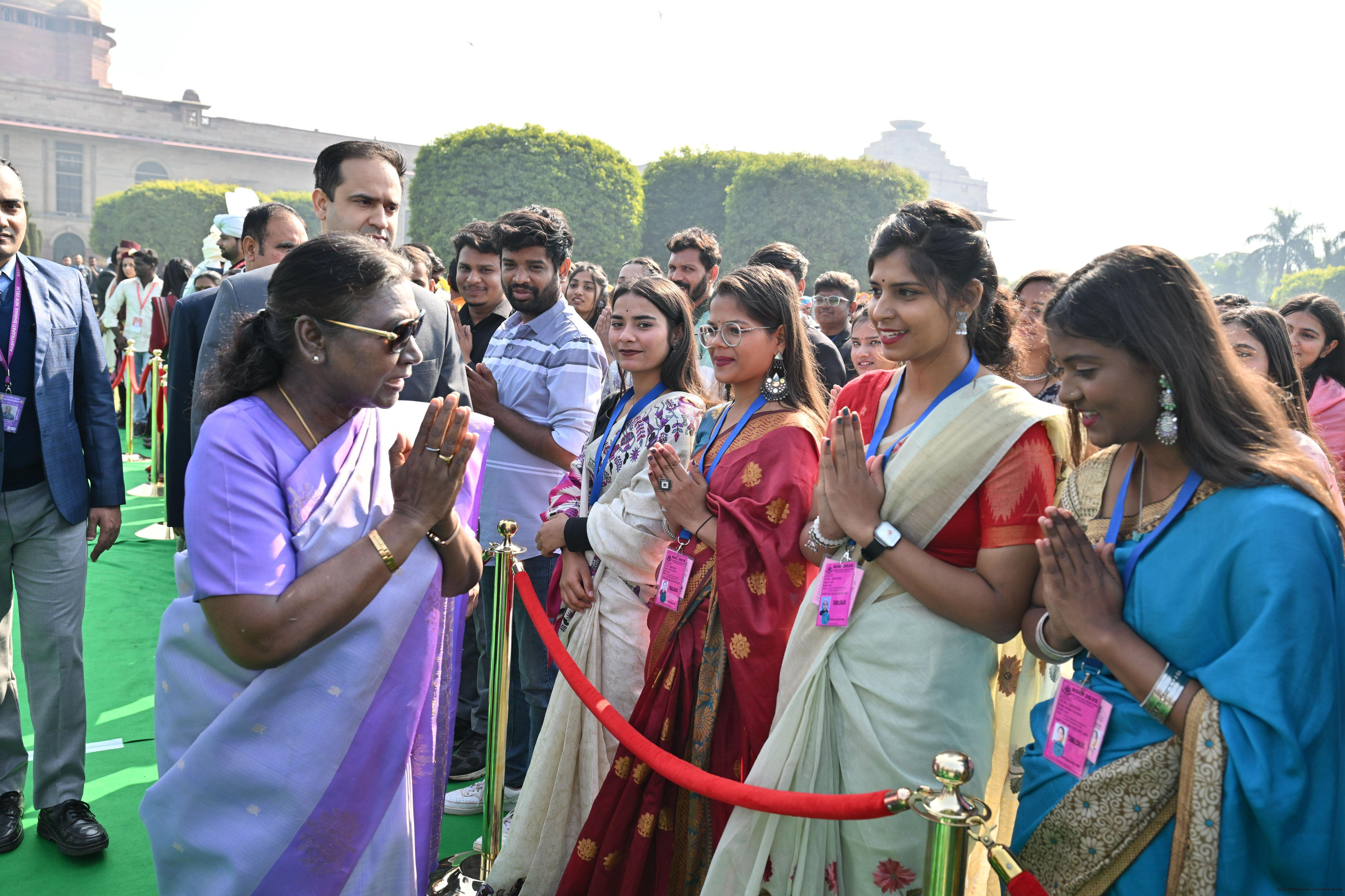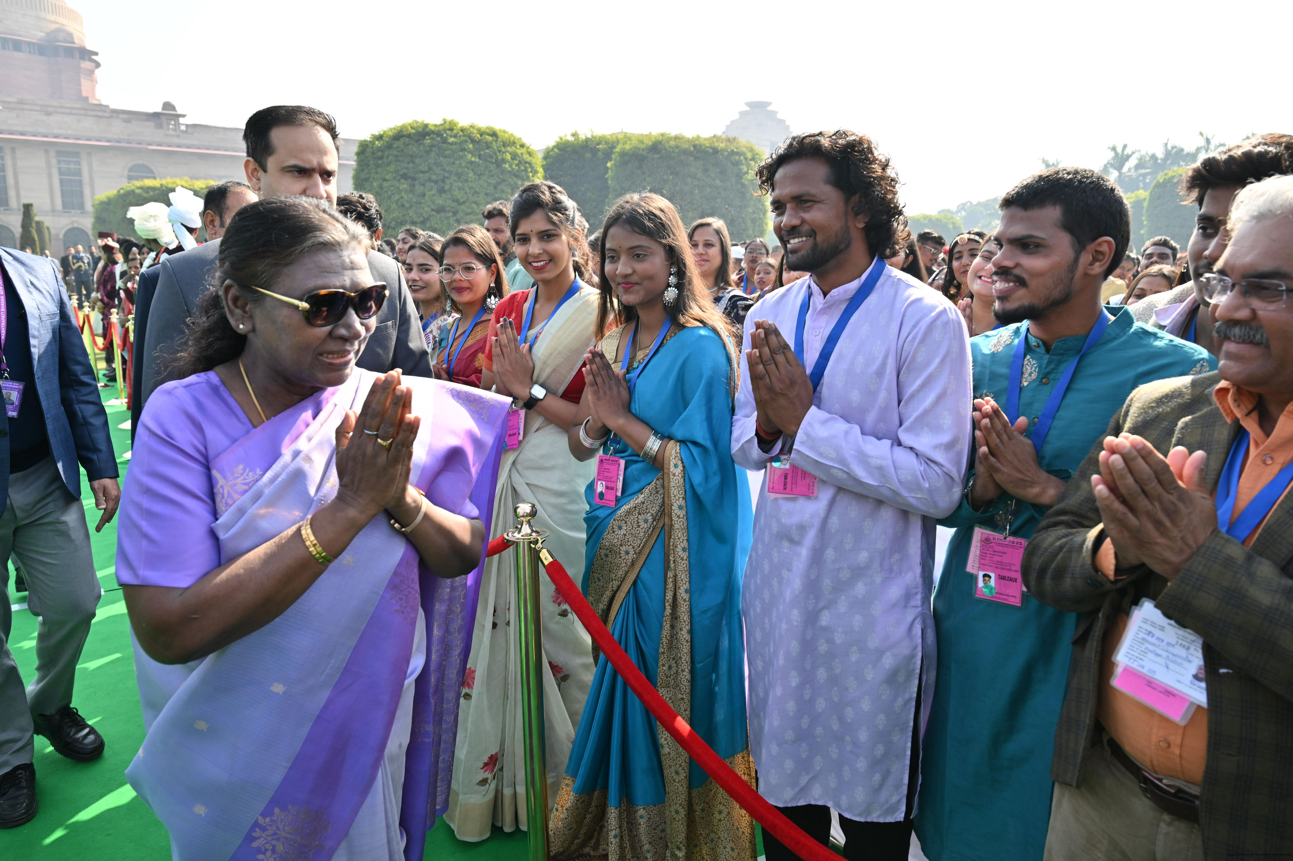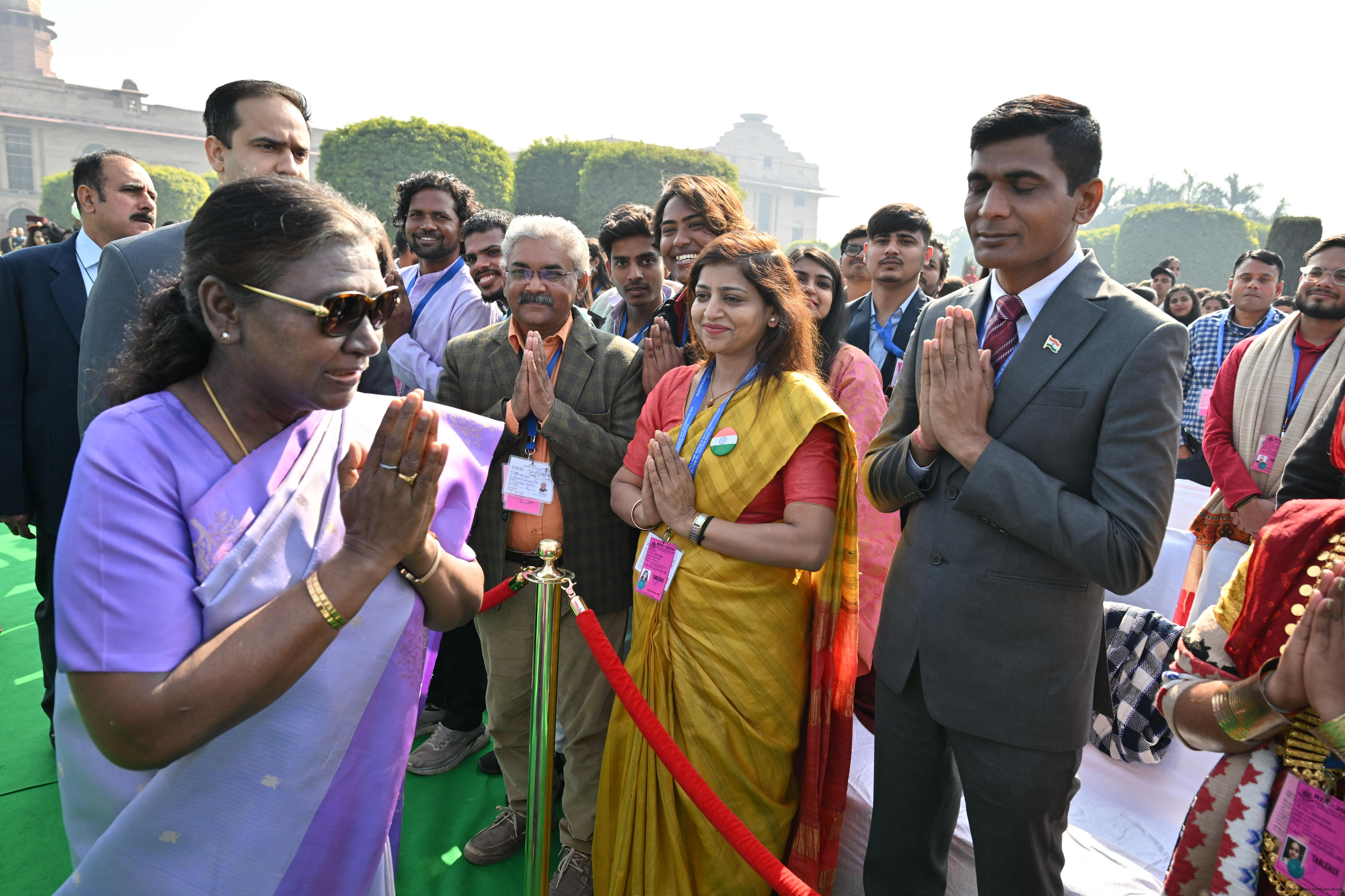 | Caption: | The President of India, Smt. Droupadi Murmu met and posing a group photographs tribal guests, tableaux artistes and tractor drivers, NSS volunteers and NCC cadets, officials and other participants of the Republic Day Parade 2025, at Rashtrapati Bhavan on January 28, 2025. |