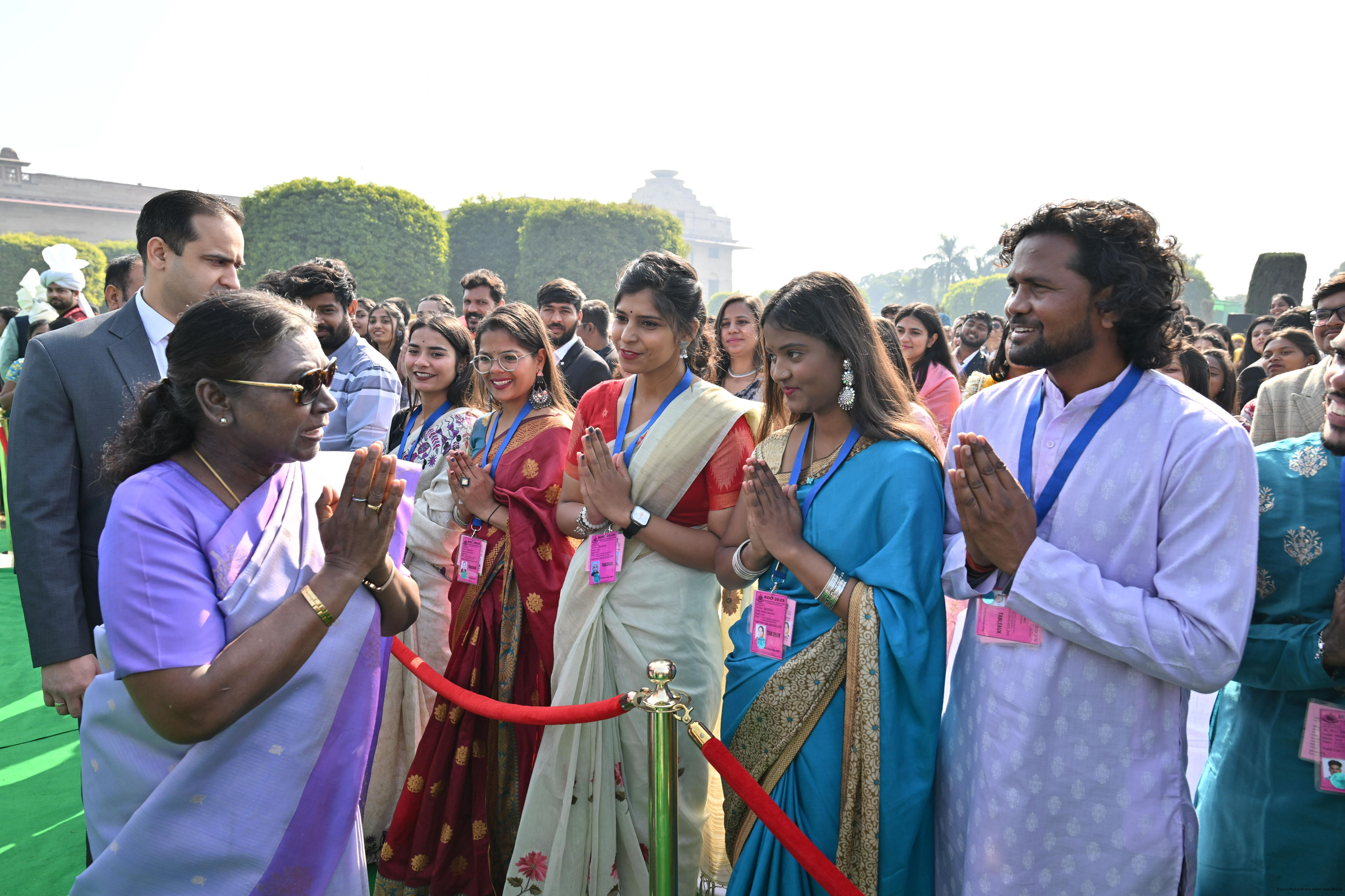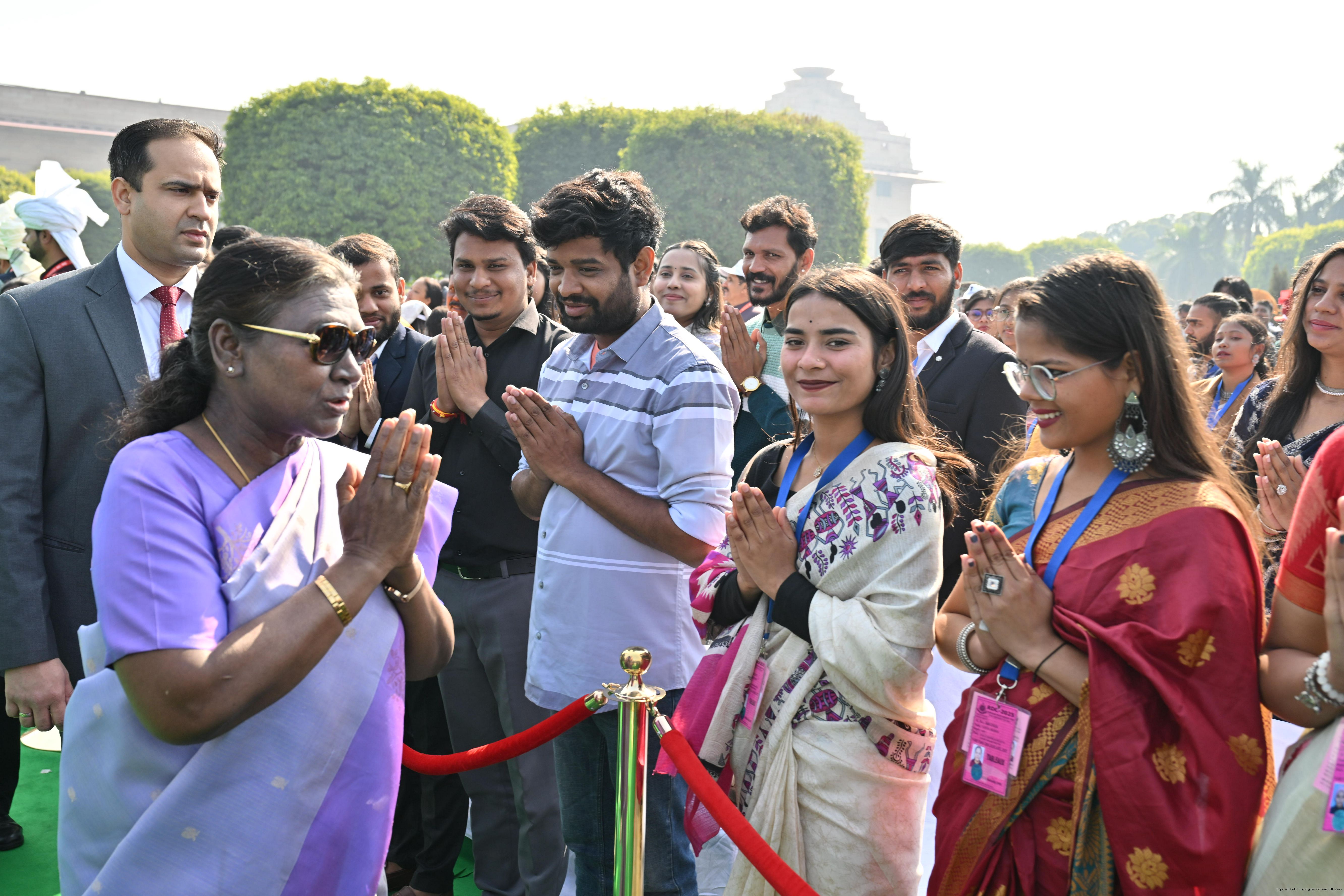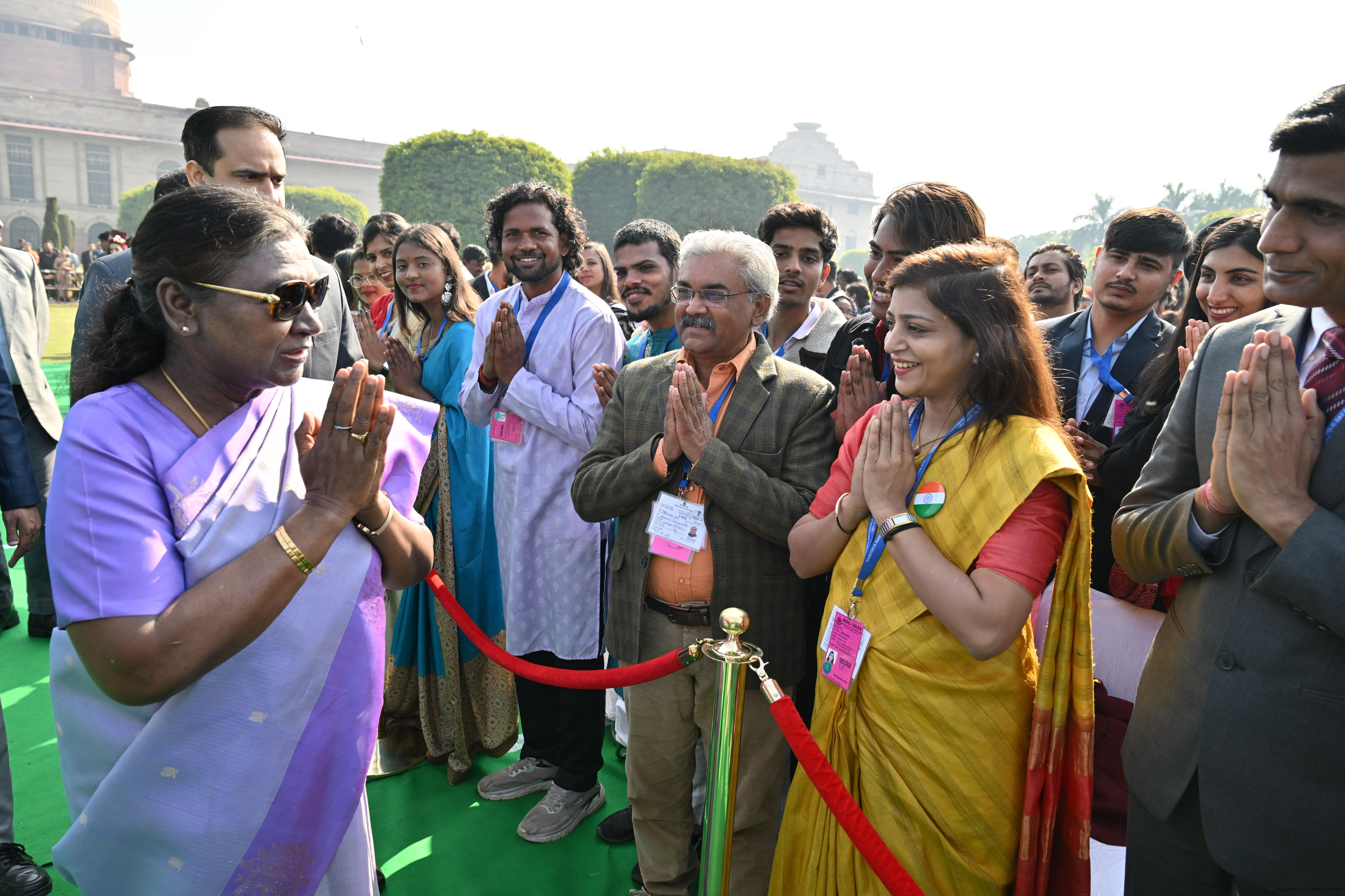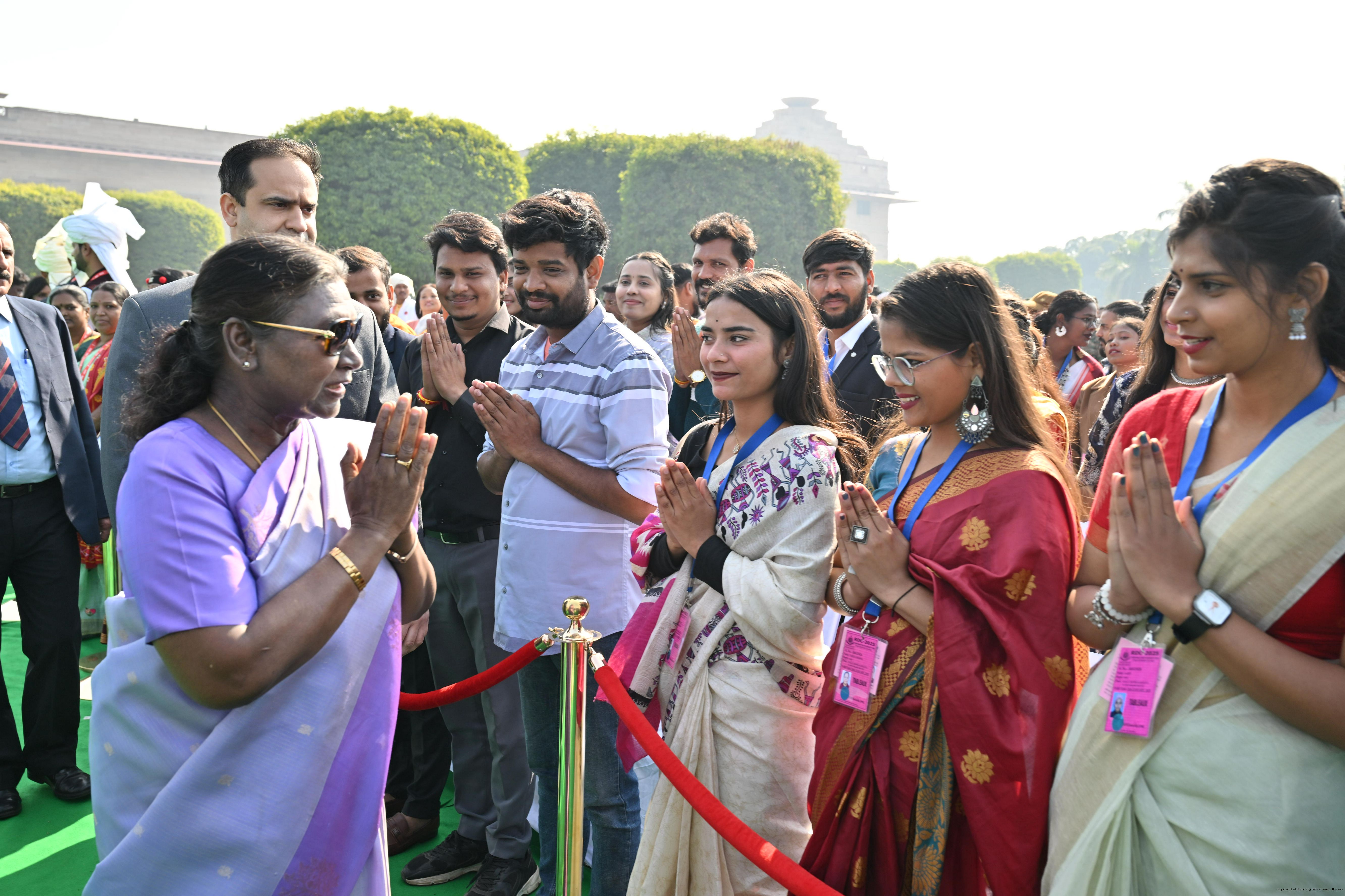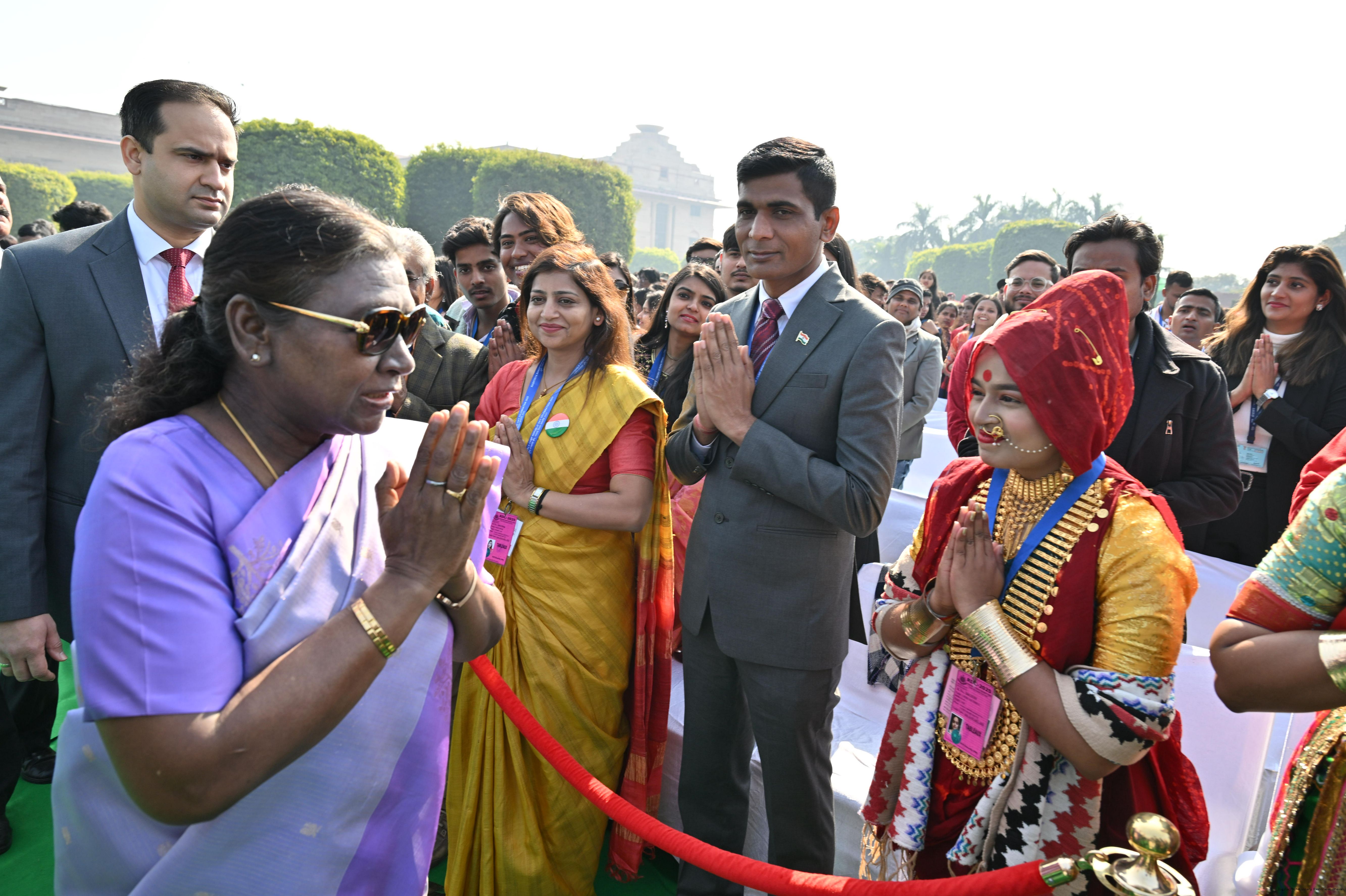 | Caption: | The President of India, Smt. Droupadi Murmu met and posing a group photographs tribal guests, tableaux artistes and tractor drivers, NSS volunteers and NCC cadets, officials and other participants of the Republic Day Parade 2025, at Rashtrapati Bhavan on January 28, 2025. |