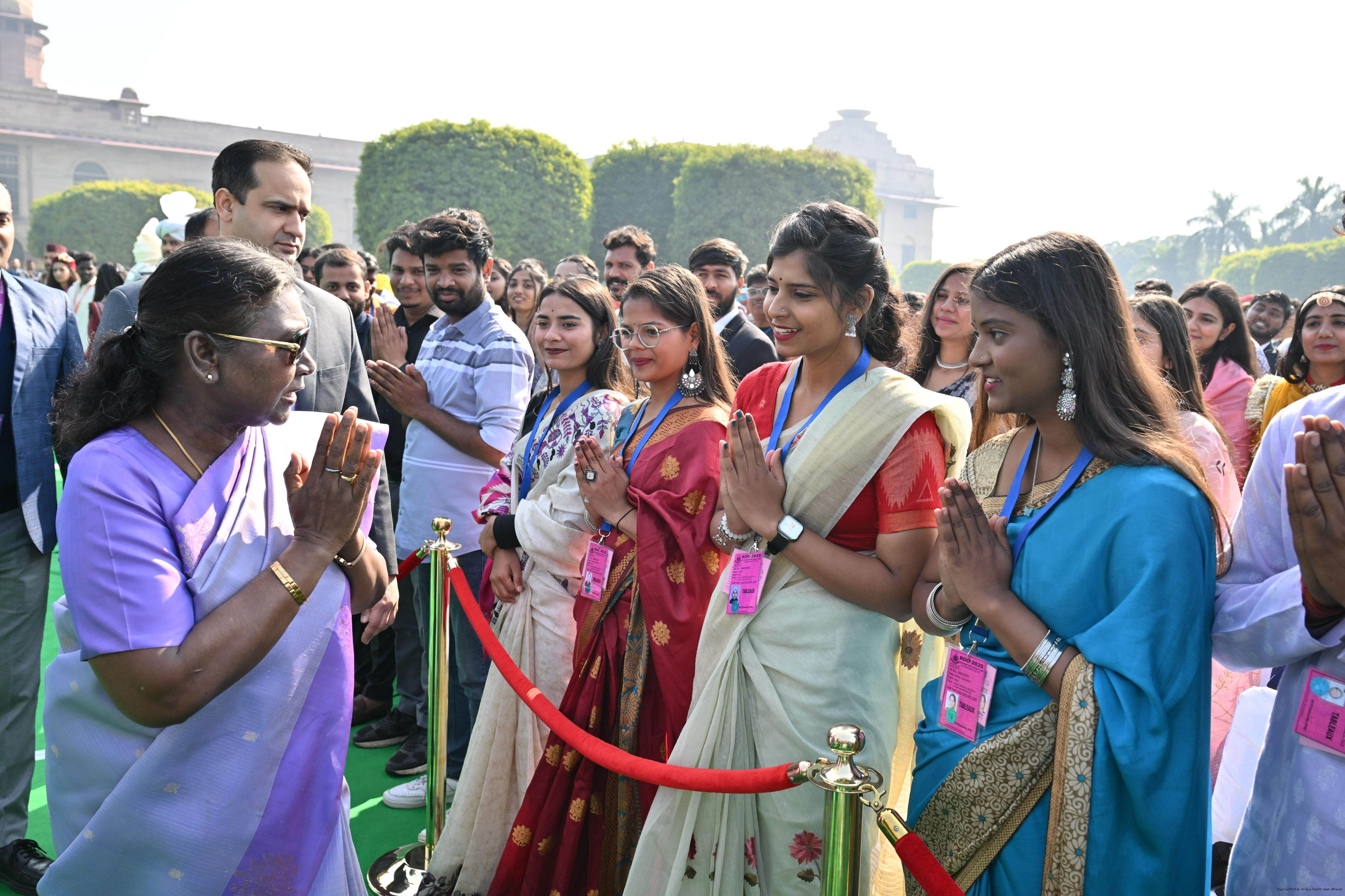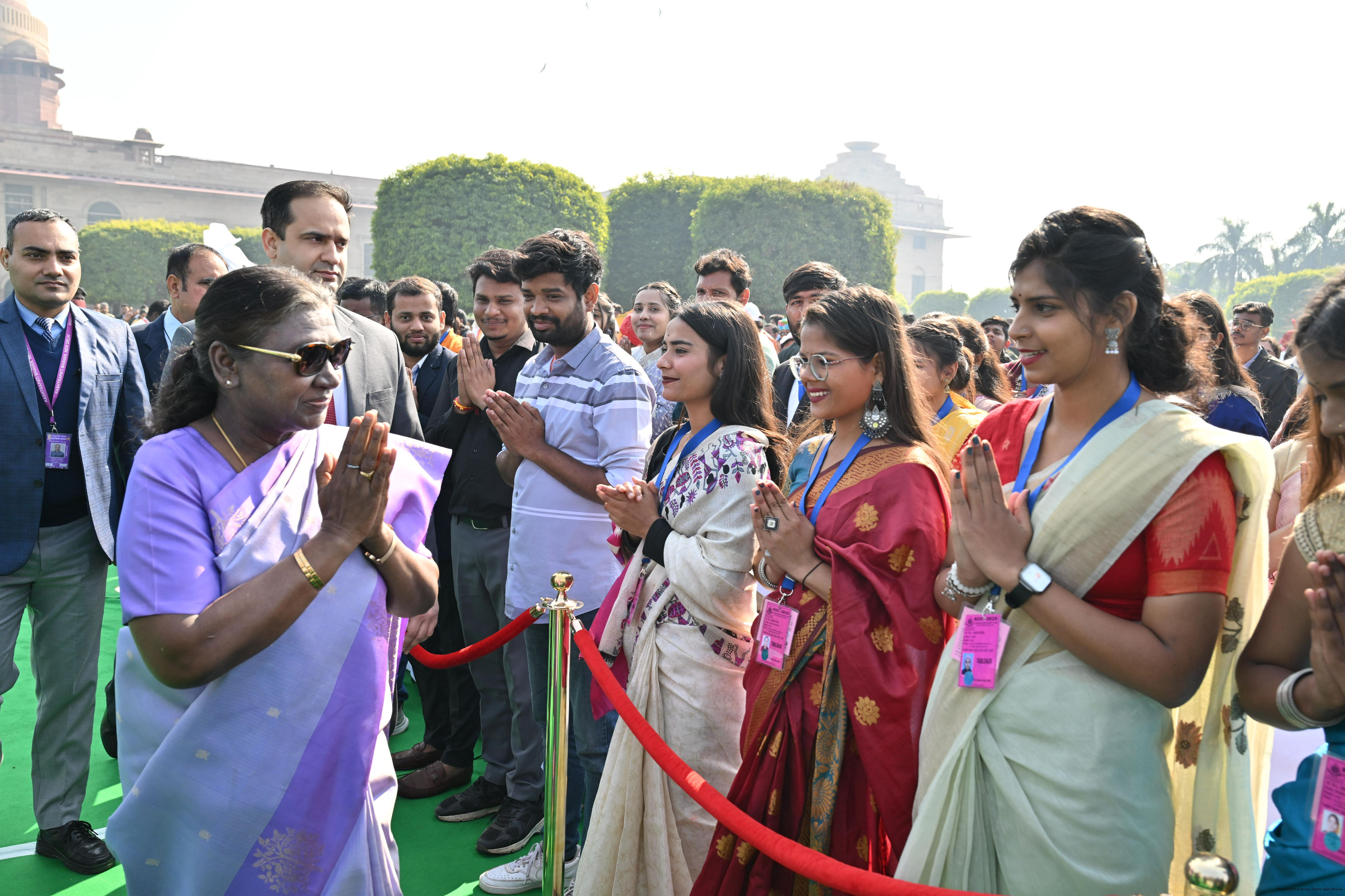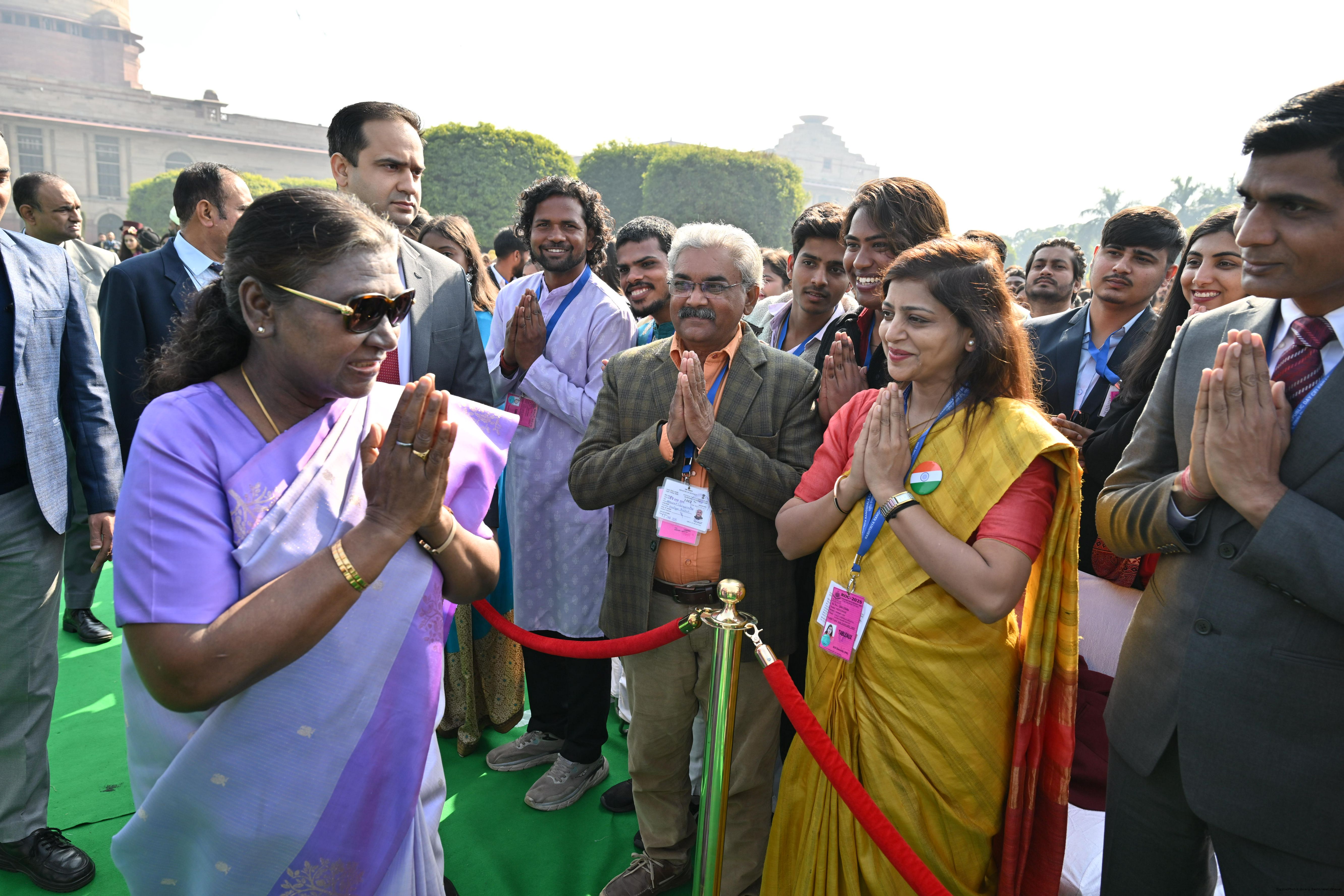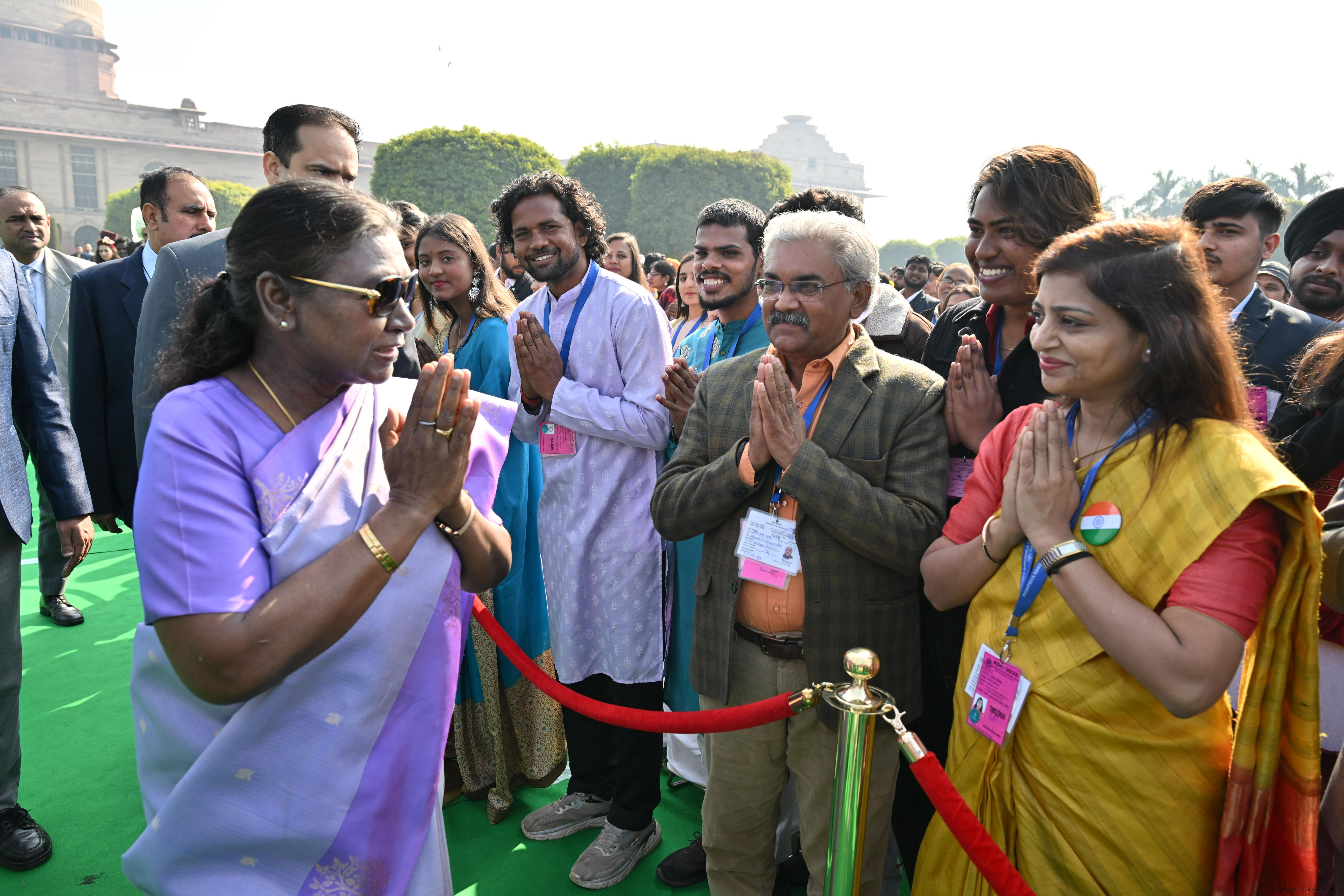 | Caption: | The President of India, Smt. Droupadi Murmu met and posing a group photographs tribal guests, tableaux artistes and tractor drivers, NSS volunteers and NCC cadets, officials and other participants of the Republic Day Parade 2025, at Rashtrapati Bhavan on January 28, 2025. |
