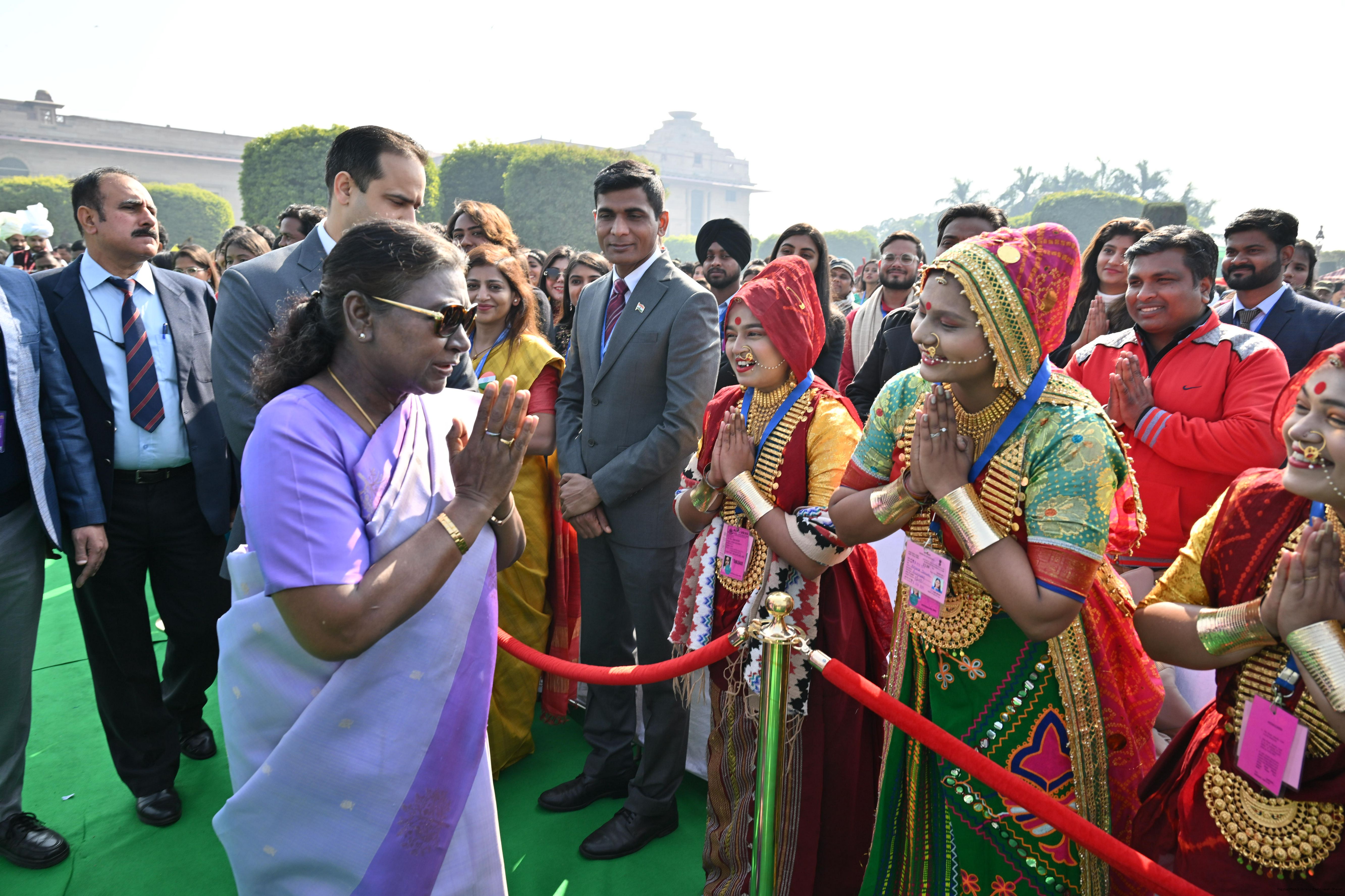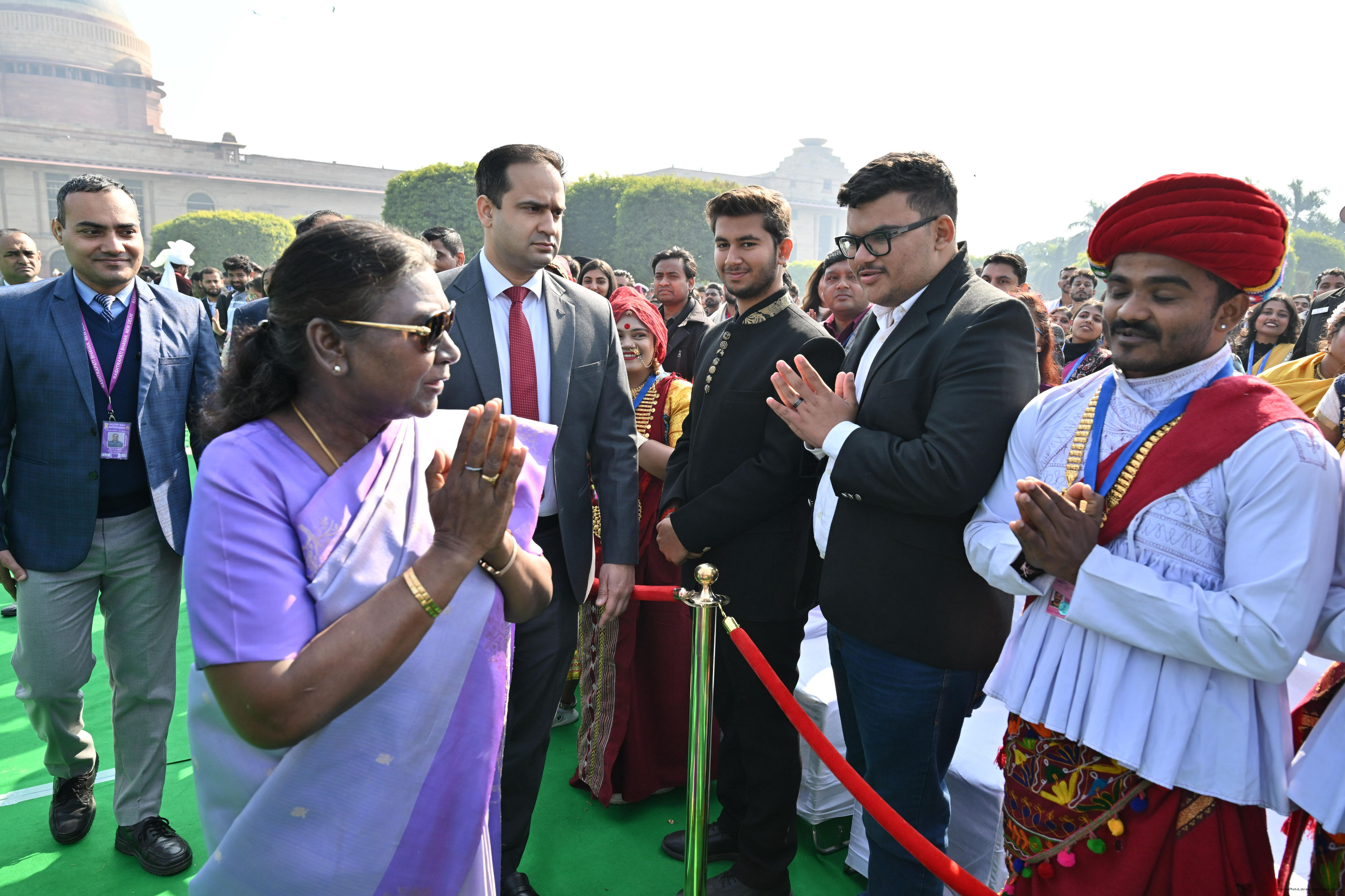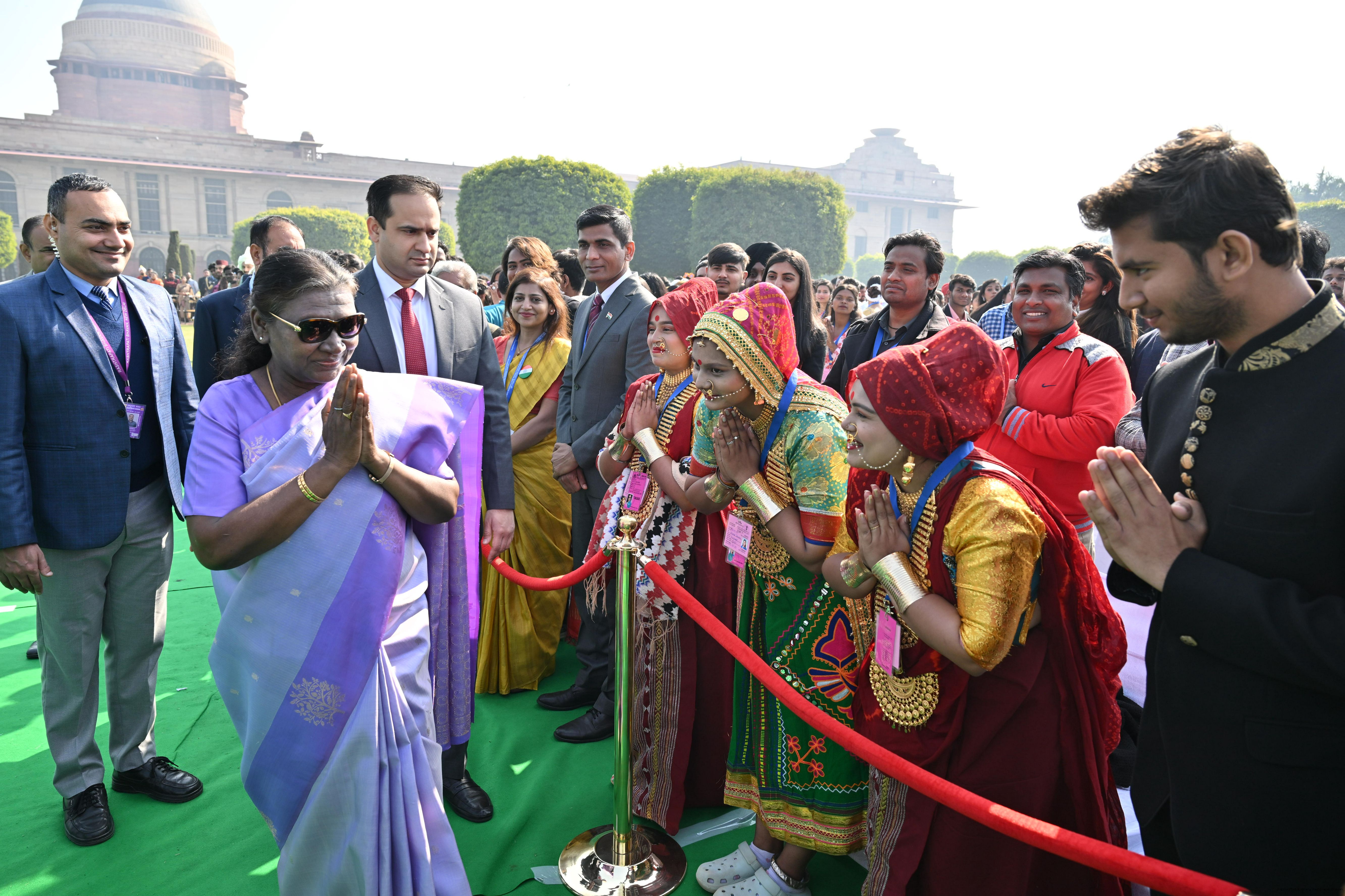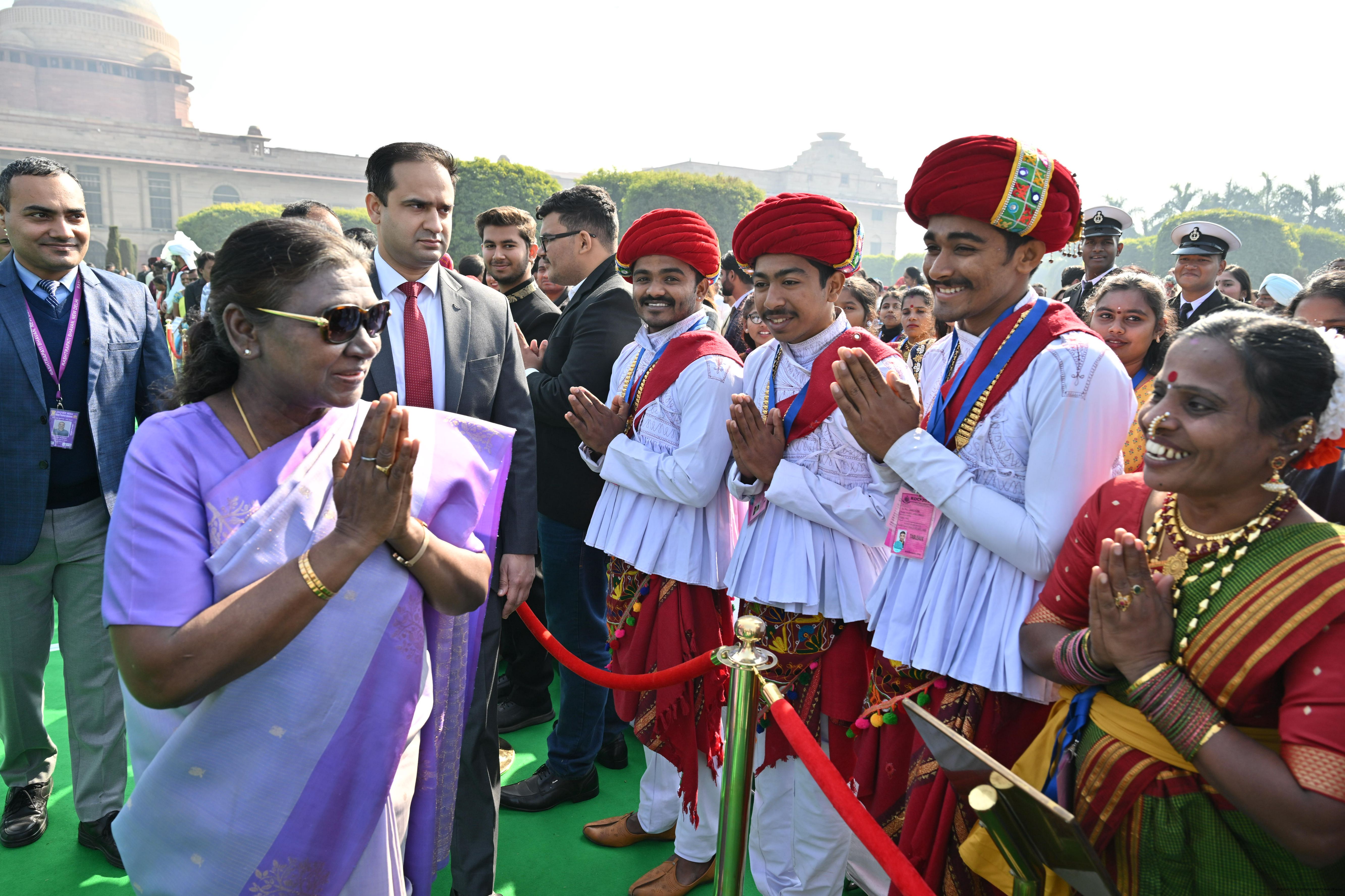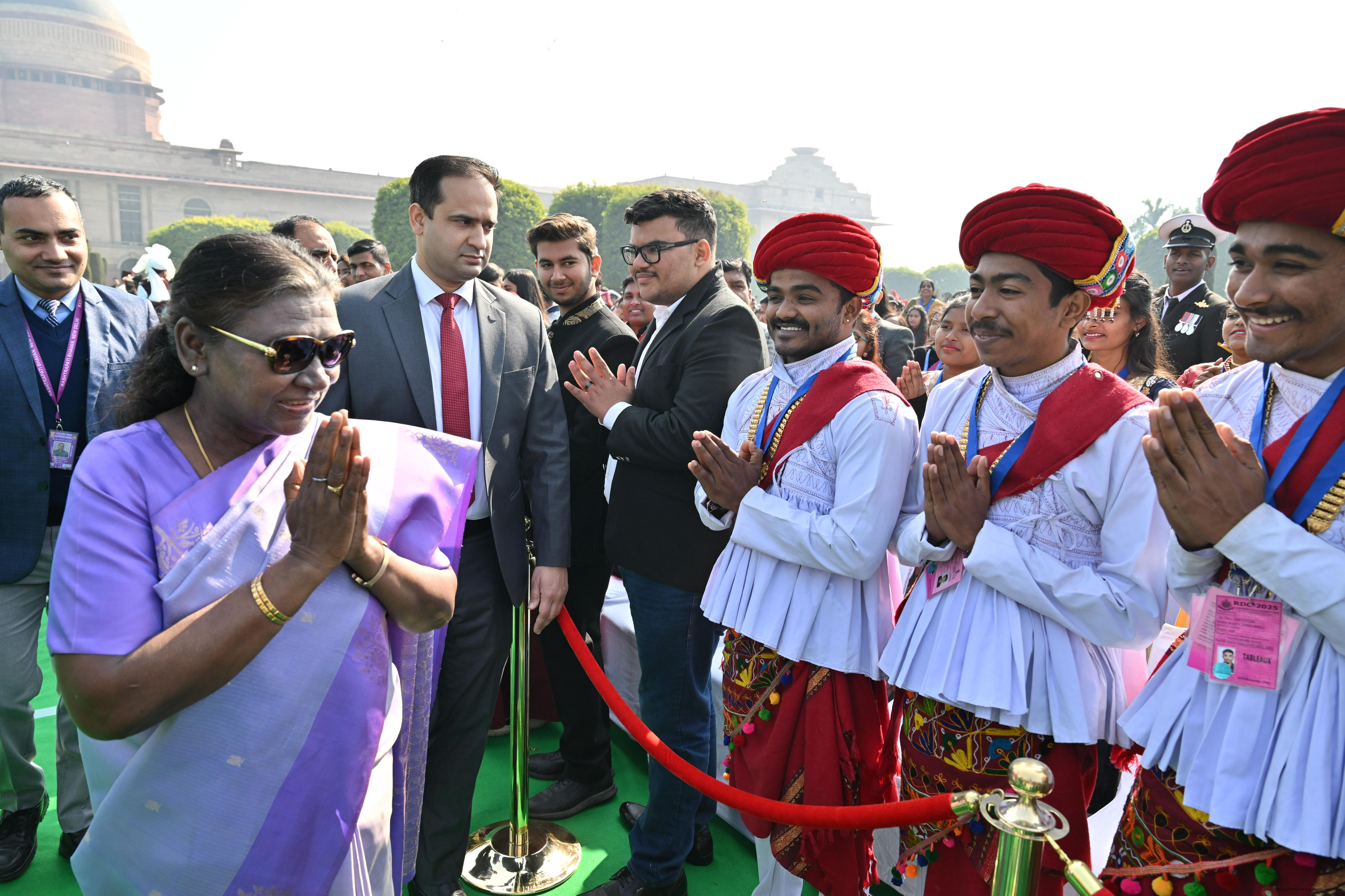 | Caption: | The President of India, Smt. Droupadi Murmu met and posing a group photographs tribal guests, tableaux artistes and tractor drivers, NSS volunteers and NCC cadets, officials and other participants of the Republic Day Parade 2025, at Rashtrapati Bhavan on January 28, 2025. |