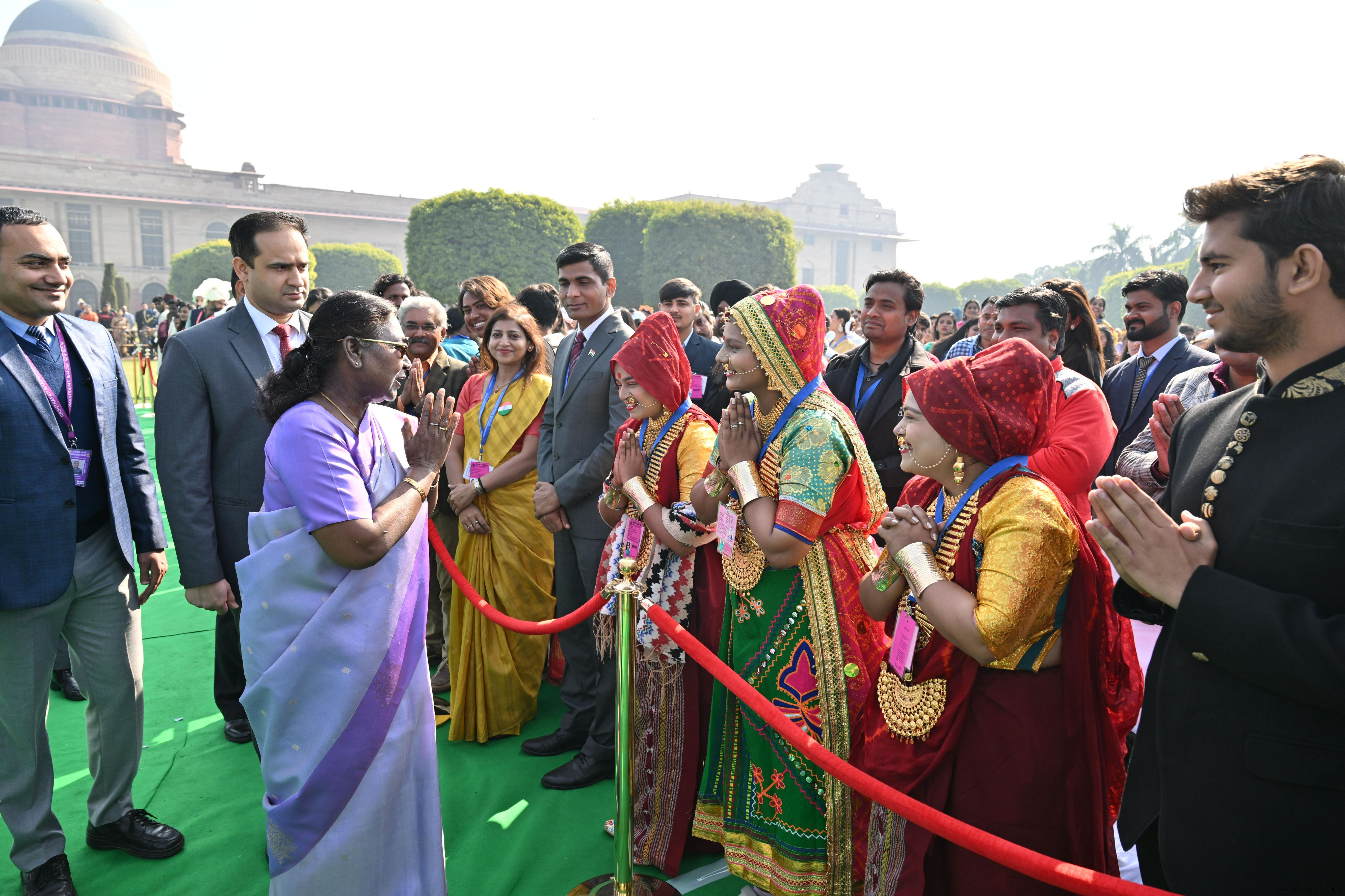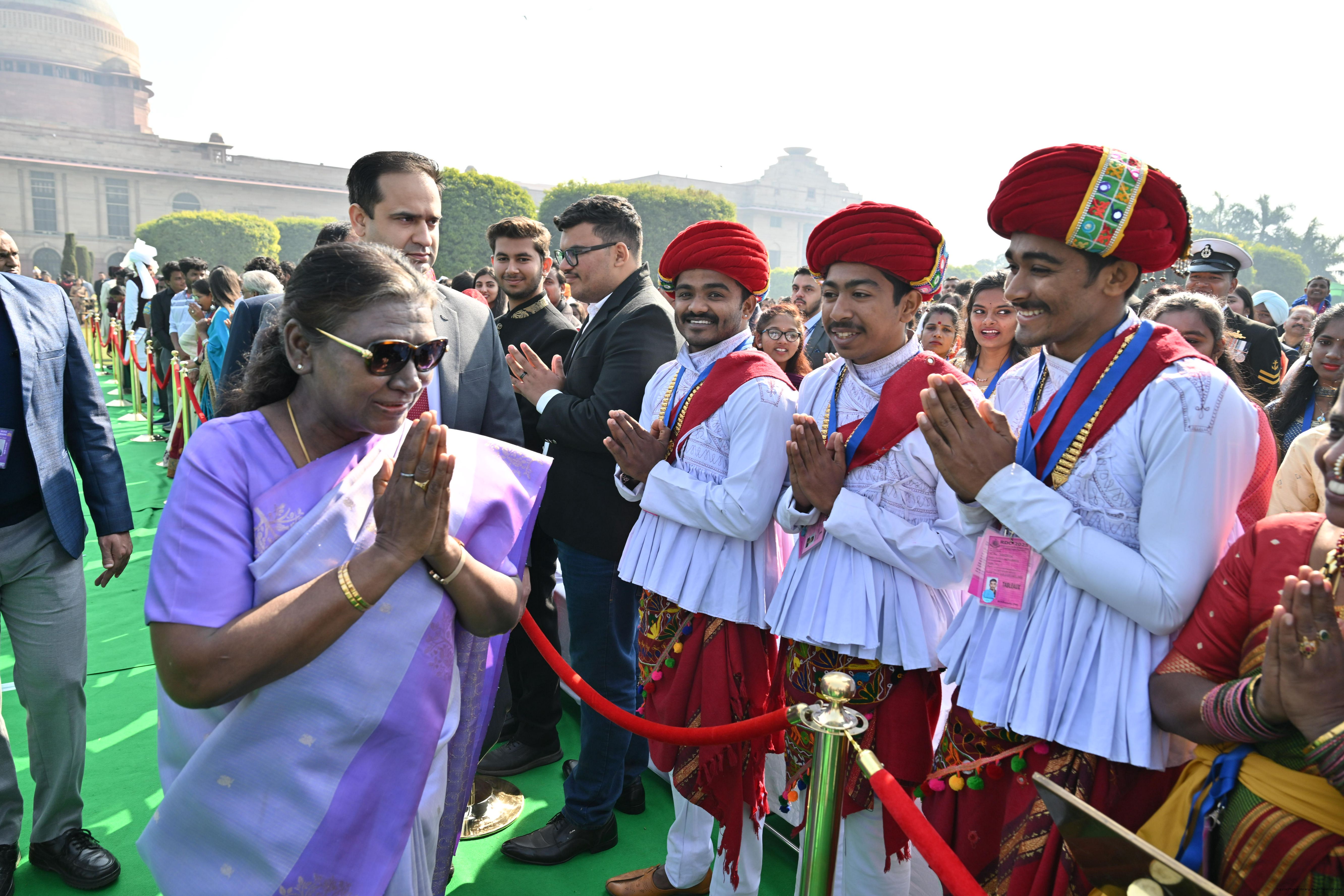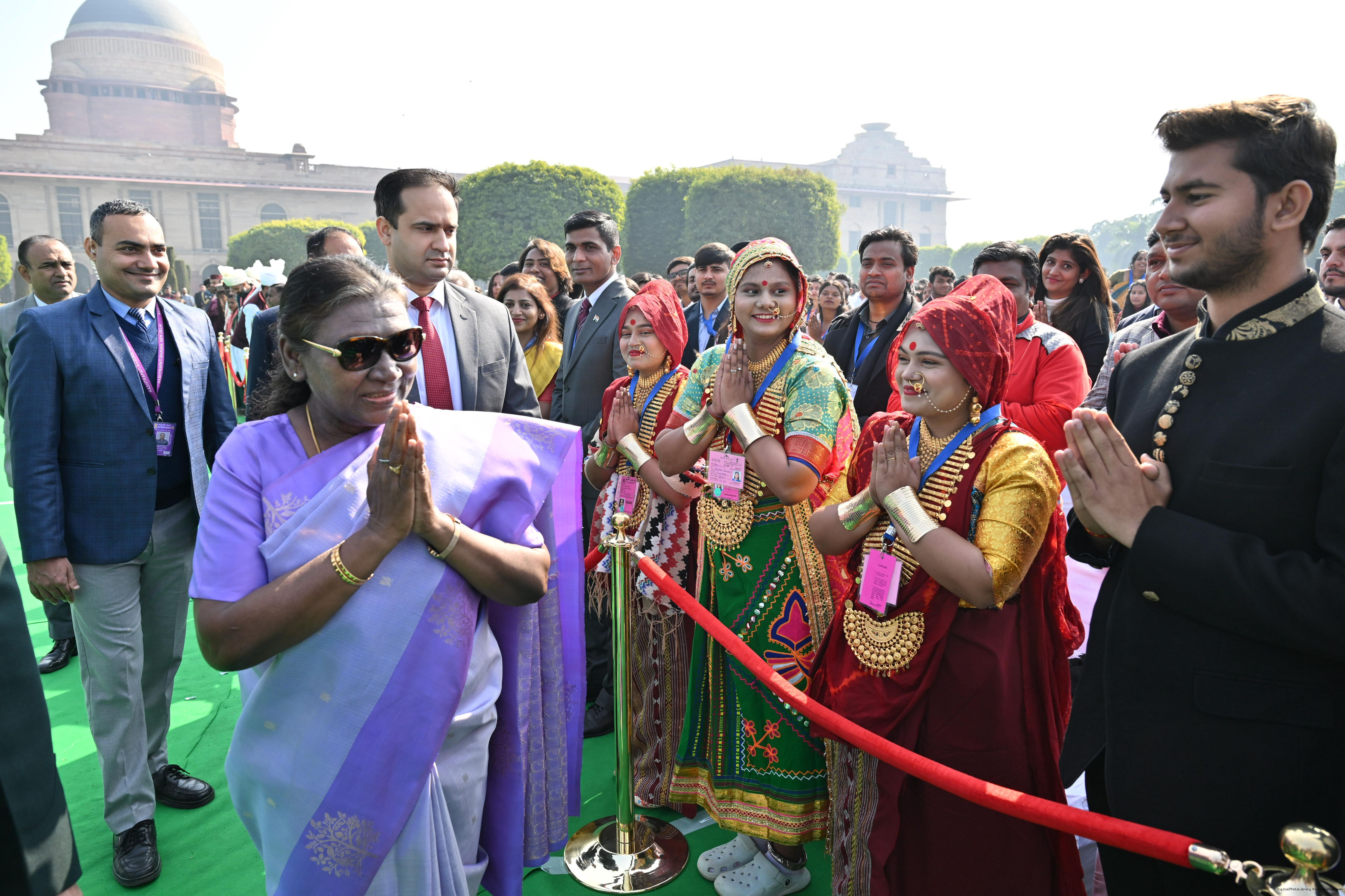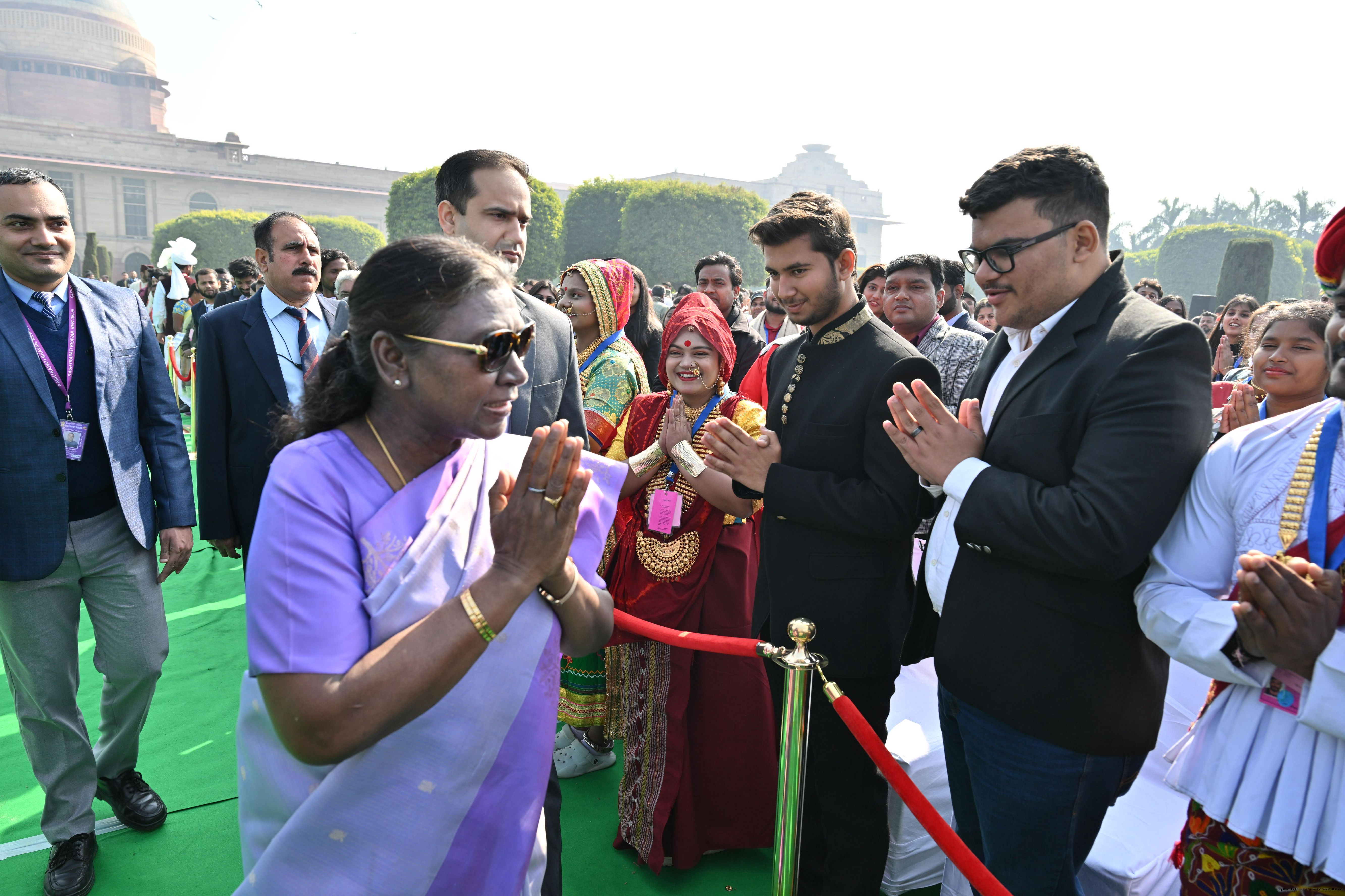 | Caption: | The President of India, Smt. Droupadi Murmu met and posing a group photographs tribal guests, tableaux artistes and tractor drivers, NSS volunteers and NCC cadets, officials and other participants of the Republic Day Parade 2025, at Rashtrapati Bhavan on January 28, 2025. |