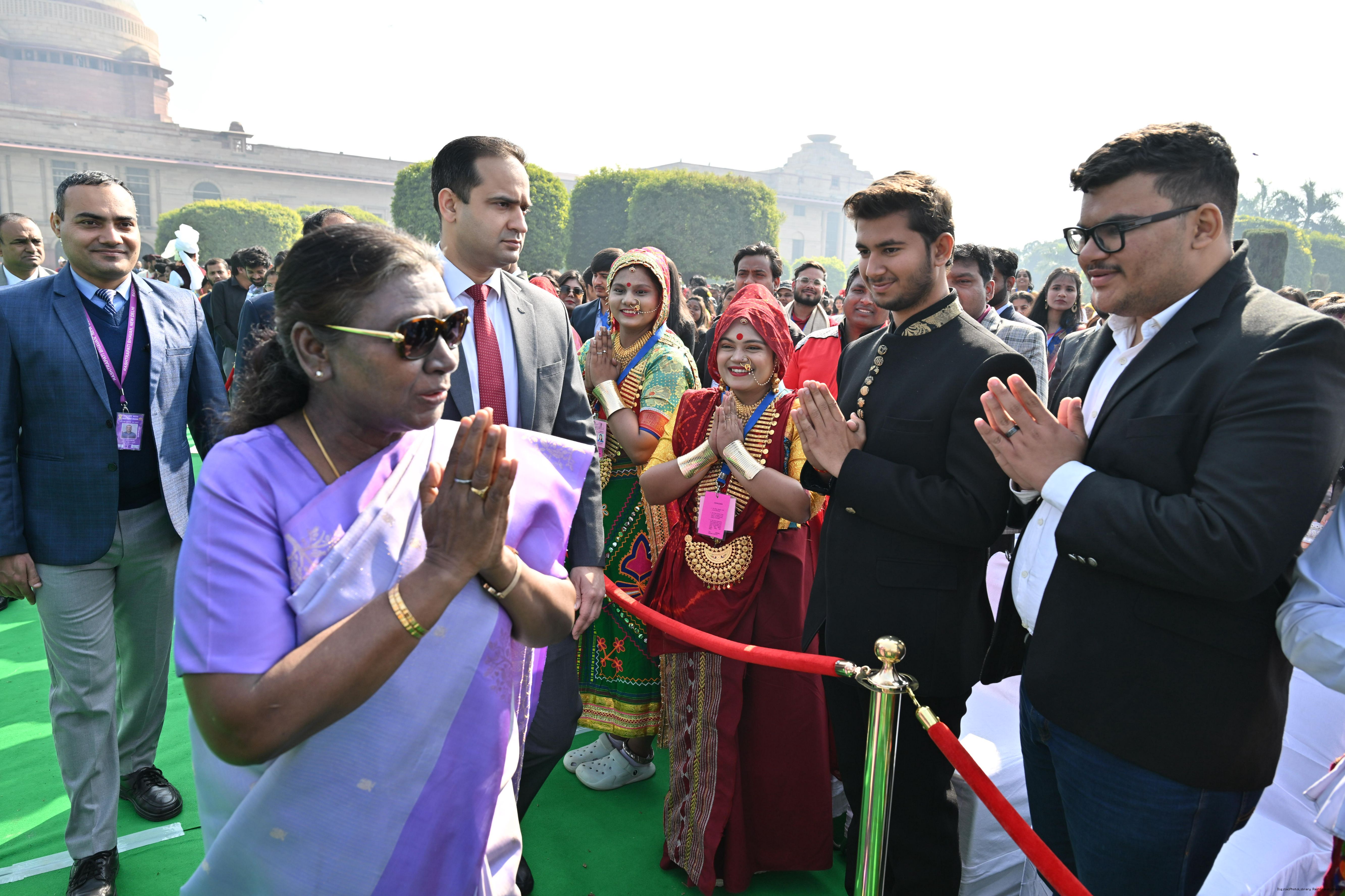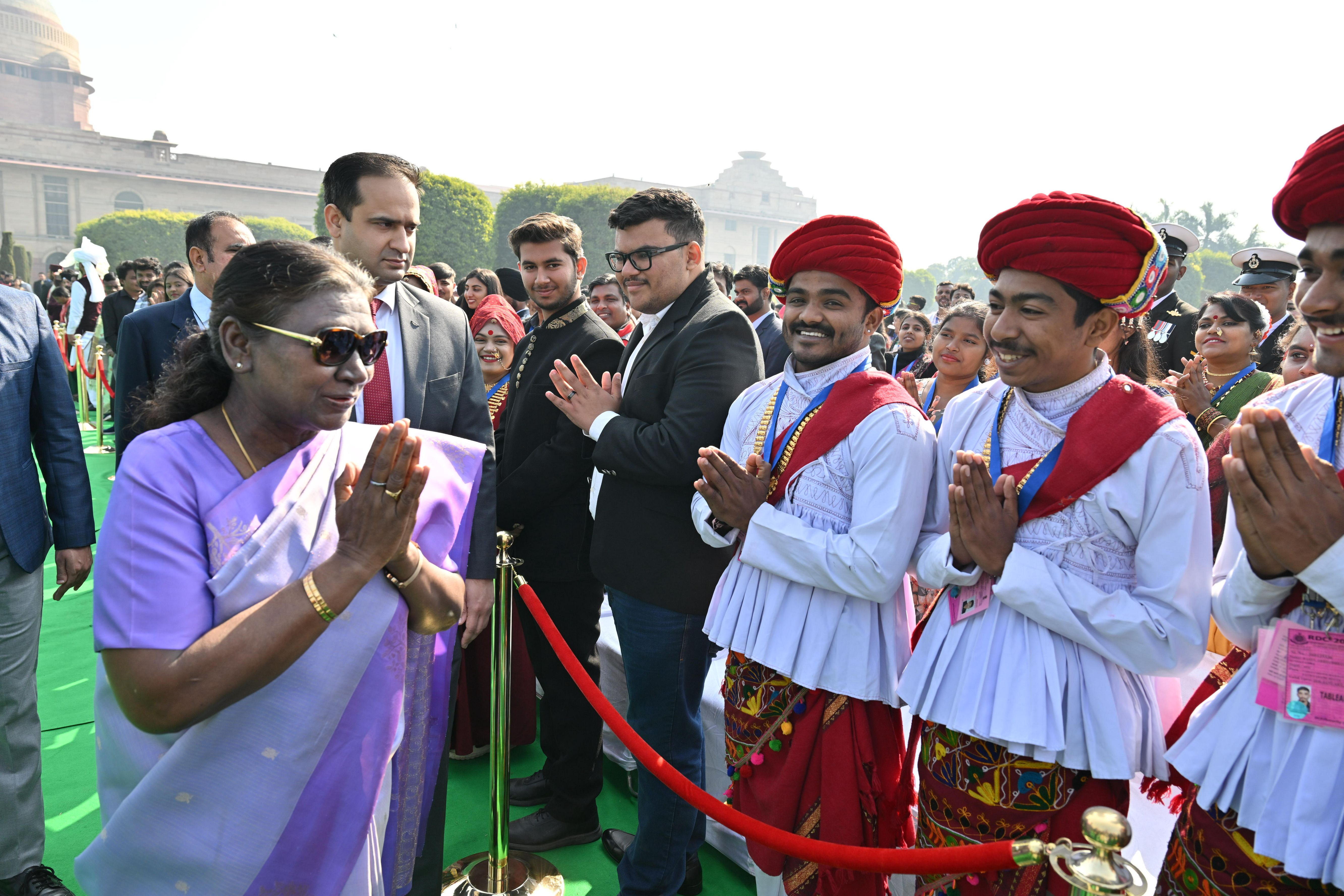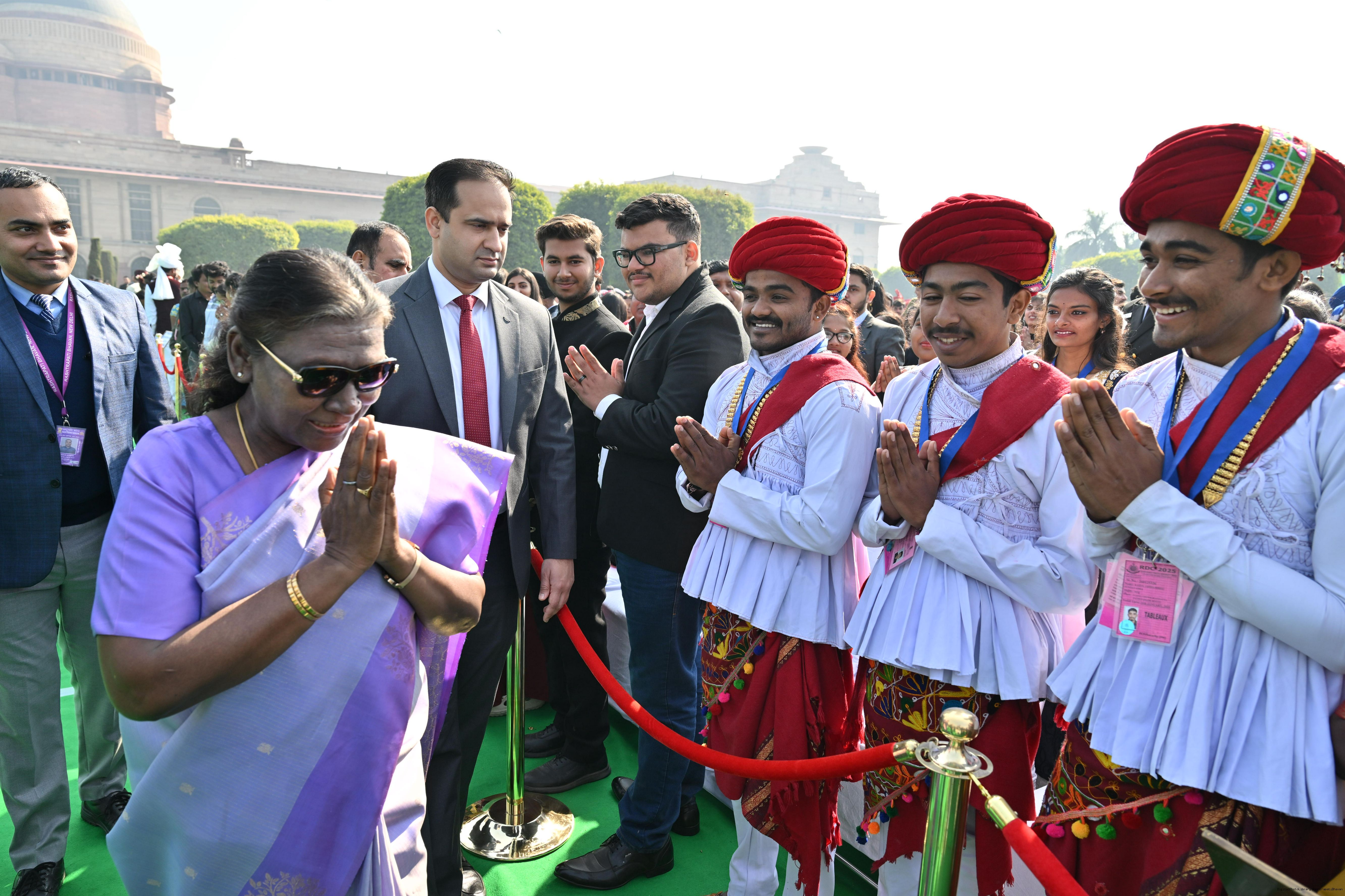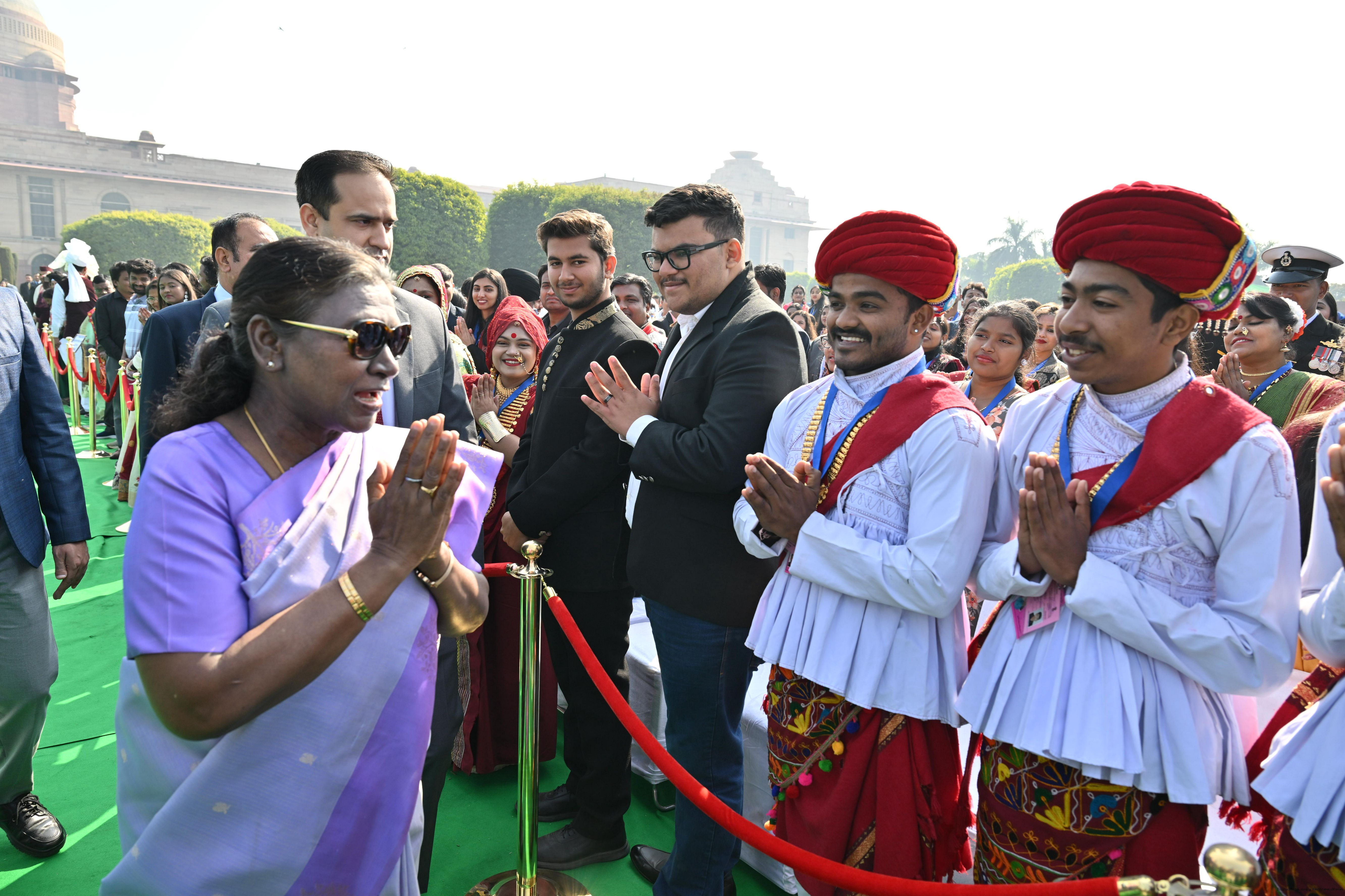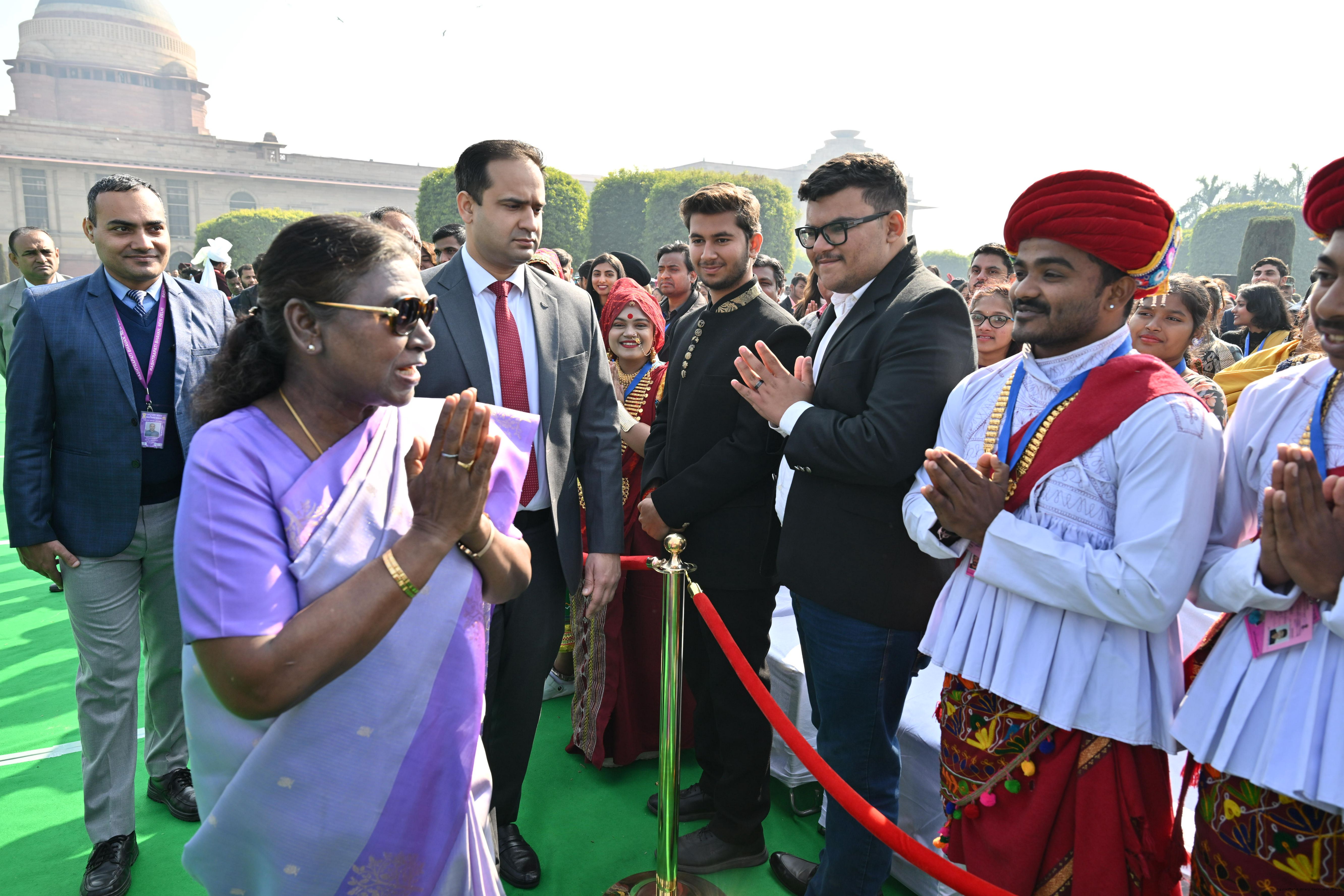 | Caption: | The President of India, Smt. Droupadi Murmu met and posing a group photographs tribal guests, tableaux artistes and tractor drivers, NSS volunteers and NCC cadets, officials and other participants of the Republic Day Parade 2025, at Rashtrapati Bhavan on January 28, 2025. |