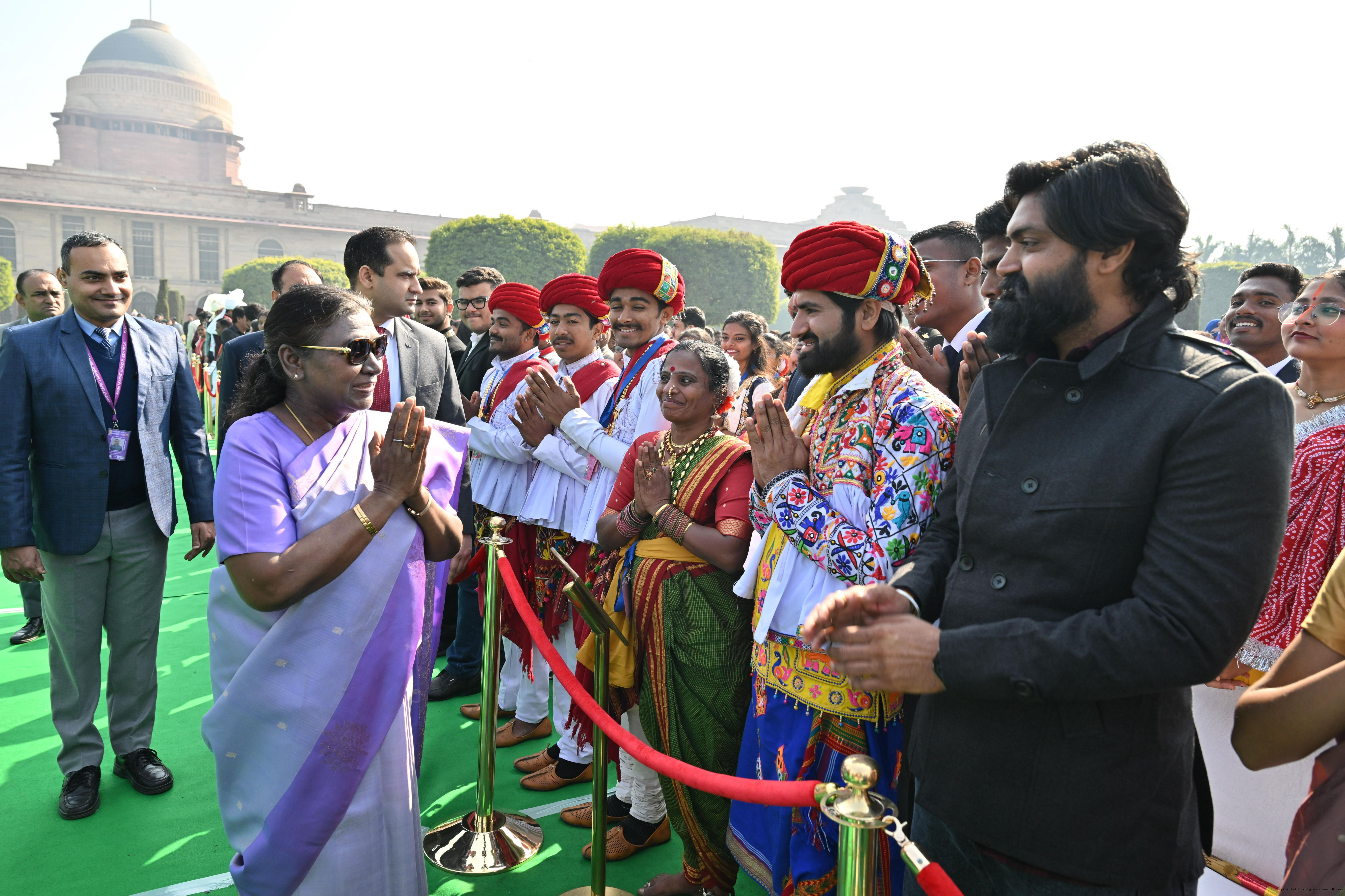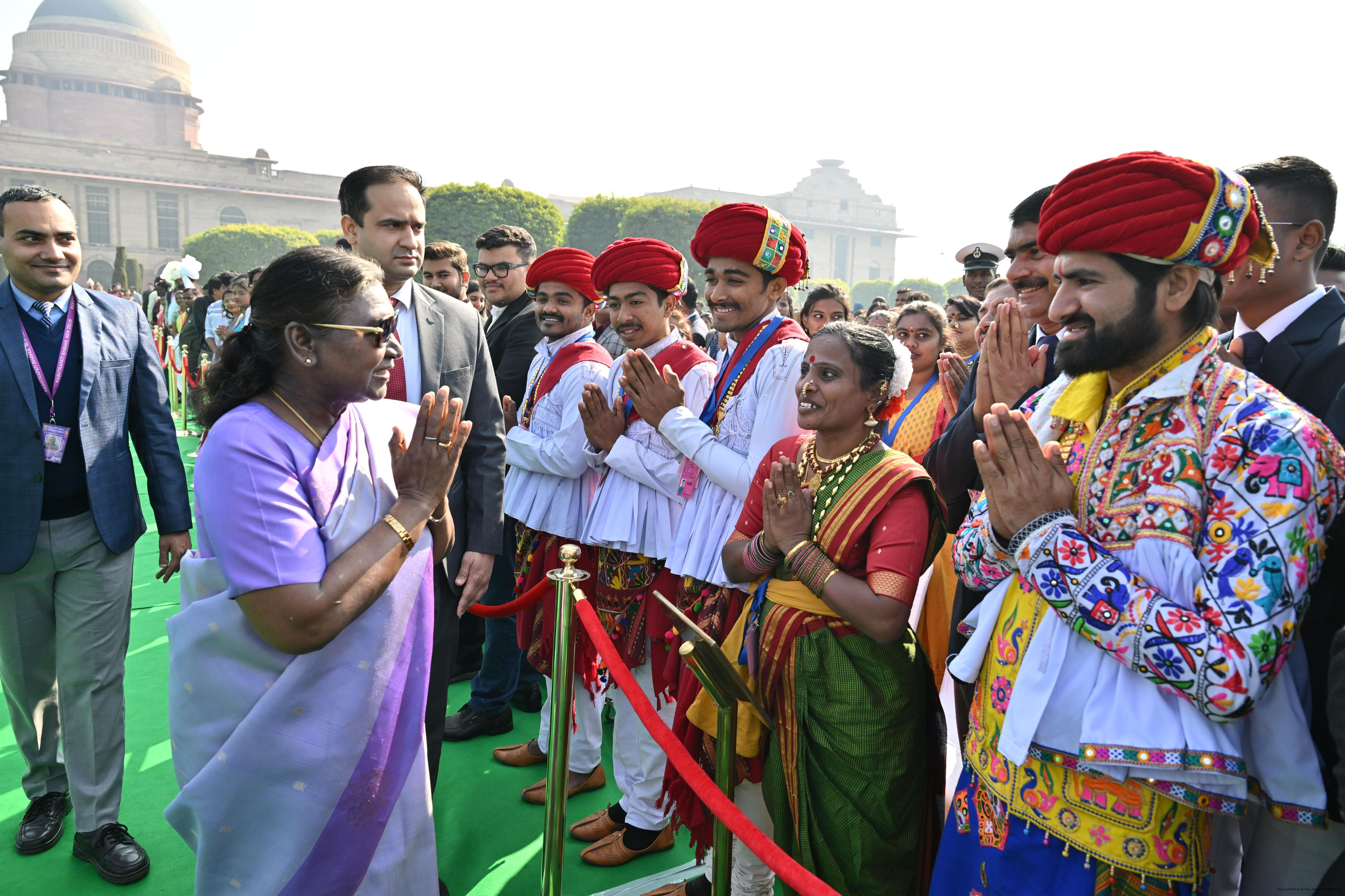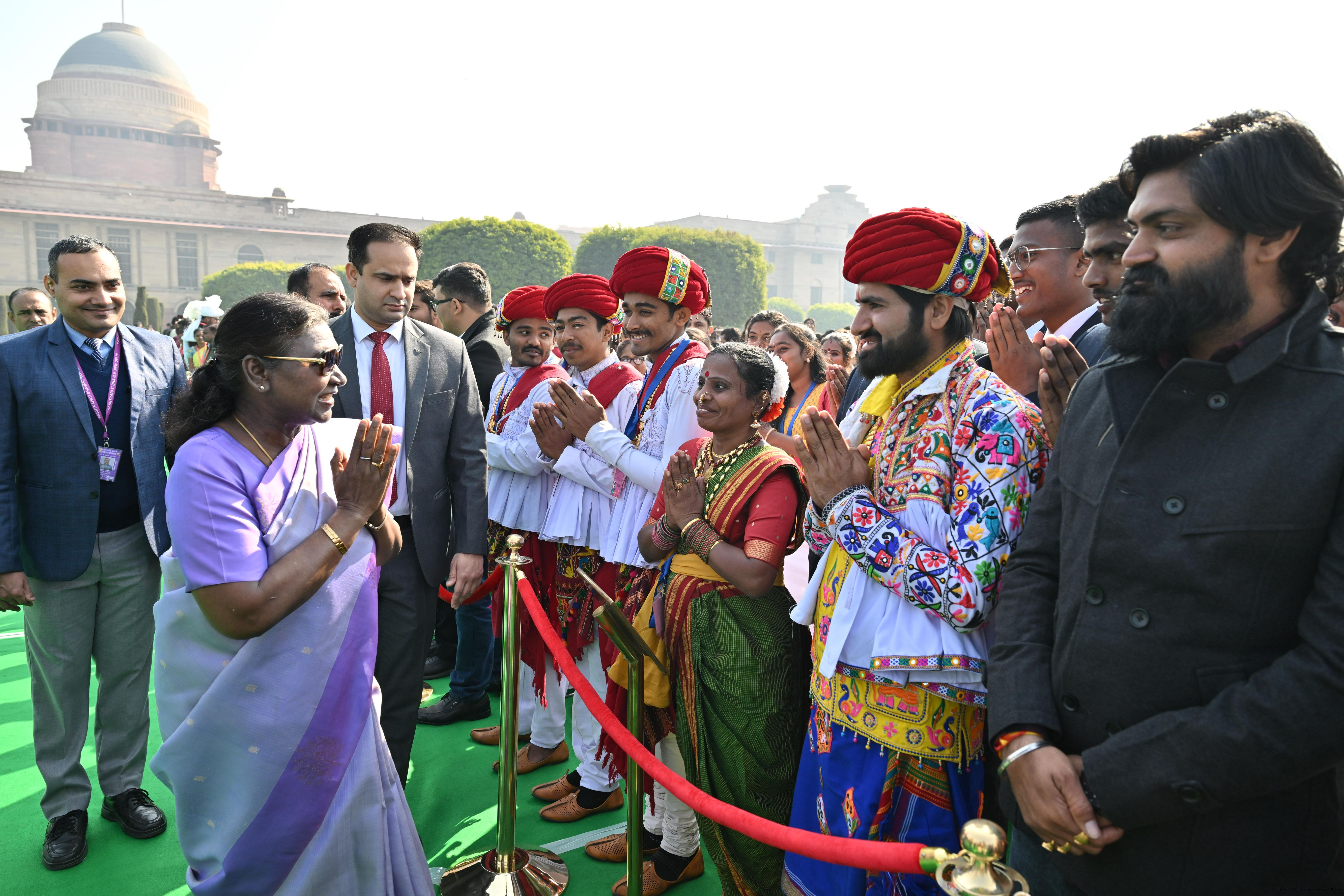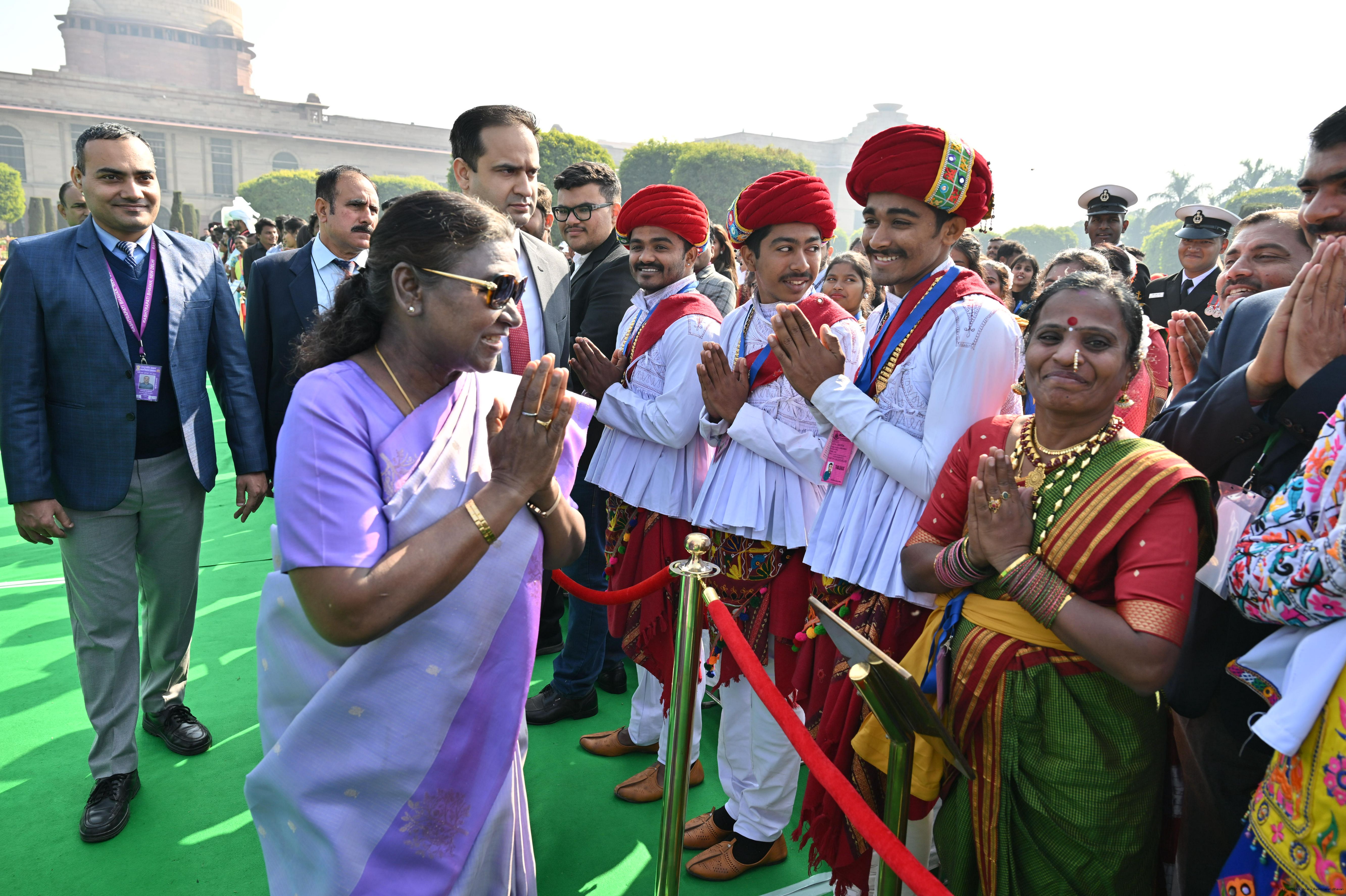 | Caption: | The President of India, Smt. Droupadi Murmu met and posing a group photographs tribal guests, tableaux artistes and tractor drivers, NSS volunteers and NCC cadets, officials and other participants of the Republic Day Parade 2025, at Rashtrapati Bhavan on January 28, 2025. |