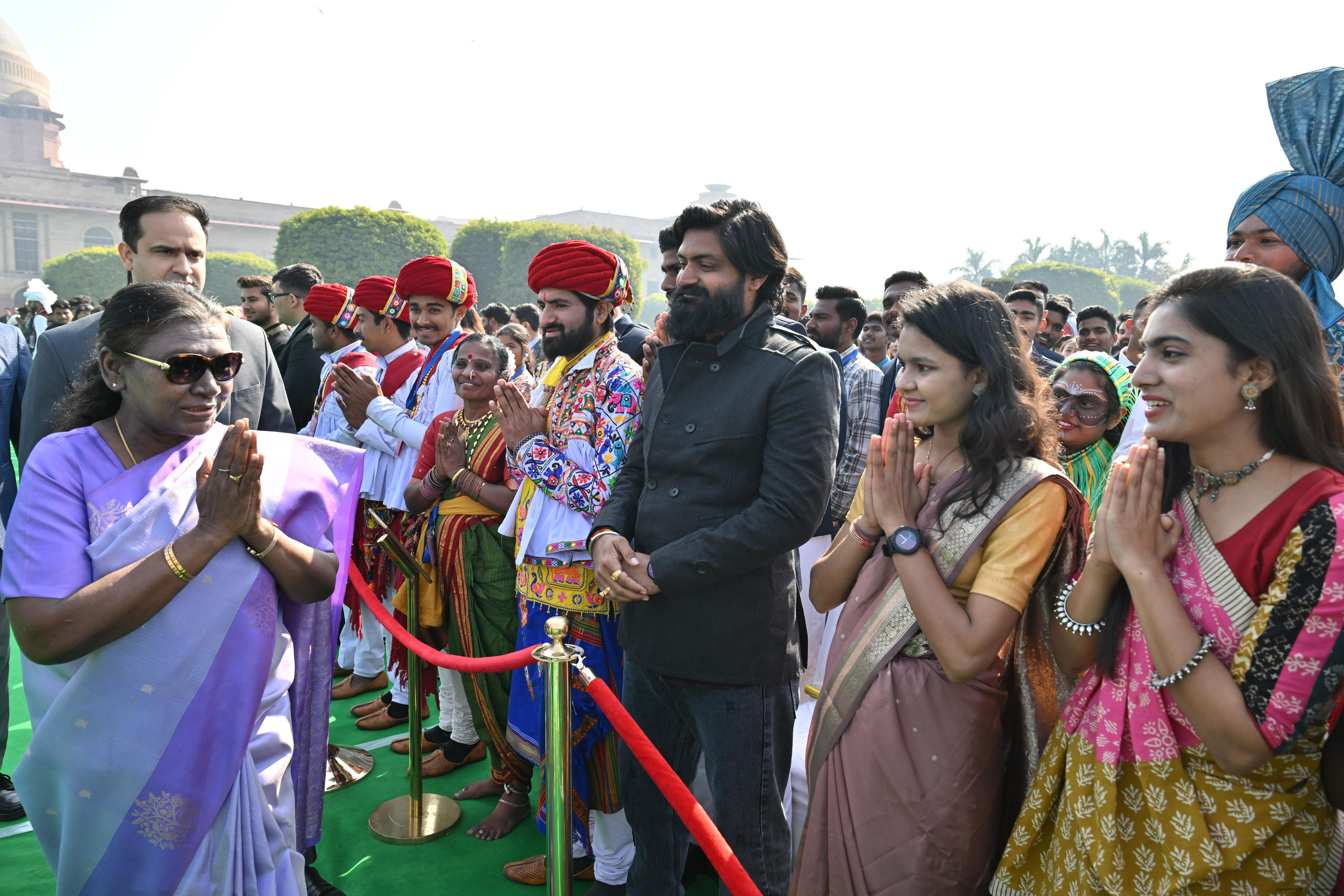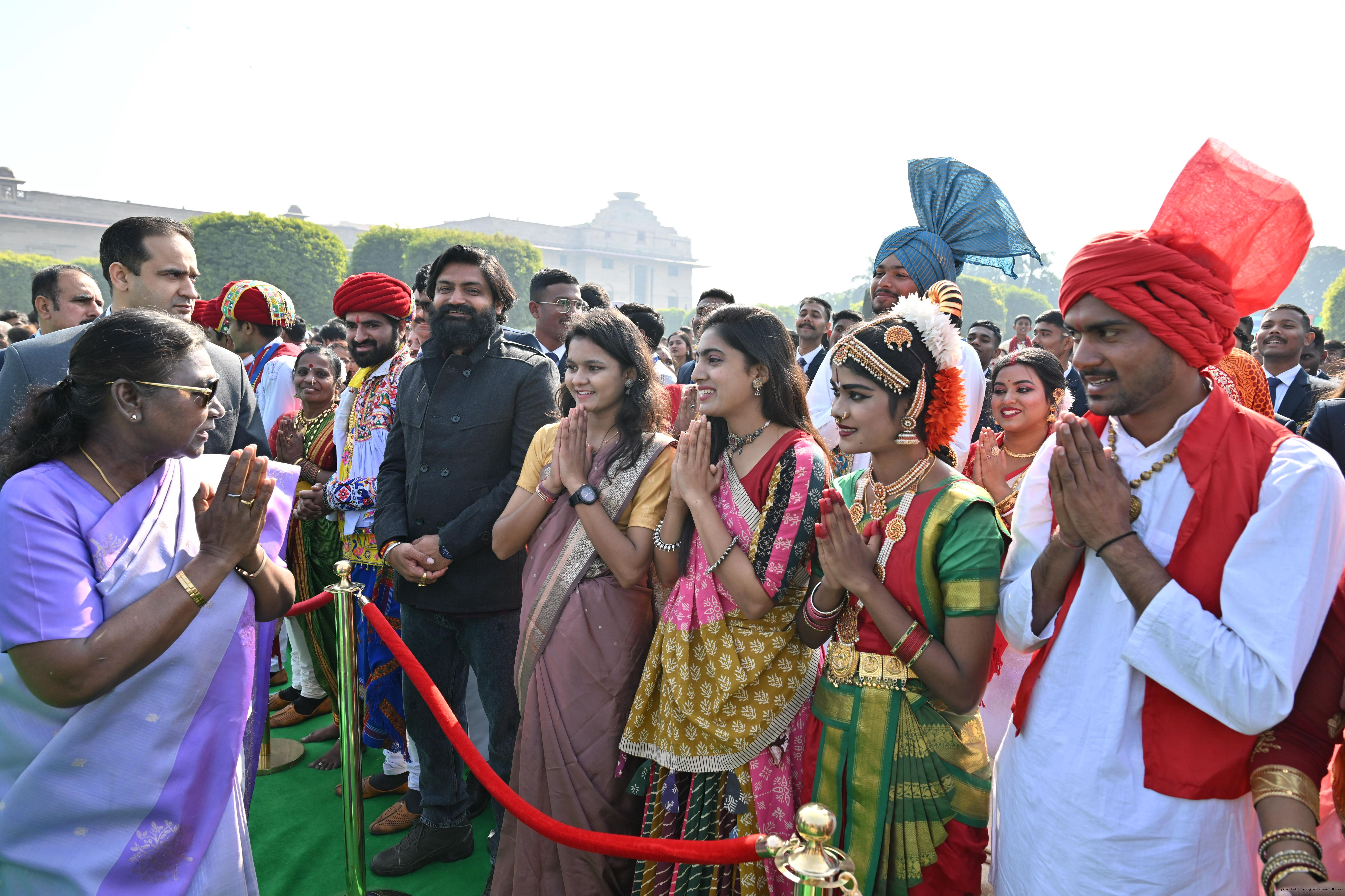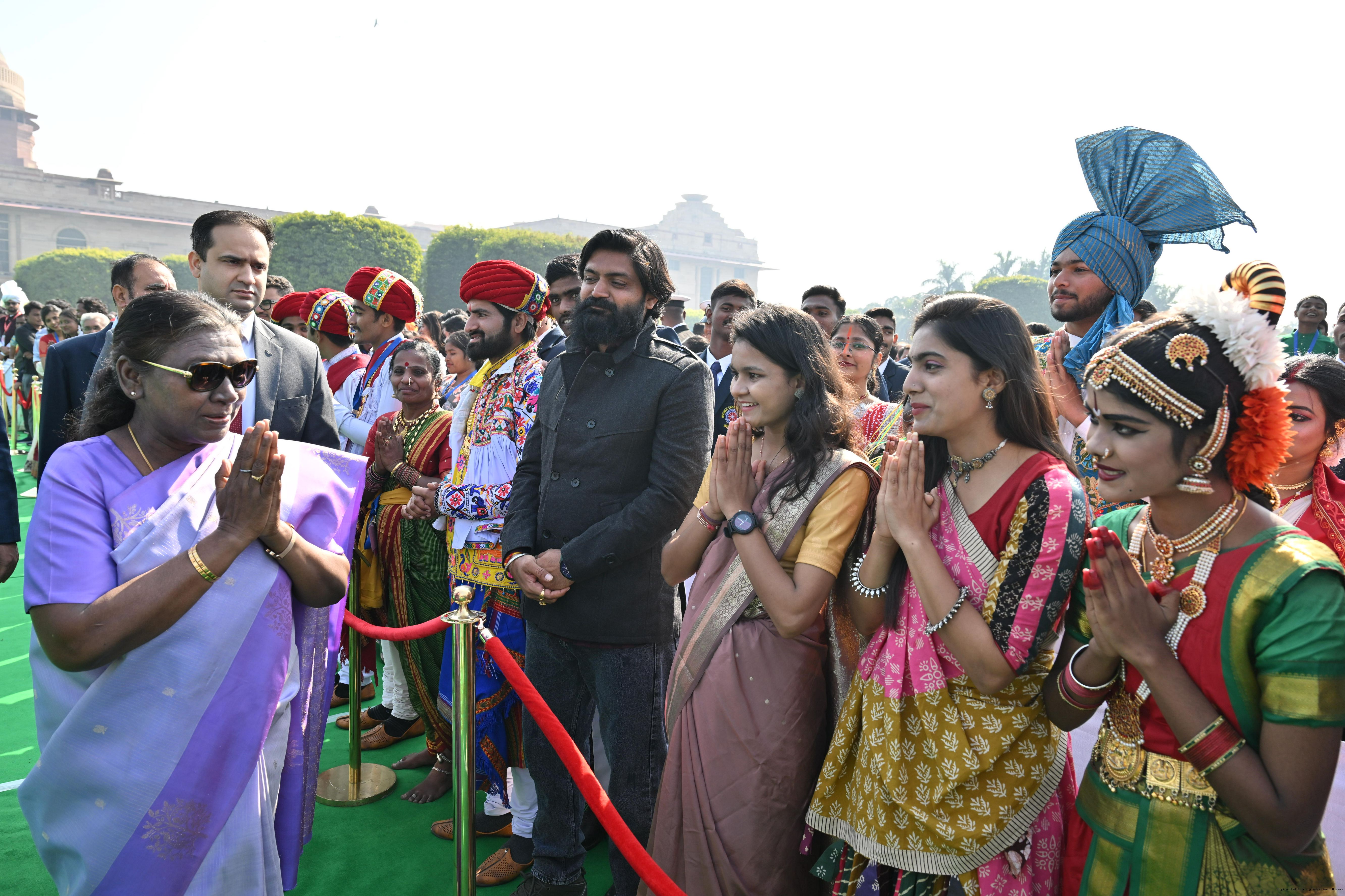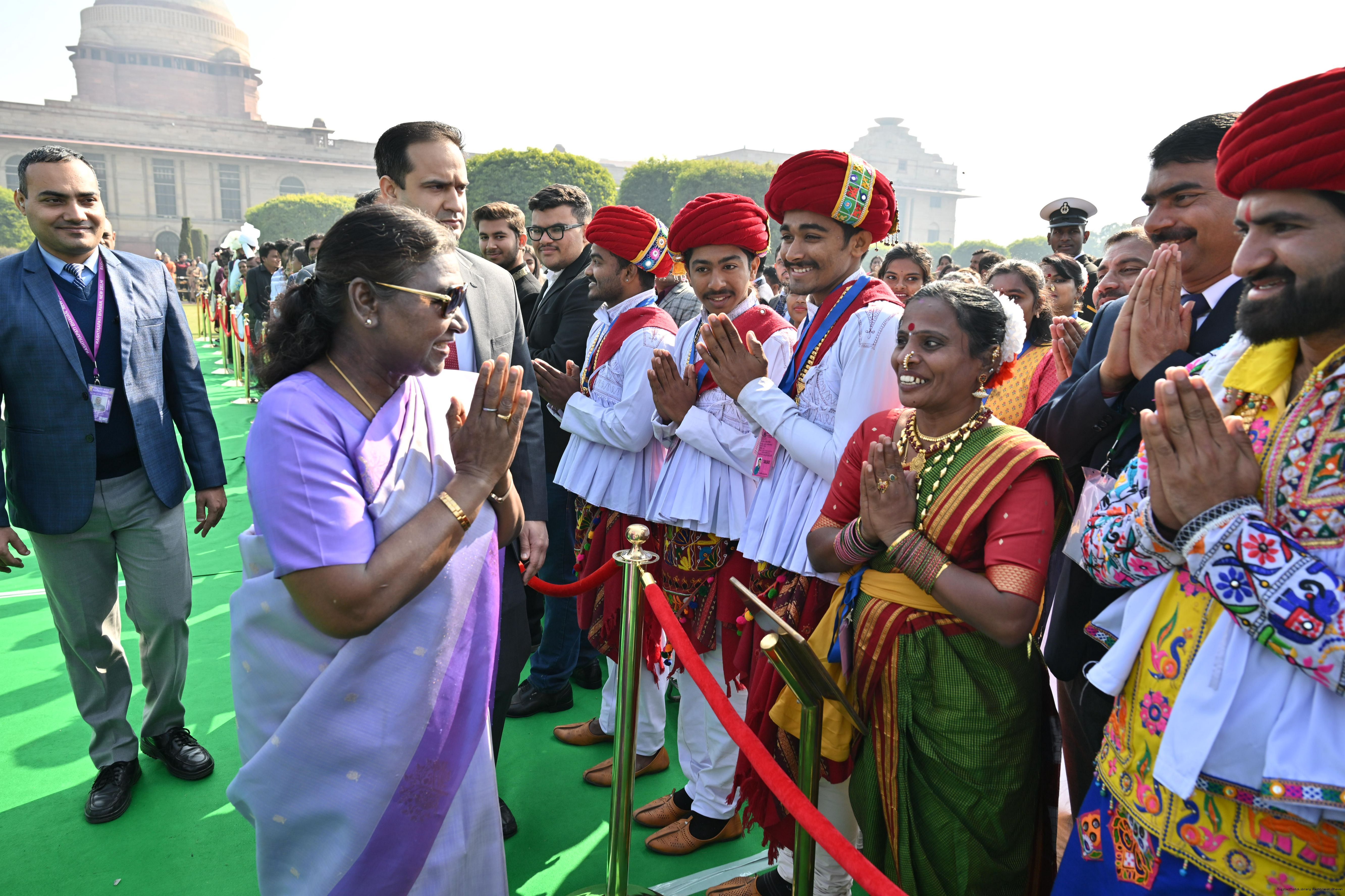 | Caption: | The President of India, Smt. Droupadi Murmu met and posing a group photographs tribal guests, tableaux artistes and tractor drivers, NSS volunteers and NCC cadets, officials and other participants of the Republic Day Parade 2025, at Rashtrapati Bhavan on January 28, 2025. |