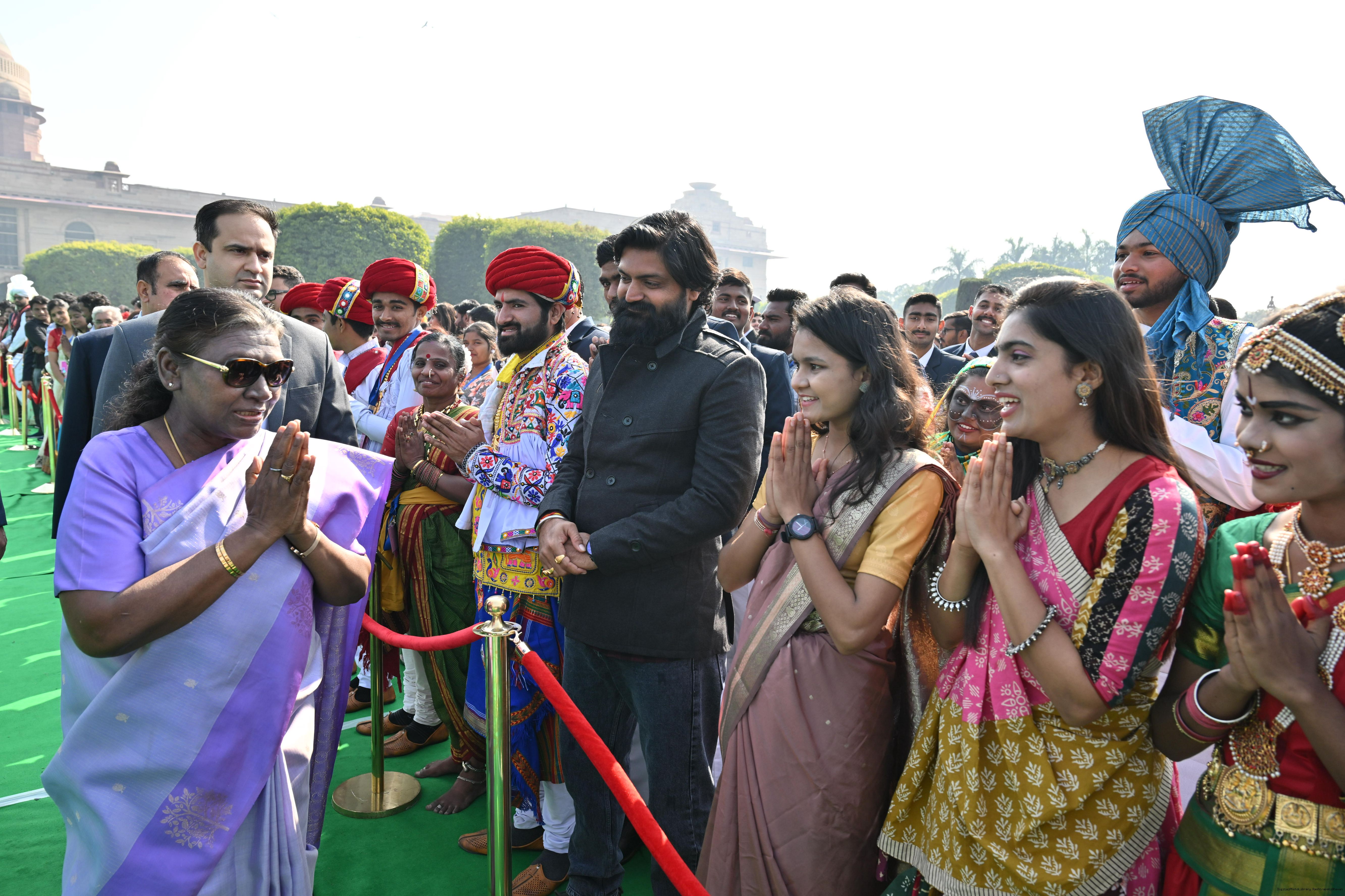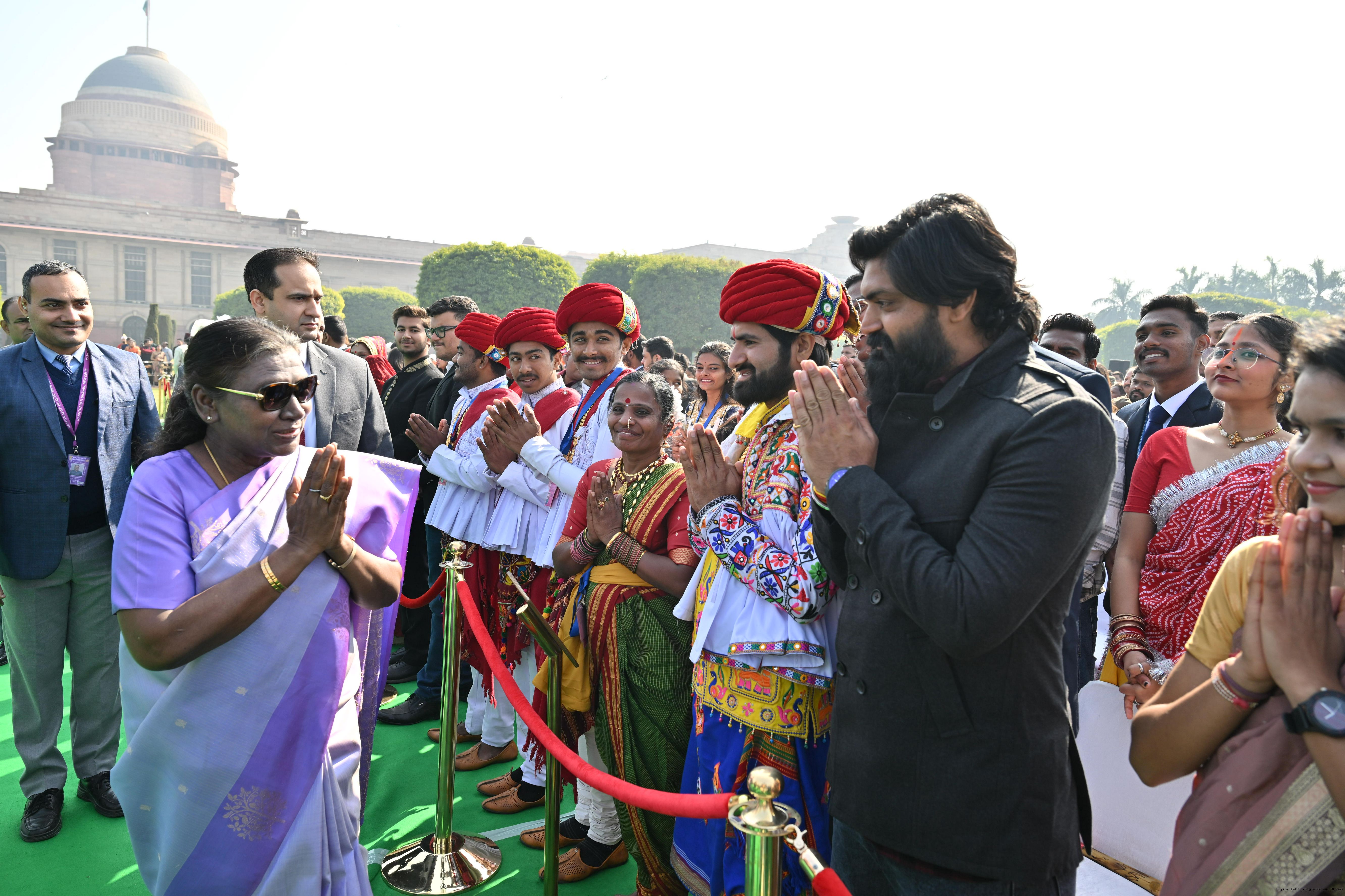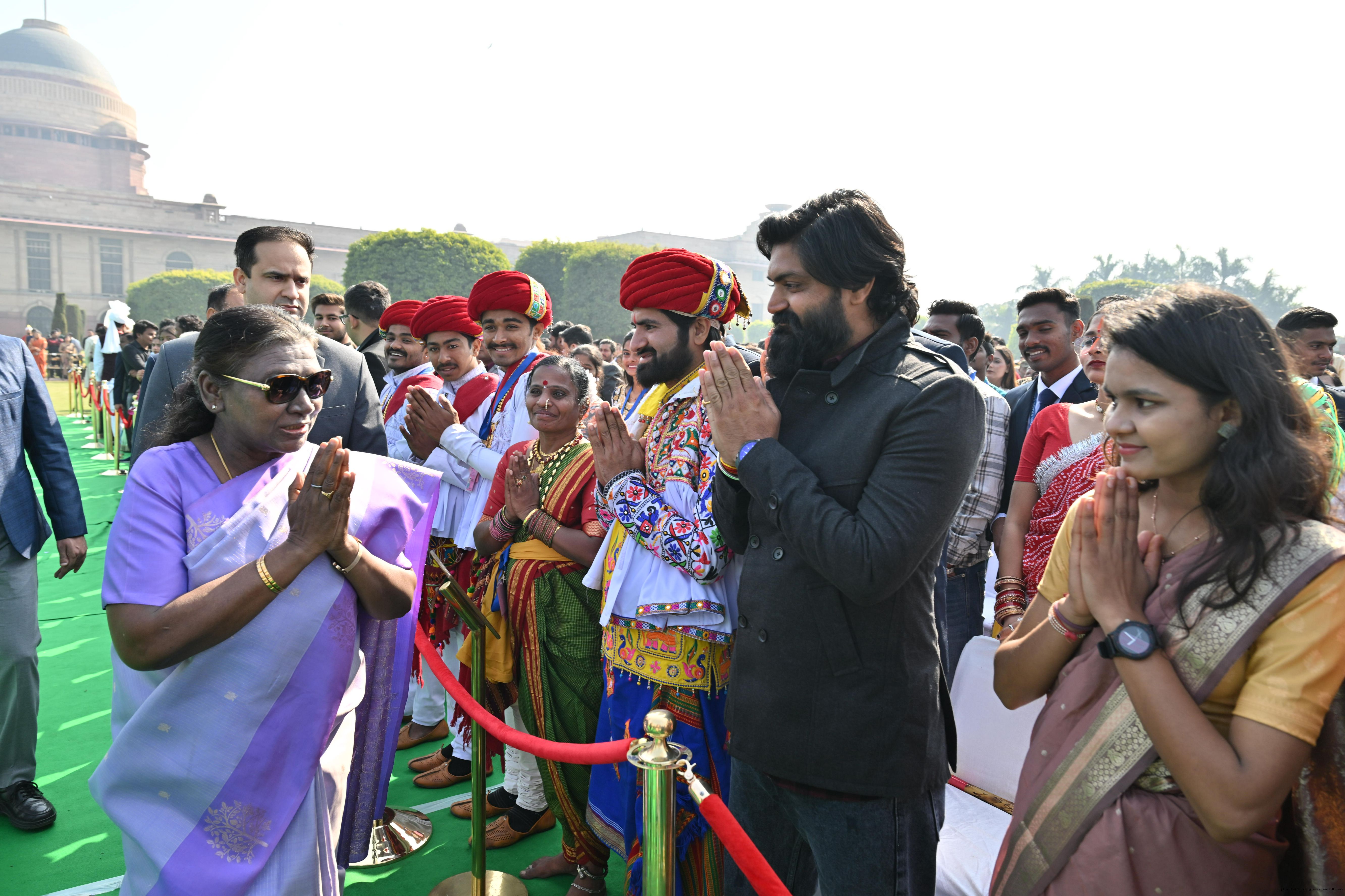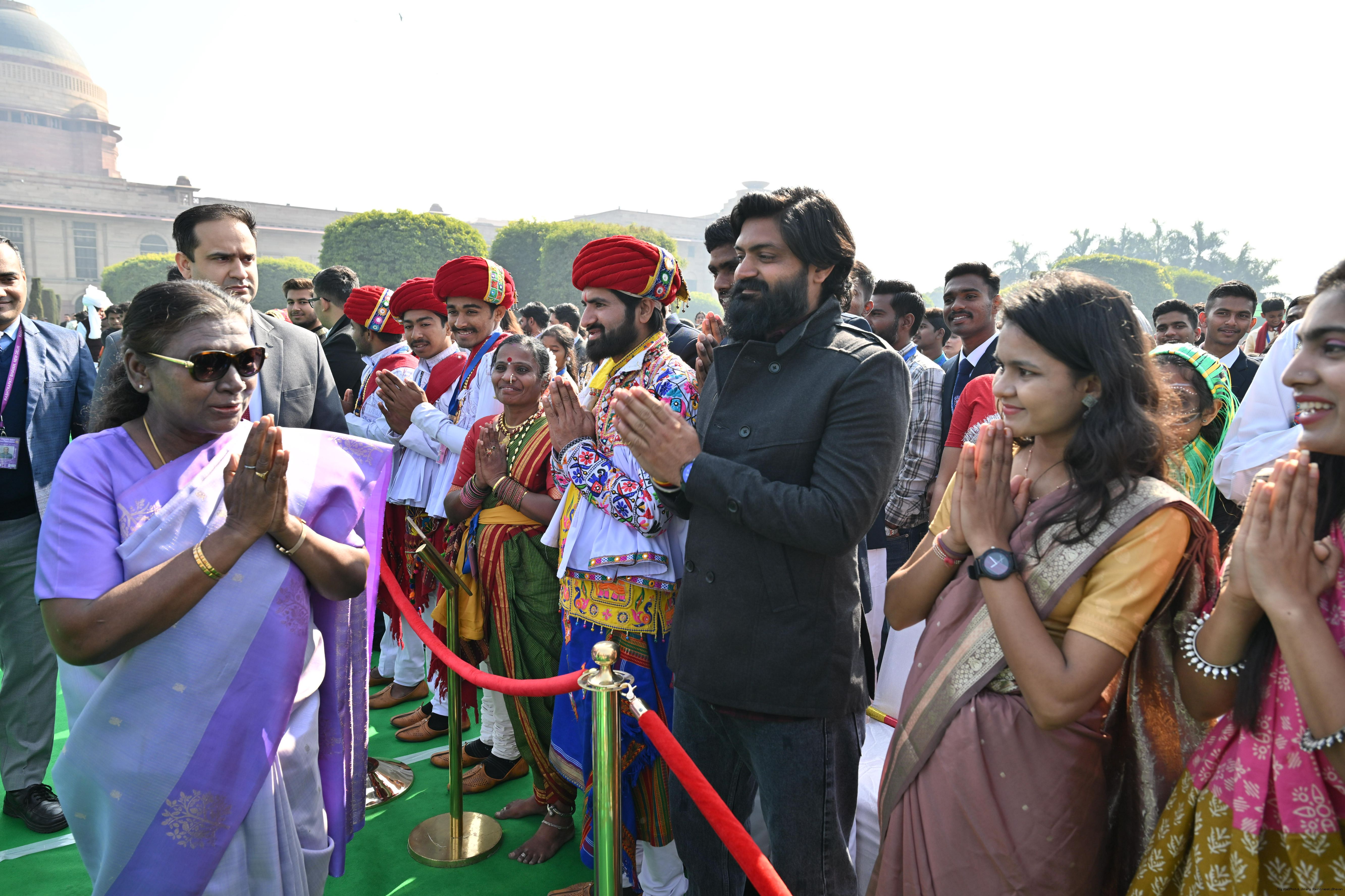 | Caption: | The President of India, Smt. Droupadi Murmu met and posing a group photographs tribal guests, tableaux artistes and tractor drivers, NSS volunteers and NCC cadets, officials and other participants of the Republic Day Parade 2025, at Rashtrapati Bhavan on January 28, 2025. |