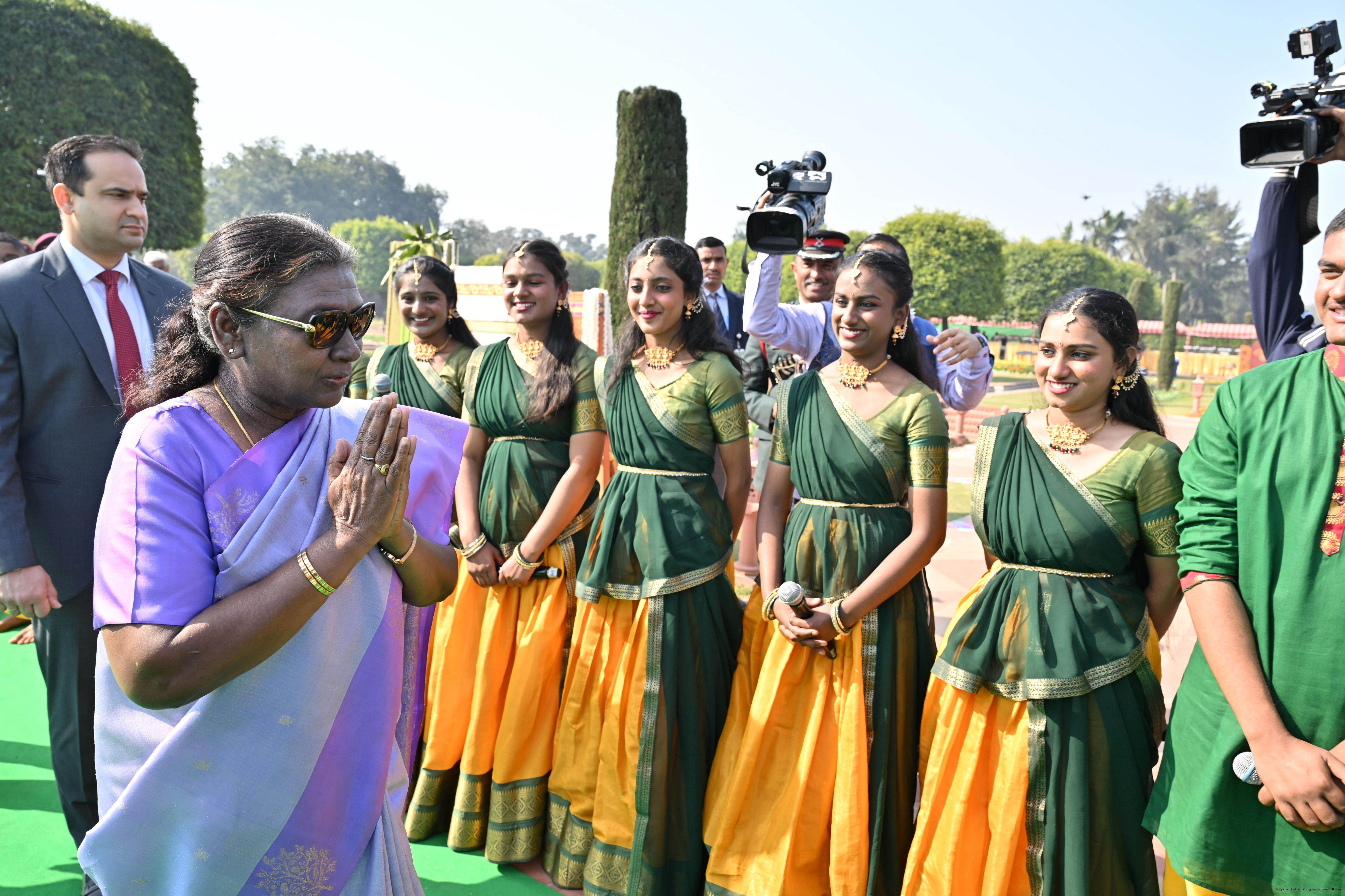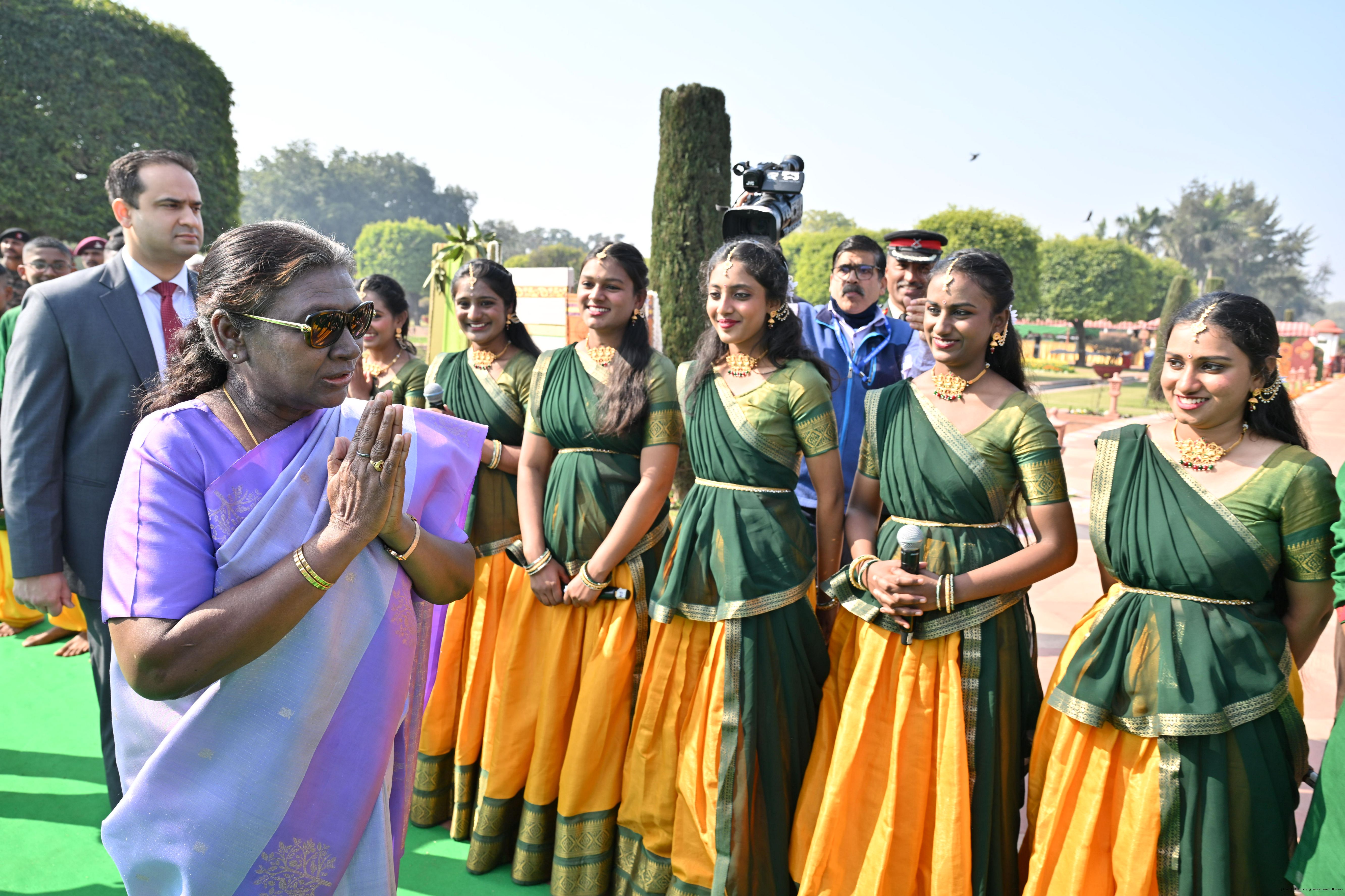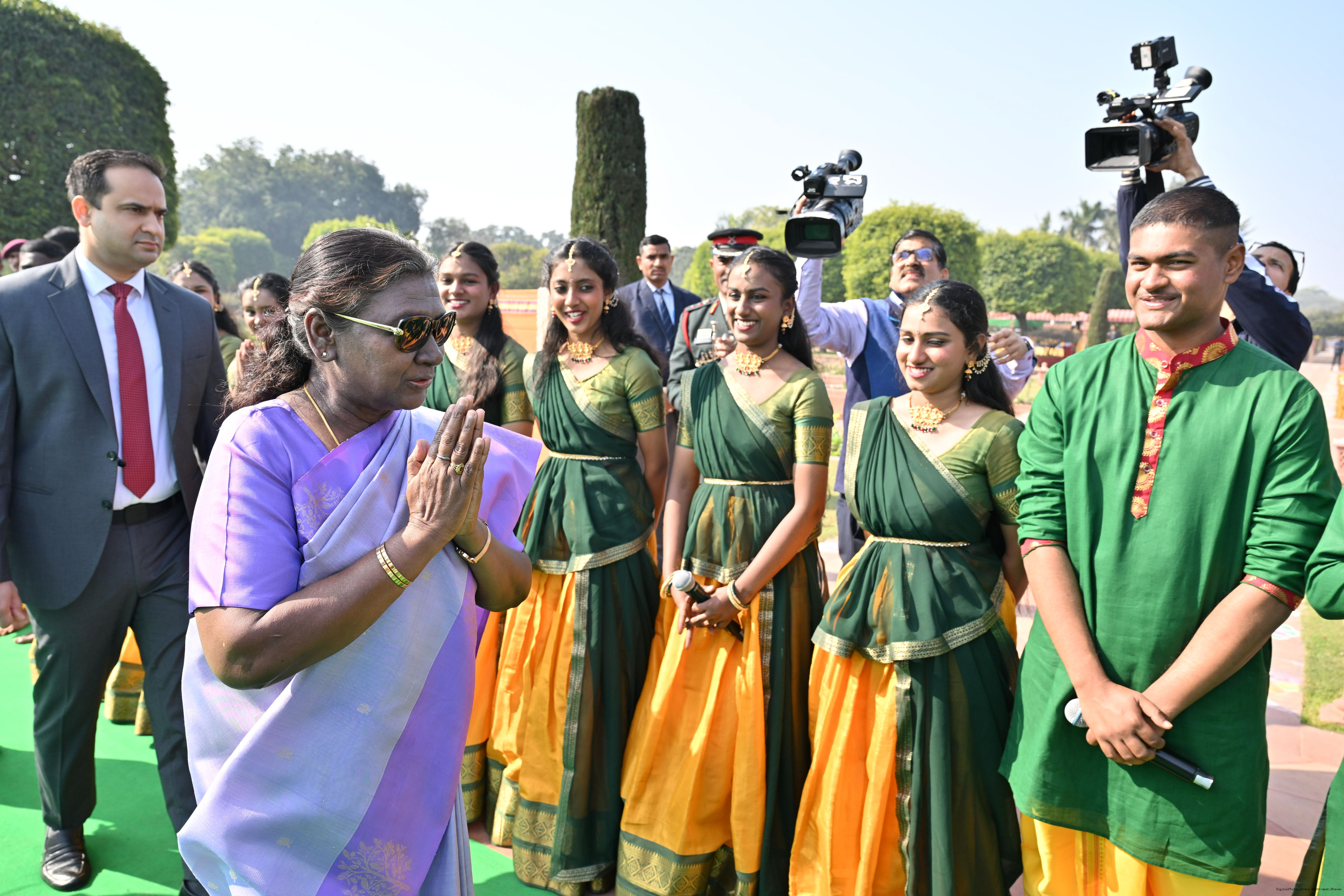| Caption: | The President of India, Smt. Droupadi Murmu met and posing a group photographs tribal guests, tableaux artistes and tractor drivers, NSS volunteers and NCC cadets, officials and other participants of the Republic Day Parade 2025, at Rashtrapati Bhavan on January 28, 2025. |