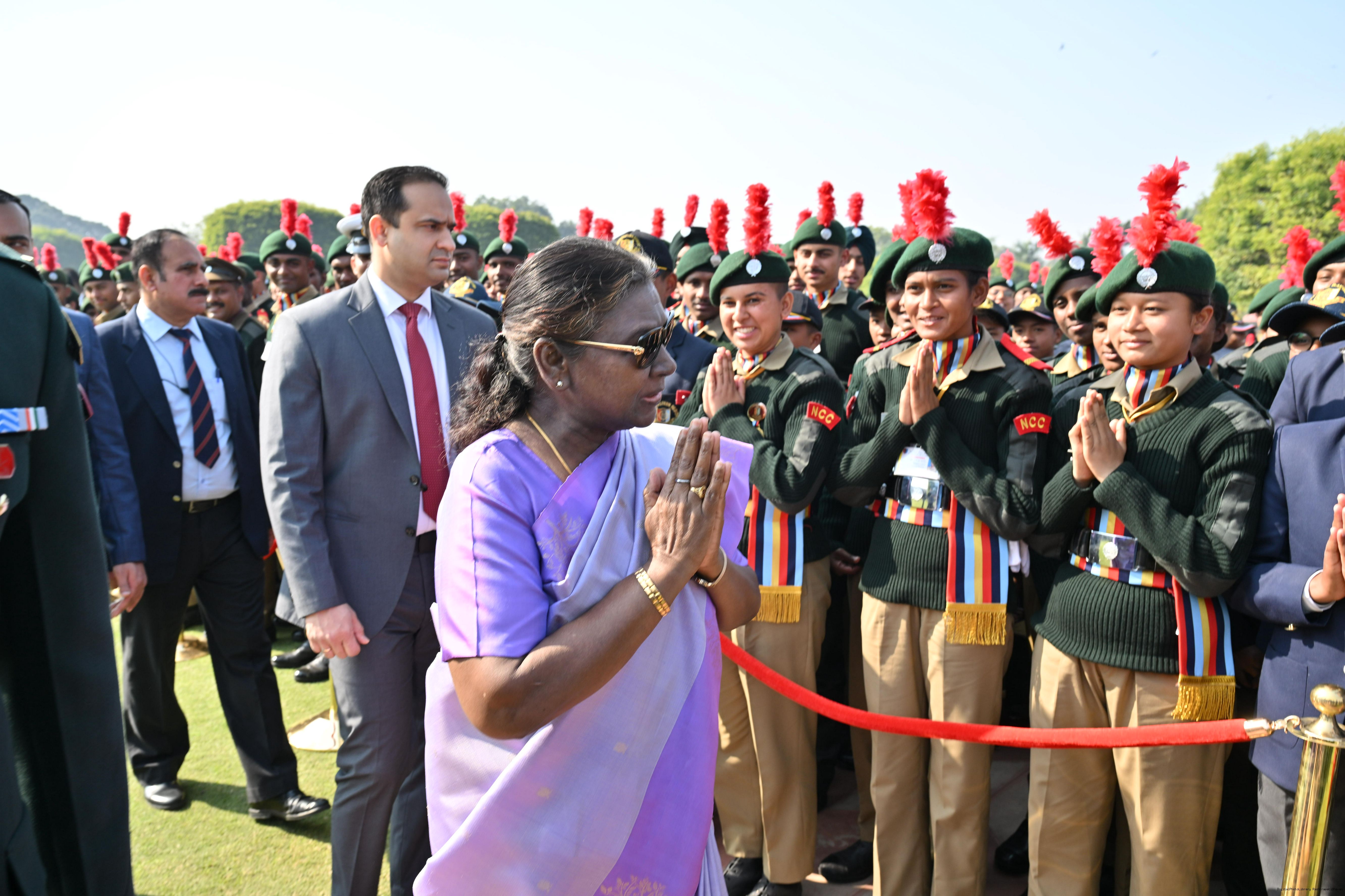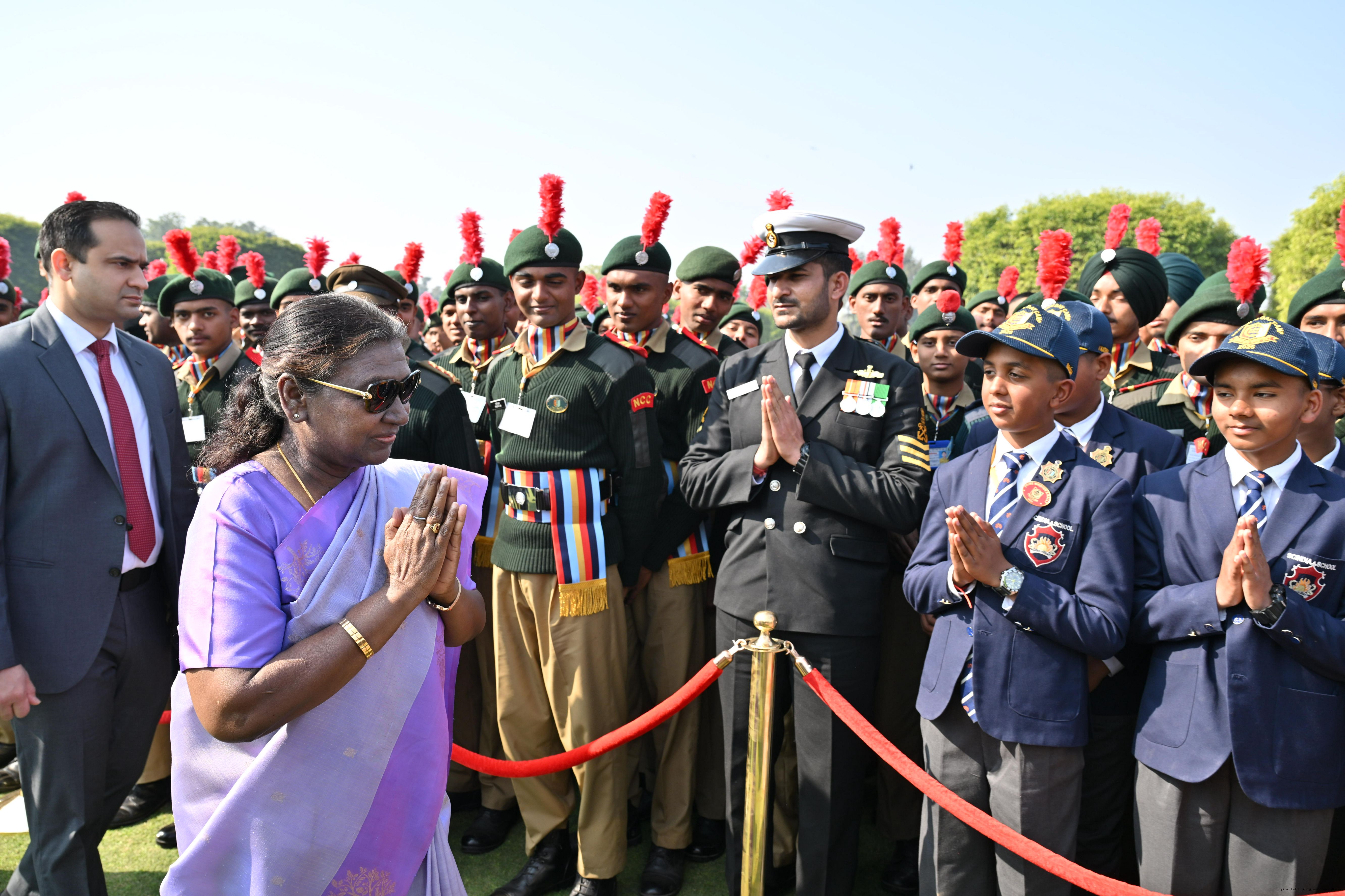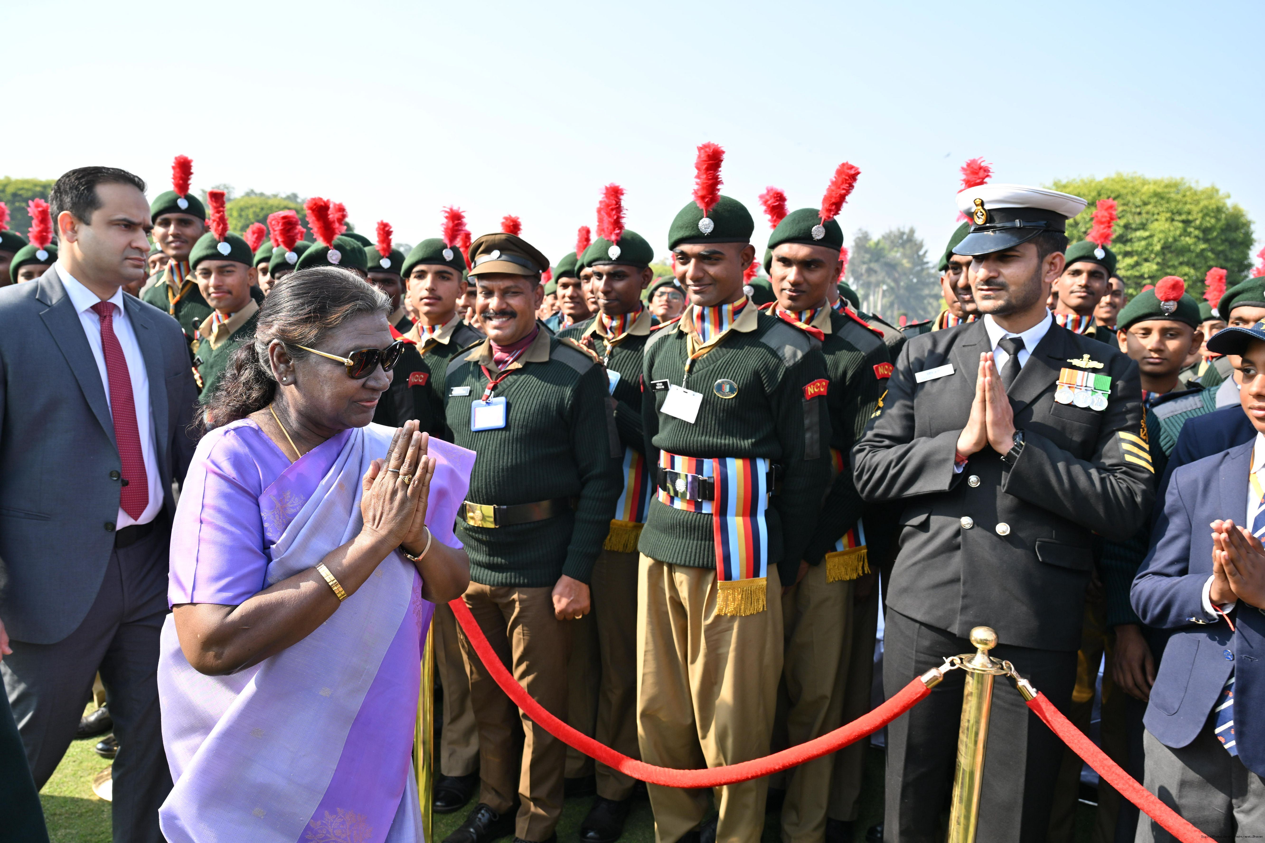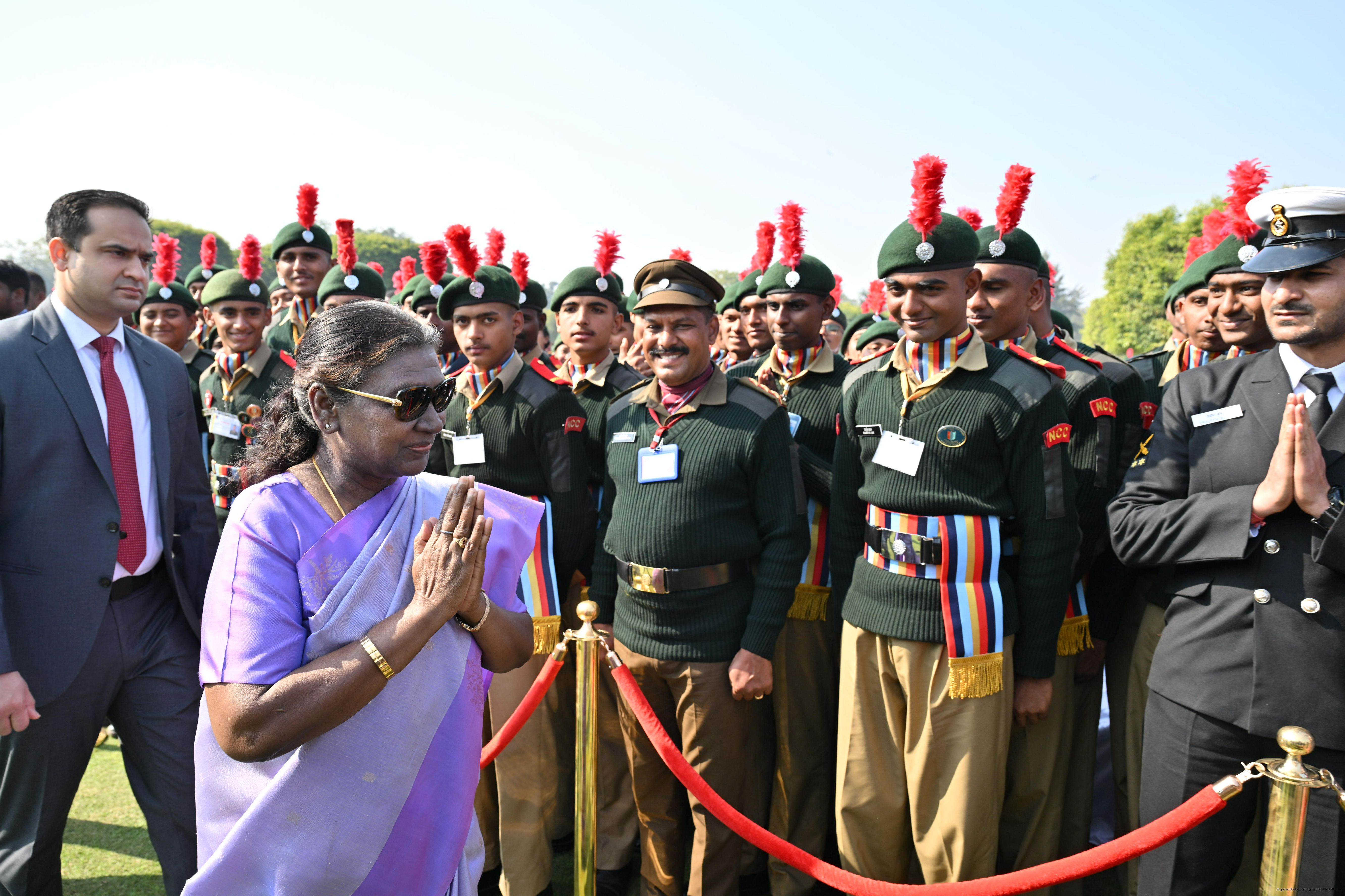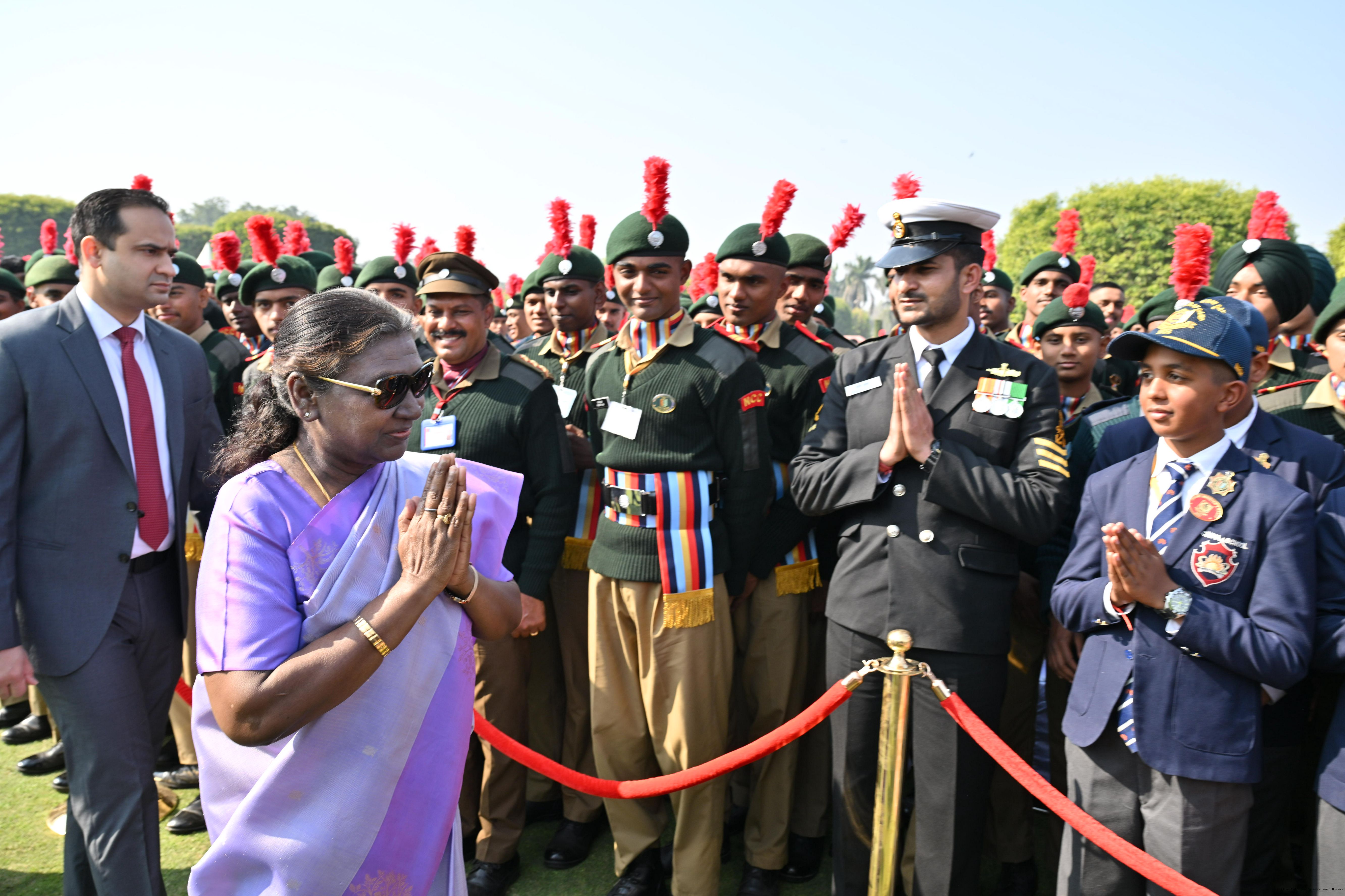 | Category: | The President met and posing a group photographs tribal guests, tableaux artistes and tractor drivers, NSS volunteers and NCC cadets, officials 28-01-2025 |
