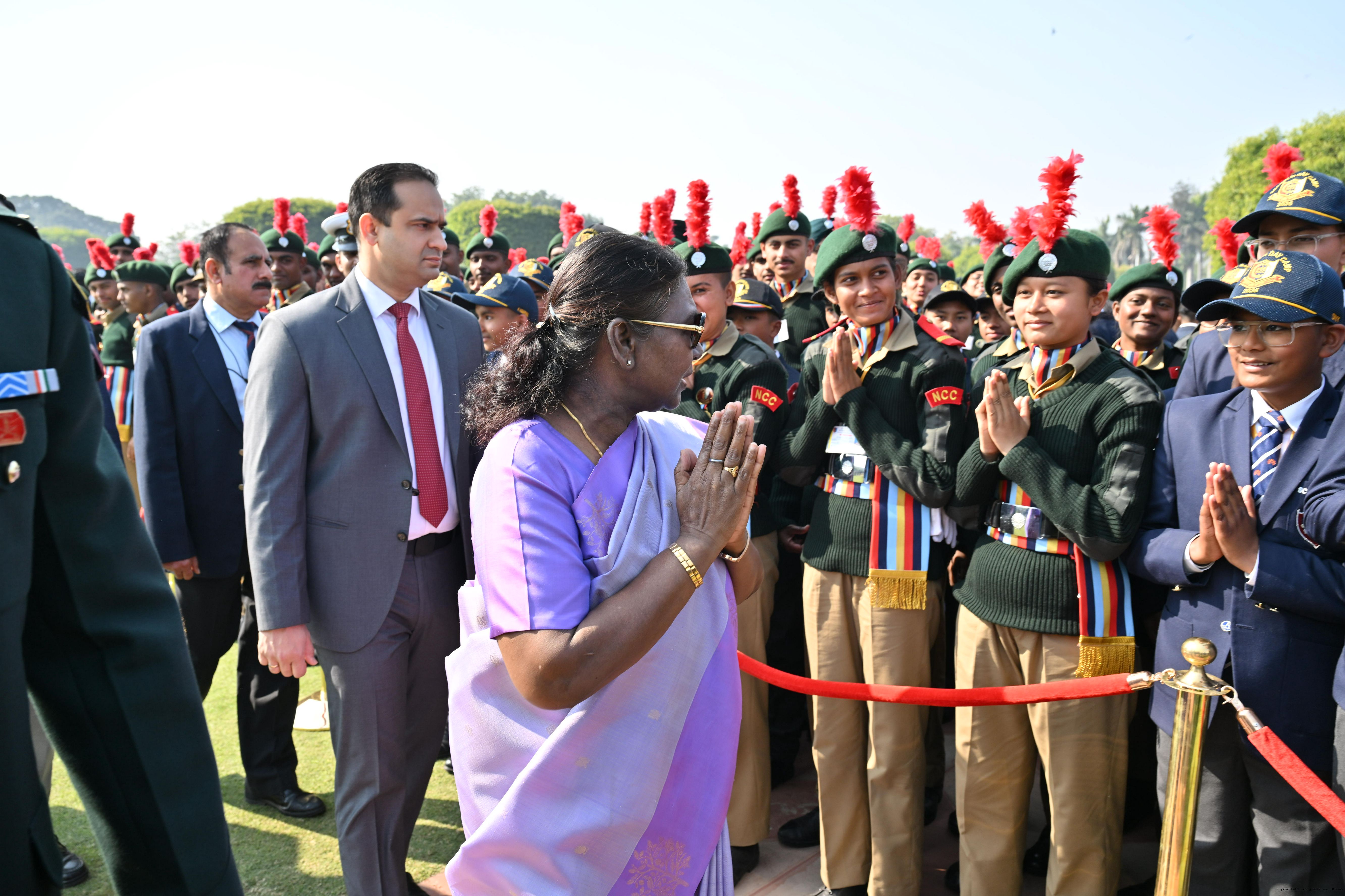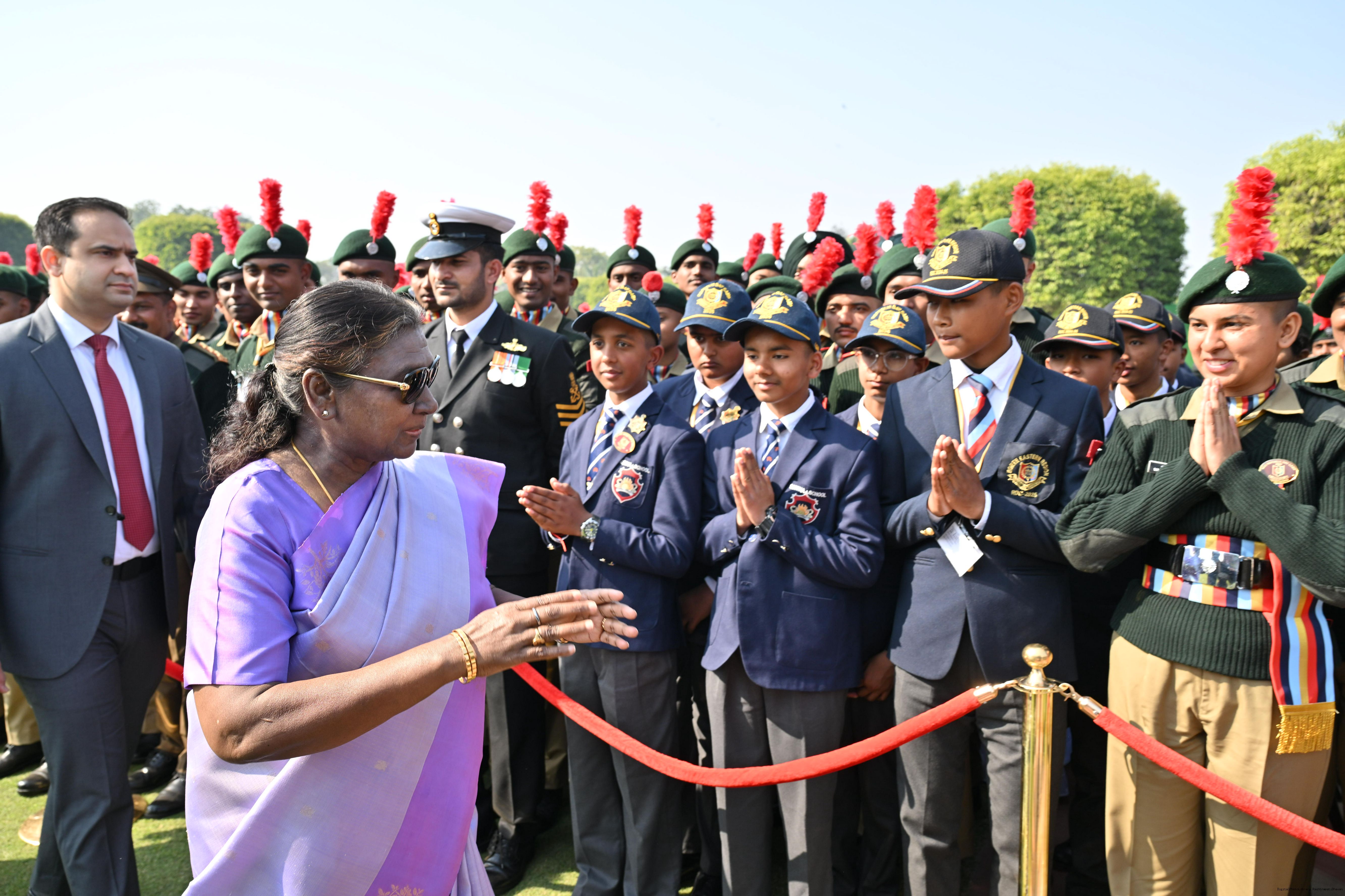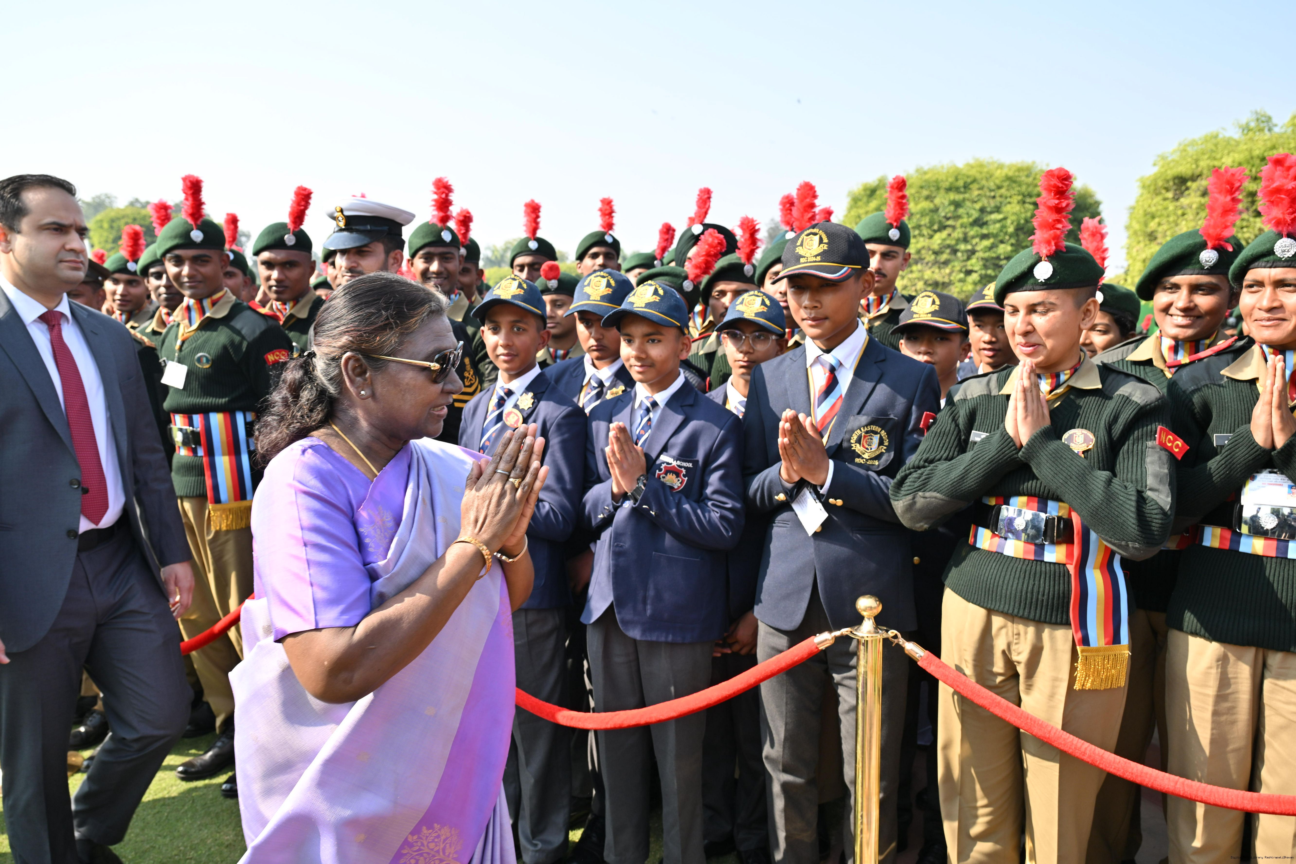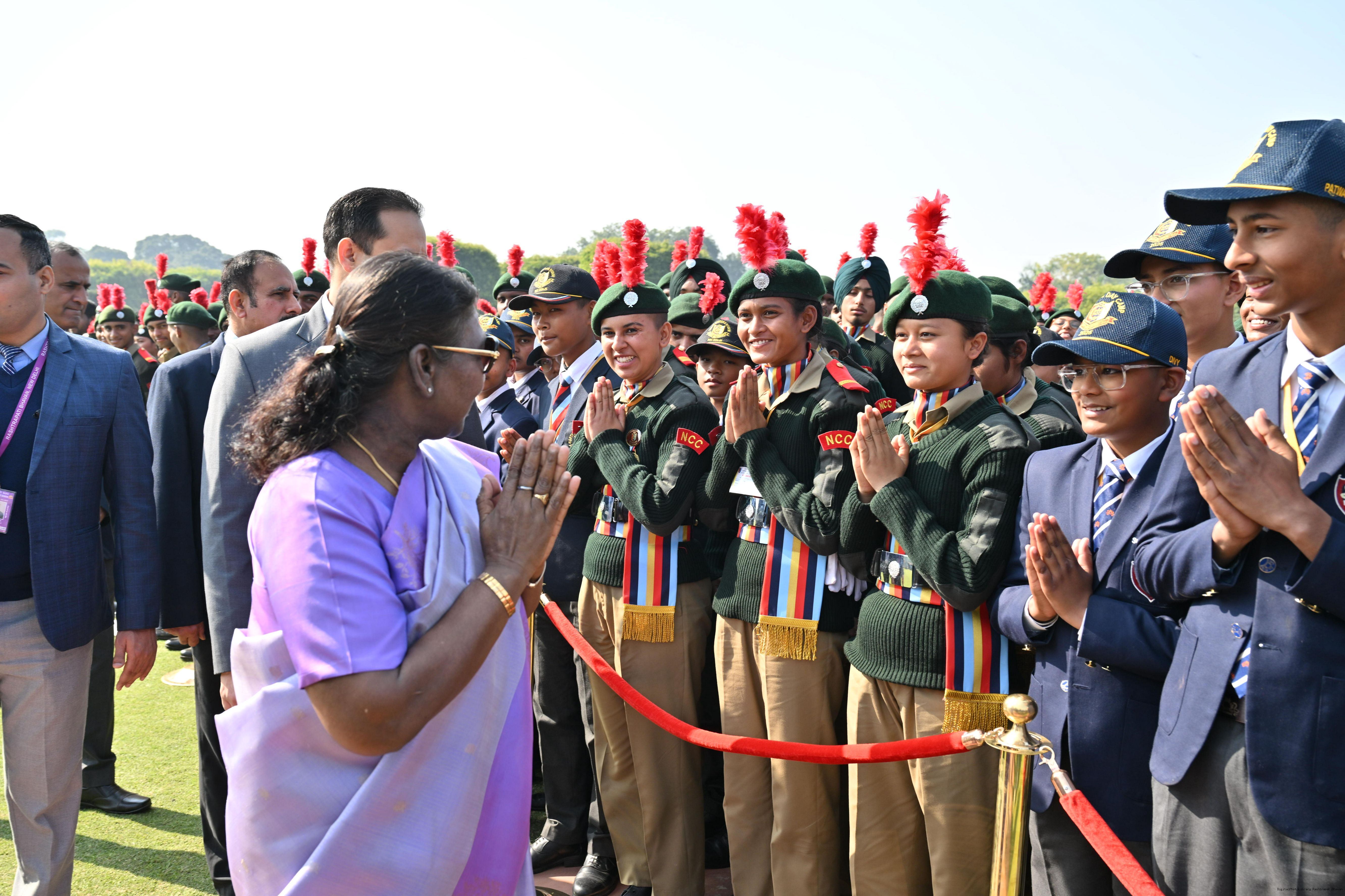 | Category: | The President met and posing a group photographs tribal guests, tableaux artistes and tractor drivers, NSS volunteers and NCC cadets, officials 28-01-2025 |
