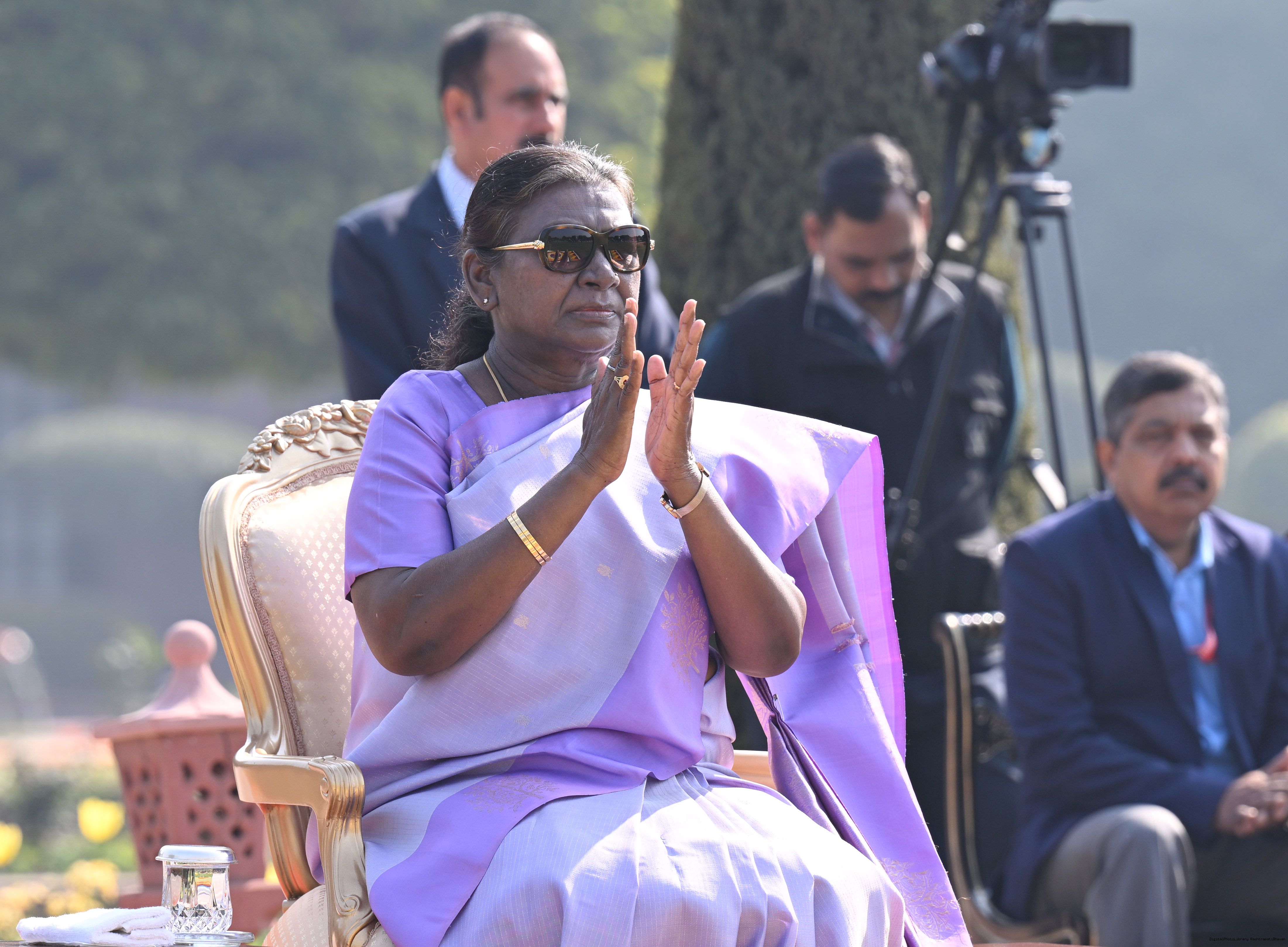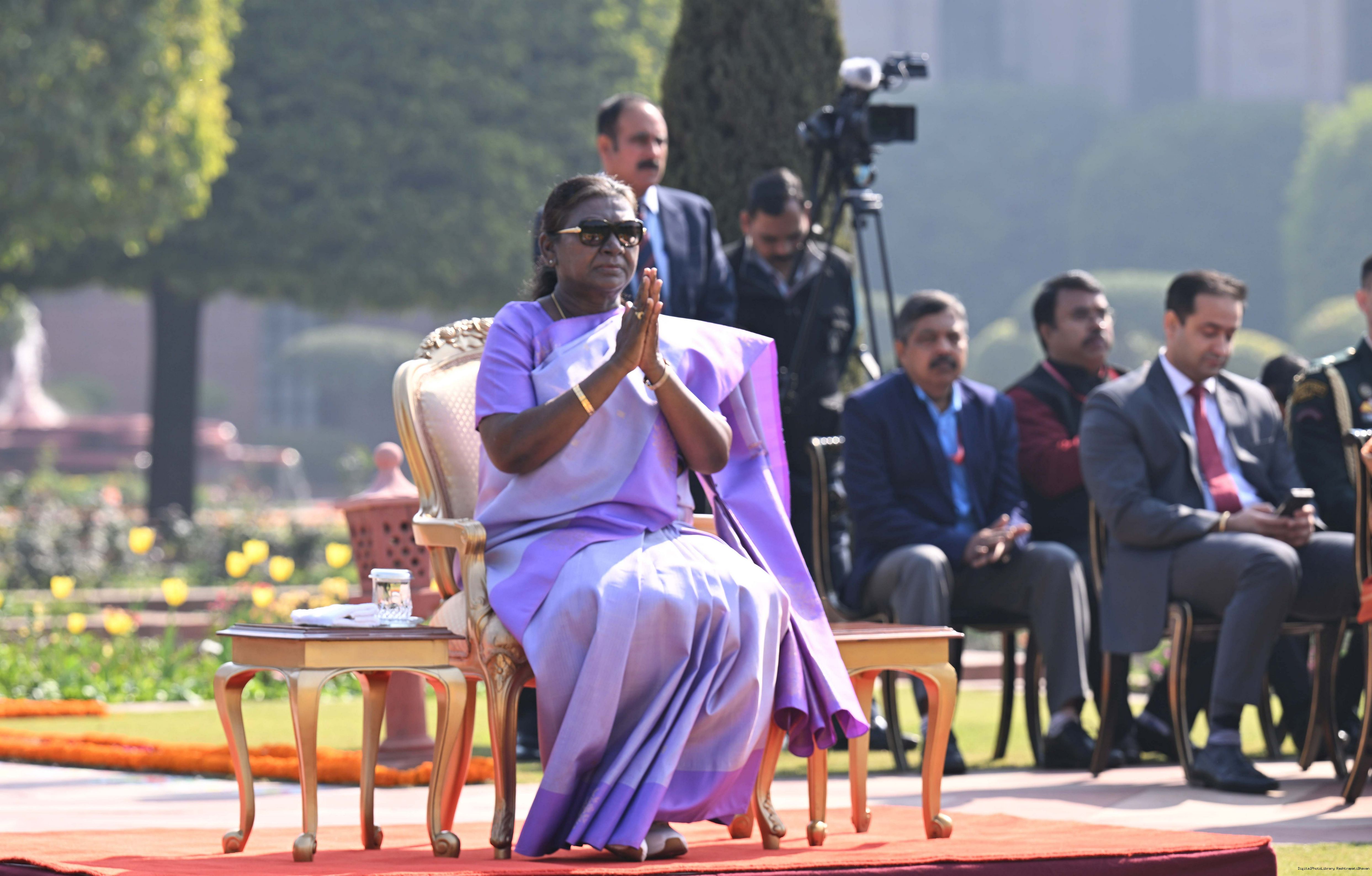 | Caption: | The President of India, Smt. Droupadi Murmu met and posing a group photographs tribal guests, tableaux artistes and tractor drivers, NSS volunteers and NCC cadets, officials and other participants of the Republic Day Parade 2025, at Rashtrapati Bhavan on January 28, 2025. |