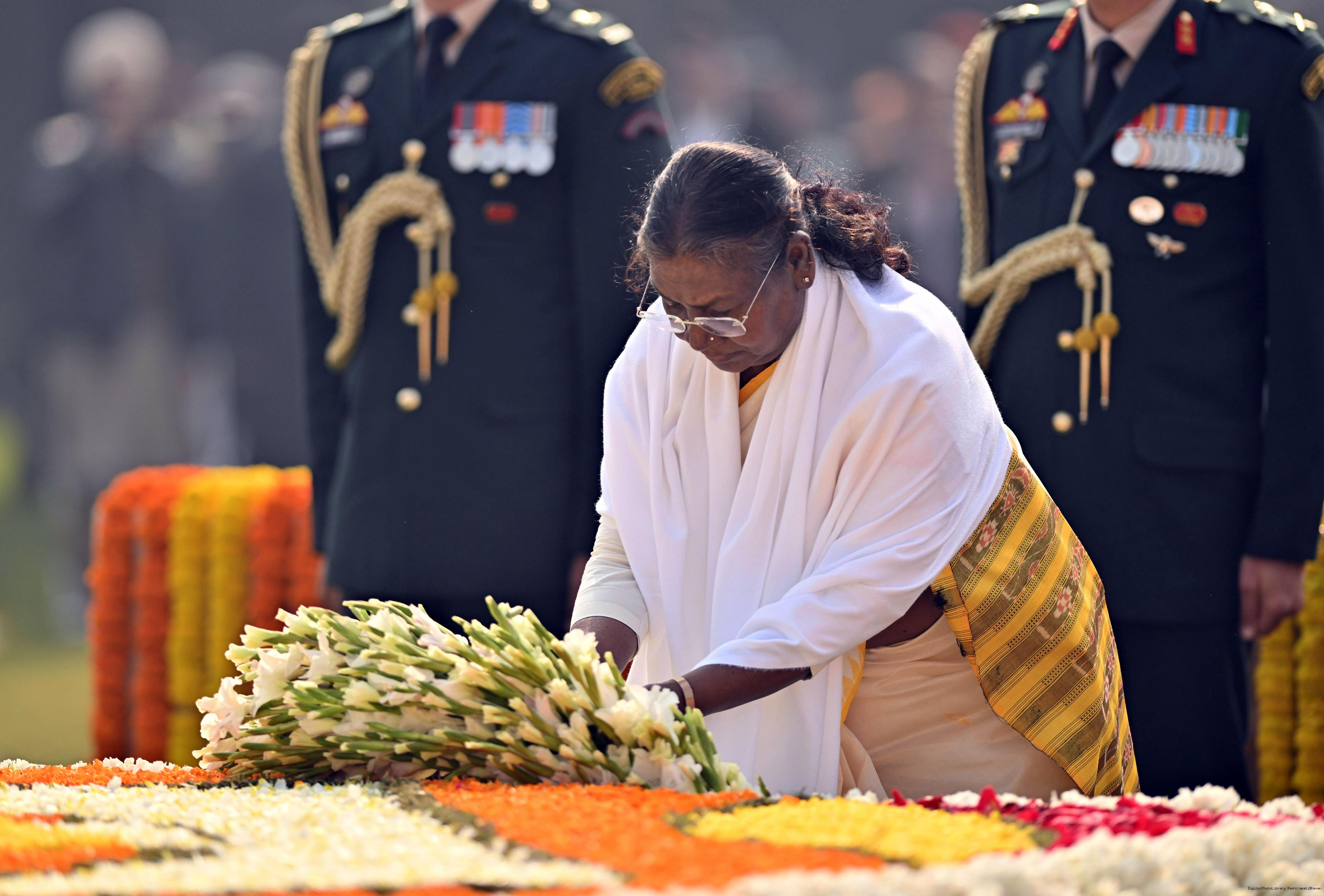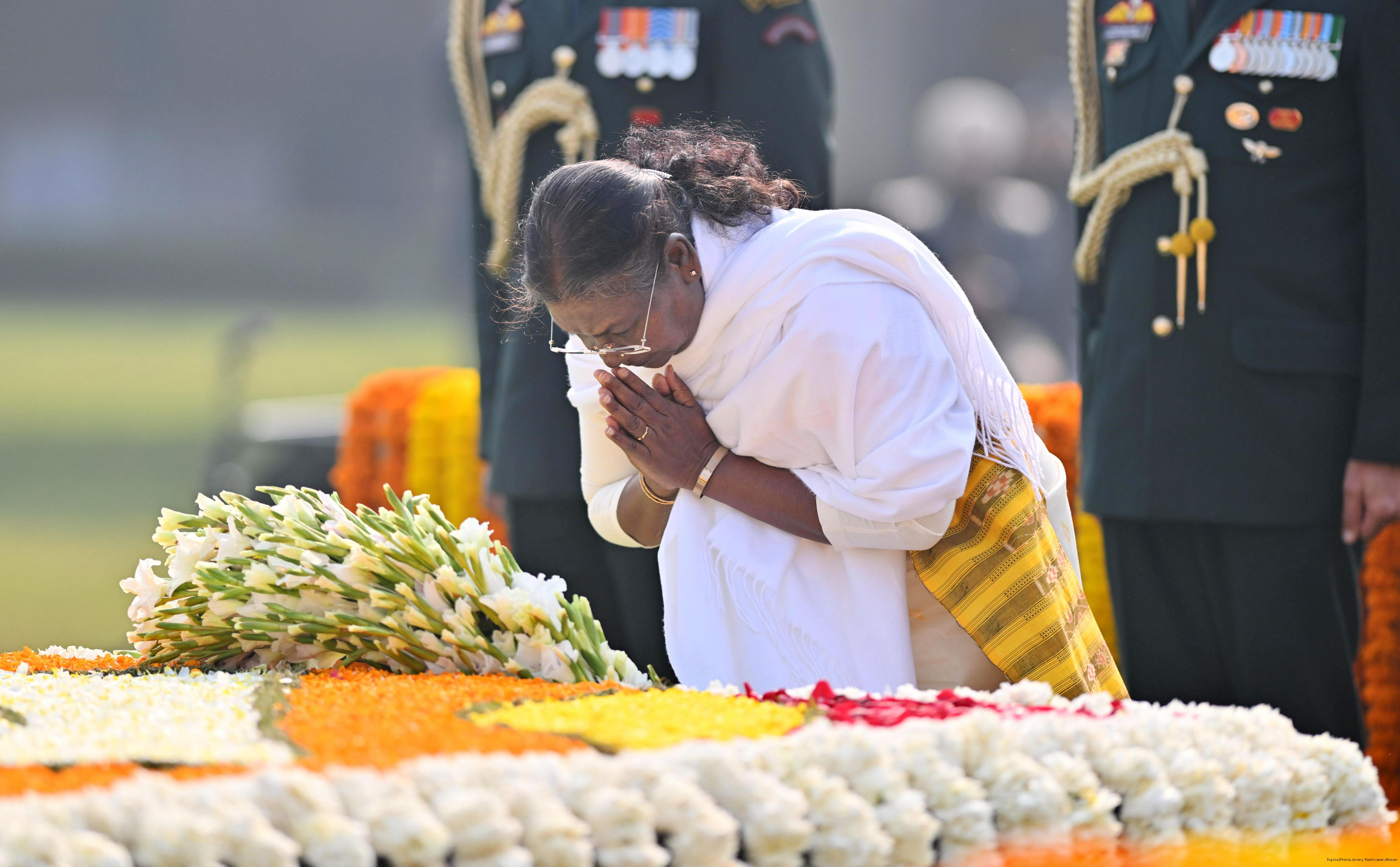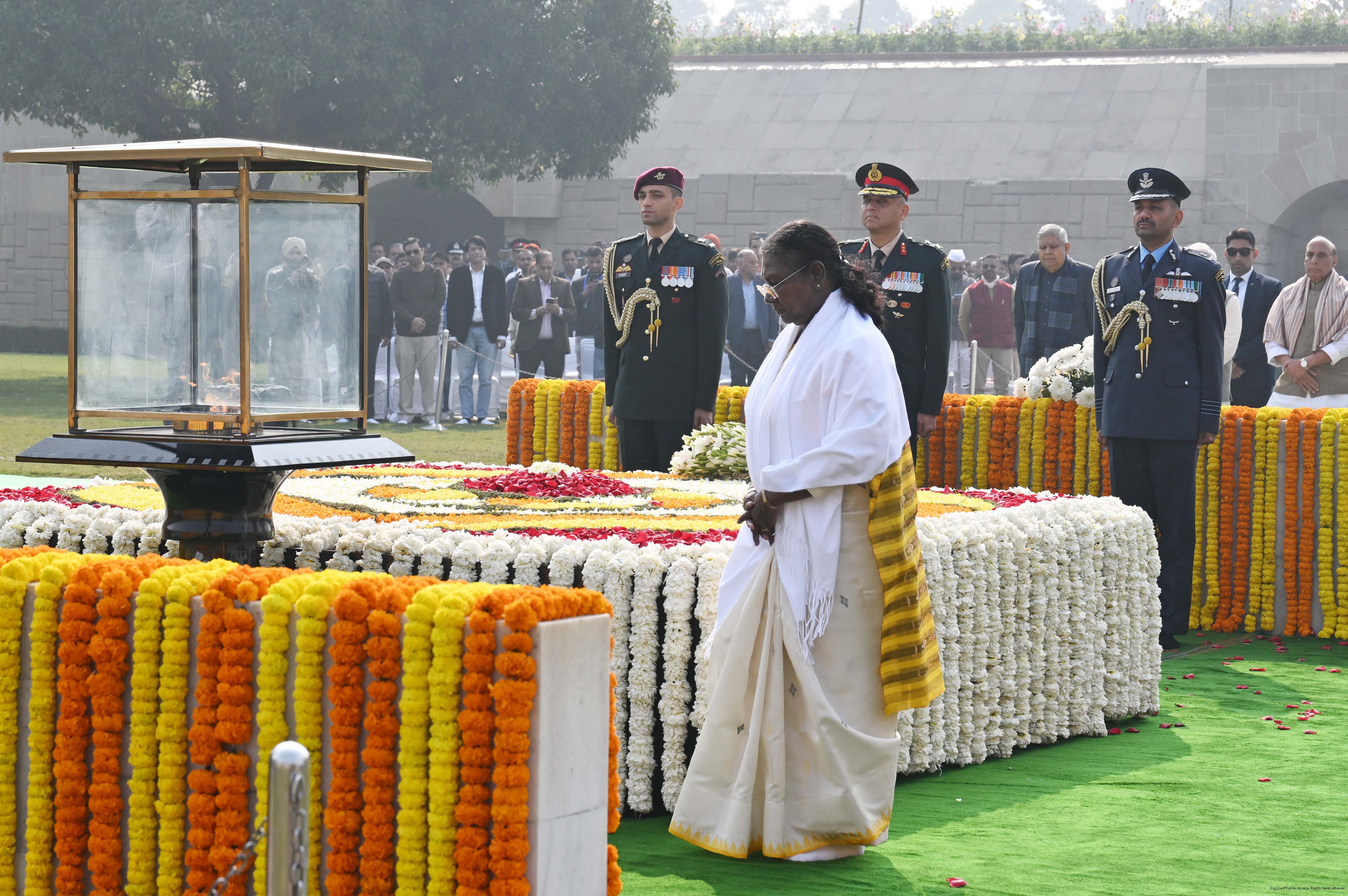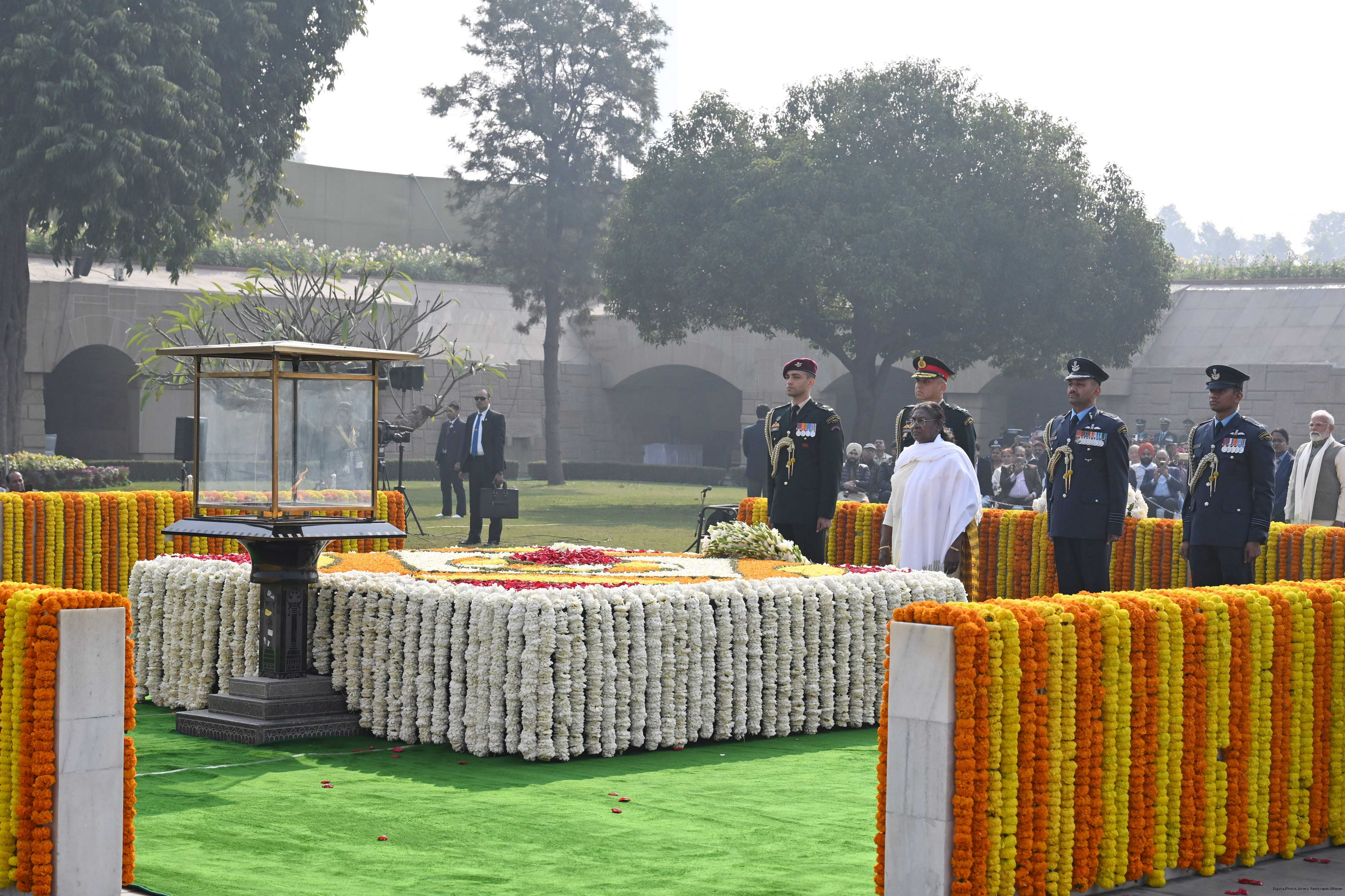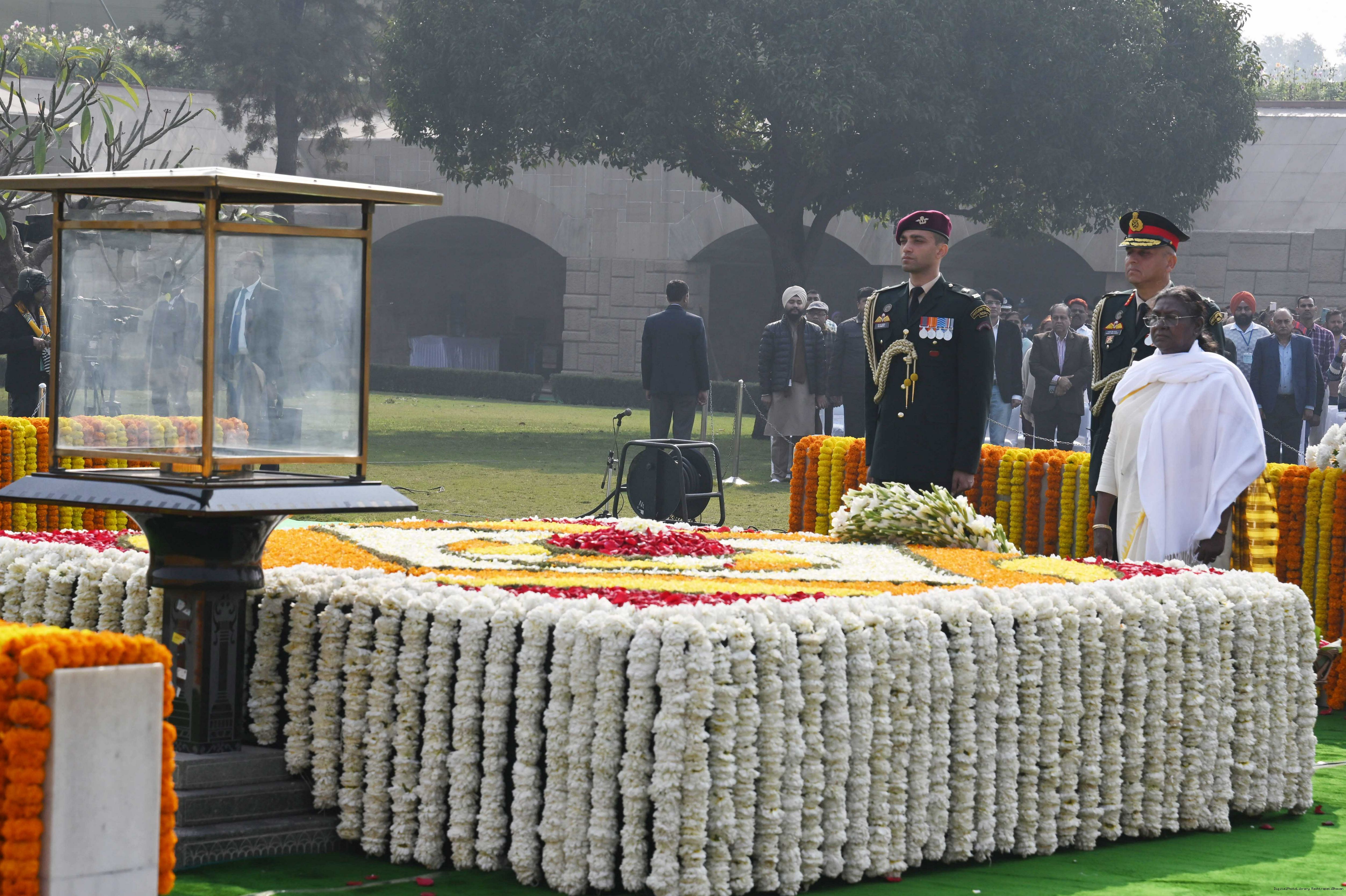 | Caption: | The President of India Smt. Droupadi Murmu paid homage to Mahatma Gandhi on his 77th death anniversary and attended a Sarva Dharma Prarthana at Rajghat, New Delhi on January 30, 2025. |