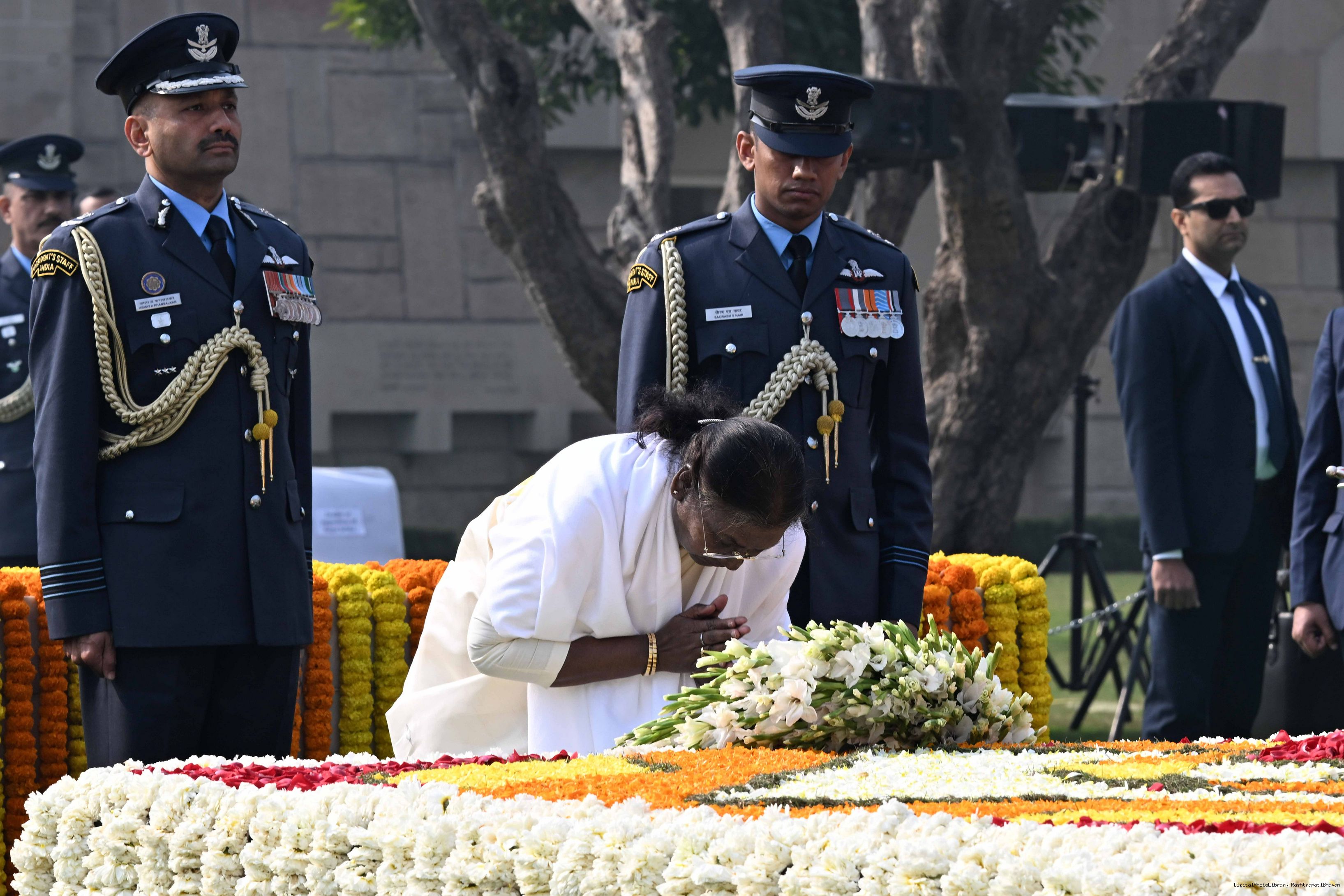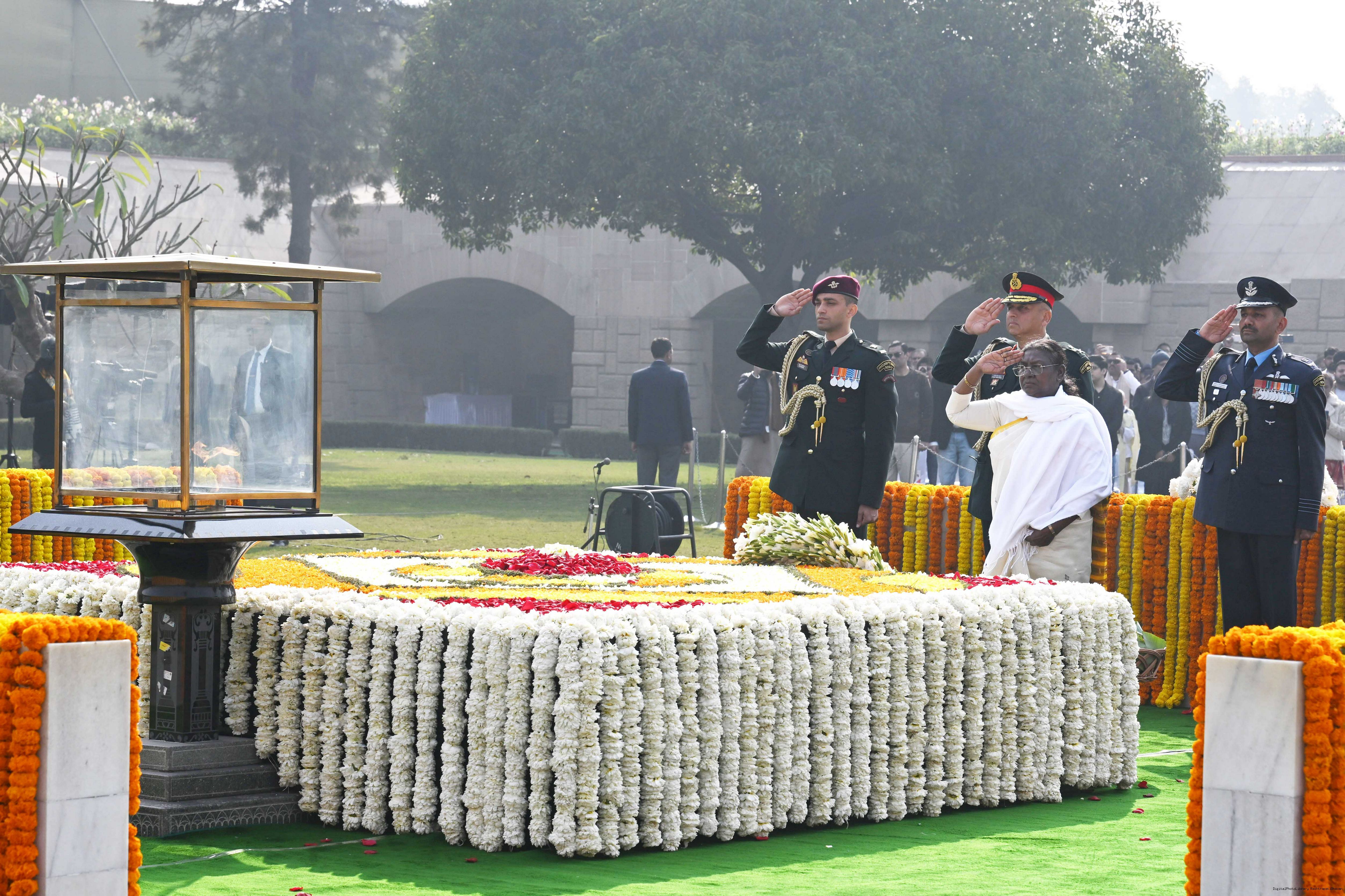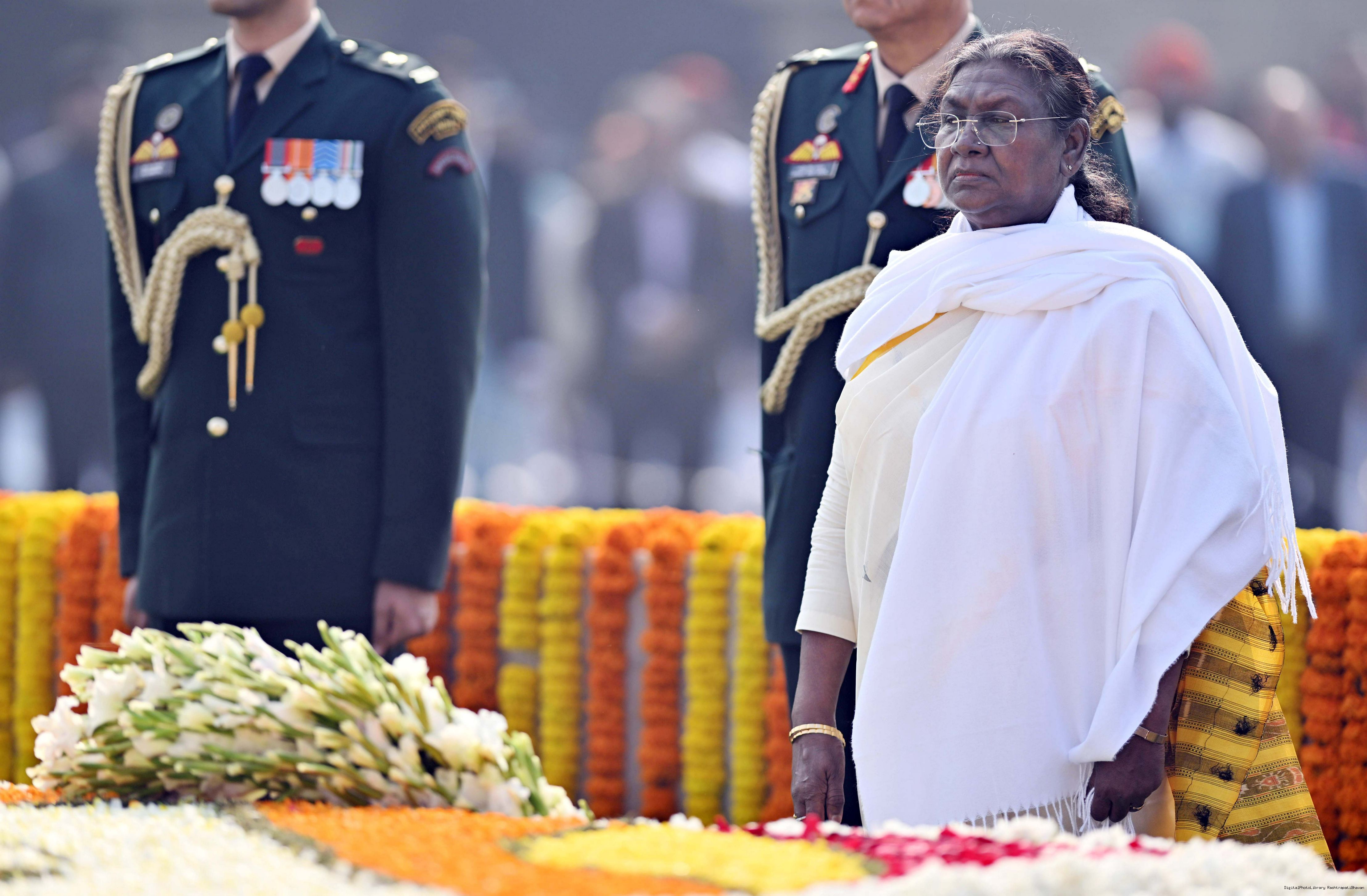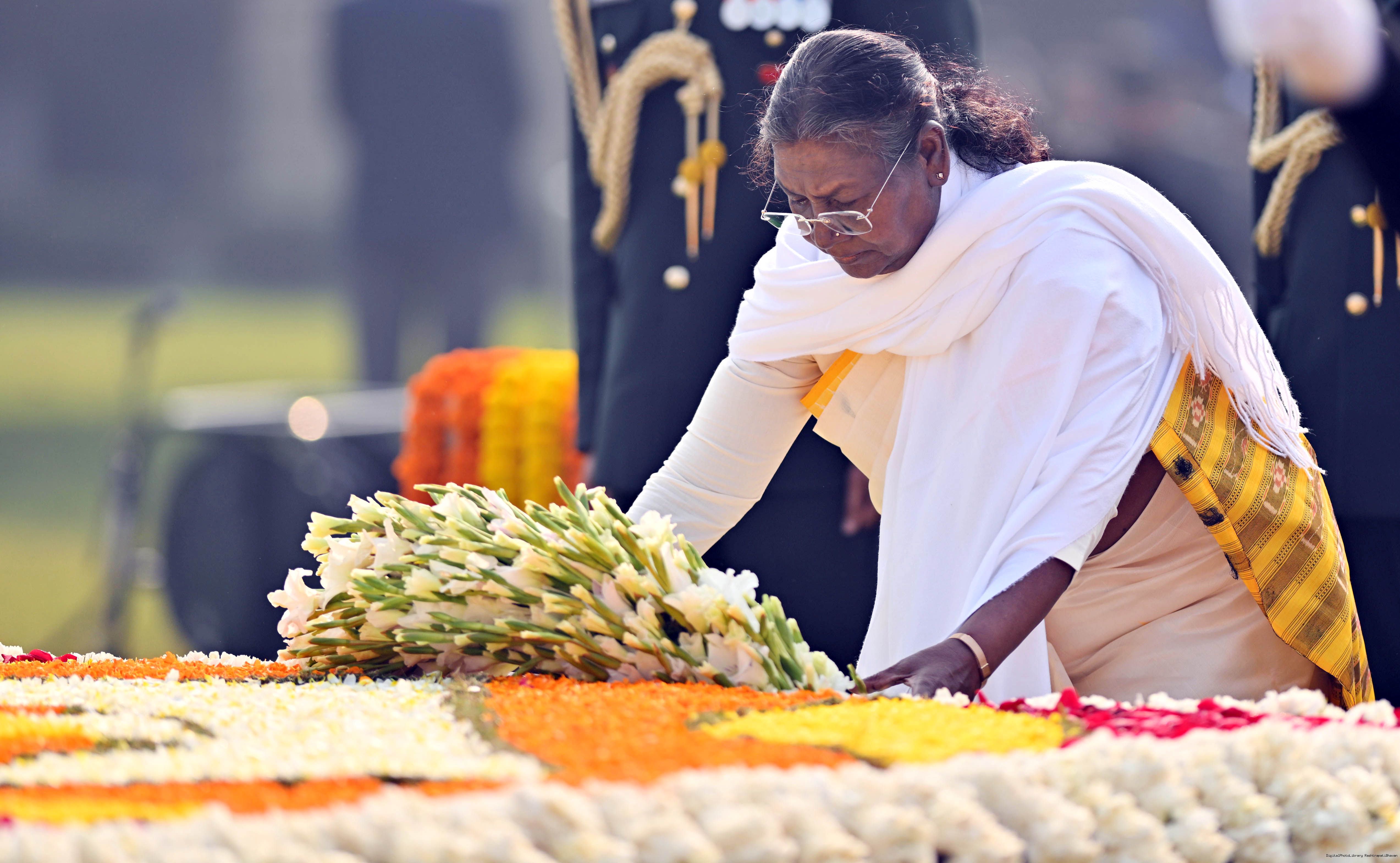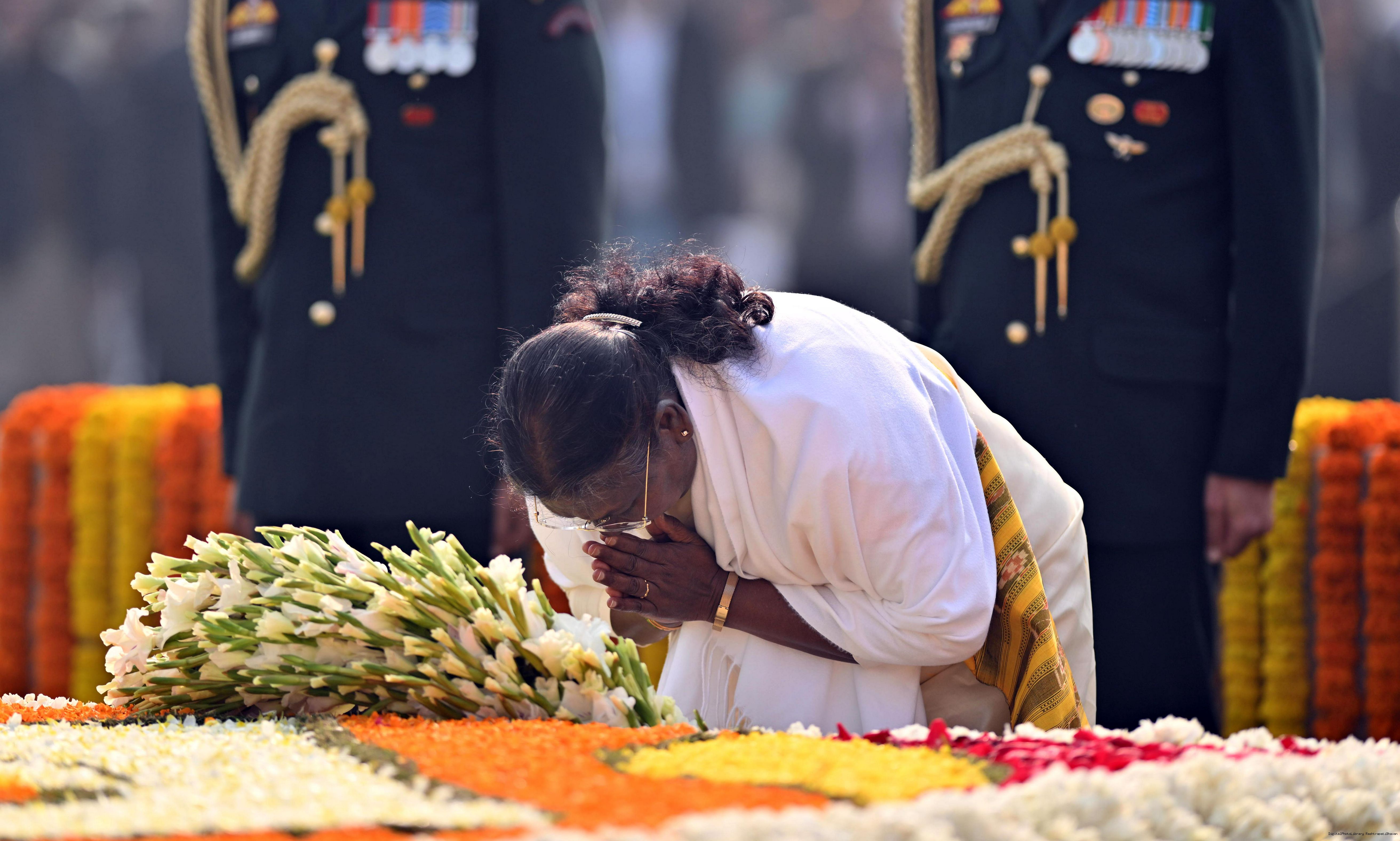 | Caption: | The President of India Smt. Droupadi Murmu paid homage to Mahatma Gandhi on his 77th death anniversary and attended a Sarva Dharma Prarthana at Rajghat, New Delhi on January 30, 2025. |