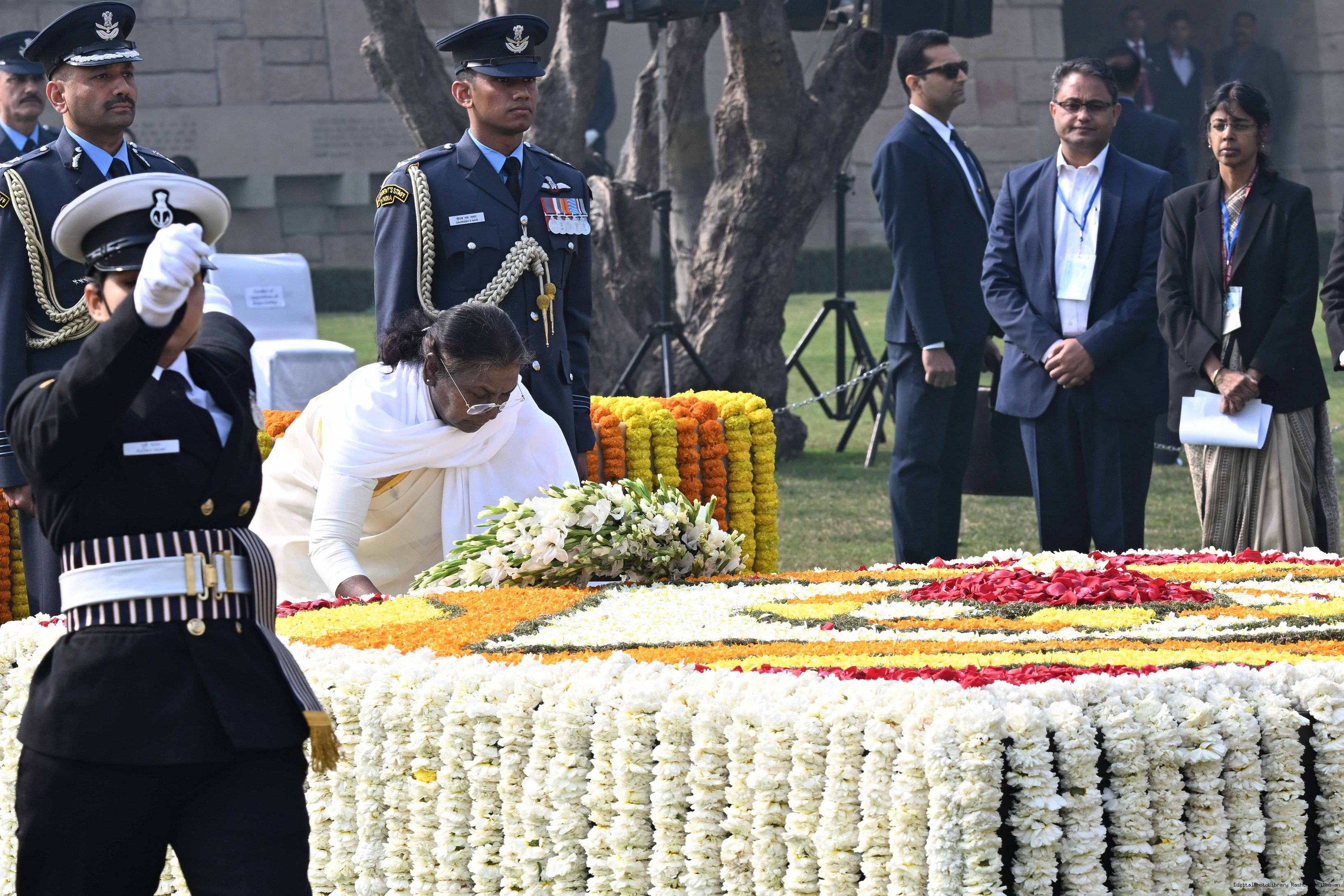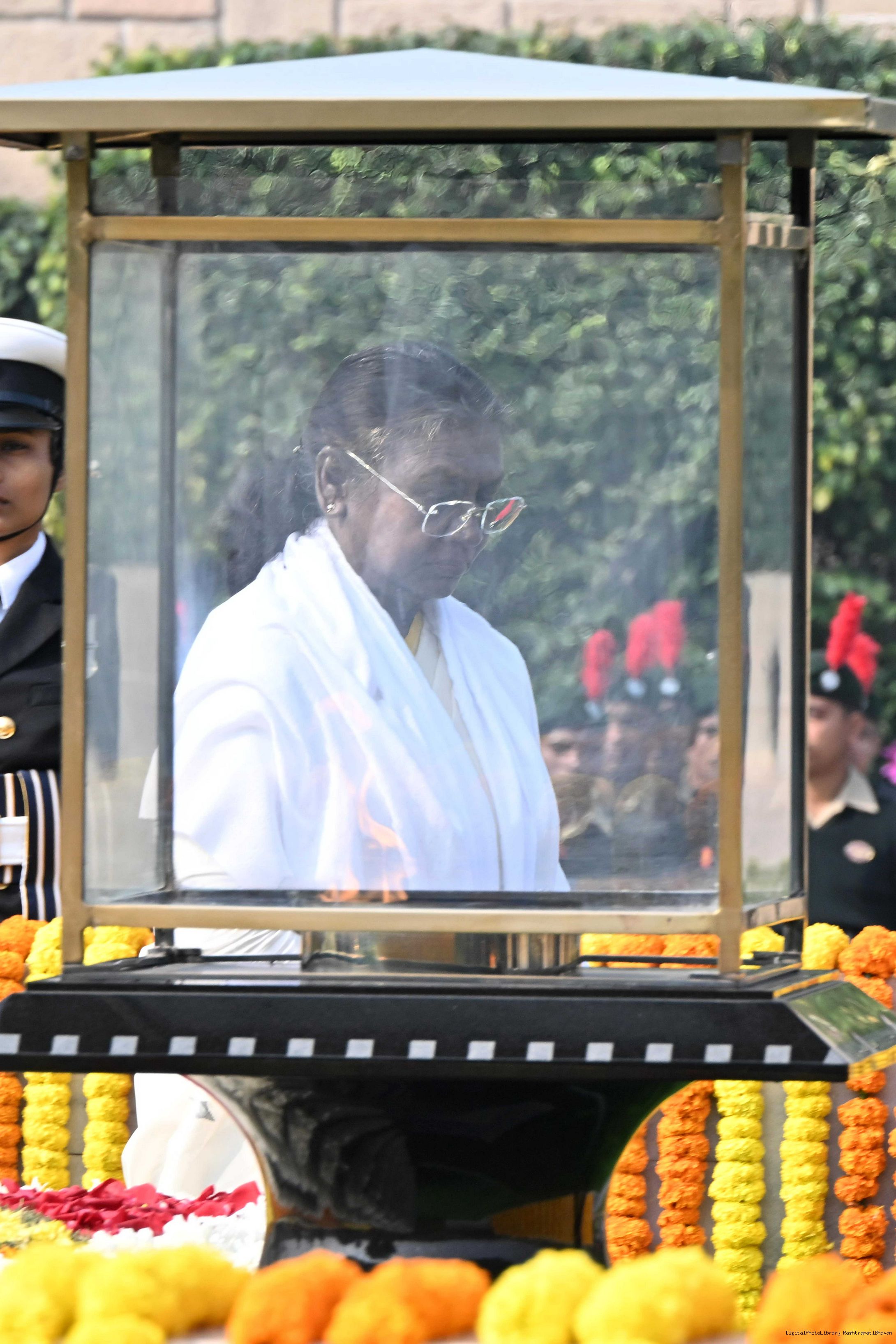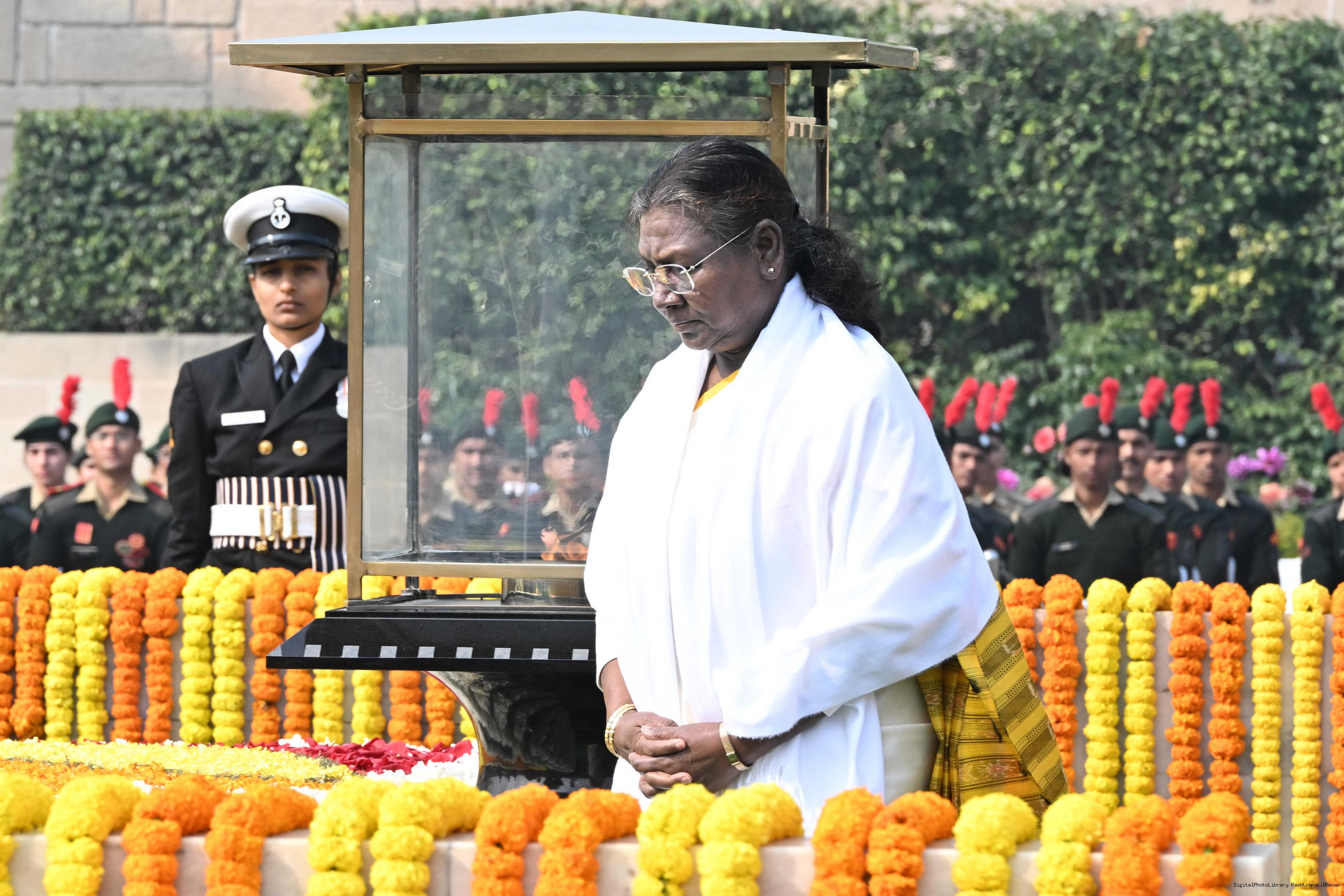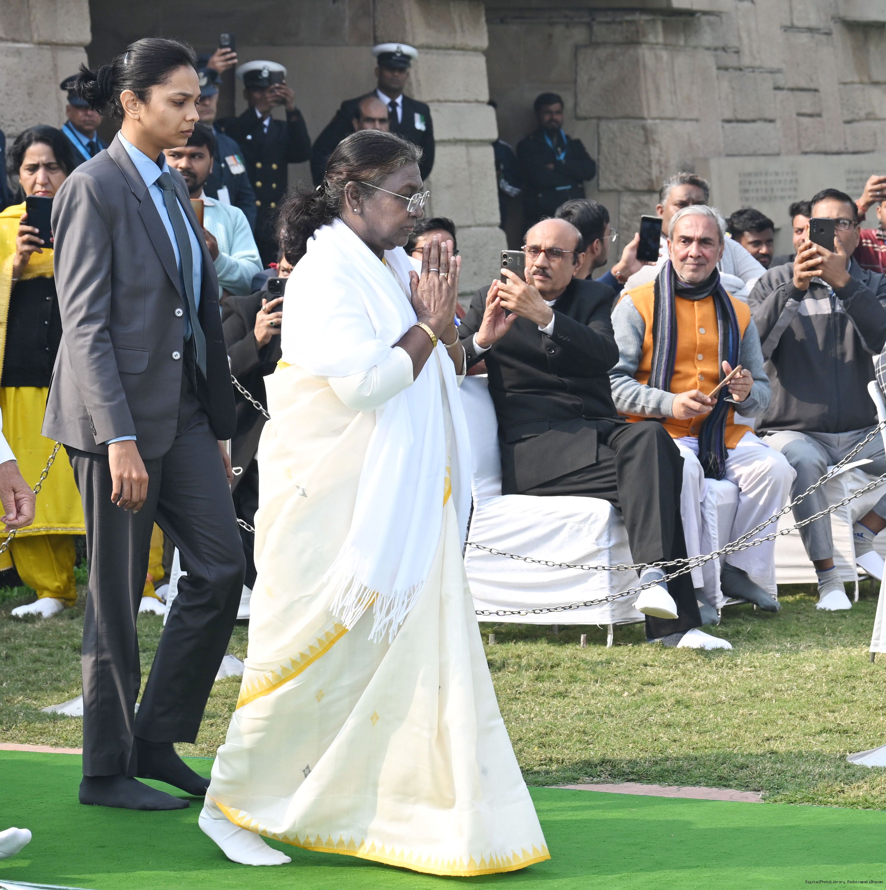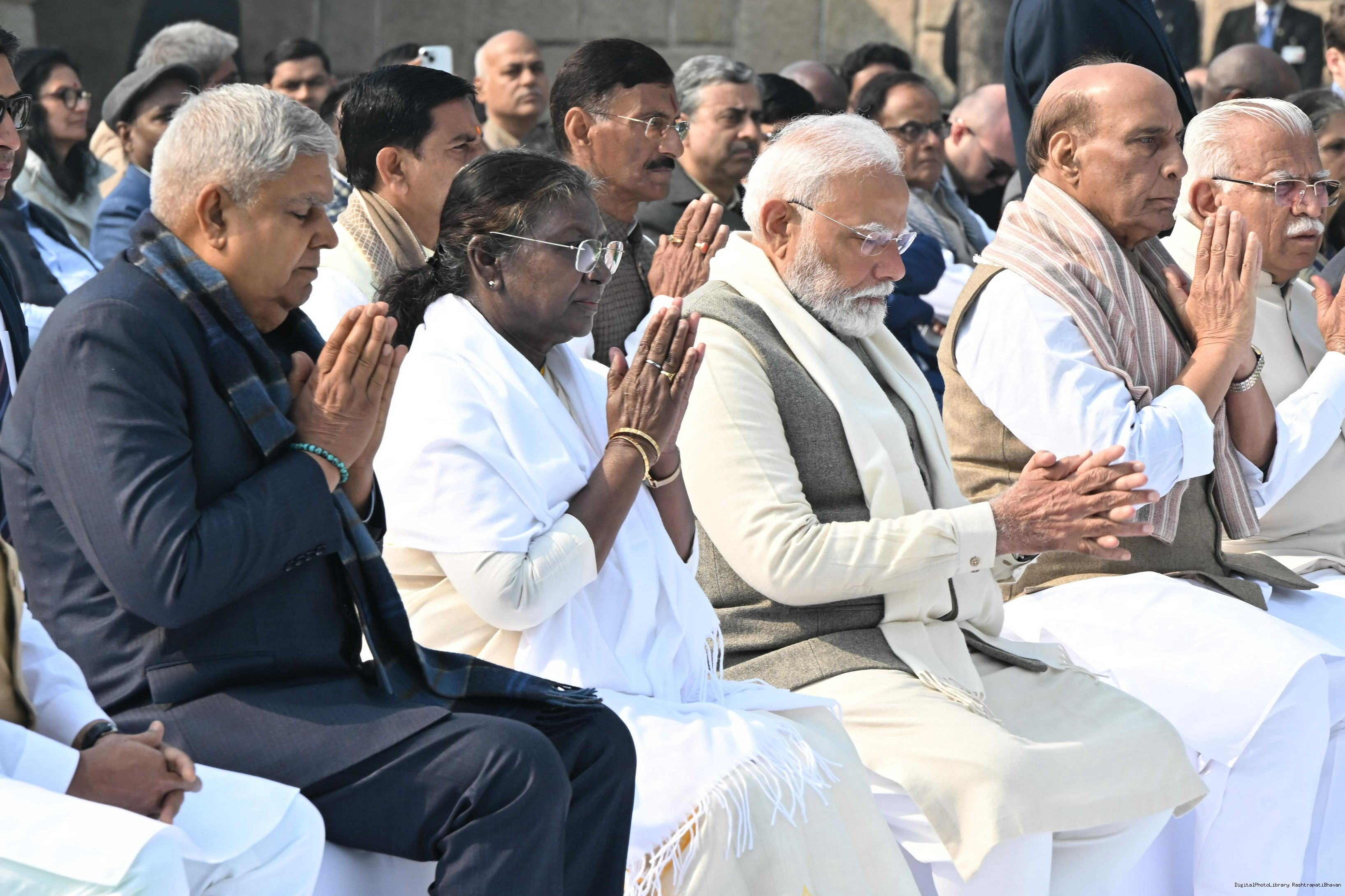 | Caption: | The President of India Smt. Droupadi Murmu paid homage to Mahatma Gandhi on his 77th death anniversary and attended a Sarva Dharma Prarthana at Rajghat, New Delhi on January 30, 2025. |