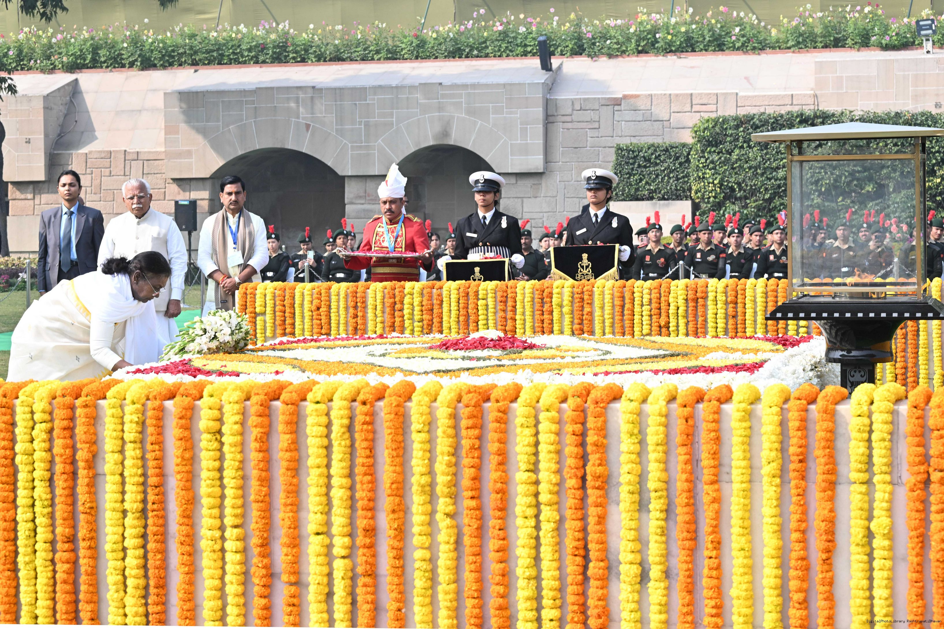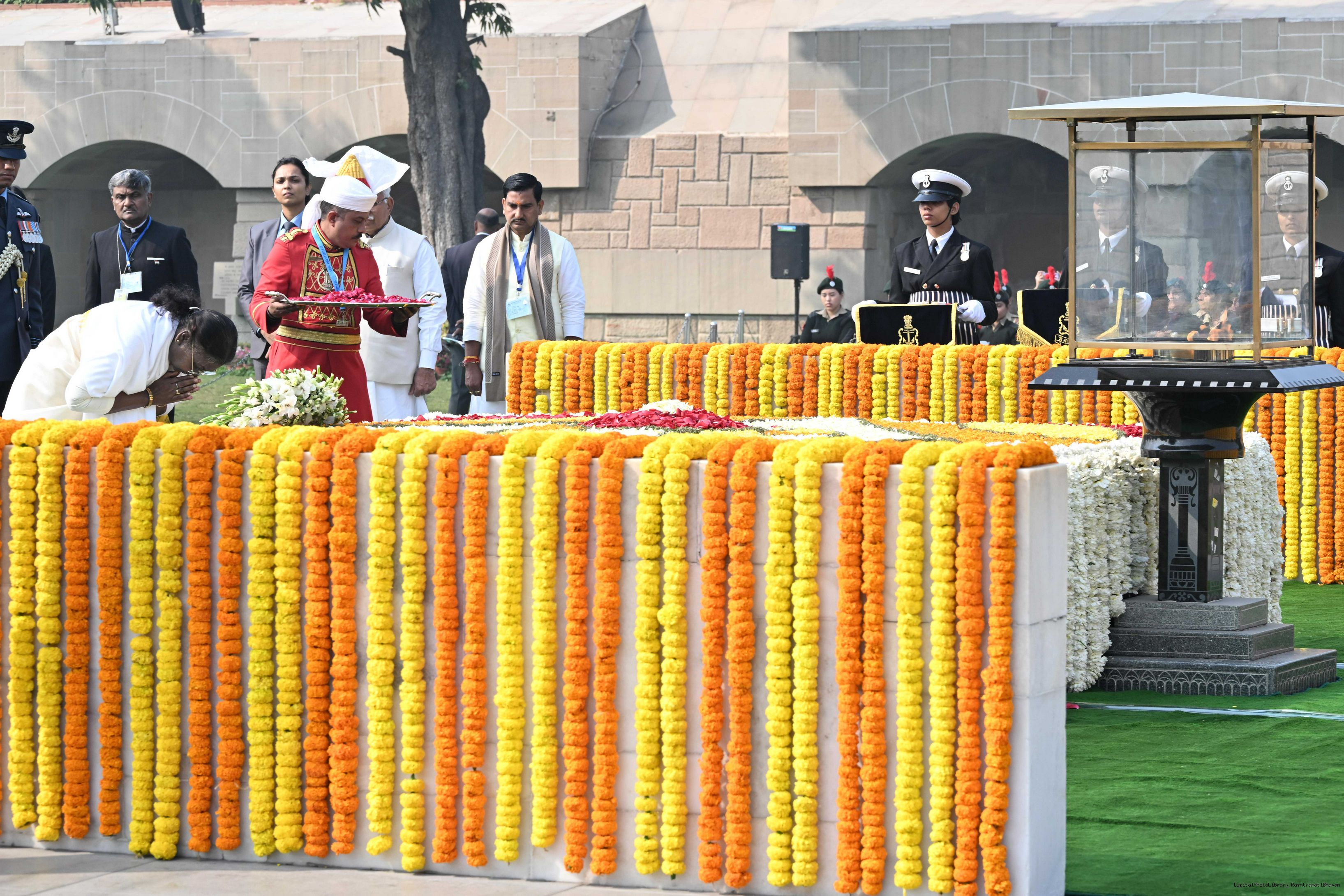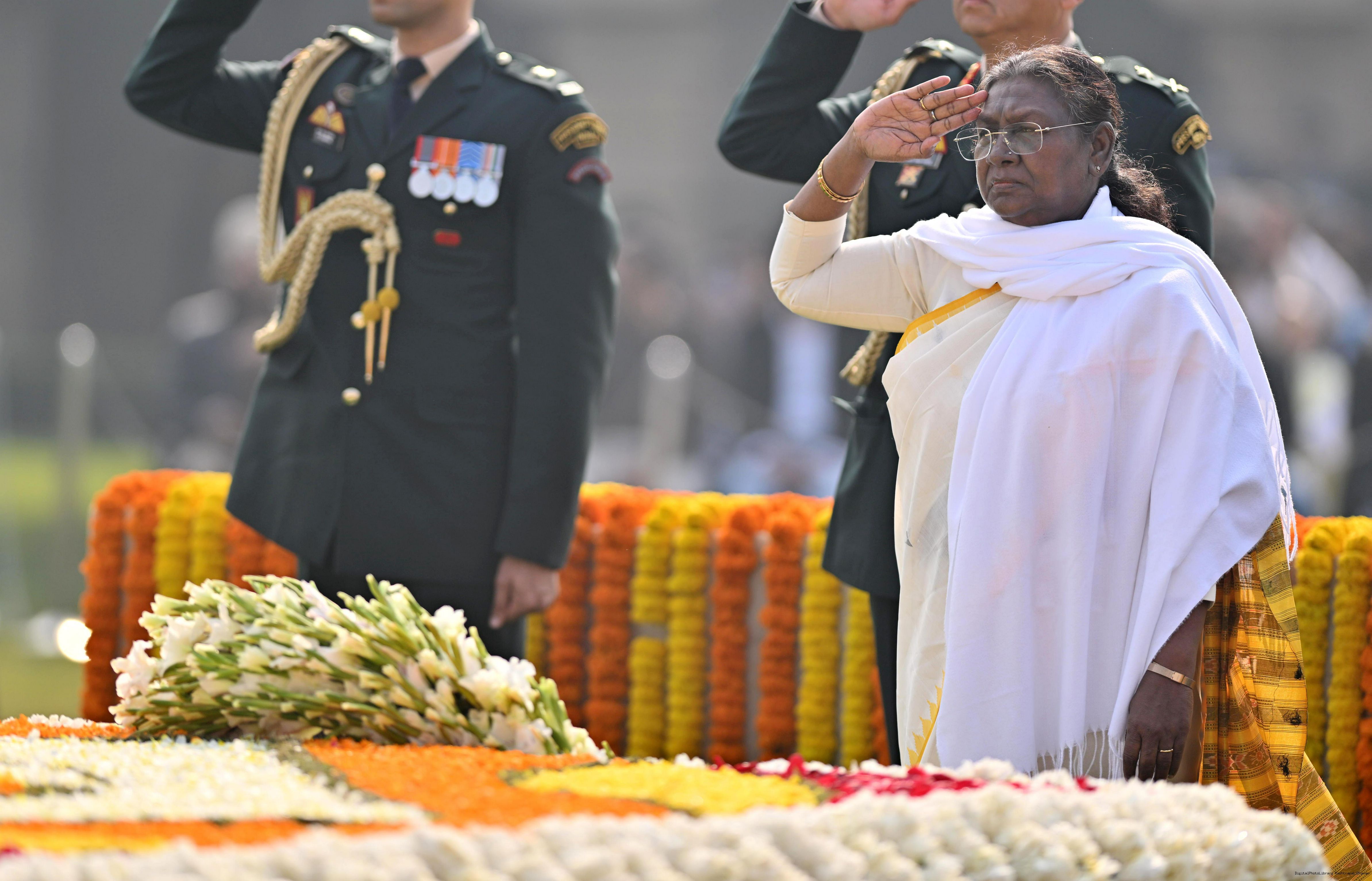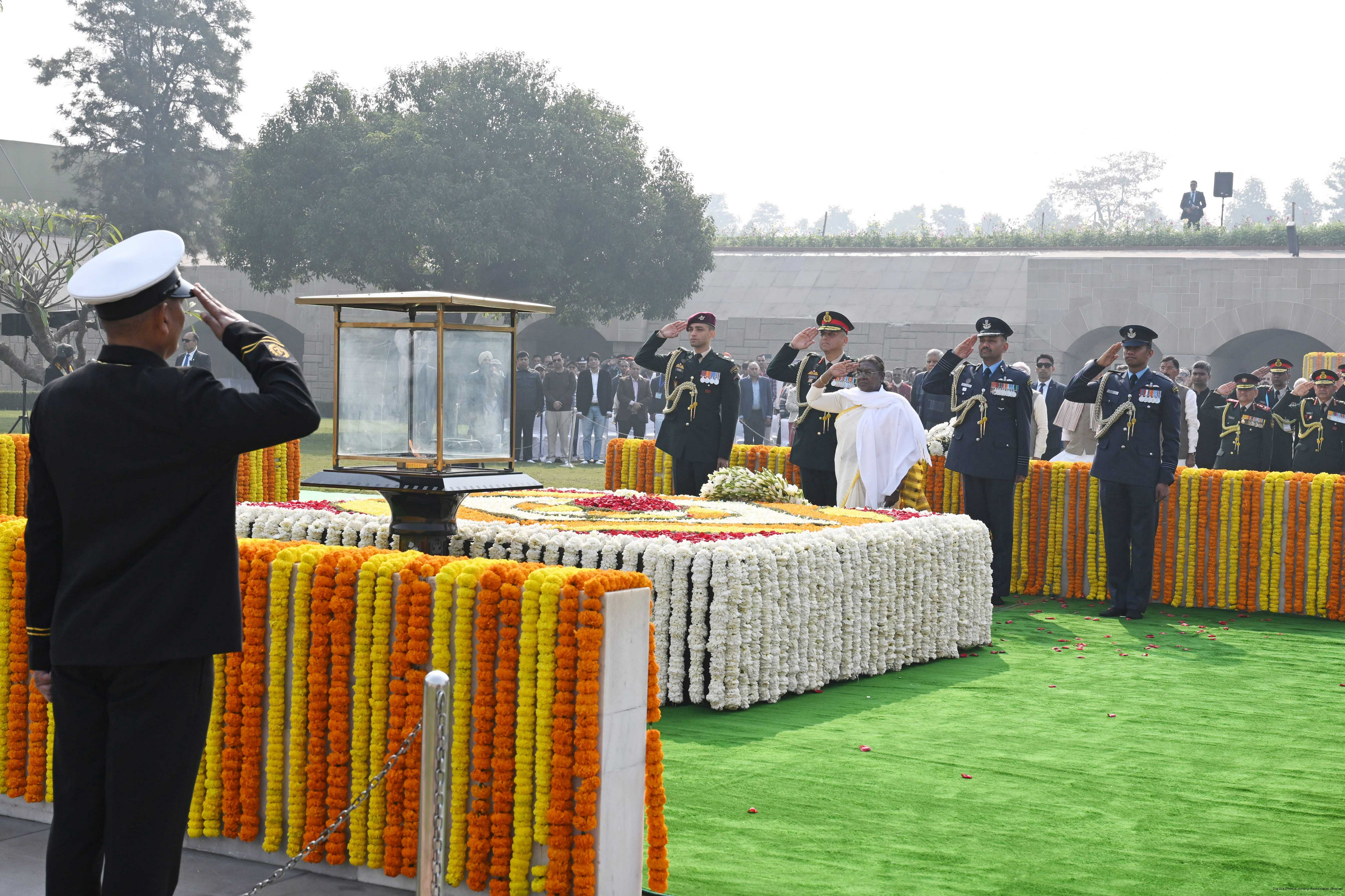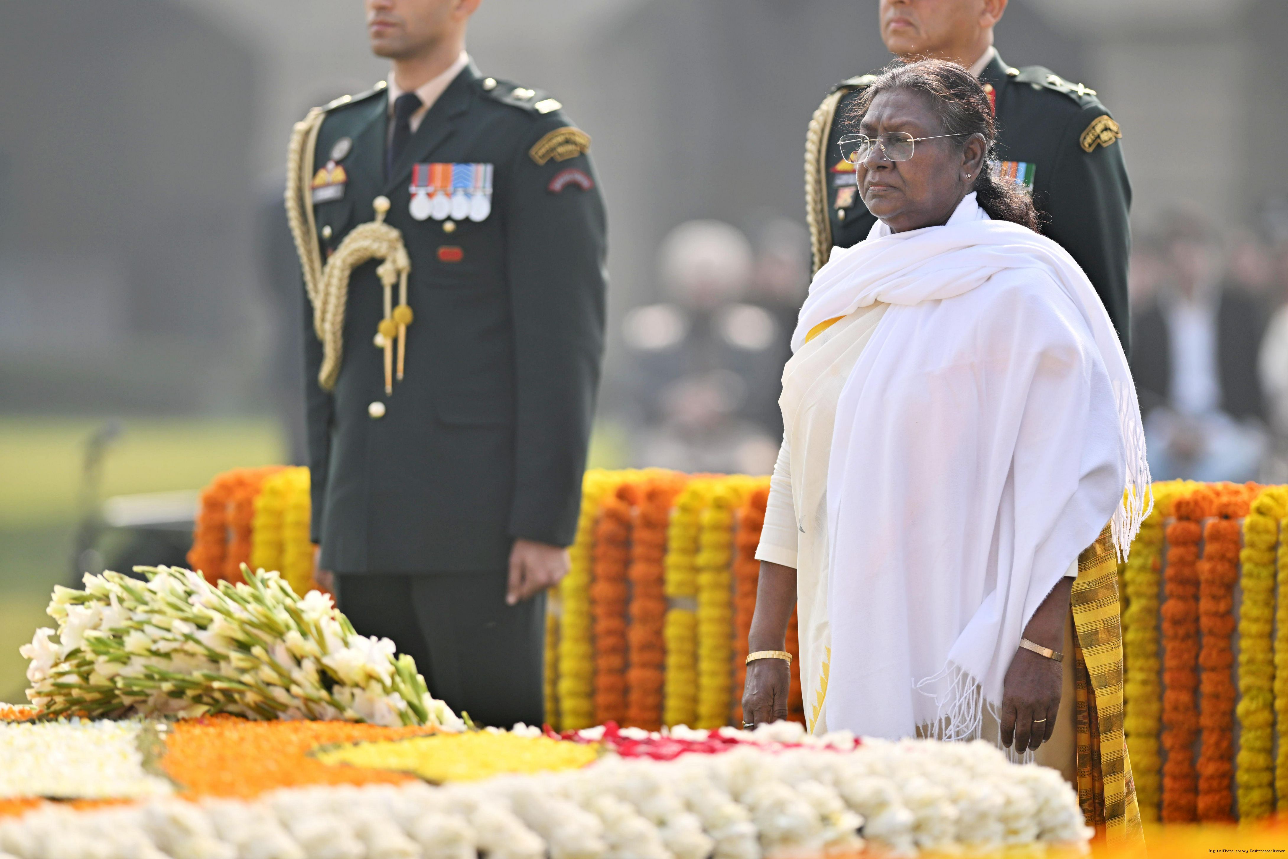 | Caption: | The President of India Smt. Droupadi Murmu paid homage to Mahatma Gandhi on his 77th death anniversary and attended a Sarva Dharma Prarthana at Rajghat, New Delhi on January 30, 2025. |