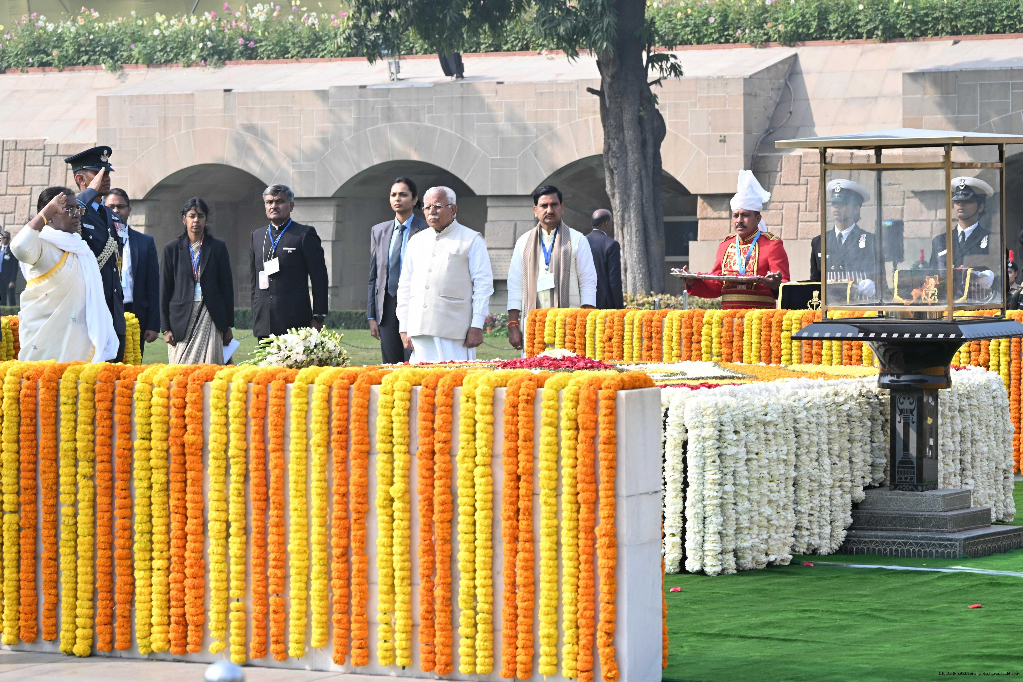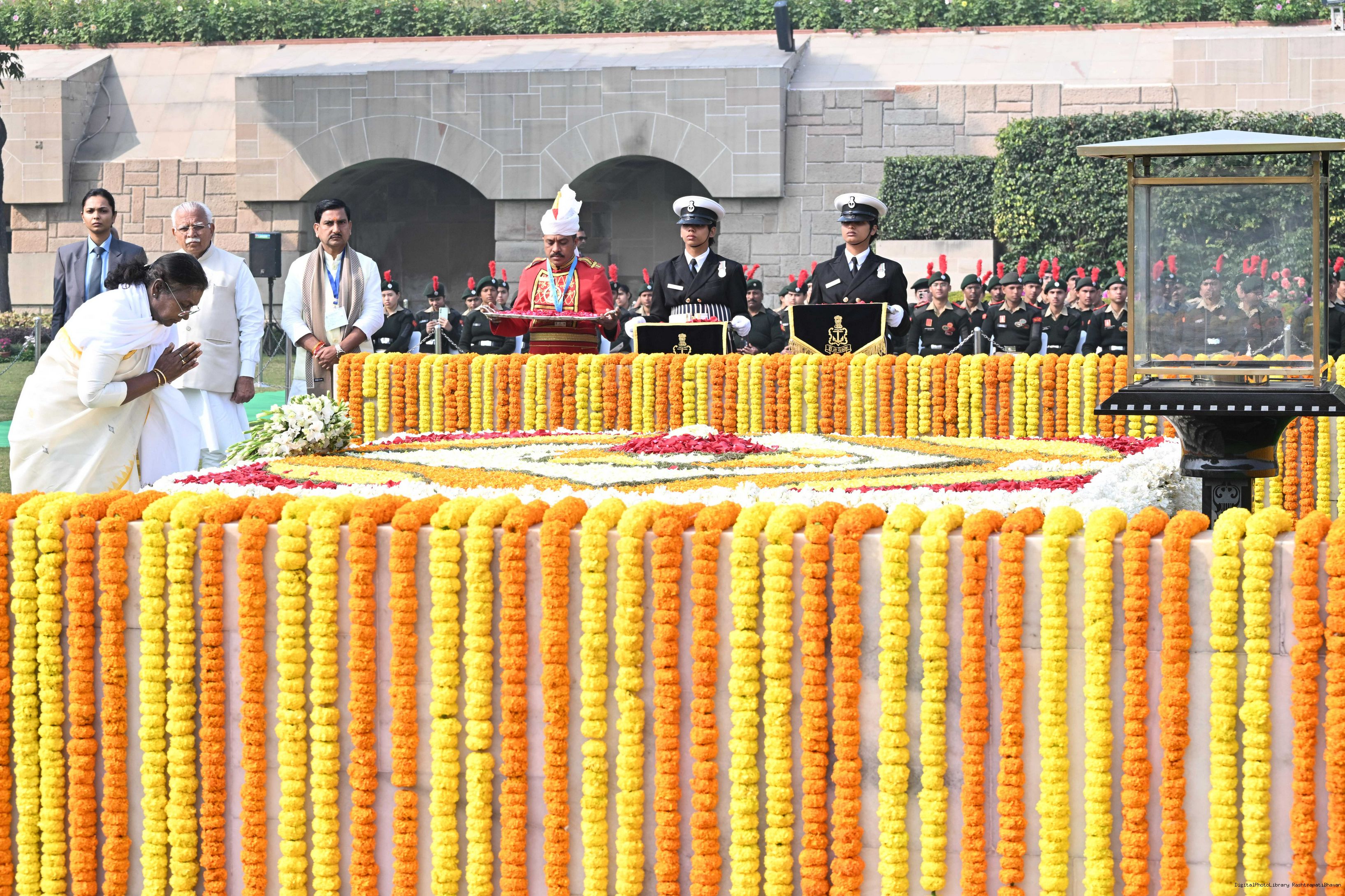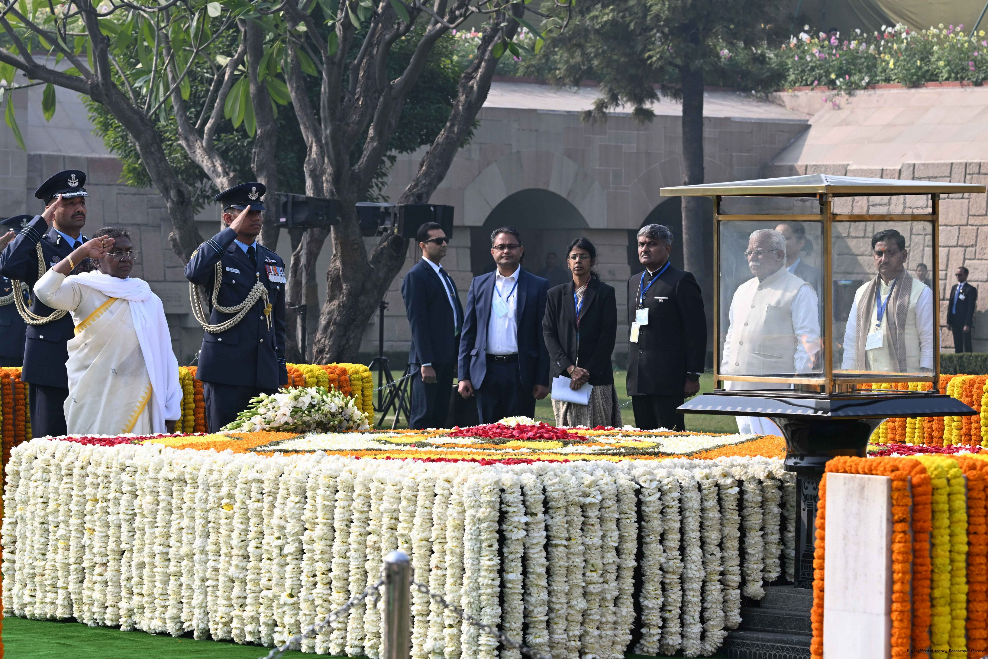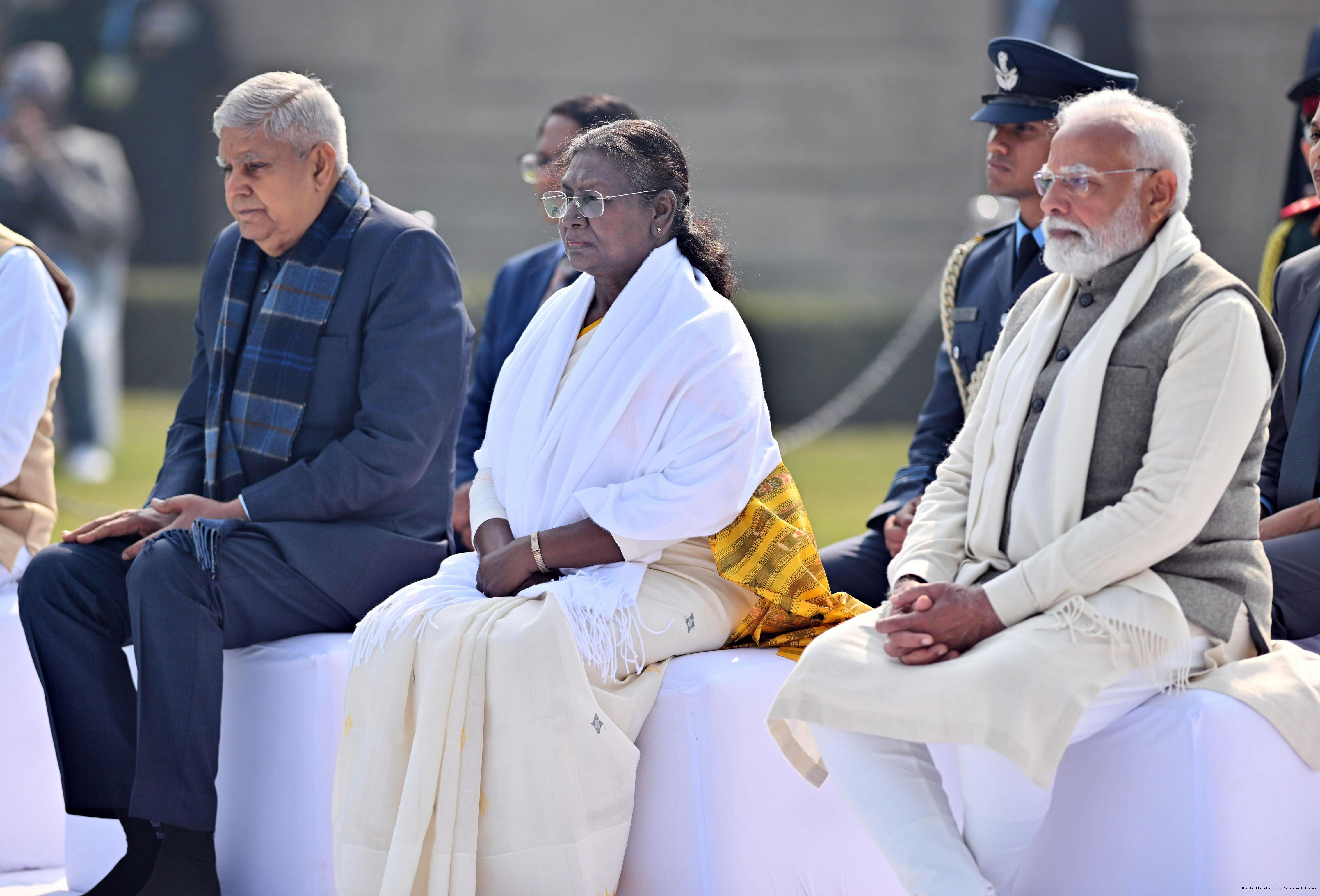 | Caption: | The President of India Smt. Droupadi Murmu paid homage to Mahatma Gandhi on his 77th death anniversary and attended a Sarva Dharma Prarthana at Rajghat, New Delhi on January 30, 2025. |
